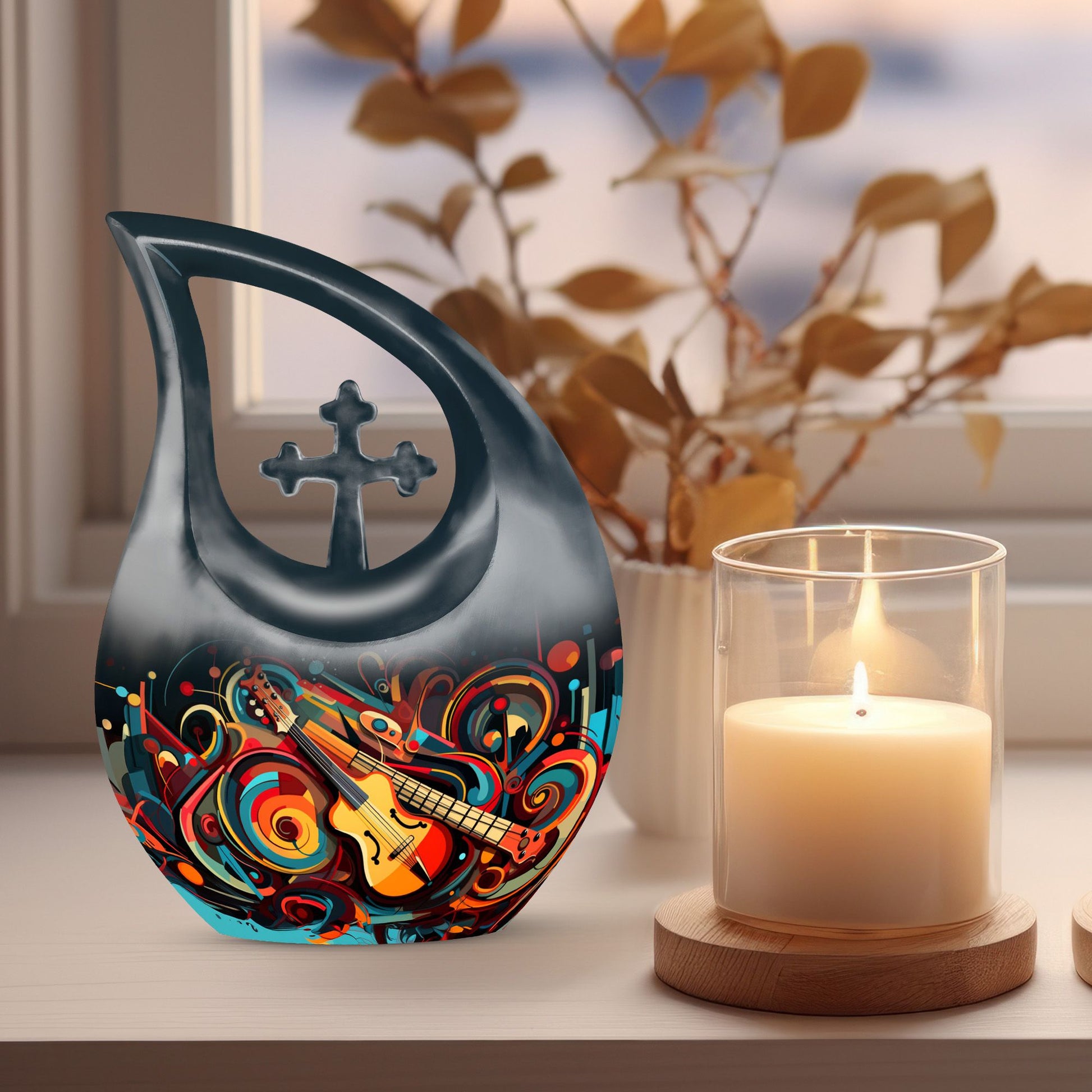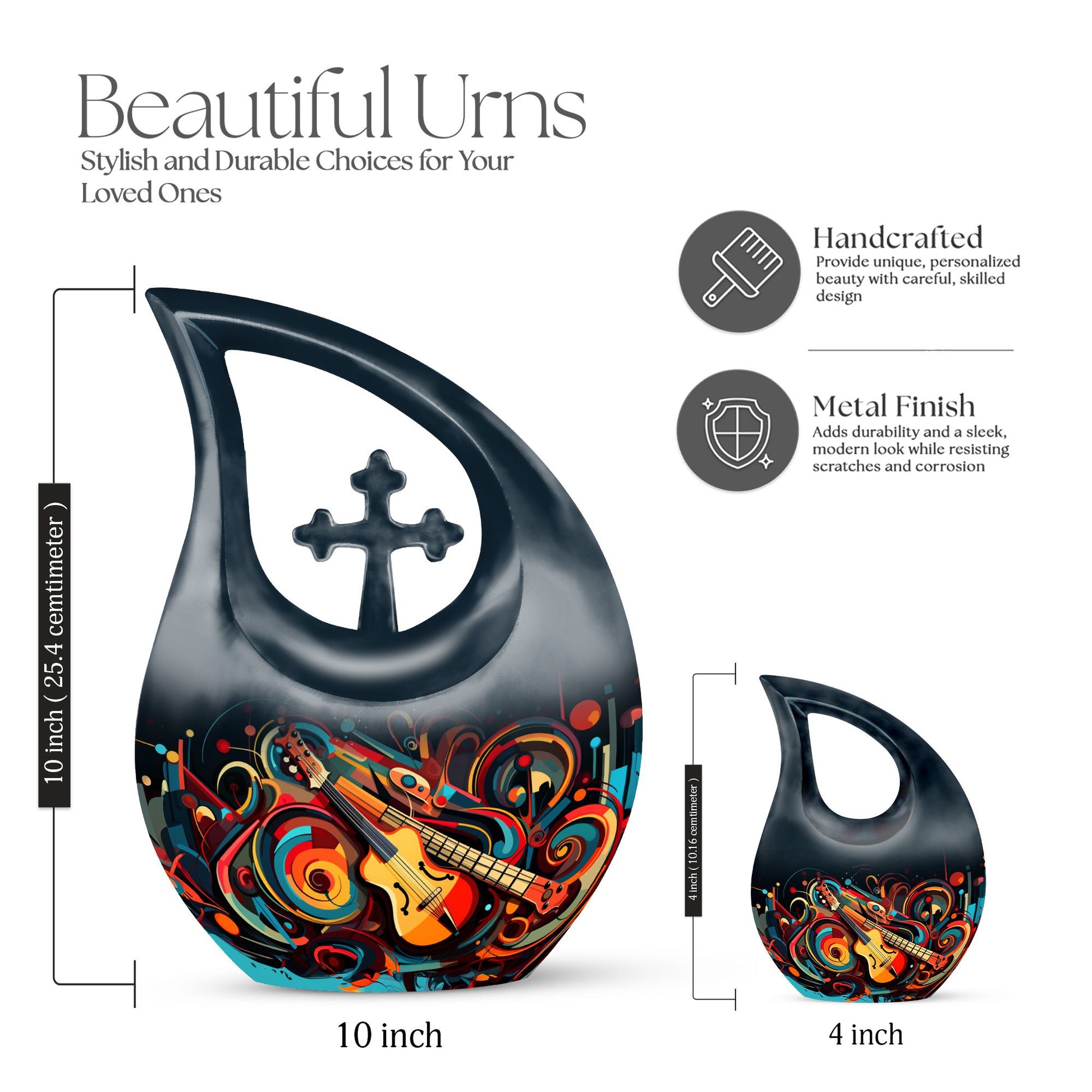 Crafted from durable aluminium, this urn features expressive violin-themed artwork that symbolizes harmony, love, and cherished memories. Its polished finish makes it a beautiful choice for those looking for urns for adult male dad, urns for human ashes adult female mom, or dignified urns for human ashes adult male burial. The secure screw-top lid protects the ashes, while the 10-inch size offers ample capacity for memorial display at home, burial, or service use. Matching keepsake options, such as an urn for ashes adult male small keepsake or small urns for human ashes adult female, offer meaningful ways to share or keep a portion of ashes close.