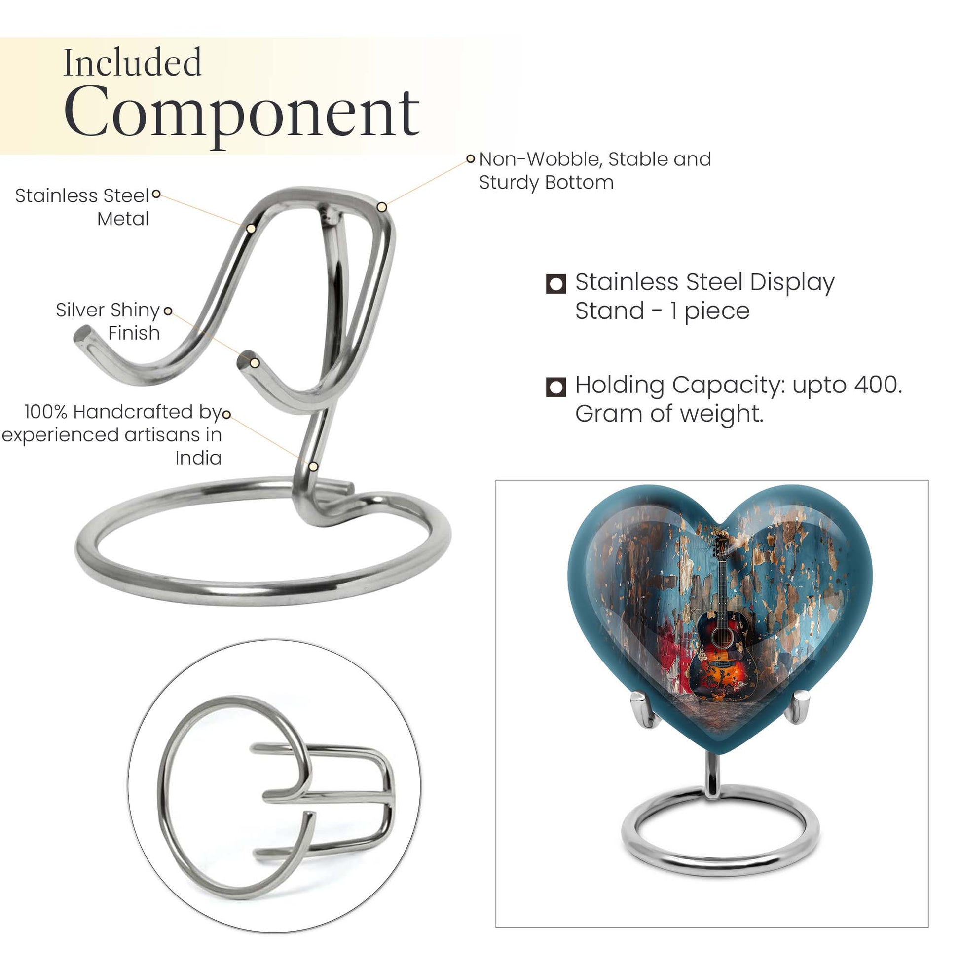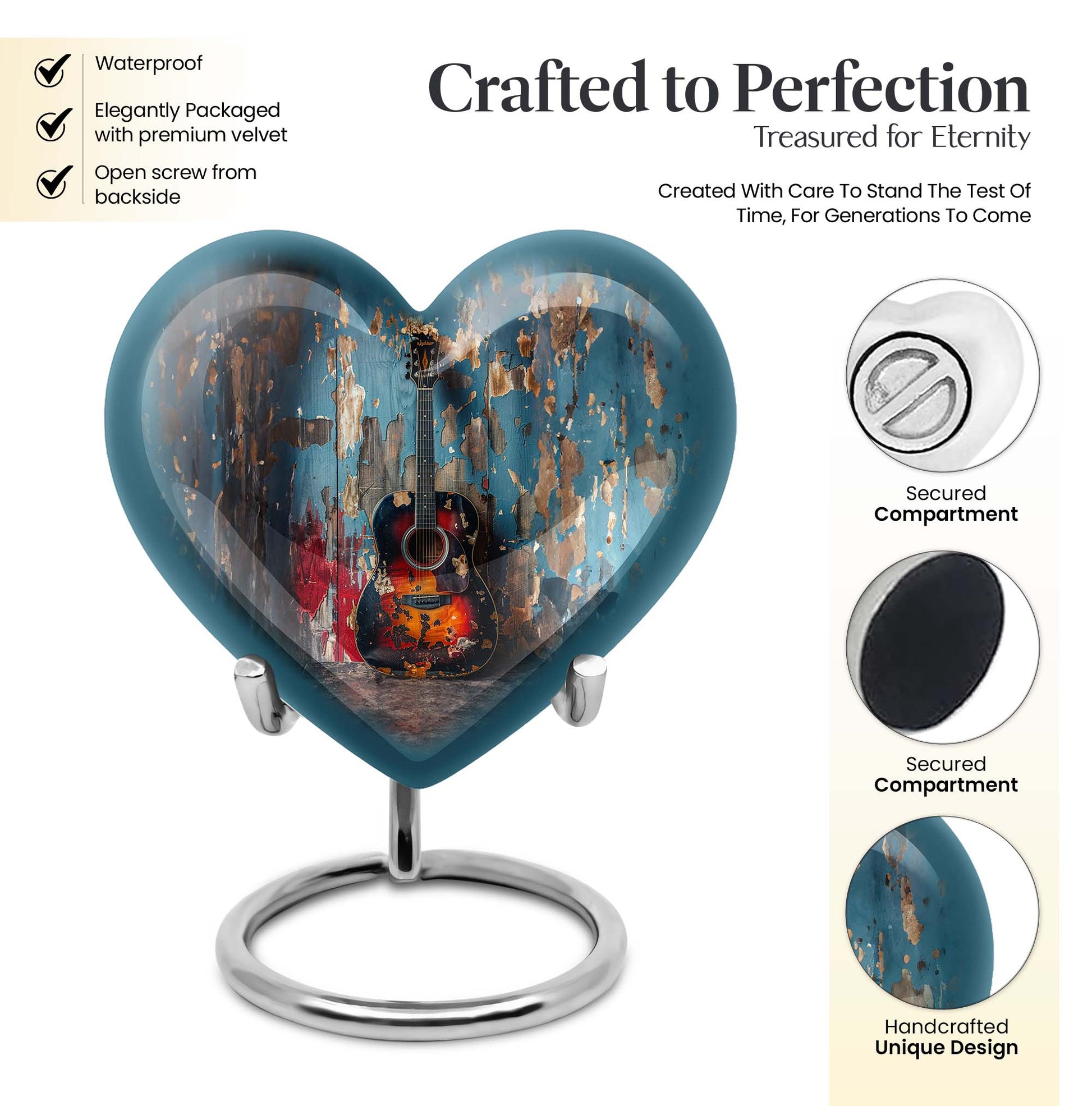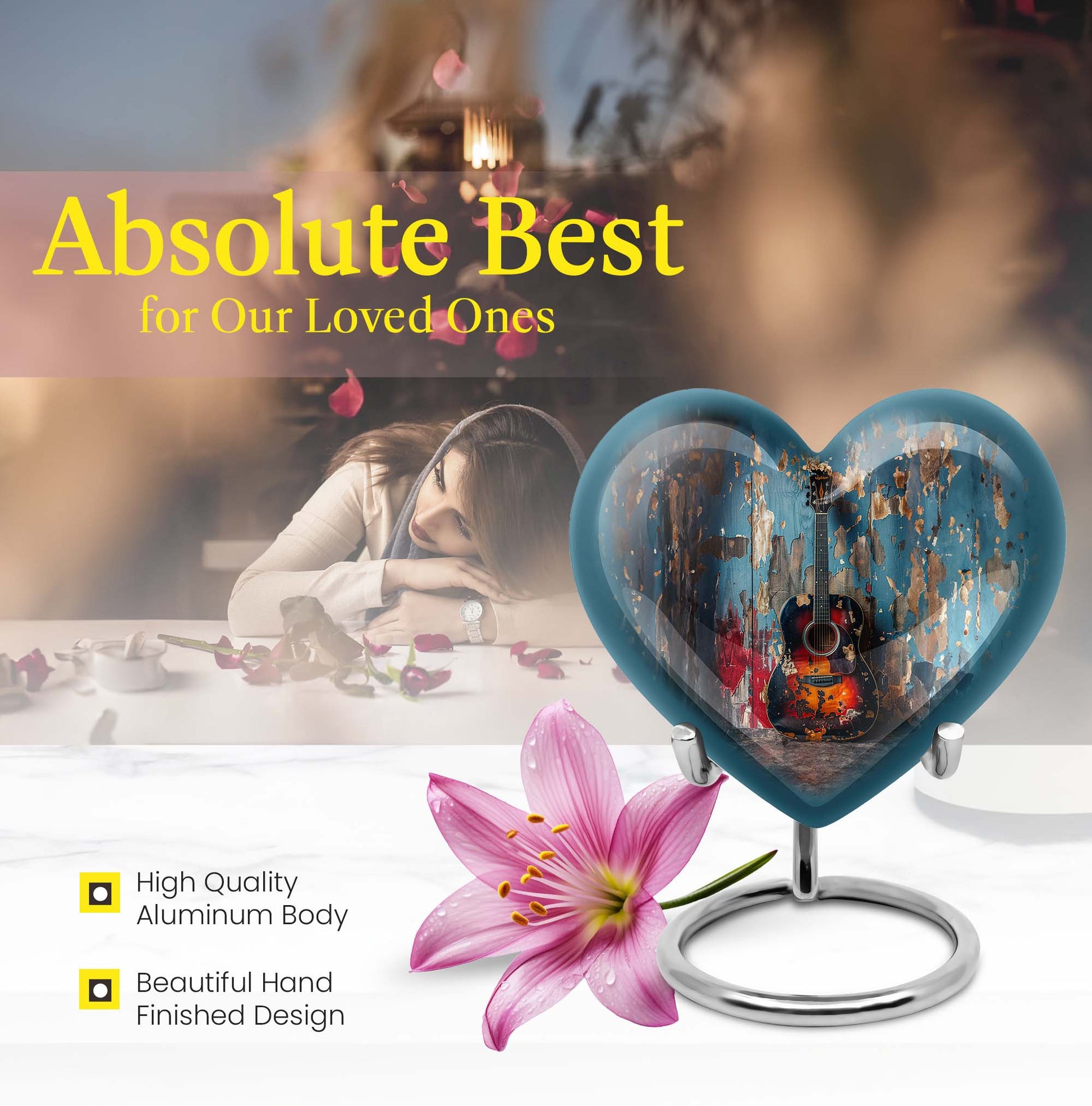 Display your eternal love and pay a respectful tribute to your departed beloved with our uniquely crafted 10-inch Guitar Urn. Comprised of high-quality aluminium, this rare large-format cremation urn balances durability and artistic aesthetics. The captivating abstract theme is universal, appealing to both mom and dad, while the heart-shaped form adds a touching sentimental flair. With a weight of just 3.3 pounds, it is substantial, yet easily manageable. This urn has an impressive capacity of 200 cubic inches, ample space to secure the ashes of loved ones. Personalization options are also available with engraved names, truly making this a one-of-a-kind tribute. Each purchase also includes a velvet pouch for an added layer of dignified containment for the ashes. Whether it's burial urns metal, urn for mom or cremation urns for dad, our Guitar Urn meets a wide range of your ceremonial needs. This product seamlessly blends the essence of religious & ceremonial memorial supplies.
