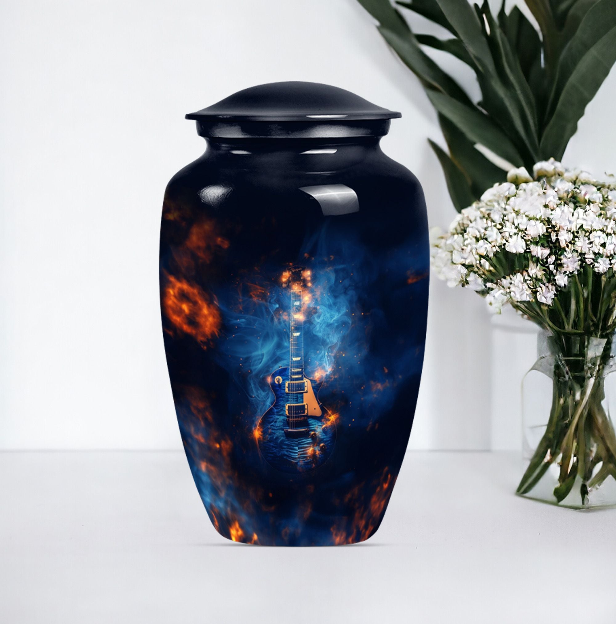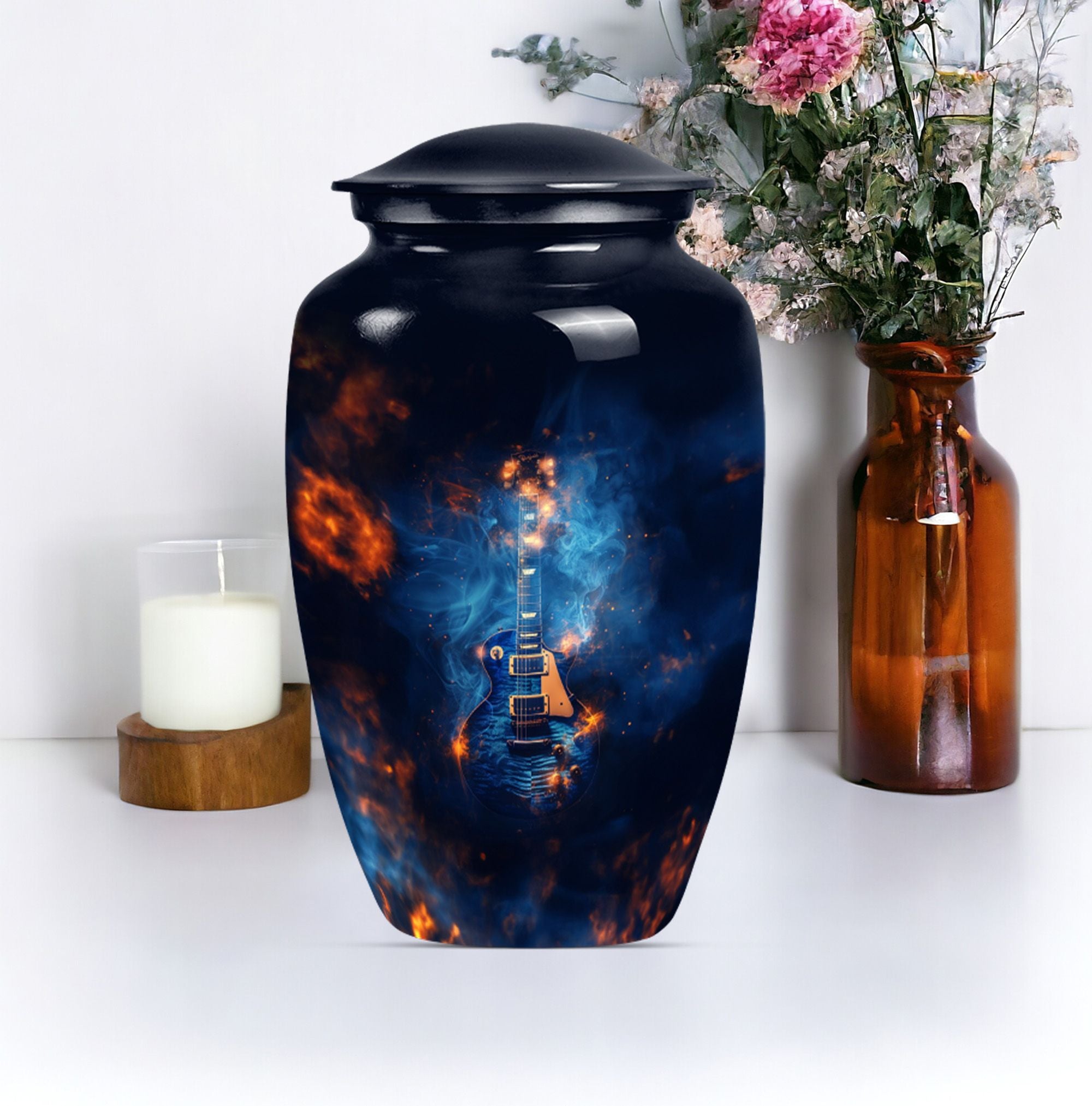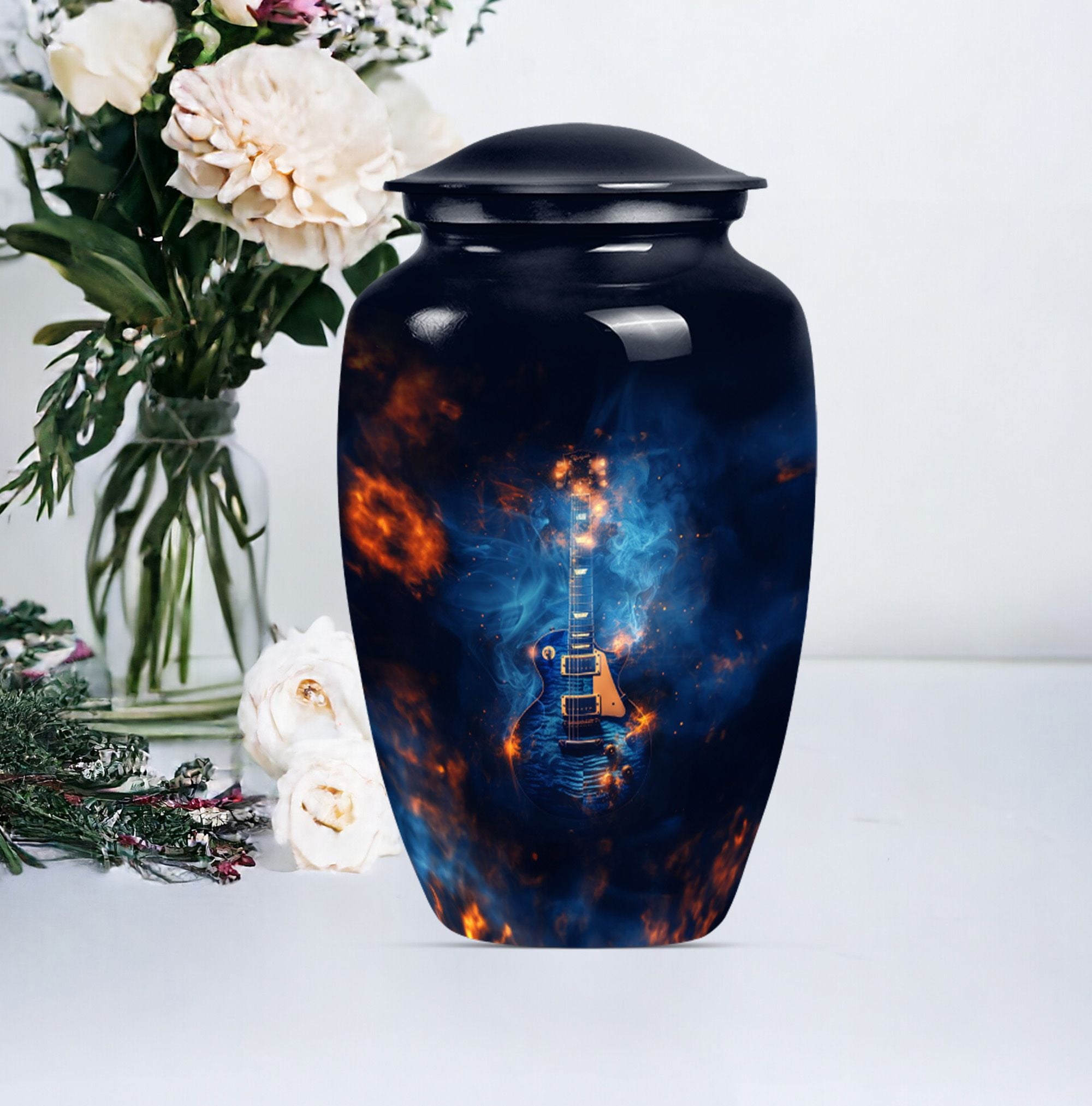 Crafted from high-quality aluminium, this urn reflects both durability and artistry. Its striking guitar-themed design symbolizes passion, creativity, and individuality, making it a special choice for music lovers. Designed as an urn for ashes adult male or a women adult urn, its secure screw-top lid ensures ashes remain safely preserved. This versatile design also makes it meaningful for those seeking urns women human ashes or urn ashes men, blending beauty with functionality.
