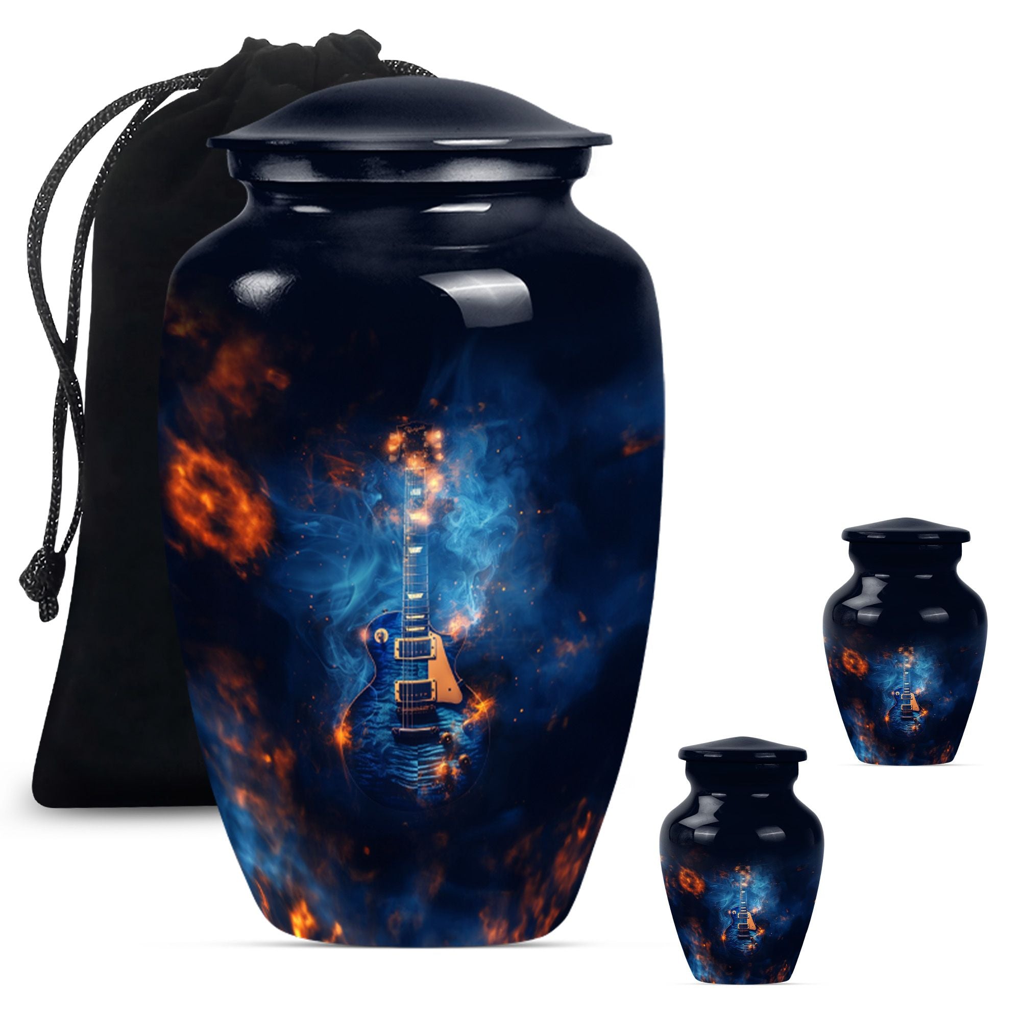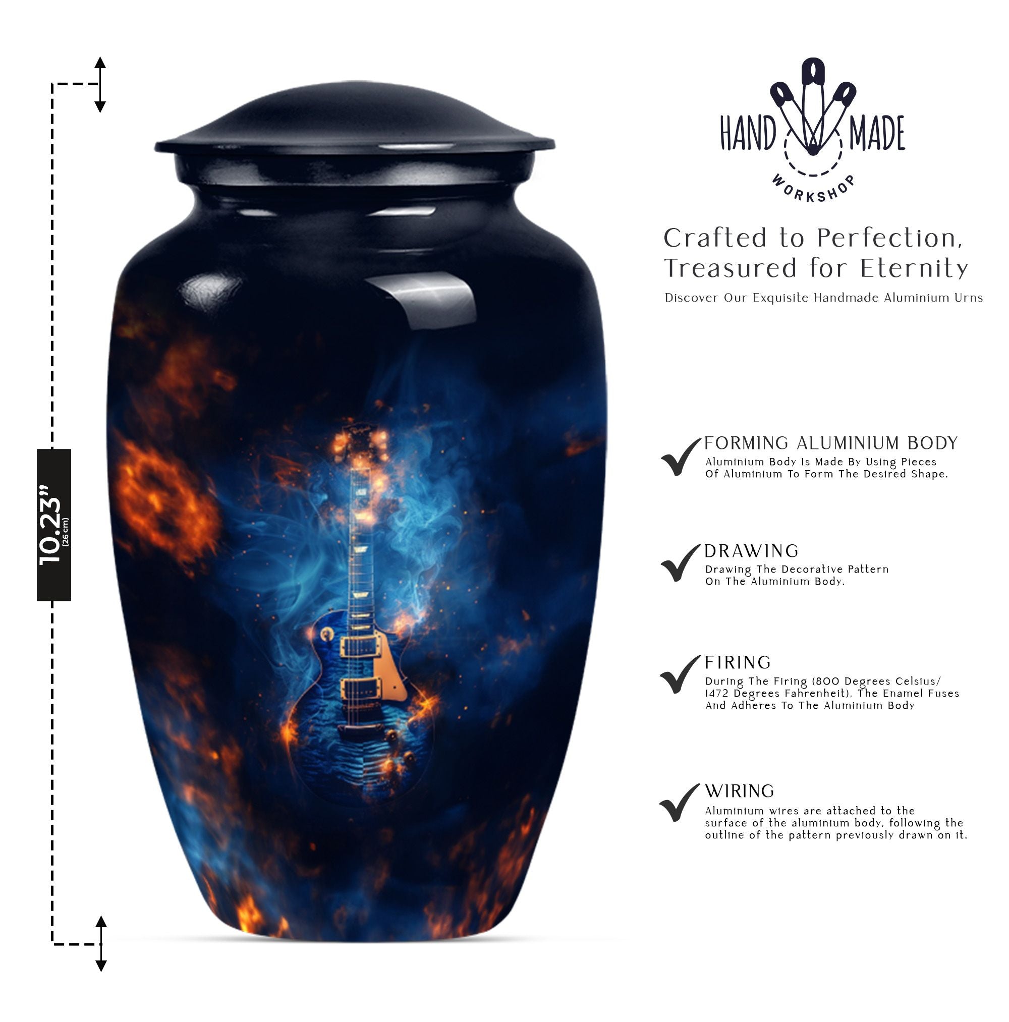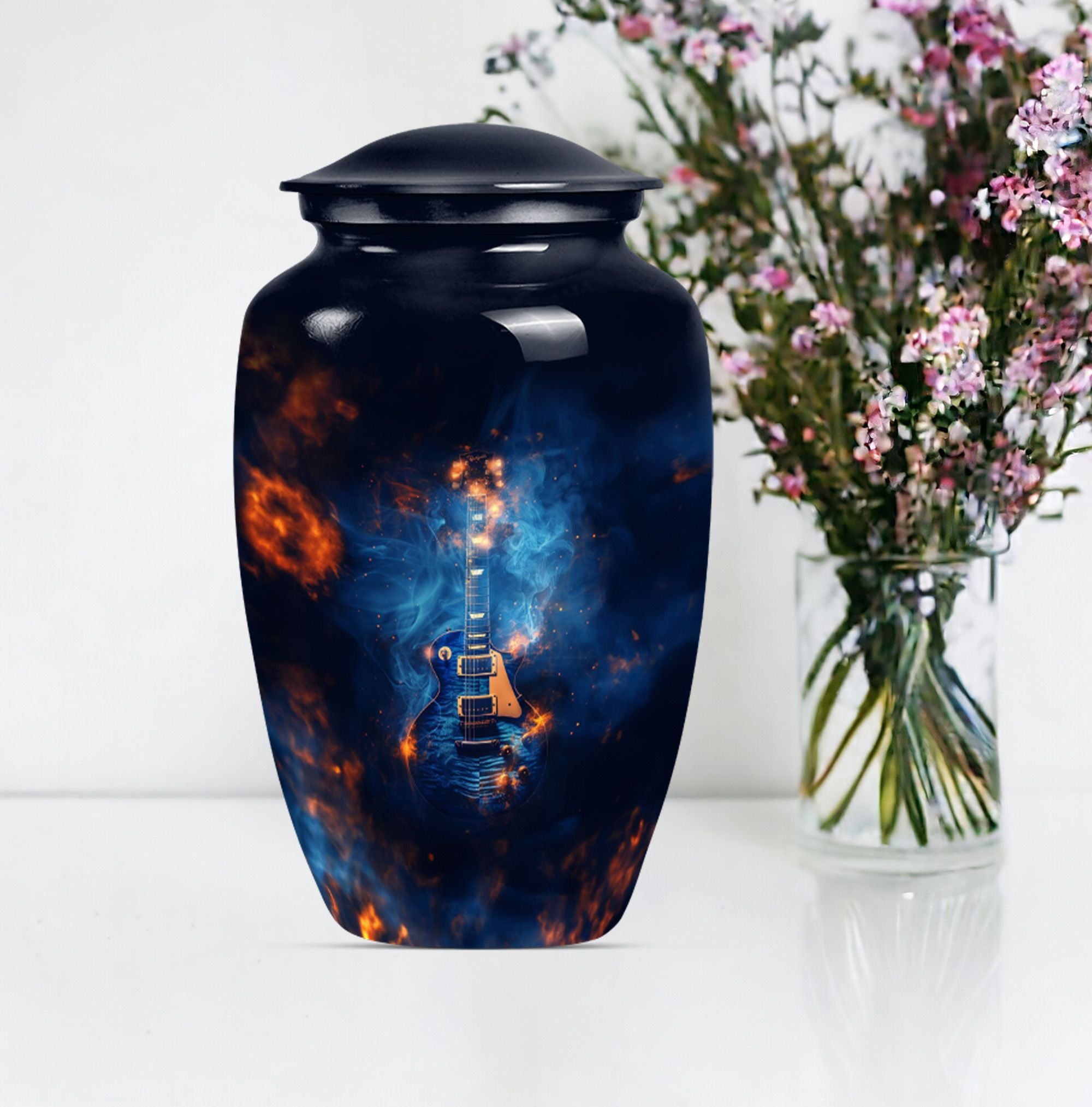 Crafted from high-quality aluminium, this urn reflects both durability and artistry. Its striking guitar-themed design symbolizes passion, creativity, and individuality, making it a special choice for music lovers. Designed as an urn for ashes adult male or a women adult urn, its secure screw-top lid ensures ashes remain safely preserved. This versatile design also makes it meaningful for those seeking urns women human ashes or urn ashes men, blending beauty with functionality.