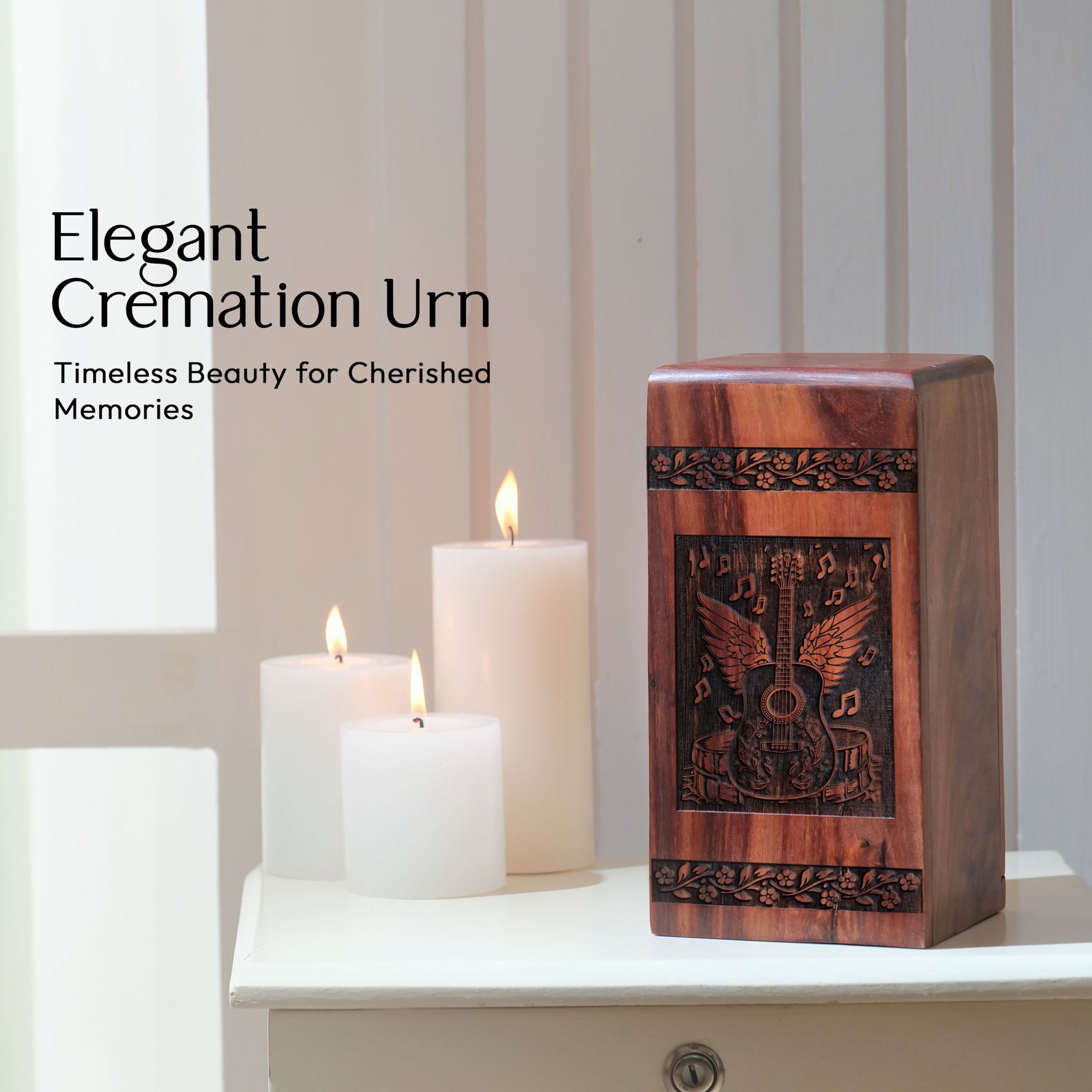 Discover a harmonious resting place for your loved one with our unique Guitar Urns for Human Ashes. This captivating wood-crafted urn serves as an ideal tribute to music enthusiasts, blending deeply held affection in its thoughtful design. Crafted with supreme attention to detail, our Wooden Urn provides an elegant and durable resting space, well-suited for adults and seniors alike. Whether you're in search of funeral decorations or a personal remembrance piece, these Urns for Women and Men bring cherished memories closer to your heart. As a part of your burial considerations, our Wooden urns serve as timeless Burial Urns for Human Ashes. Offering a comforting presence, the urn serves as a reminder of the sweet symphony of life shared with the departed. Purchase this exceptional piece today, and provide a serene accompaniment to your bereavement journey.