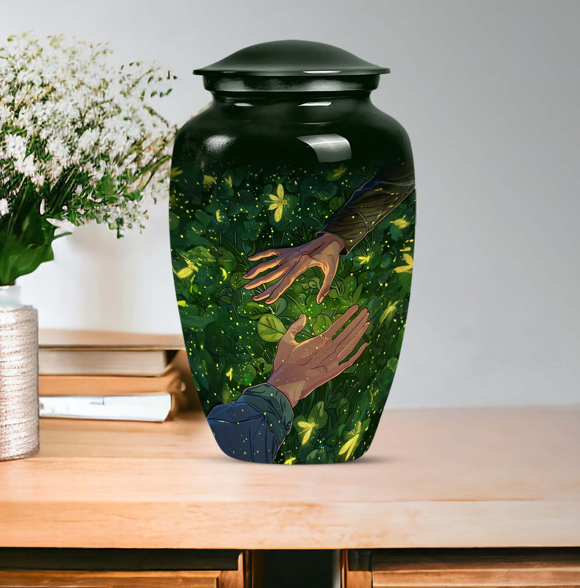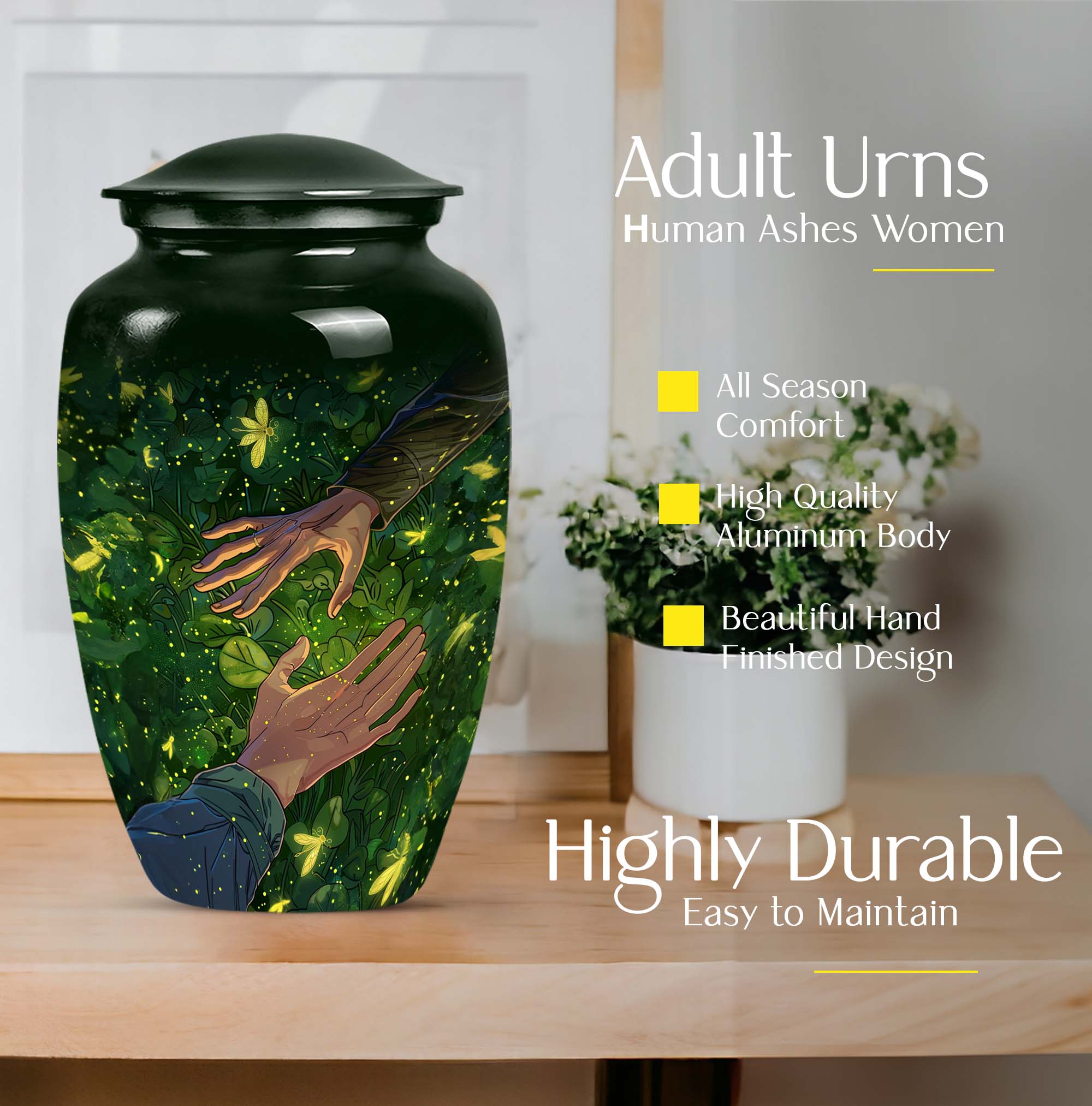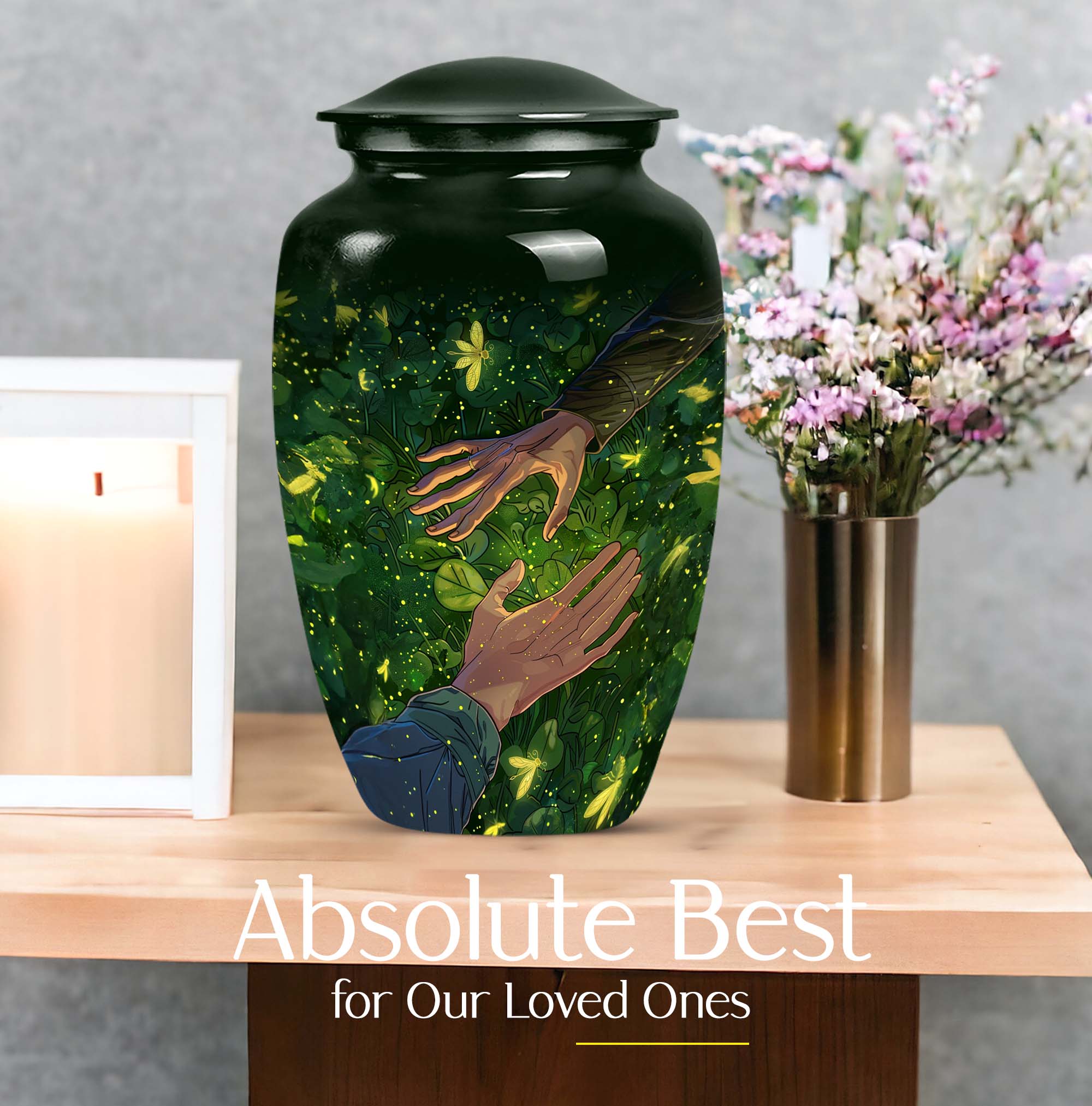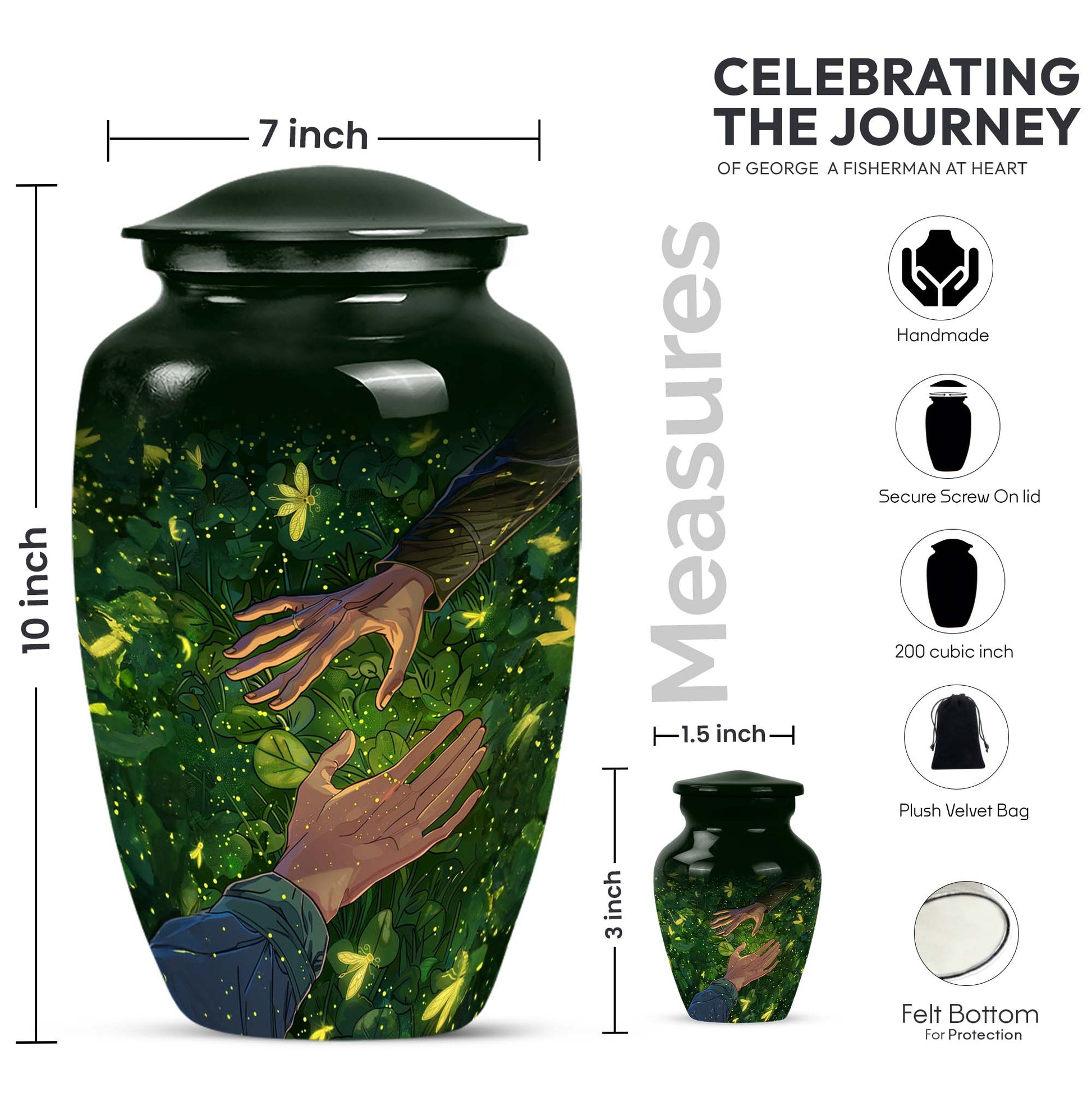 Step into the spiritual world with this exceptional and meaningful burial urn for ashes adult. Beautifully crafted from high-quality aluminium, this cremation urn is a sublime tribute to your loved ones. Its large size (10-inch) makes it a substantial and tactile focal point, perfect for a quiet corner for private remembrance. With a weight of 3.3 pounds and dimensions of 10 inches in height, it comfortably holds up to 200 cubic inches of ashes. Unique abstract theme resonates the continuity of life and death, adding a touch of serenity. Uniquely, this urn comes with a velvet pouch for containment of ashes, subtly acknowledging the preciousness of its contents. You can make it more personal by engraving names into it. Dive deeper into the experience of commemorating your loved ones with this thoughtful hand urn, an echo of timeless love. Valuable keywords you might want to consider for this product are memorial adult urns, adult burial, urns for ashes for adult humans, cremation urns for dad.