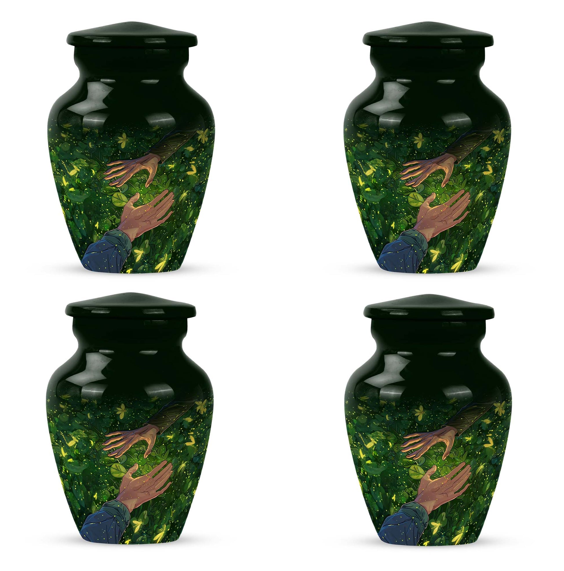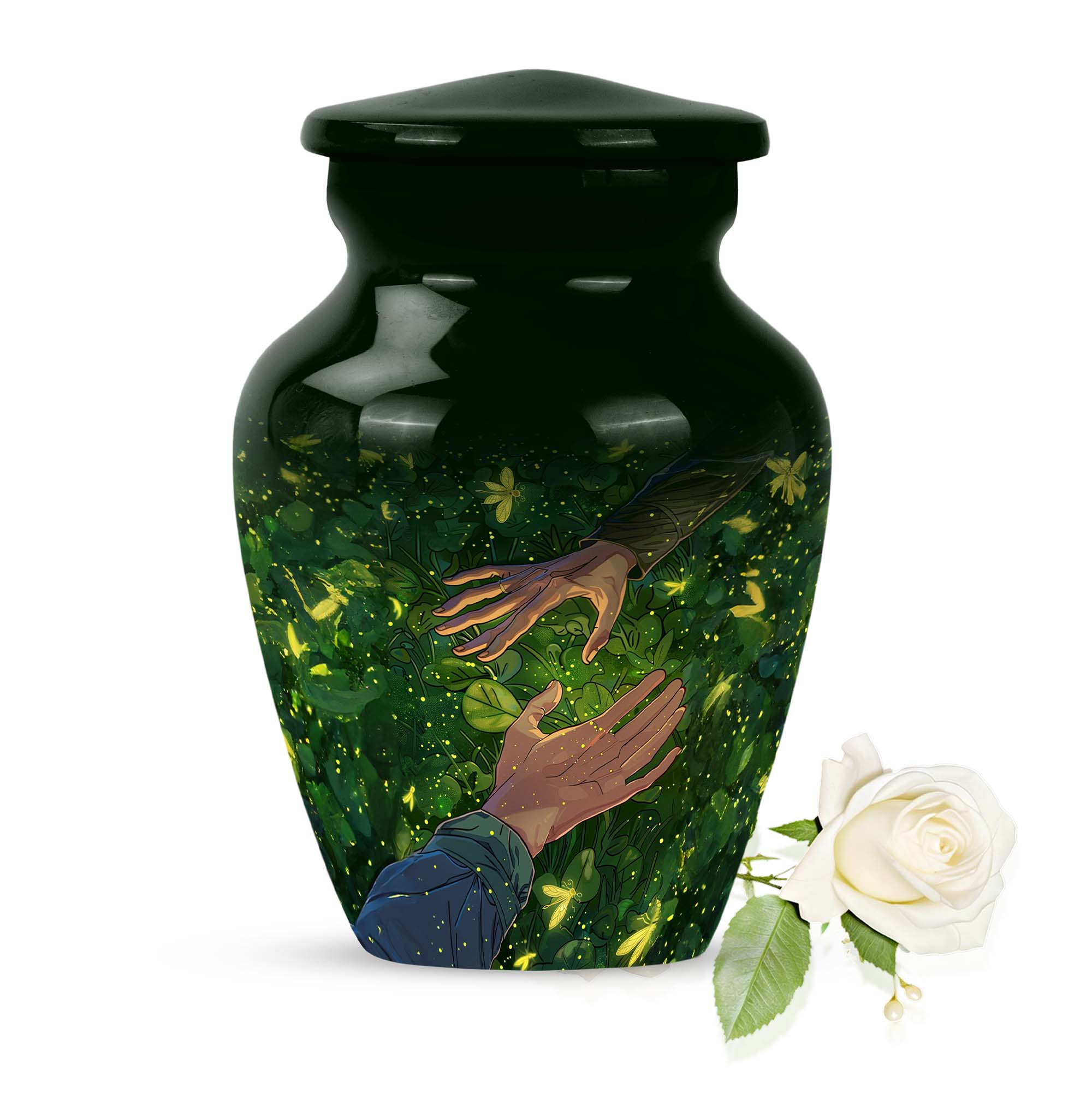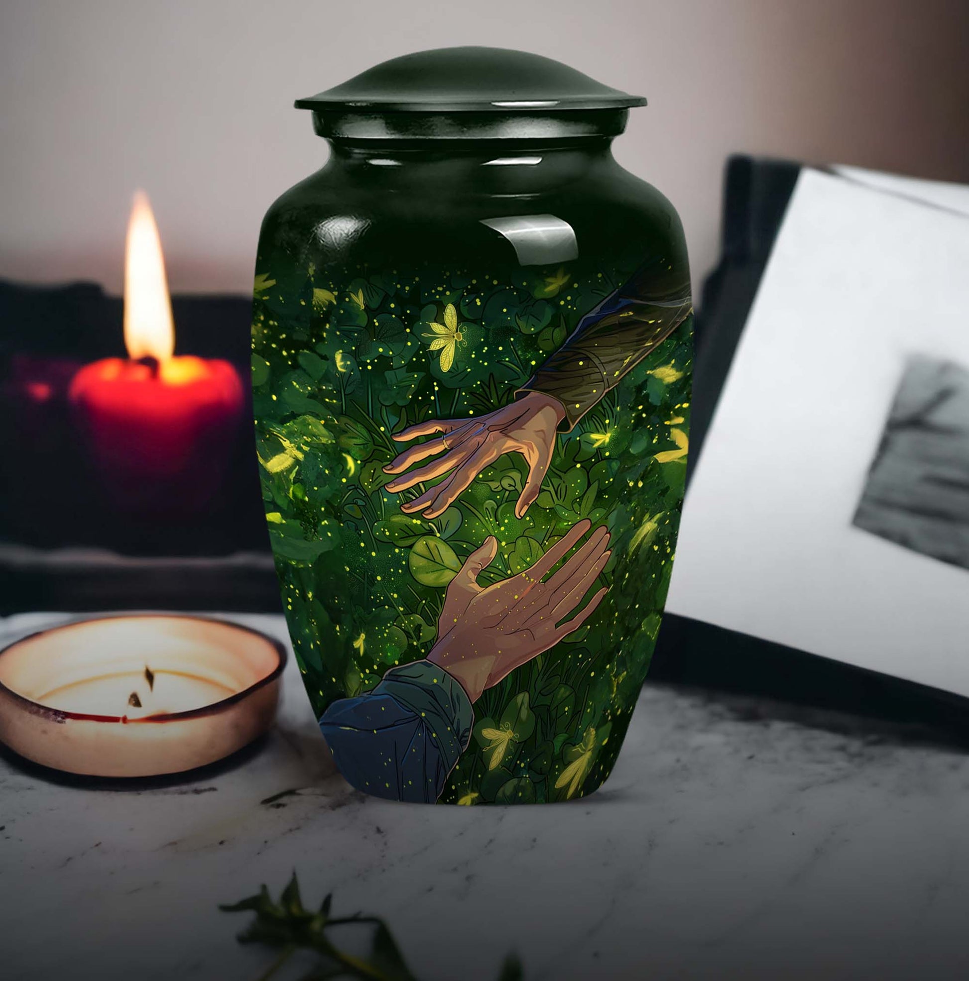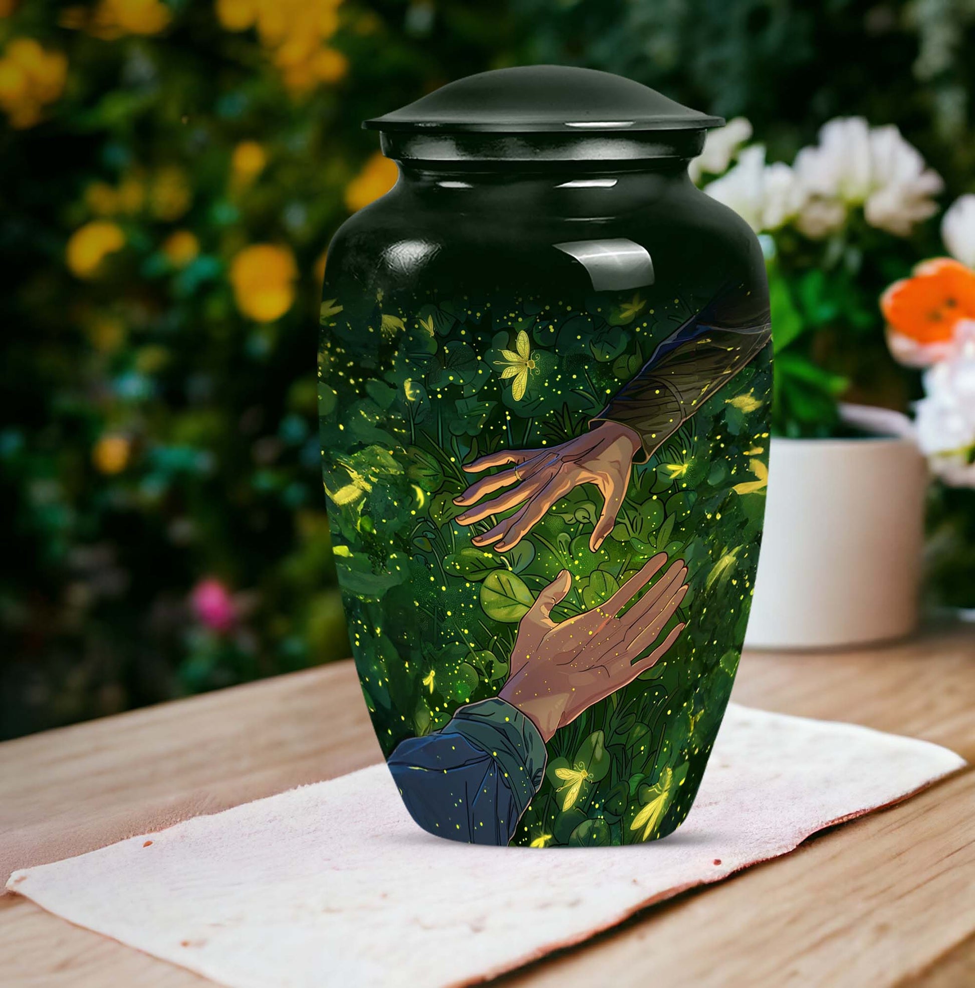 Step into the spiritual world with this exceptional and meaningful burial urn for ashes adult. Beautifully crafted from high-quality aluminium, this cremation urn is a sublime tribute to your loved ones. Its large size (10-inch) makes it a substantial and tactile focal point, perfect for a quiet corner for private remembrance. With a weight of 3.3 pounds and dimensions of 10 inches in height, it comfortably holds up to 200 cubic inches of ashes. Unique abstract theme resonates the continuity of life and death, adding a touch of serenity. Uniquely, this urn comes with a velvet pouch for containment of ashes, subtly acknowledging the preciousness of its contents. You can make it more personal by engraving names into it. Dive deeper into the experience of commemorating your loved ones with this thoughtful hand urn, an echo of timeless love. Valuable keywords you might want to consider for this product are memorial adult urns, adult burial, urns for ashes for adult humans, cremation urns for dad.