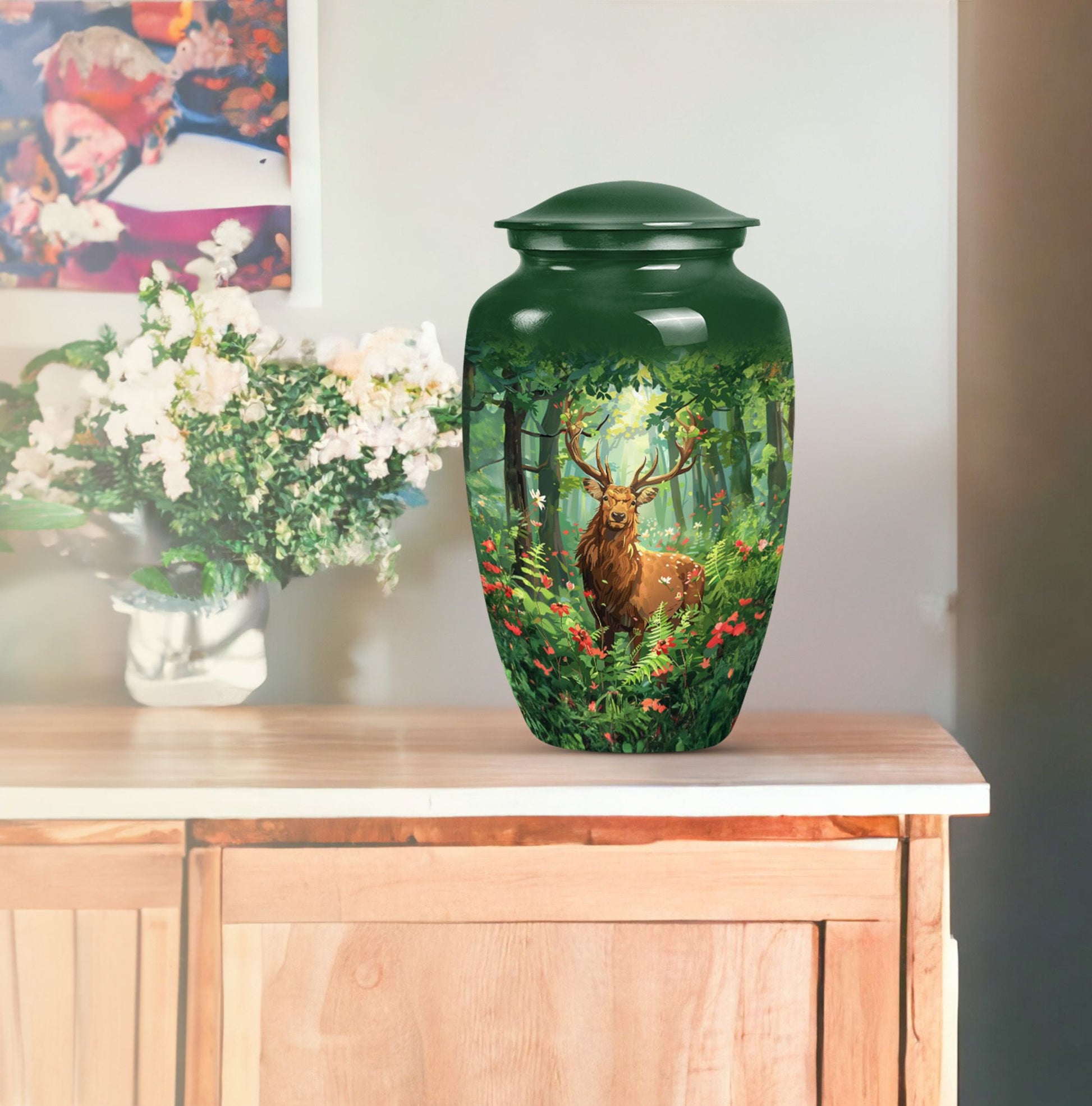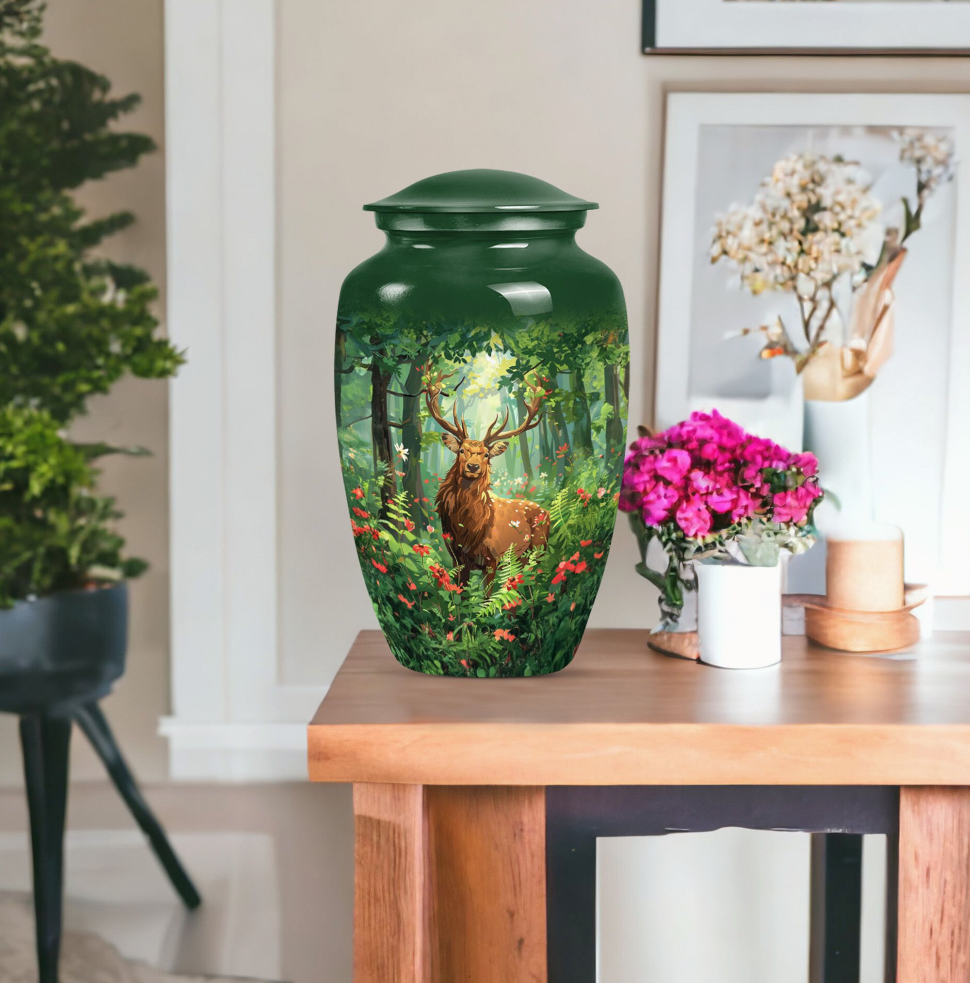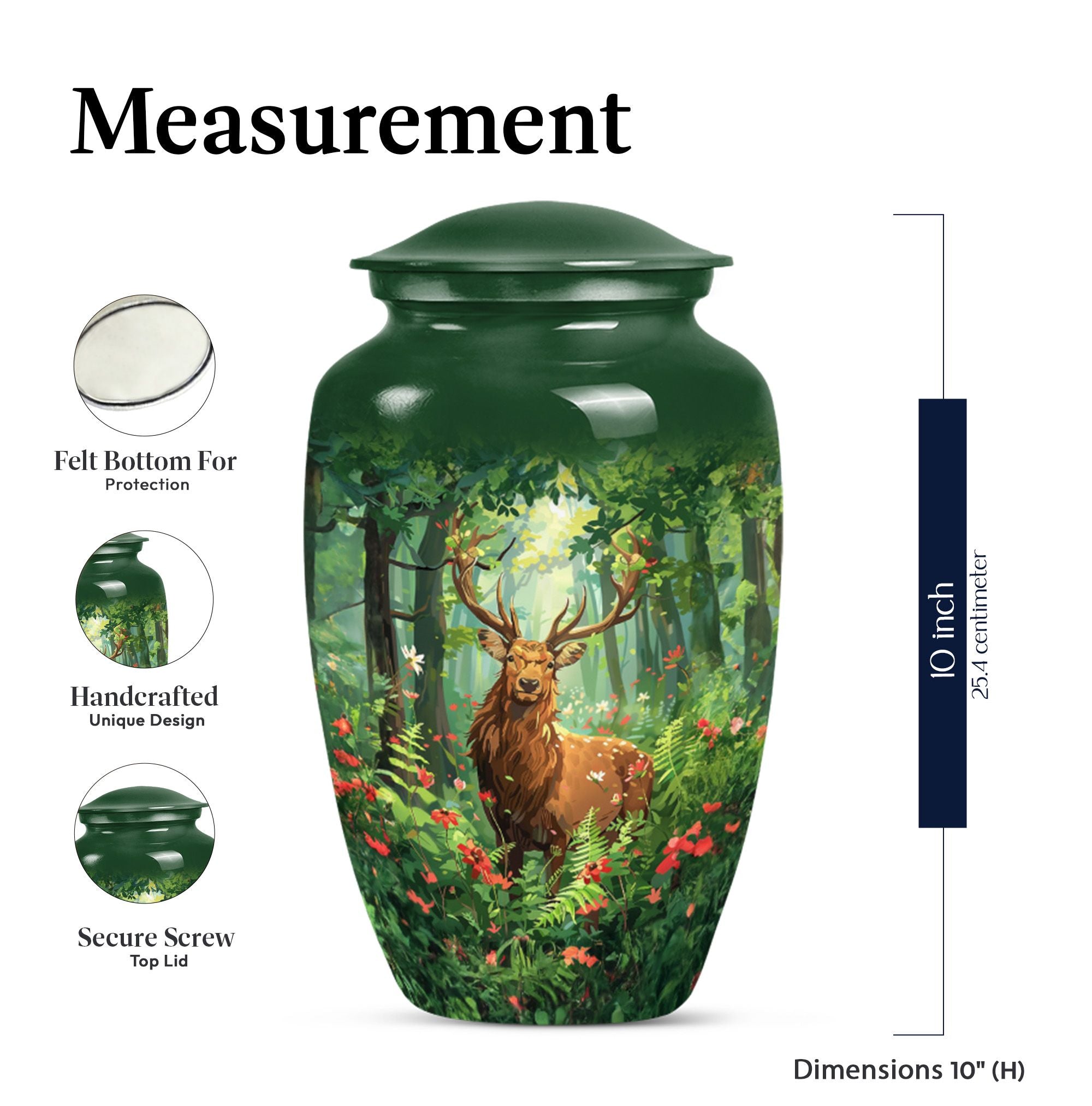 Discover a dignified resting place for your loved one with our 10-inch Deer Urn. This large urn is expertly crafted from high-quality aluminum, ensuring a sturdy and timeless selection for memorial ceremonies. Weighing in at 3.3 pounds and offering a capacity of 200 cubic inches, this cremation urn accommodates a considerable amount of ashes with ease. The urn is complemented by a velvet pouch, carefully selected for the containment of ashes. The urn integrates the timeless iconography of a gramophone, imbuing it with a profound sense of nostalgia and respect for tradition. This urn is perfect for adults, serving as funeral urn for women's ashes as well as for men's ashes. The unique handcrafted design makes it an ideal selection for artistic souls. This urn can be personalized with engraved names, making it an even more special memoir. Exude reverence and remembrance with this stunning deer urn - a showcase of artisanry and deep respect for mortal transience.