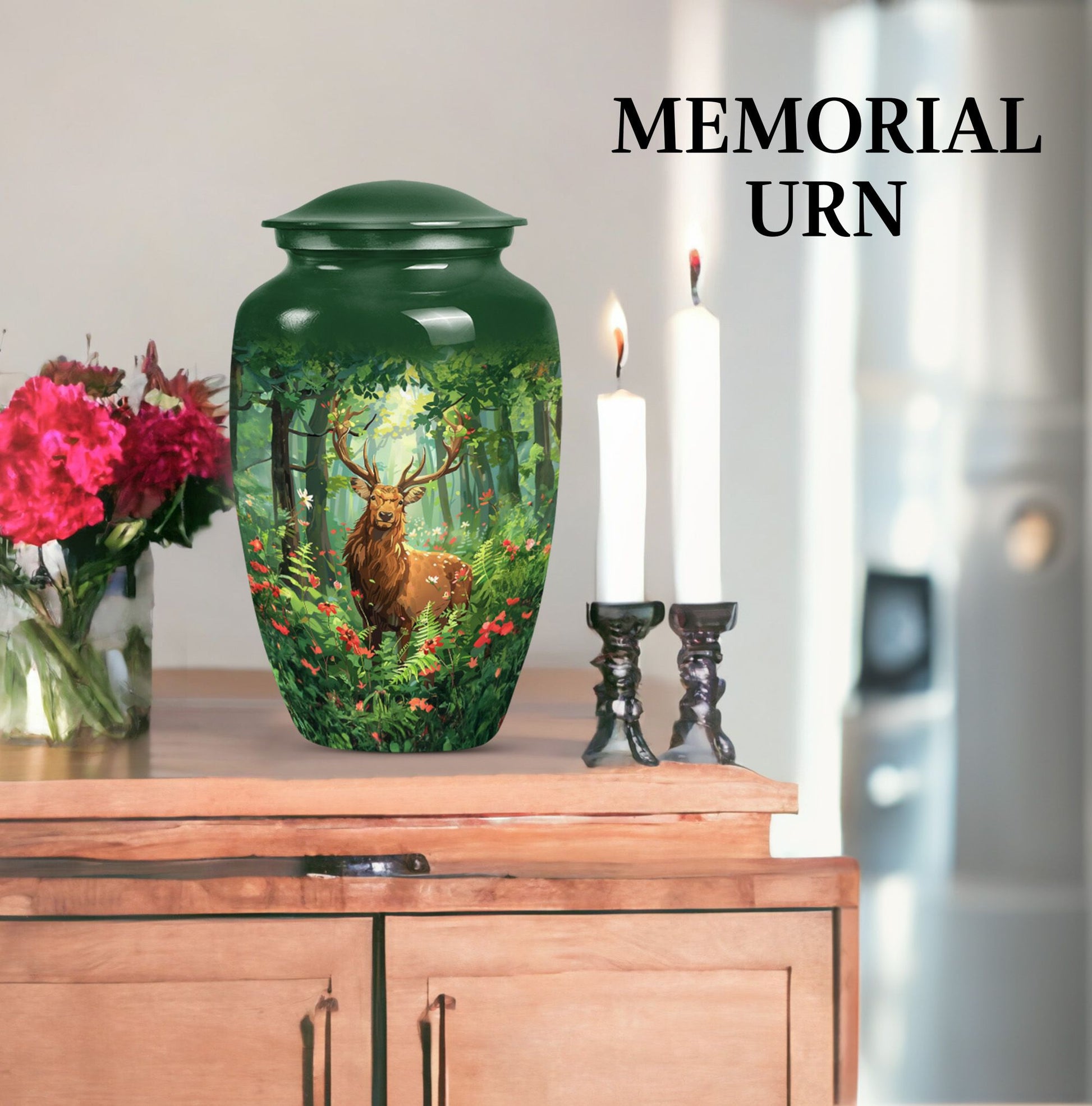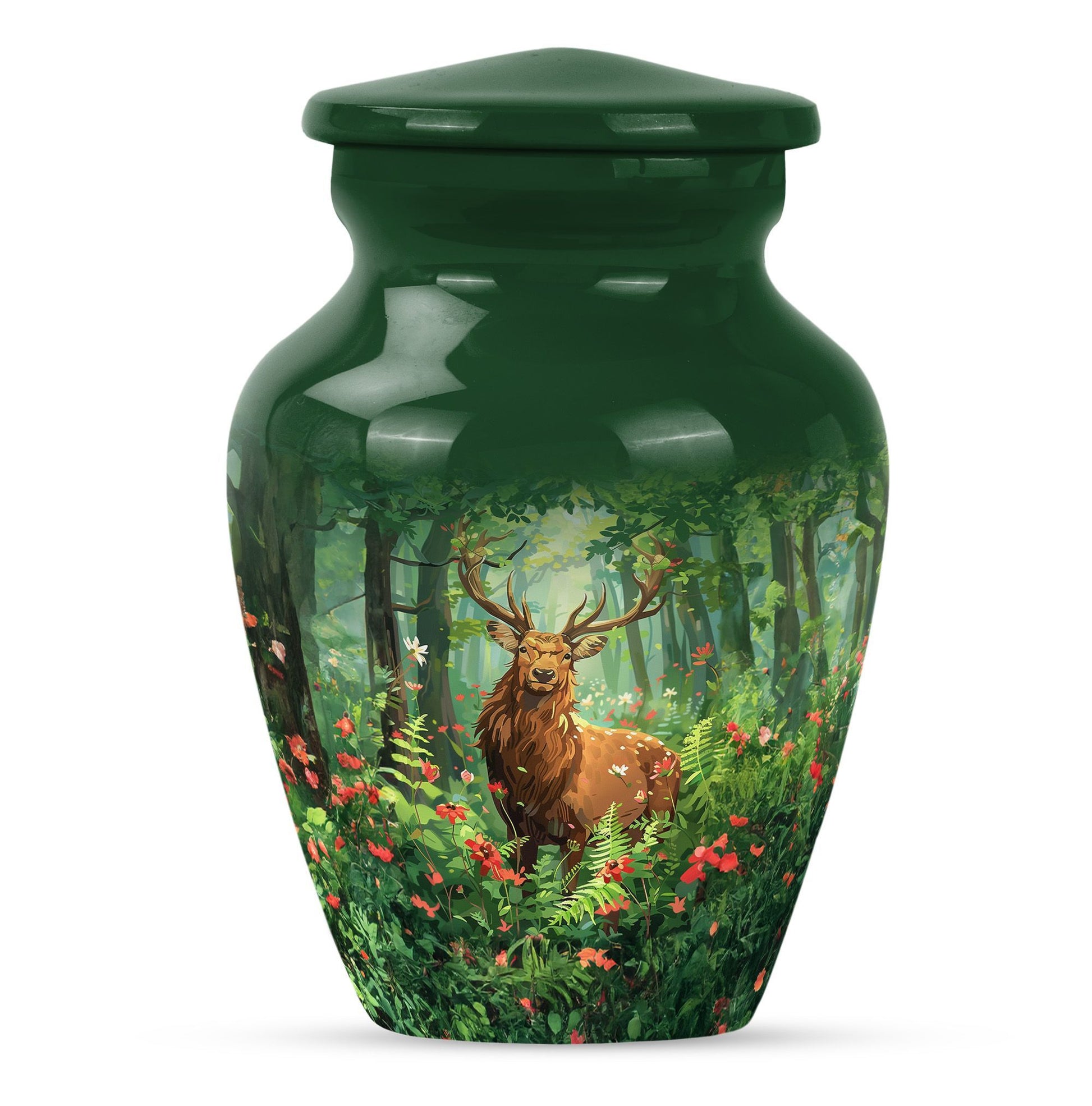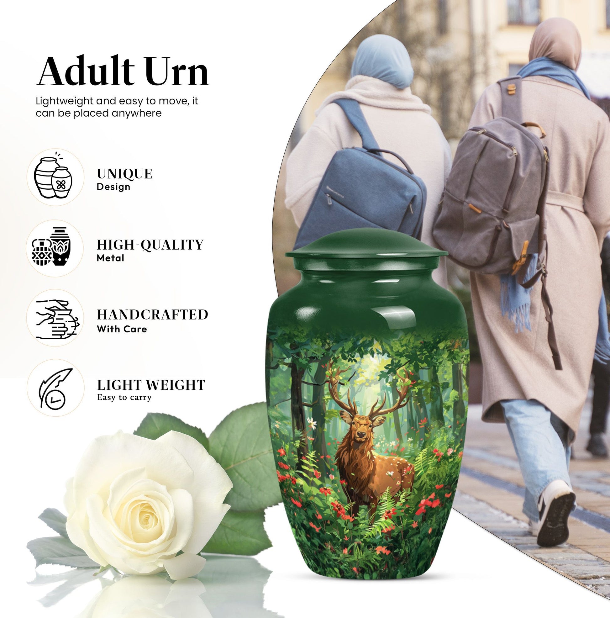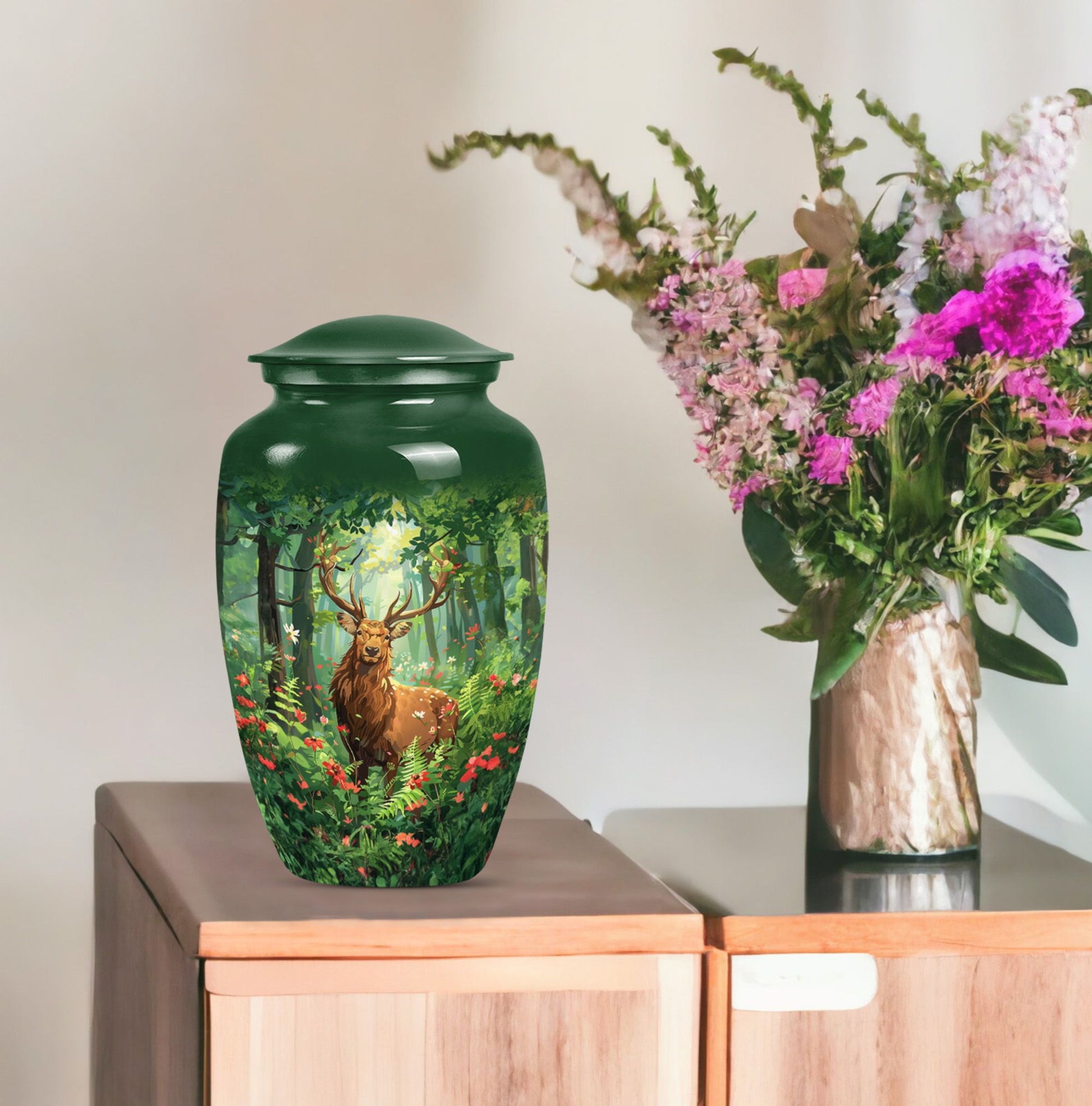 Discover a dignified resting place for your loved one with our 10-inch Deer Urn. This large urn is expertly crafted from high-quality aluminum, ensuring a sturdy and timeless selection for memorial ceremonies. Weighing in at 3.3 pounds and offering a capacity of 200 cubic inches, this cremation urn accommodates a considerable amount of ashes with ease. The urn is complemented by a velvet pouch, carefully selected for the containment of ashes. The urn integrates the timeless iconography of a gramophone, imbuing it with a profound sense of nostalgia and respect for tradition. This urn is perfect for adults, serving as funeral urn for women's ashes as well as for men's ashes. The unique handcrafted design makes it an ideal selection for artistic souls. This urn can be personalized with engraved names, making it an even more special memoir. Exude reverence and remembrance with this stunning deer urn - a showcase of artisanry and deep respect for mortal transience.