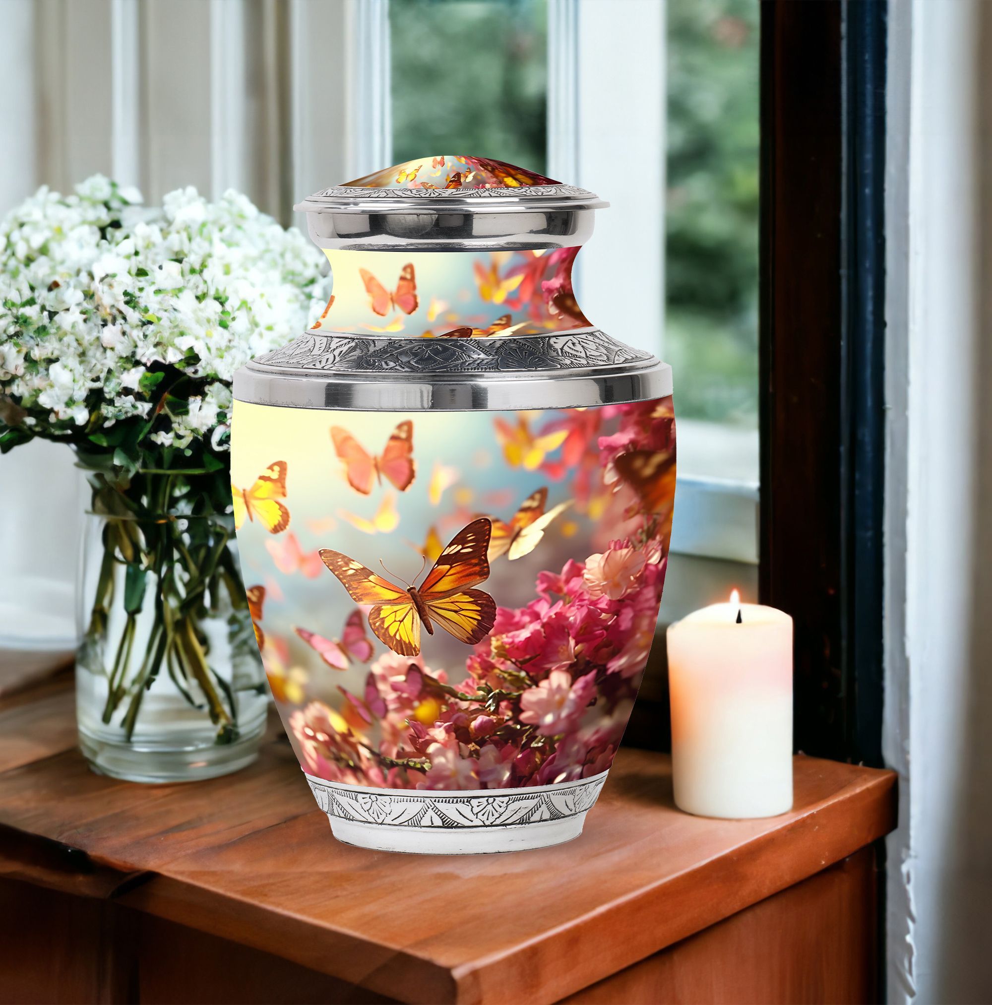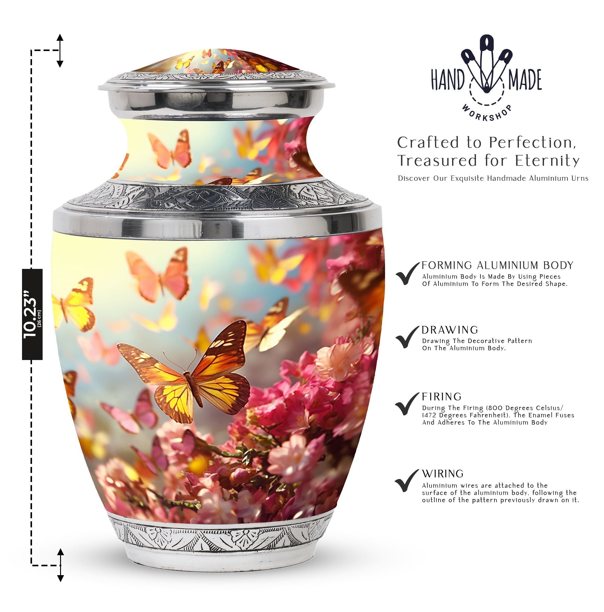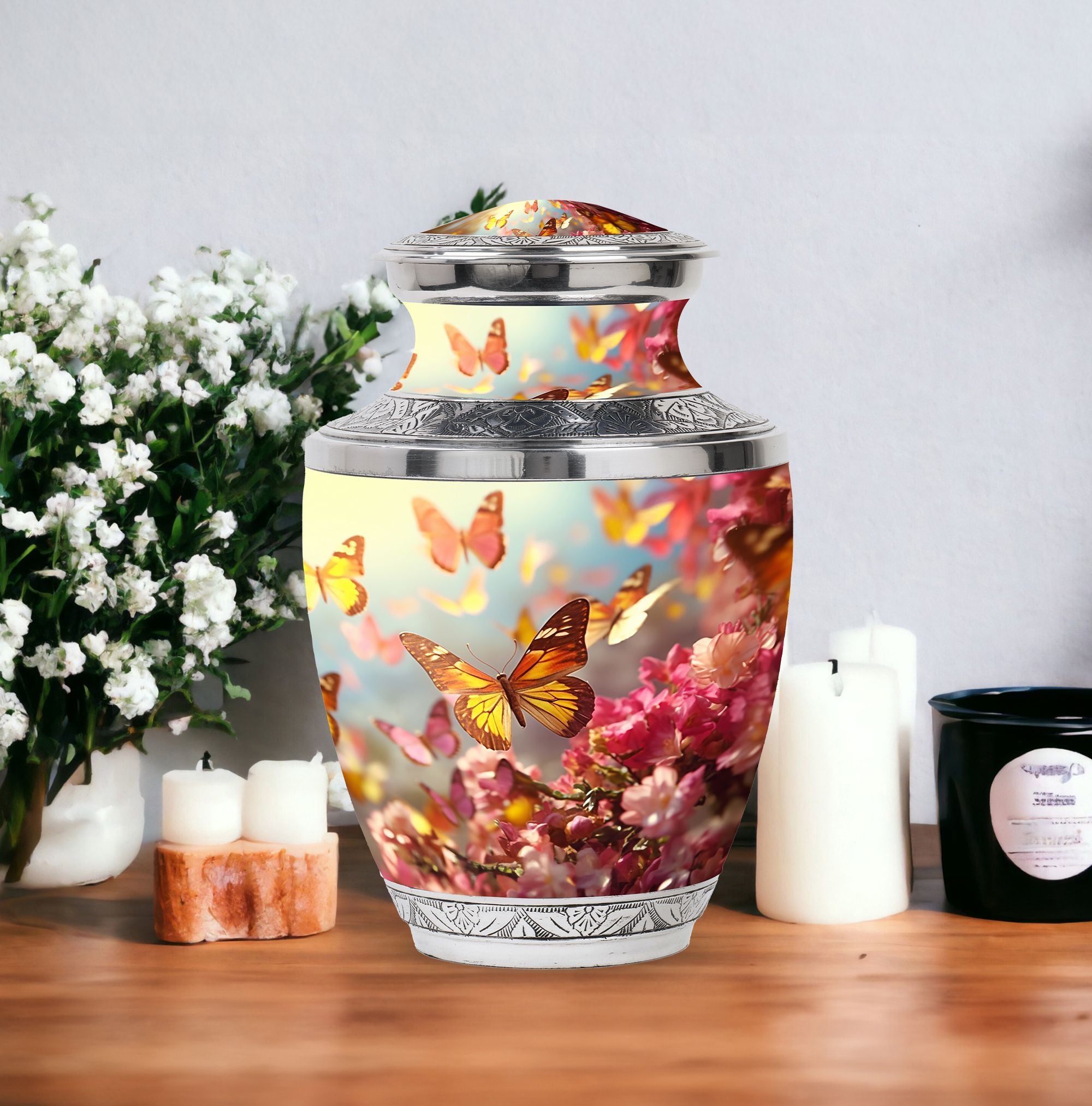 Immerse in the tranquil beauty of our Colorful Butterflies Large Urns. Crafted masterfully from Aluminium, these urns for ashes are a peaceful and serene resting place for your loved ones. Our cremation urn, standing 10 inches in height and weighing a substantial 3.3 pounds, is not just an urn, but rather, a piece of art that reflects everlasting love and memories. The notable capacity of 200 cubic inches ensures ample space for containment. For a personalized sentiment, names can be etched onto the urn. The urn comes accompanied with a velvet pouch for a dignified containment of ashes. The exceptional 3-inch size makes it a cherished keepsake that can be displayed in your home. Our urns are not just for human remains but serve as a timeless remembrance. The use of diverse terms such as Memorial Urns for Ashes, Personalized Urns for Human Ashes, Metal Cremation Urns, or Urns for Human Remains could assist you in finding our extraordinary offering. Experience a comforting presence with our Colorful Butterflies Urns.