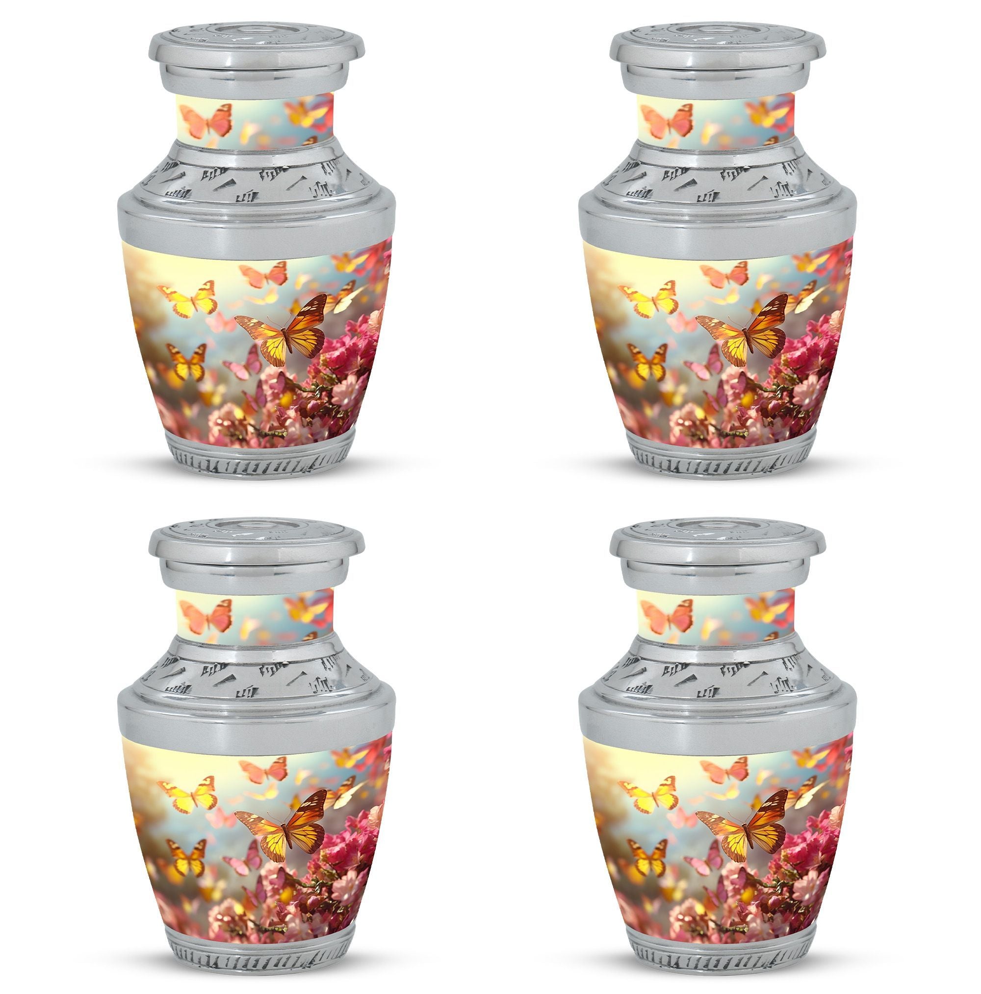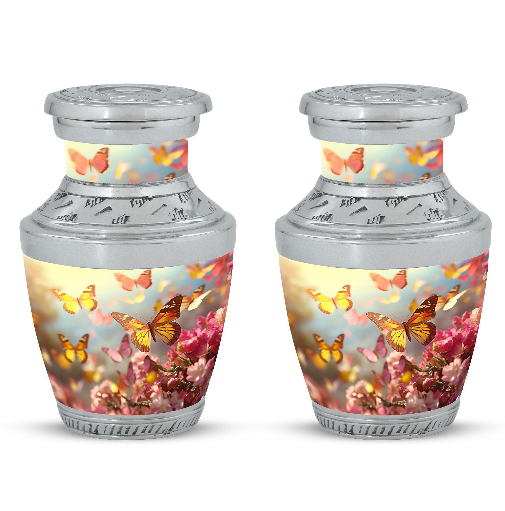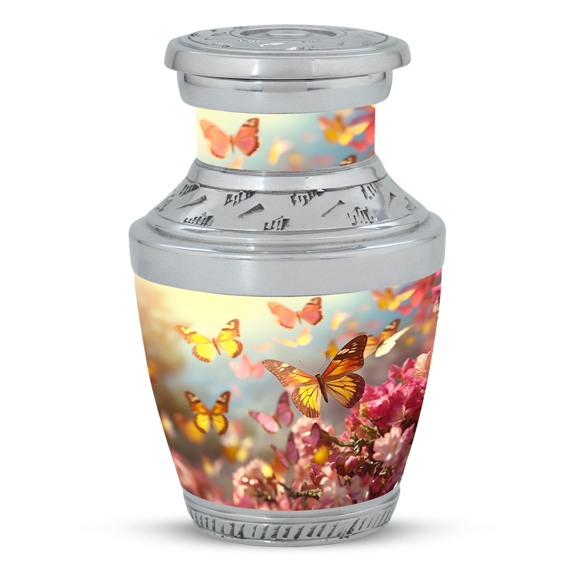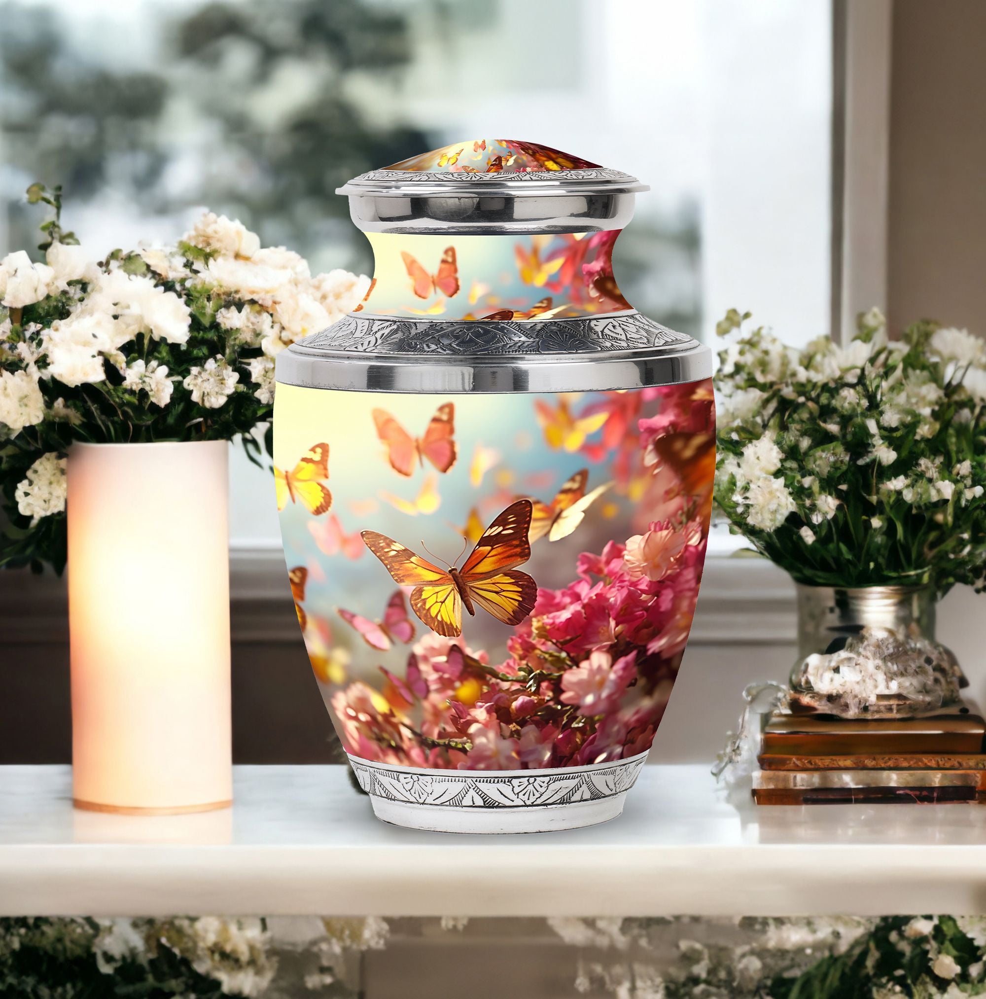 Immerse in the tranquil beauty of our Colorful Butterflies Large Urns. Crafted masterfully from Aluminium, these urns for ashes are a peaceful and serene resting place for your loved ones. Our cremation urn, standing 10 inches in height and weighing a substantial 3.3 pounds, is not just an urn, but rather, a piece of art that reflects everlasting love and memories. The notable capacity of 200 cubic inches ensures ample space for containment. For a personalized sentiment, names can be etched onto the urn. The urn comes accompanied with a velvet pouch for a dignified containment of ashes. The exceptional 3-inch size makes it a cherished keepsake that can be displayed in your home. Our urns are not just for human remains but serve as a timeless remembrance. The use of diverse terms such as Memorial Urns for Ashes, Personalized Urns for Human Ashes, Metal Cremation Urns, or Urns for Human Remains could assist you in finding our extraordinary offering. Experience a comforting presence with our Colorful Butterflies Urns.
