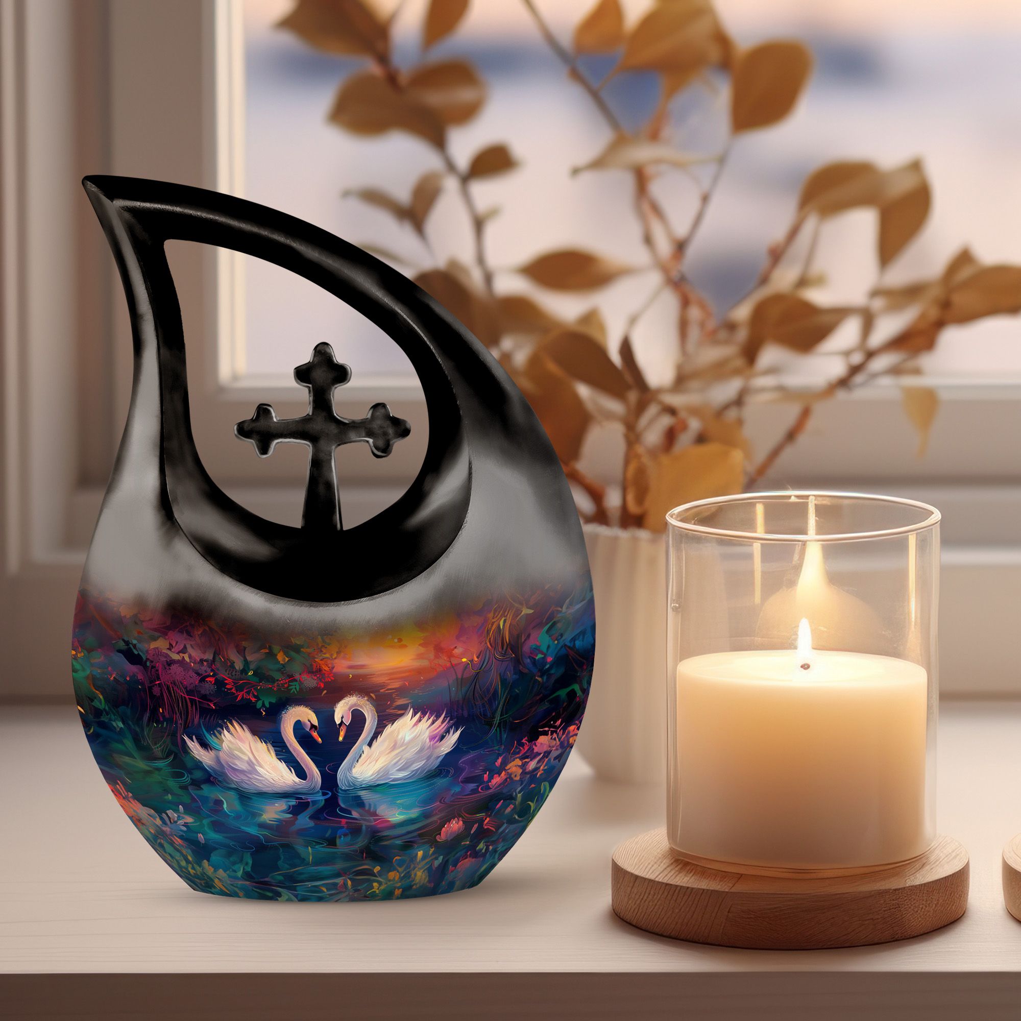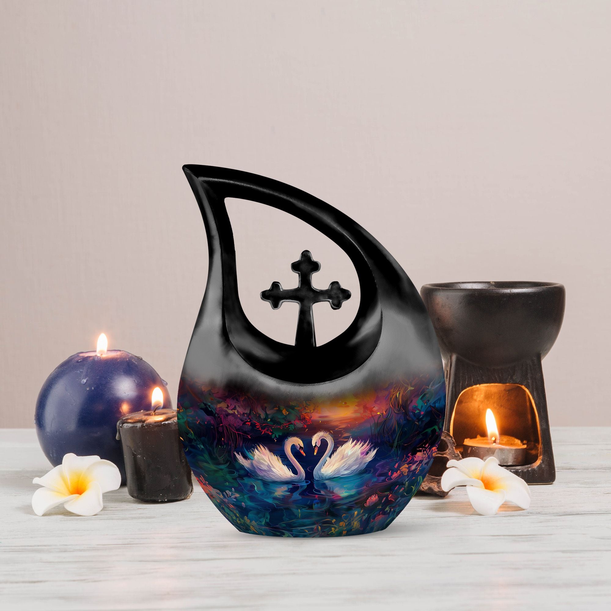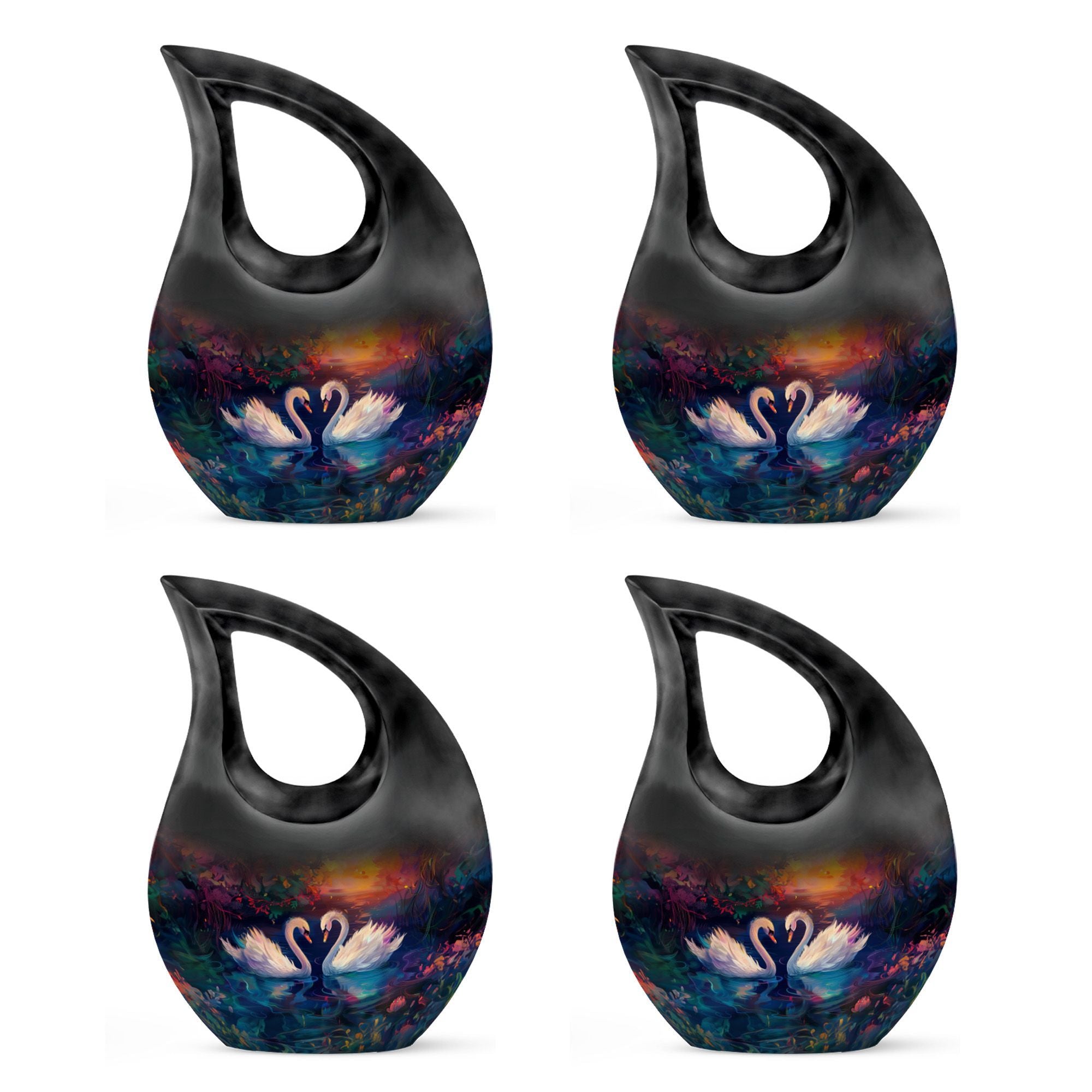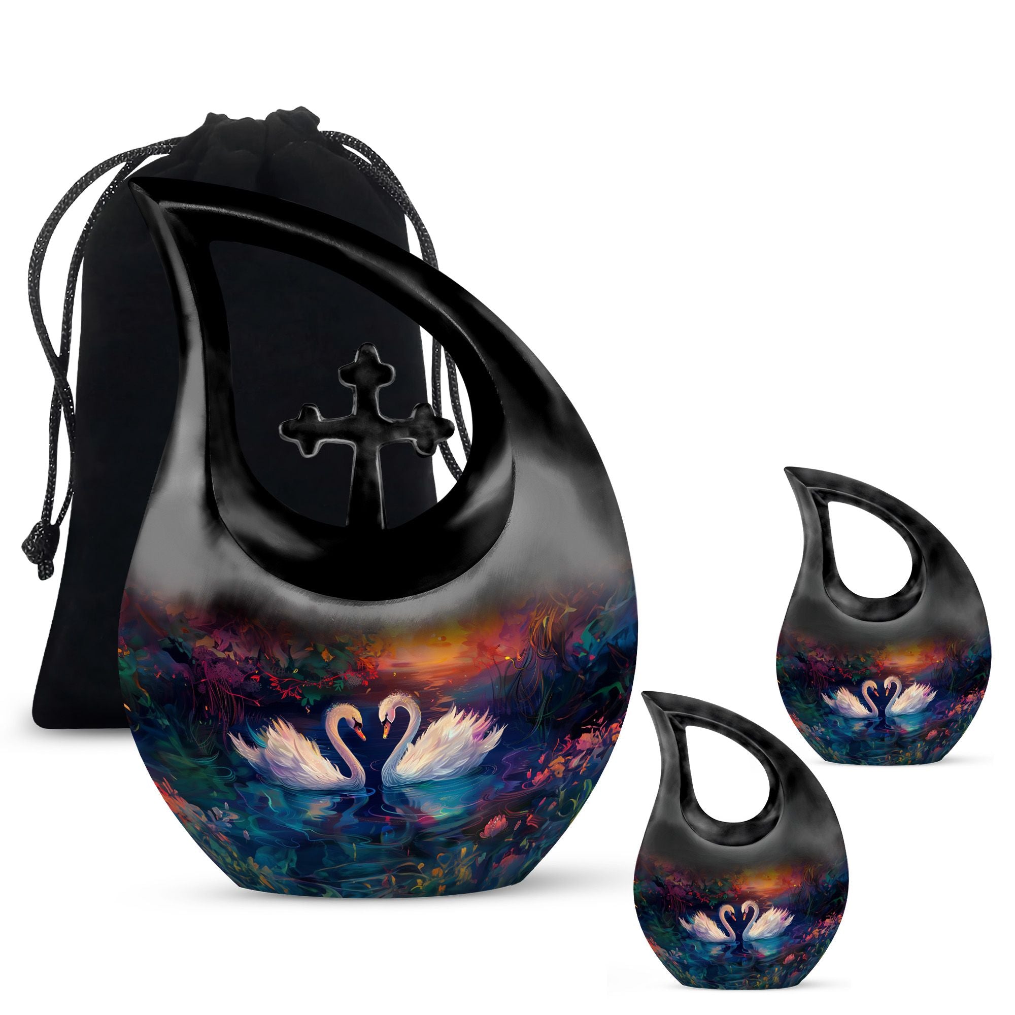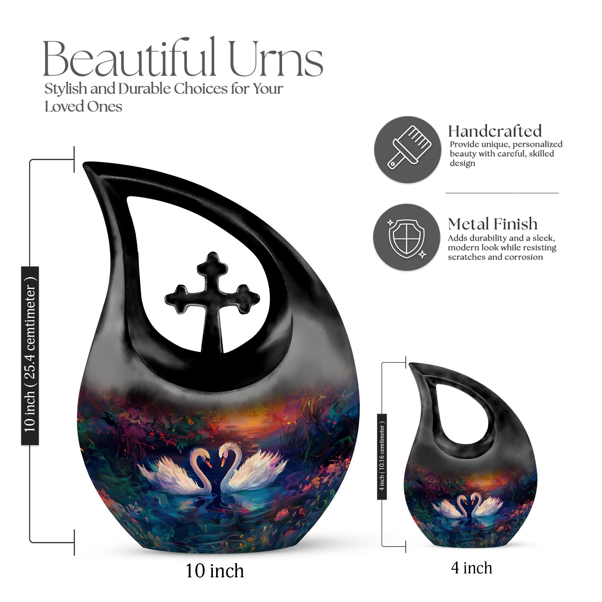 Experience a dignified celebration of a dear one's life with our 'Sunset Swans Harmony Urn'. This special urn paints a tranquil scene of swans amid breath-taking sunset, providing a shrine that exudes eternal peace for departed souls. Crafted from durable Aluminium, this 10-inch urn is robust with a weight of 3.3 pounds. Its 'Cross Drop' motif generates spiritual tranquil reflecting our devotion and honoring the departed. The urn is large, holding up to 200 cubic inches of ashes. It is accompanied by a velvet pouch, ensuring the precious keepsakes remain safe and secure. Customization option is available to personalize this sacred monument with engraved names making it truly unique. This urn is perfect for those searching for 'memorial urns', 'Cremation Caskets', 'Cremation Urn Vault', 'Buy Urn For Ashes', or 'Unique Cremation Keepsakes'. Share and remember the beautiful moments of your loved ones with our 'Sunset Swans Harmony Urn'.