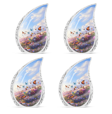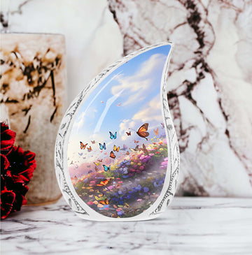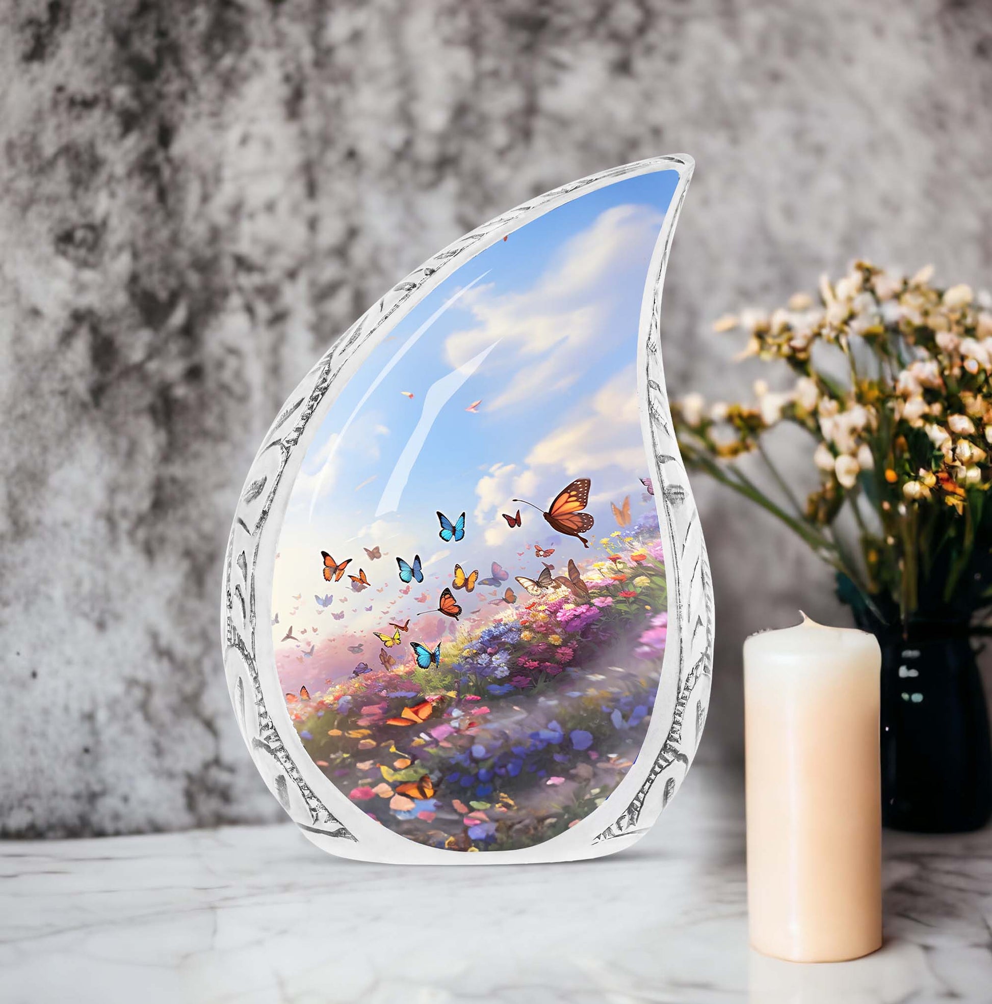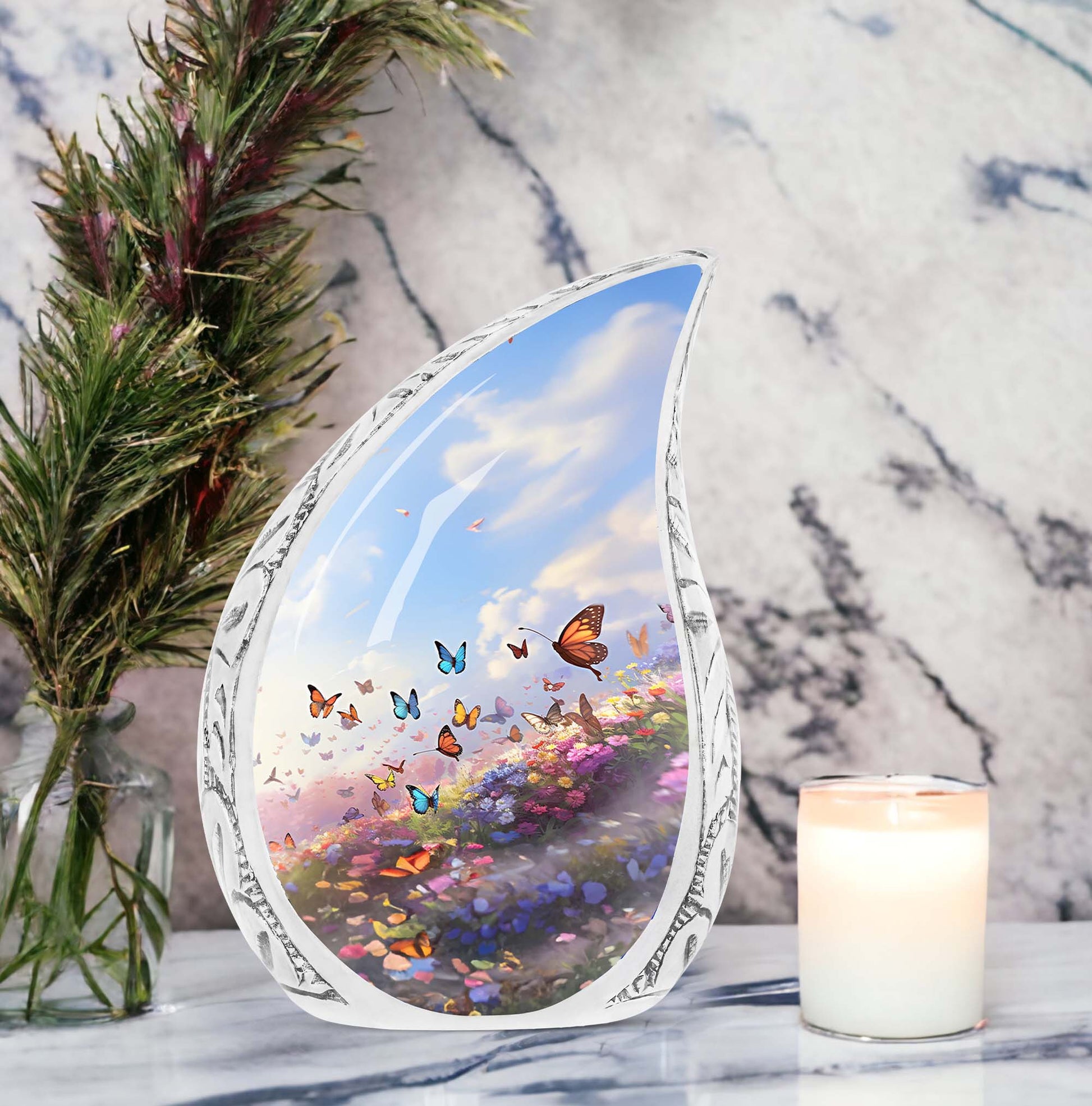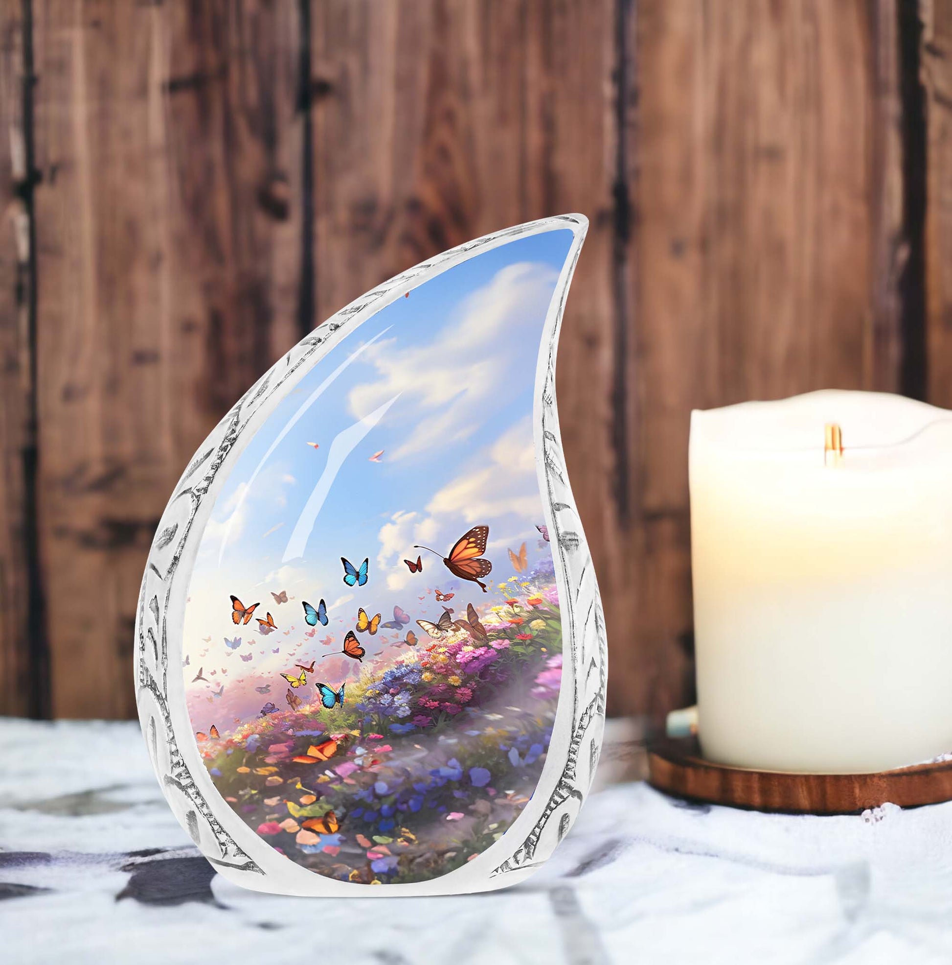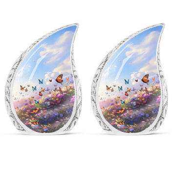 Striking a perfect balance between classic design and personal sentiment, the Butterflies Memorial Cremation Urn is a beloved choice for those seeking urns for cremation. Measuring at a substantial 10 inches in height and weighing 3.3 pounds, this large urn's capacity can accommodate up to 200 cubic inches. Crafted meticulously from enduring aluminium, each urn ensures lasting durability accompanying its timeless appeal. Far from ordinary, this urn offers an opportunity for personalization, allowing the engraving of names making it a unique, heartfelt memorial item. Included within the package comes a soft velvet pouch - an ideal place to safely contain the ashes. With its 3-inch size, it's neither overwhelming nor insignificant. Amidst an array of urns for ashes, this particular product stands out owing to its pragmatic features and superior craftsmanship. Ideal for remembering Dad or keeping human remains safe, this urn caters to the essential needs of a memorial ceremony.