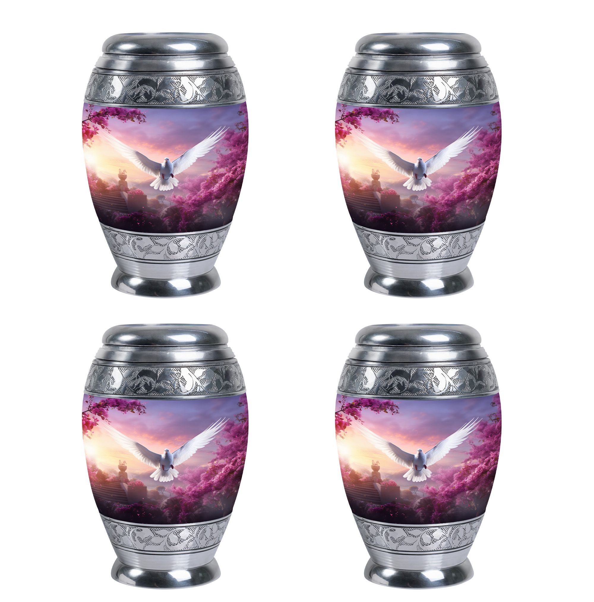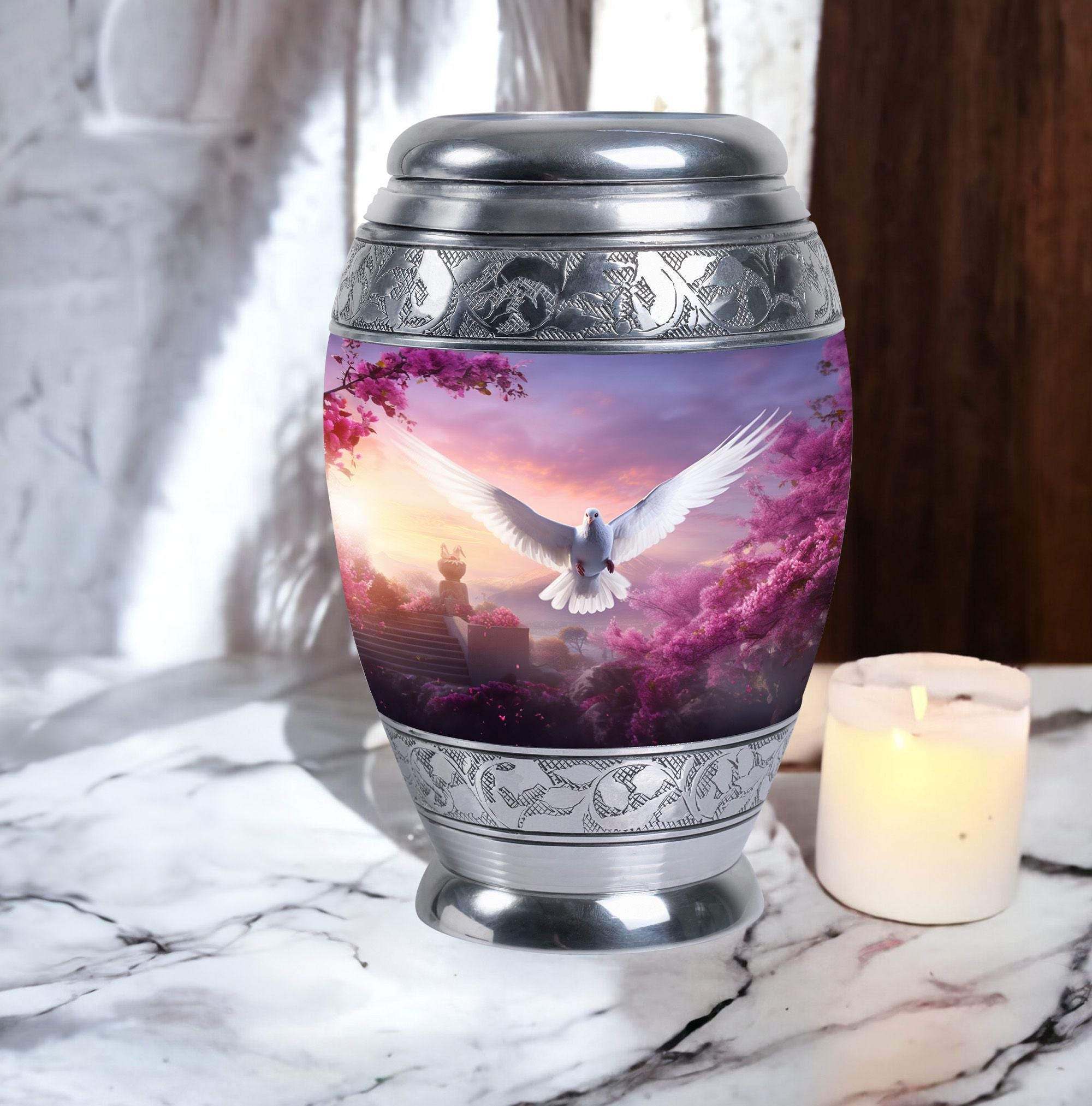 Honor your loved one's memory with our elegant Dove Cremation Urn, a noble vessel for retaining dear human ashes. Sized neatly at 3 inches yet bearing a capacity to Hold up to 200 cubic inches, this urn can comfortably contain ashes while maintaining a discreet and manageable weight of 3.3 pounds. Conceived in a timeless classic urn type, our large urn's structure stands proudly at a height of 10 inches, providing notable size without overpowering. Our urn is crafted meticulously with the utmost respect using robust and durable Aluminium, ensuring long-lasting custody of your loved one's memory. Included in the package is a luxe velvet pouch, offering an additional layer of containment and protection. Unique to this tribute is the offering of personal engraving, a heart-touching way to memorialize your precious person. Renowned as Urns for Dad or Decorative Urns for Human Ashes, our Dove Cremation Urn elegantly serves its noble purpose while simultaneously invoking an aesthetic of tasteful reverence. For those seeking Modern Urns, this cremation urn provides a perfect blend of traditional technique and contemporary design.