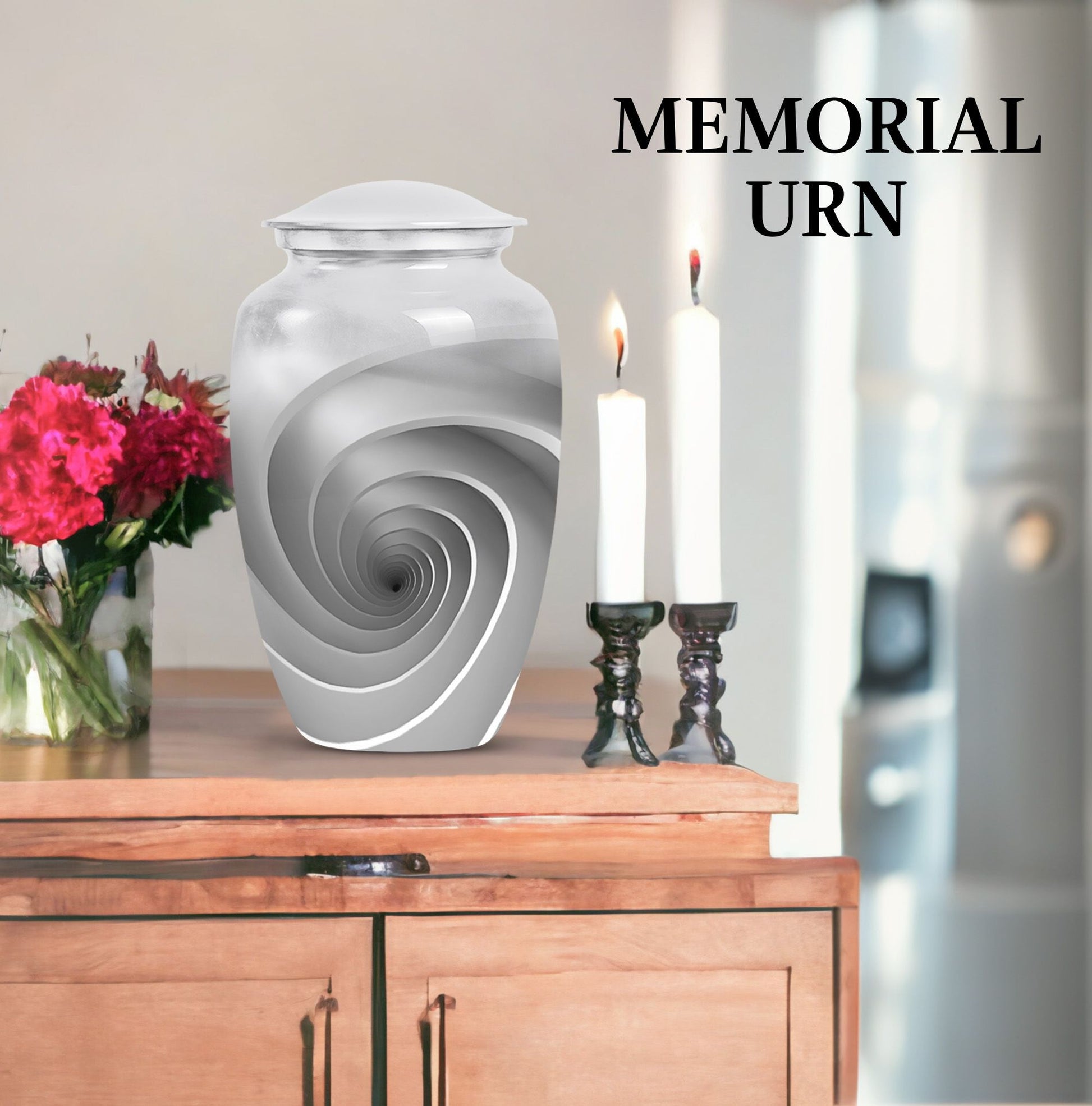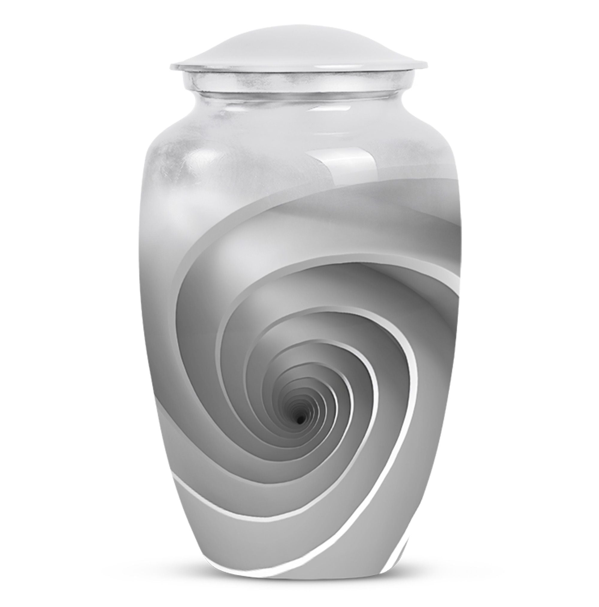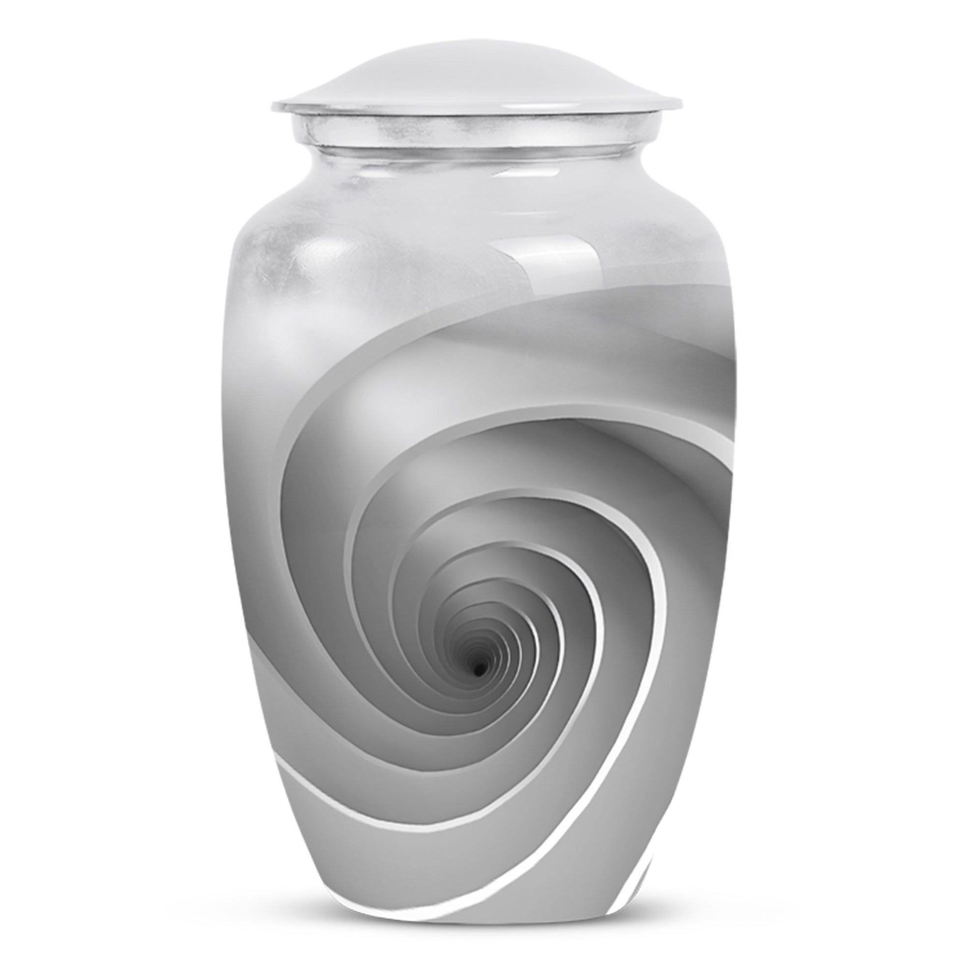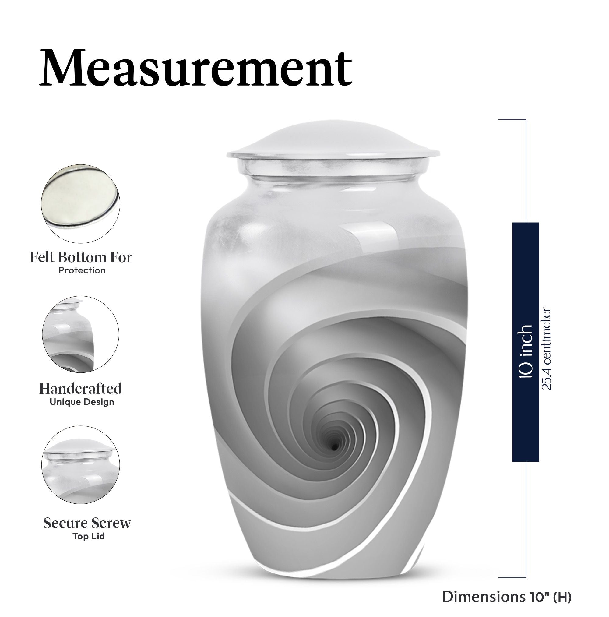 Honor your loved one with our premium-quality Spiral Urn. Made from durable aluminium, this large cremation urn measures 10 inches in height, boasting a capacity of 200 cubic inches, perfect for use as a memorial urn. This masterpiece is lightweight, at just 3.3 pounds, easy to manage and position, and it arrives with a soft velvet pouch for the secure containment of ashes. Each carefully manufactured Spiral Urn exhibits an abstract theme, delivering a unique charm in its presentation. Personalization options are available, allowing you to engrave names for an added layer of sentimentality. While the 'CLASSIC URN' design isn't our highlight, the craftsmanship exudes a timeless appeal that matches any decor. Whether searched as 'urn for funeral' or 'burial urns for men', our product stands out in the crowd. This large urn with its iridescent metal creates a stunning tribute that honors your loved one's unique life.