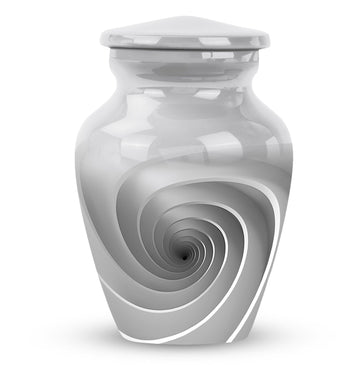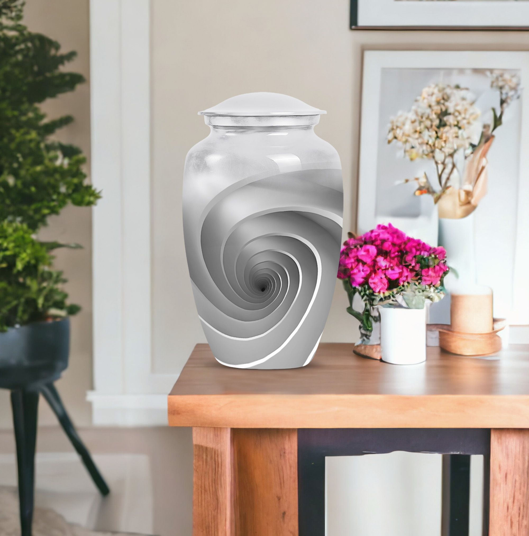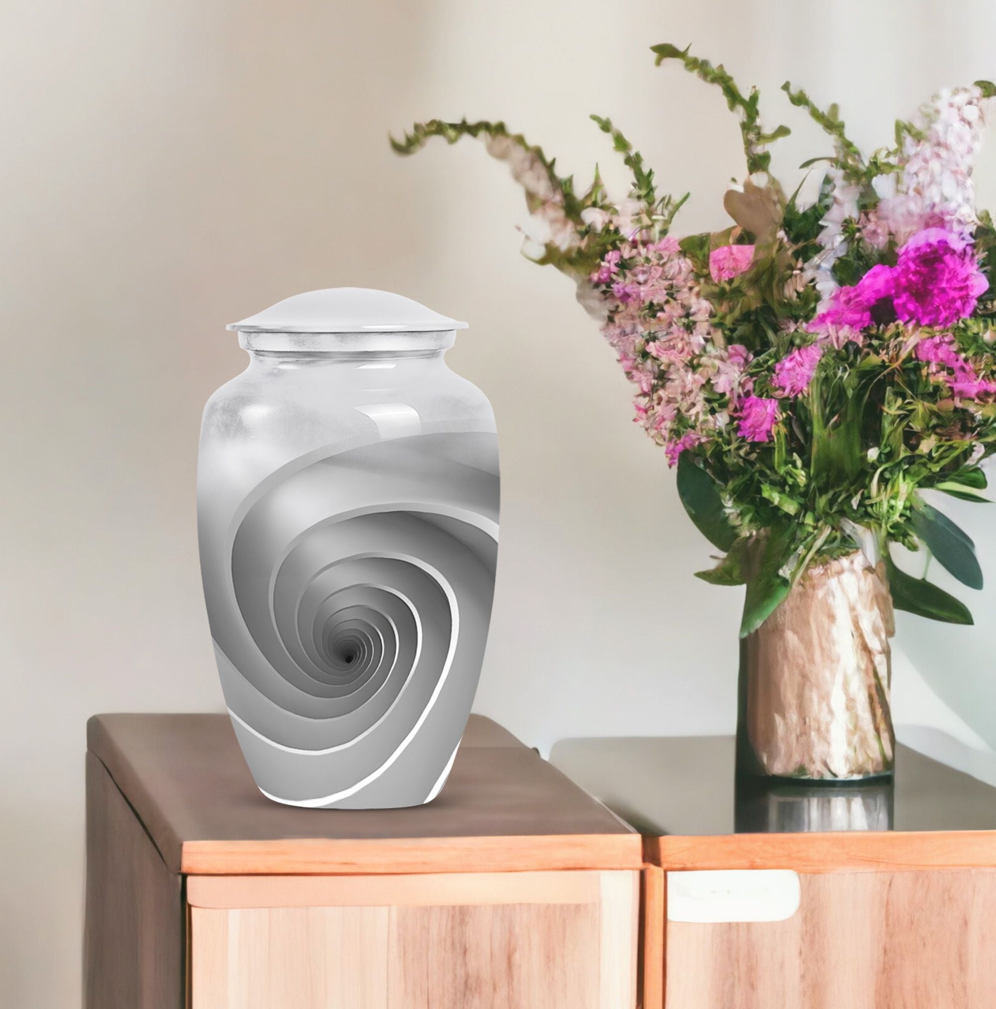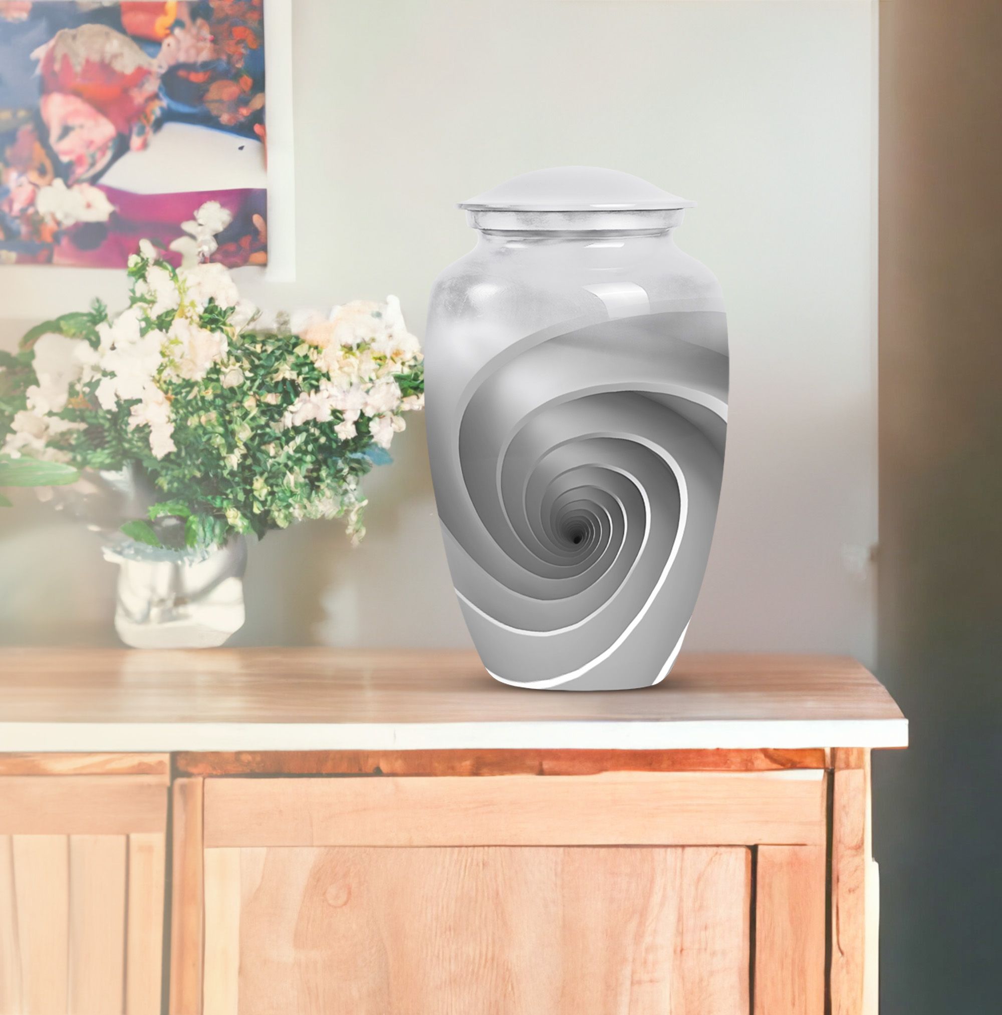 Honor your loved one with our premium-quality Spiral Urn. Made from durable aluminium, this large cremation urn measures 10 inches in height, boasting a capacity of 200 cubic inches, perfect for use as a memorial urn. This masterpiece is lightweight, at just 3.3 pounds, easy to manage and position, and it arrives with a soft velvet pouch for the secure containment of ashes. Each carefully manufactured Spiral Urn exhibits an abstract theme, delivering a unique charm in its presentation. Personalization options are available, allowing you to engrave names for an added layer of sentimentality. While the 'CLASSIC URN' design isn't our highlight, the craftsmanship exudes a timeless appeal that matches any decor. Whether searched as 'urn for funeral' or 'burial urns for men', our product stands out in the crowd. This large urn with its iridescent metal creates a stunning tribute that honors your loved one's unique life.