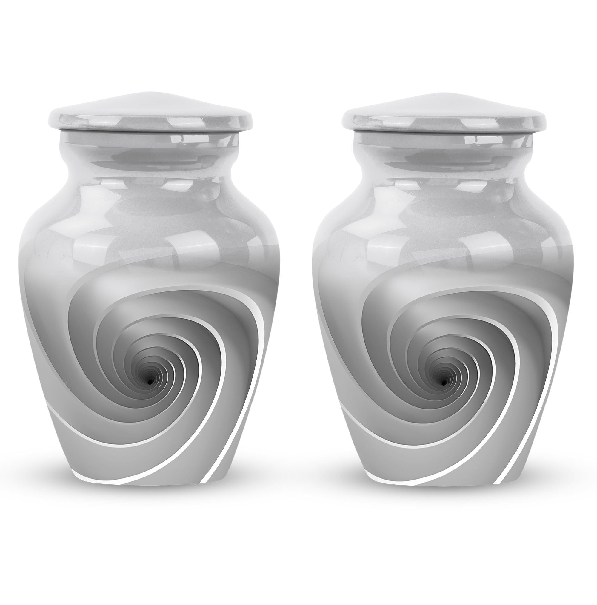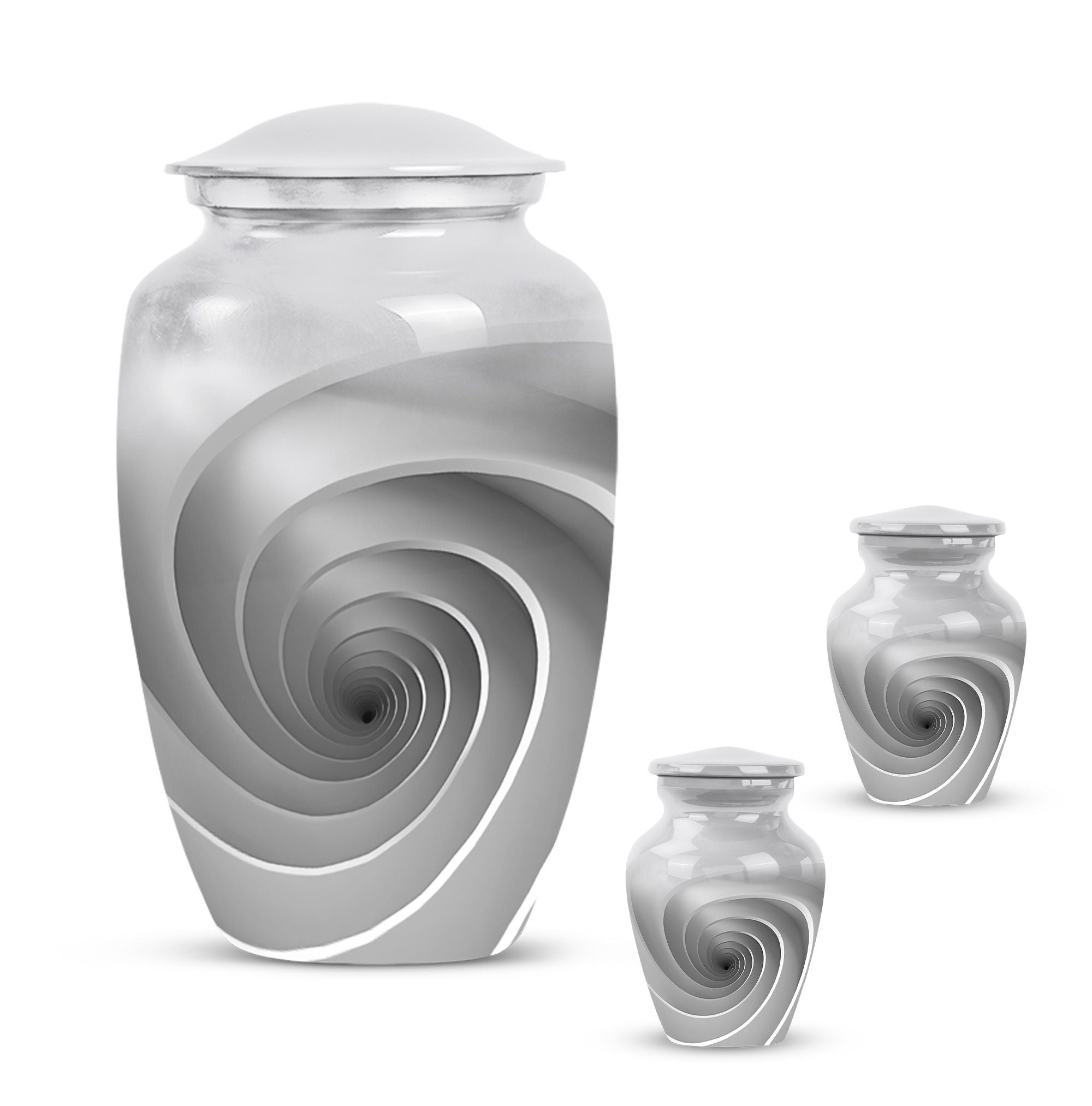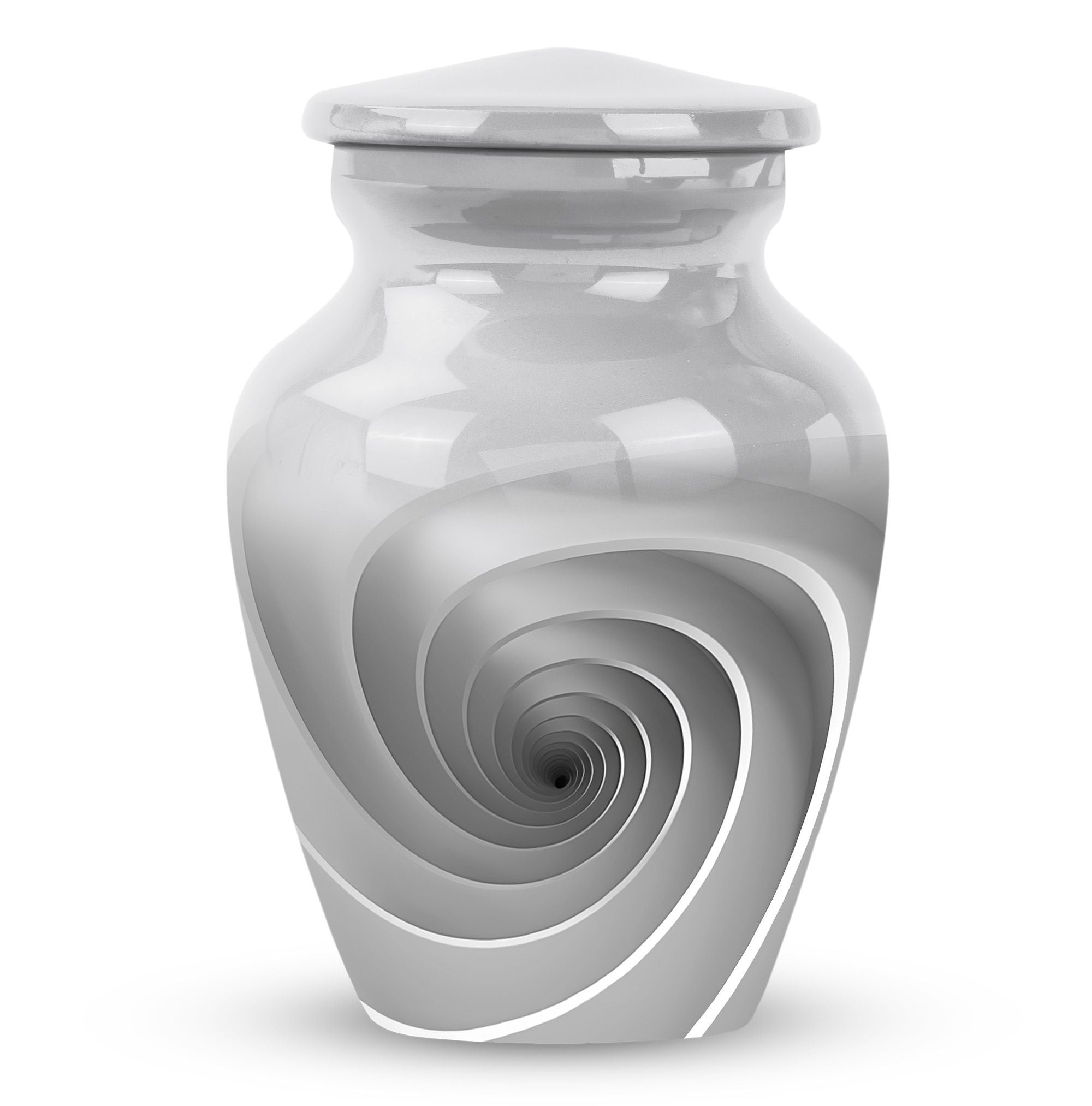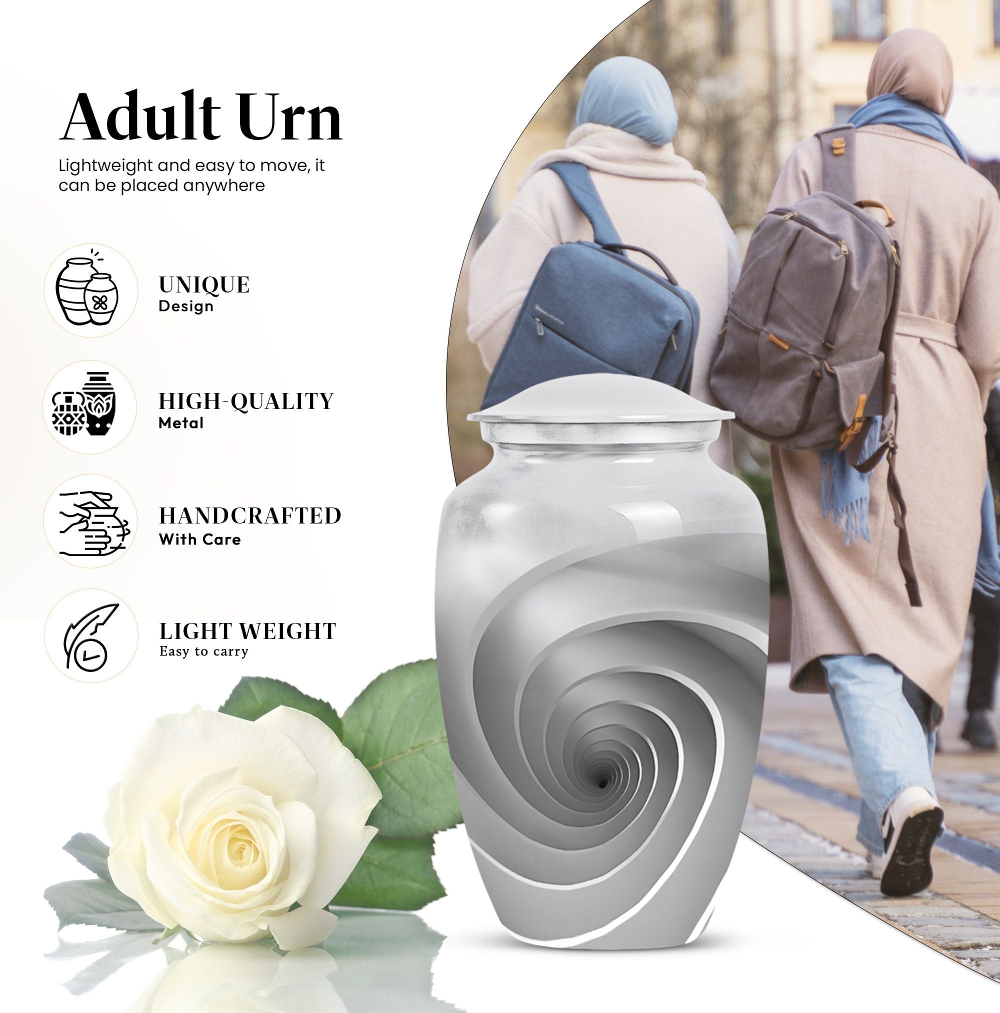 Honor your loved one with our premium-quality Spiral Urn. Made from durable aluminium, this large cremation urn measures 10 inches in height, boasting a capacity of 200 cubic inches, perfect for use as a memorial urn. This masterpiece is lightweight, at just 3.3 pounds, easy to manage and position, and it arrives with a soft velvet pouch for the secure containment of ashes. Each carefully manufactured Spiral Urn exhibits an abstract theme, delivering a unique charm in its presentation. Personalization options are available, allowing you to engrave names for an added layer of sentimentality. While the 'CLASSIC URN' design isn't our highlight, the craftsmanship exudes a timeless appeal that matches any decor. Whether searched as 'urn for funeral' or 'burial urns for men', our product stands out in the crowd. This large urn with its iridescent metal creates a stunning tribute that honors your loved one's unique life.