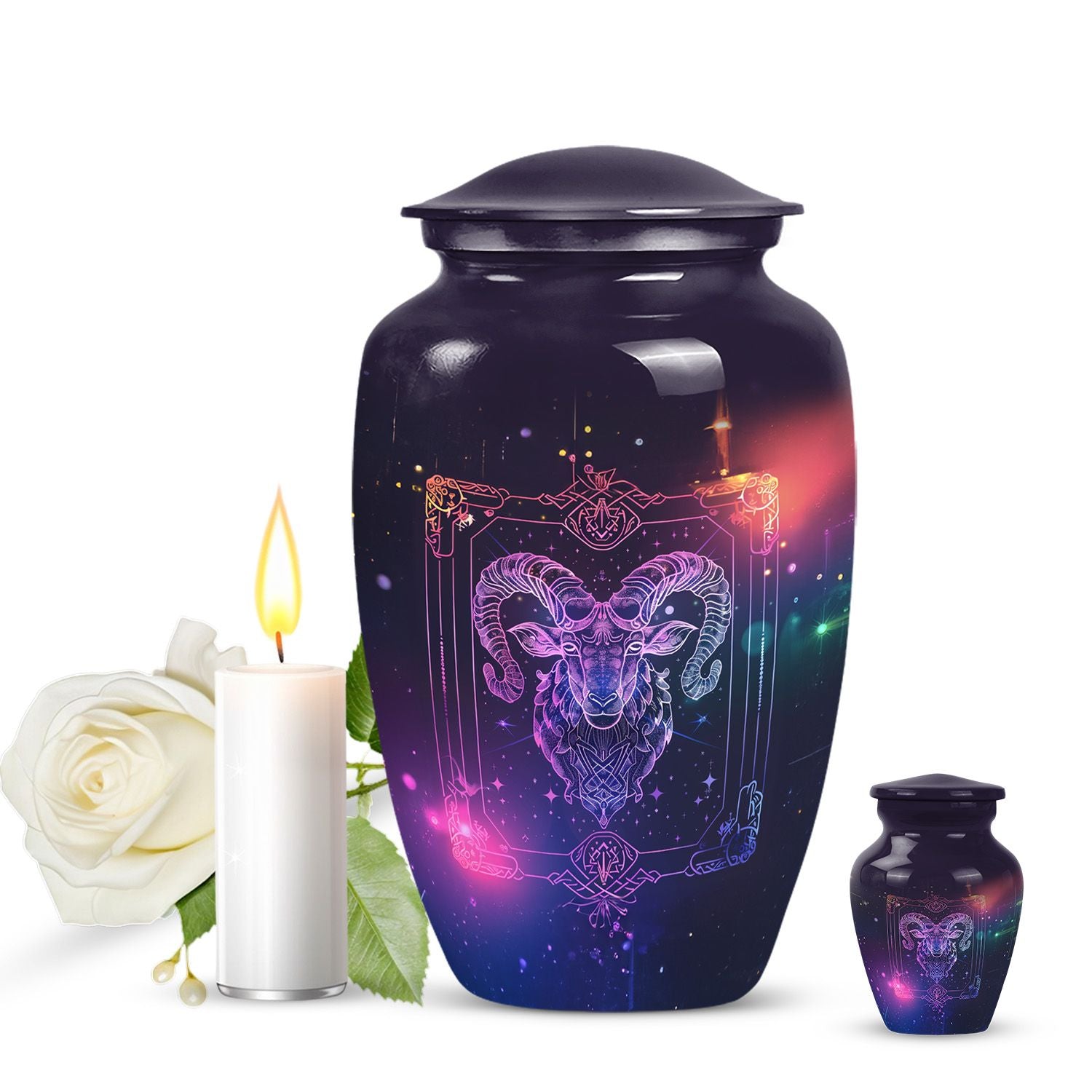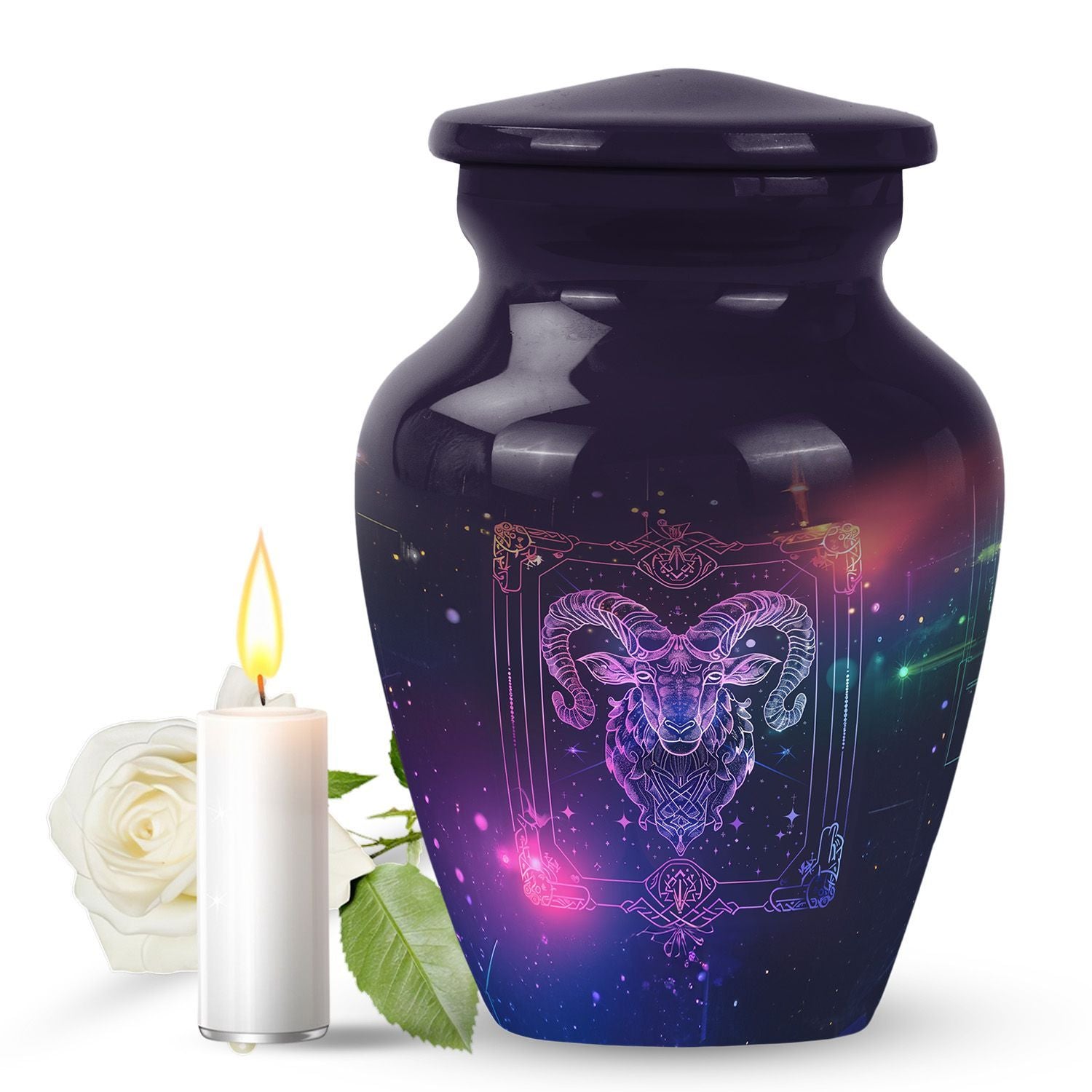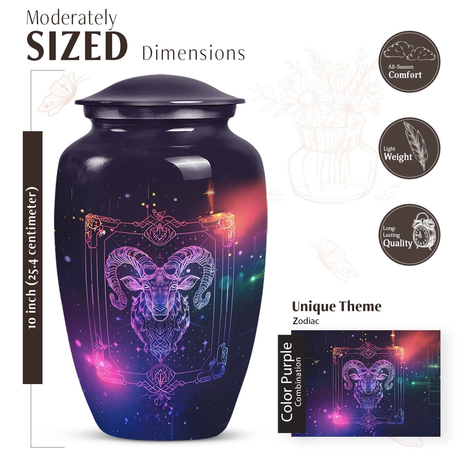Experience the elegance and spirituality of this 10-inch zodiac urn, a remarkable piece of memorial ceremony supplies that artfully mates tradition with style. Crafted from durable aluminium, this large urn embodies an abstract theme, thus allowing it to serve as a sophisticated, symbolic tribute. Internally commodious, it offers a generous capacity of 200 cubic inches for cremation ashes and is delivered to you with a velvet pouch for secure containment. Apart from weighing a modest 3.3 pounds, its dimensions smartly fix at a height of 10 inches. More so, the distinctiveness is further amplified with the option to personalize with engraved names, expressing remembrance in a unique manner. This cremation urn reflects a blend of exquisite workmanship and compassionate intent, mainstreaming it as a multipurpose urn with a twist. This burial urn not just secures the ashes, but also peace for the dear departed. Please note that despite being known as a cremation urn for adult ashes, it is equally appropriate for anyone, transcending the confines of age and gender. A timeless classic, it graces every memorial event with dignity and reverence.