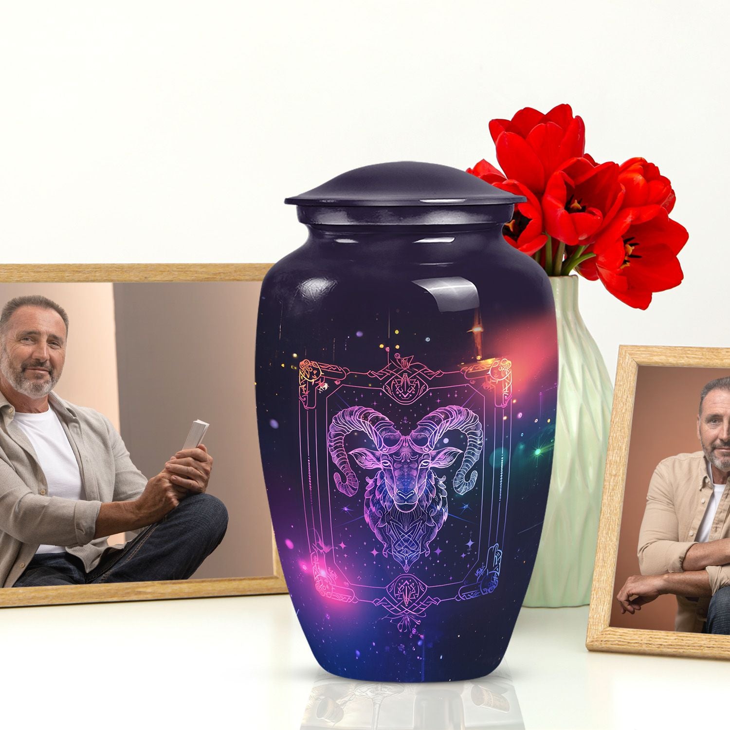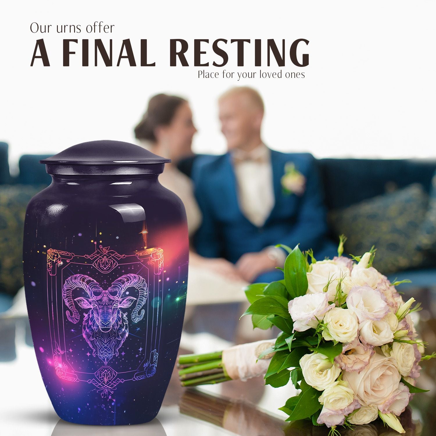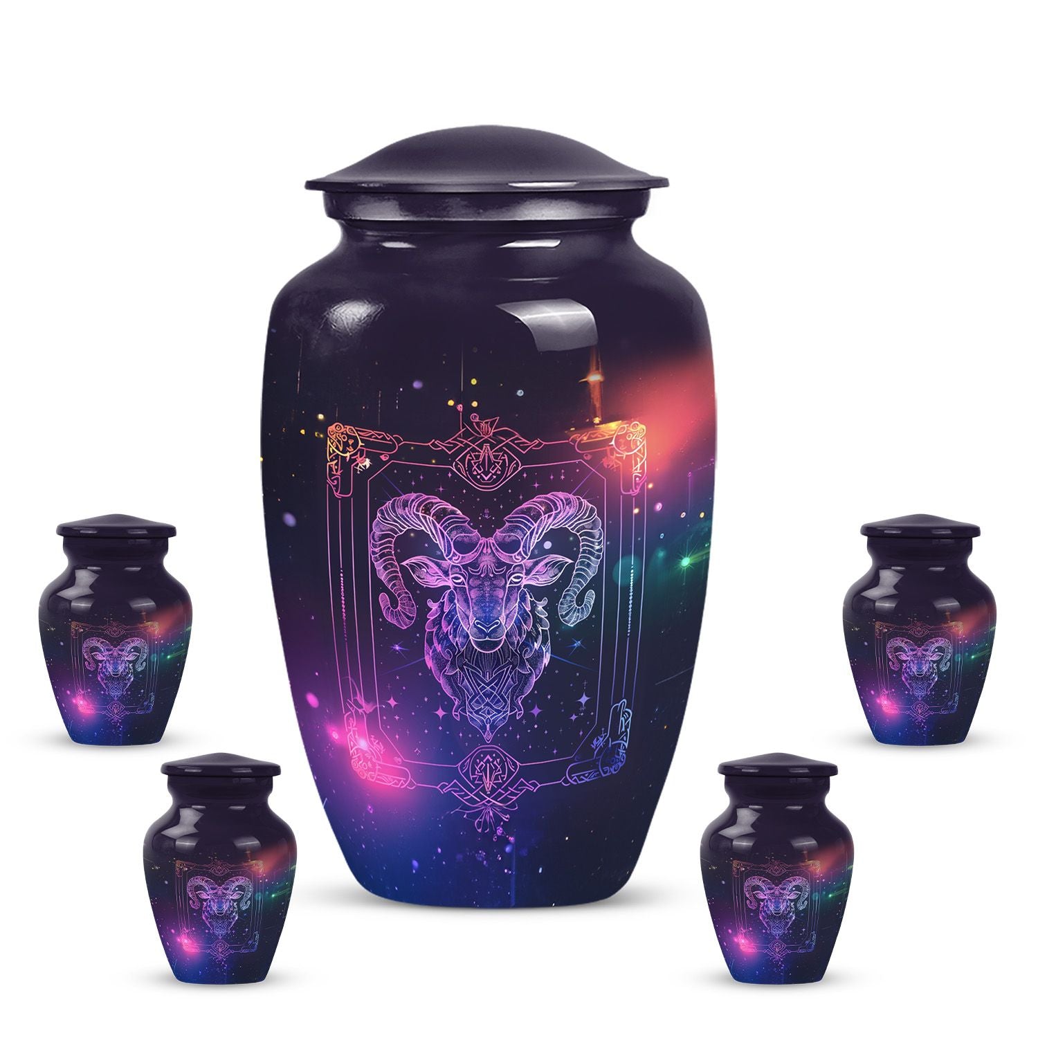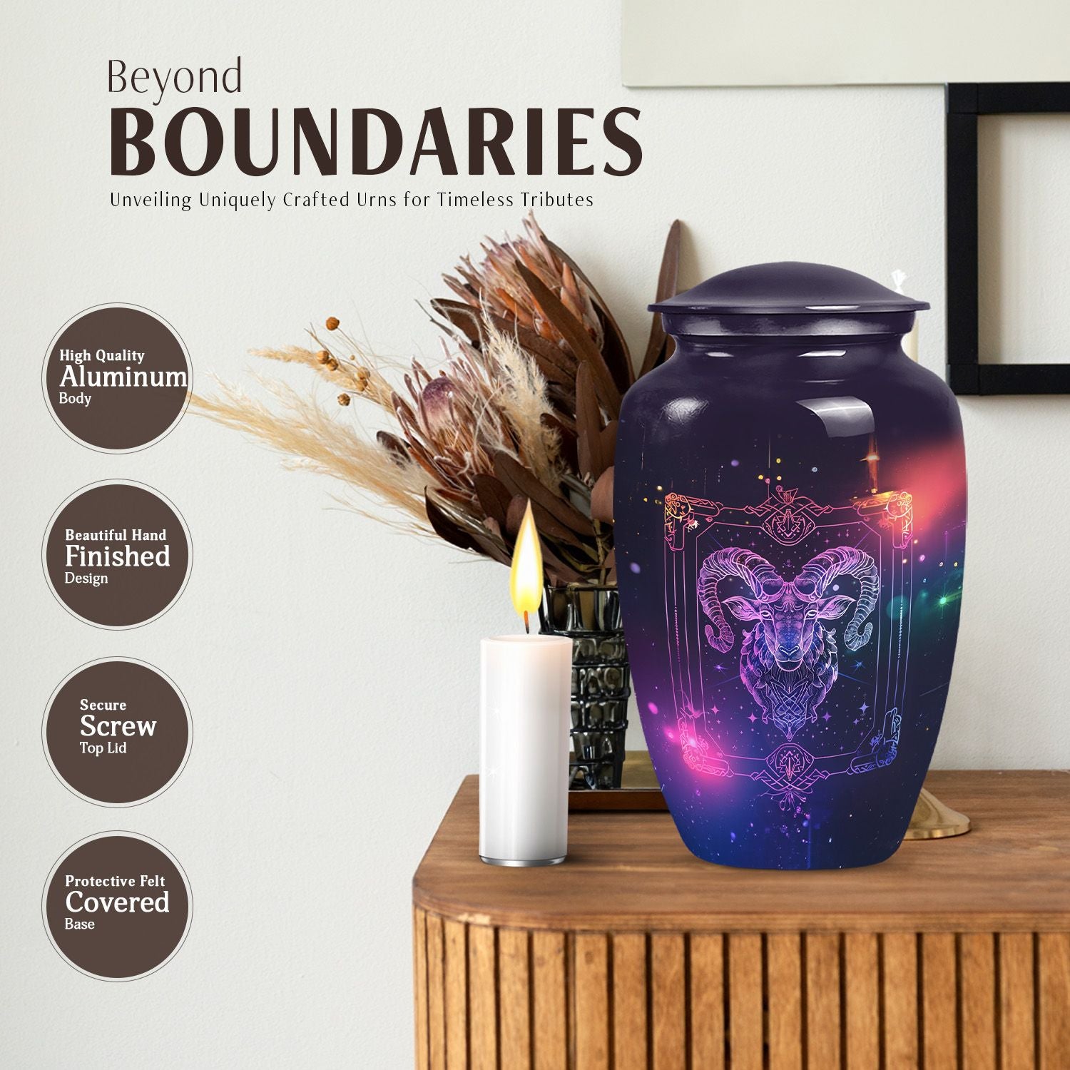 Experience the elegance and spirituality of this 10-inch zodiac urn, a remarkable piece of memorial ceremony supplies that artfully mates tradition with style. Crafted from durable aluminium, this large urn embodies an abstract theme, thus allowing it to serve as a sophisticated, symbolic tribute. Internally commodious, it offers a generous capacity of 200 cubic inches for cremation ashes and is delivered to you with a velvet pouch for secure containment. Apart from weighing a modest 3.3 pounds, its dimensions smartly fix at a height of 10 inches. More so, the distinctiveness is further amplified with the option to personalize with engraved names, expressing remembrance in a unique manner. This cremation urn reflects a blend of exquisite workmanship and compassionate intent, mainstreaming it as a multipurpose urn with a twist. This burial urn not just secures the ashes, but also peace for the dear departed. Please note that despite being known as a cremation urn for adult ashes, it is equally appropriate for anyone, transcending the confines of age and gender. A timeless classic, it graces every memorial event with dignity and reverence.