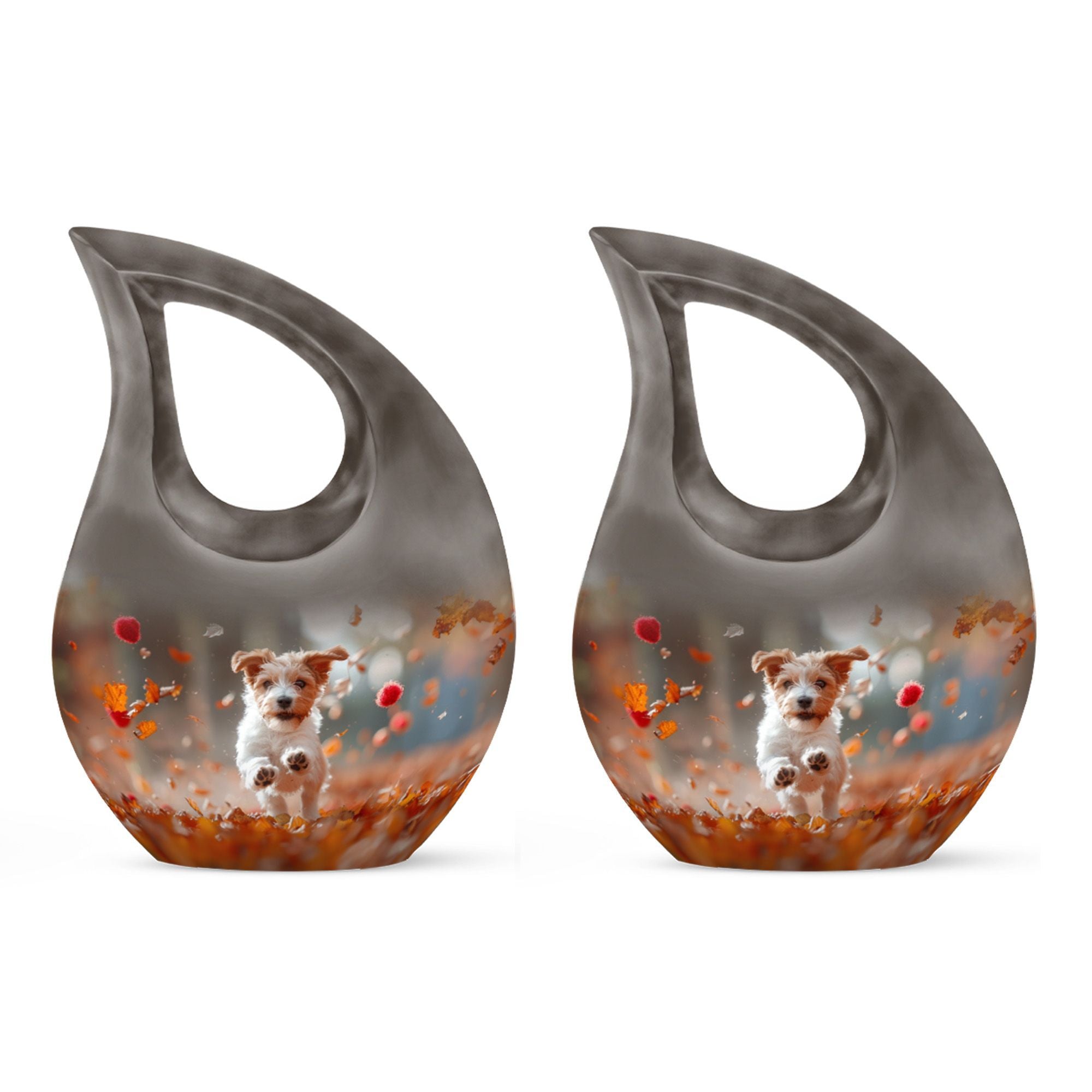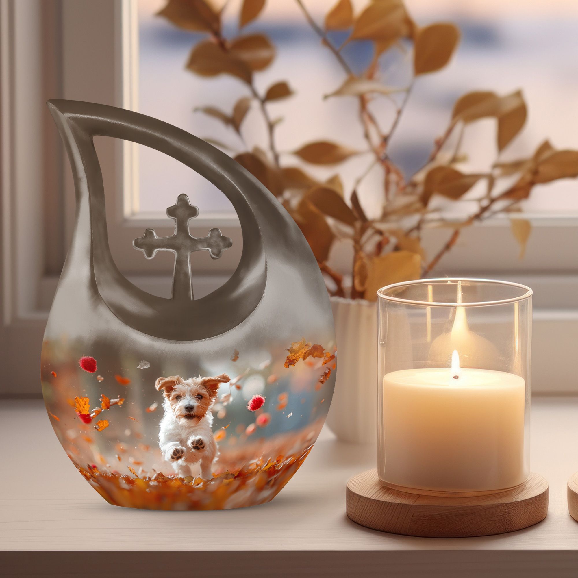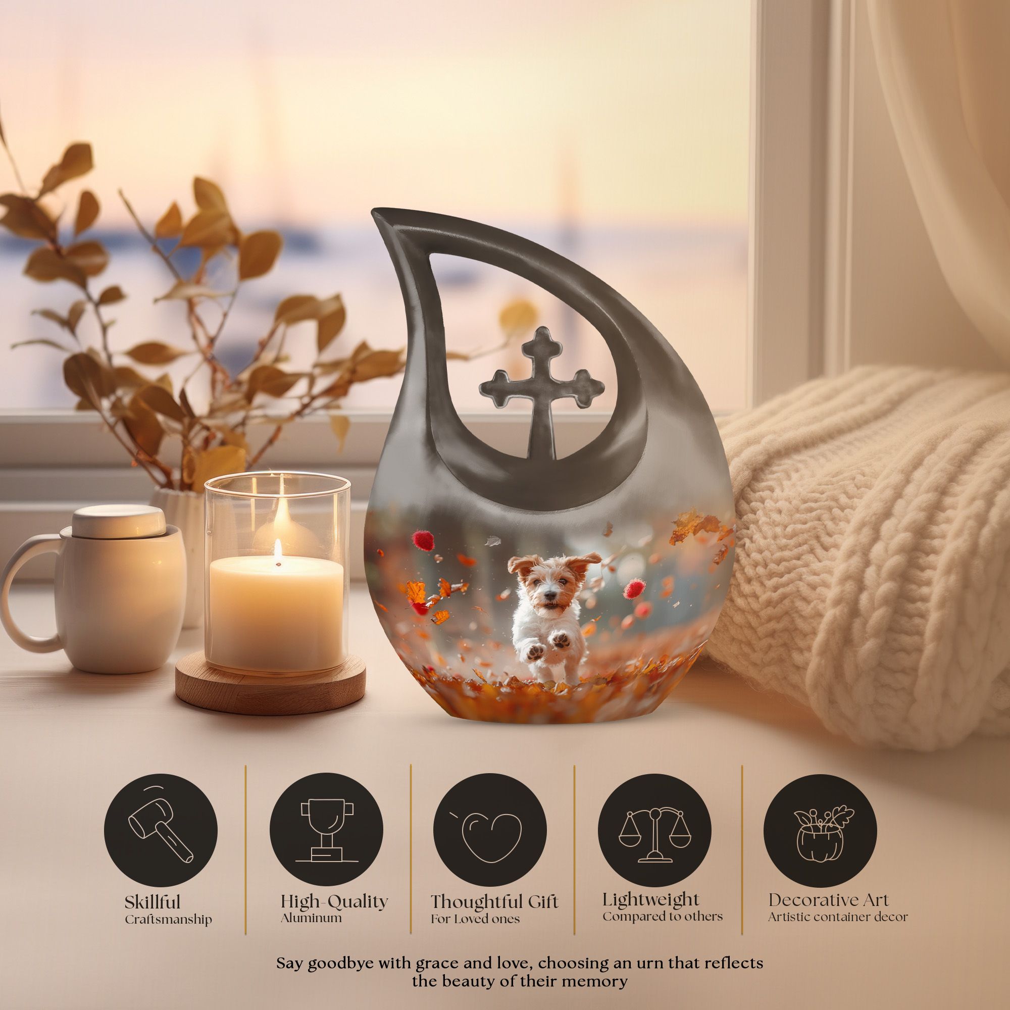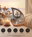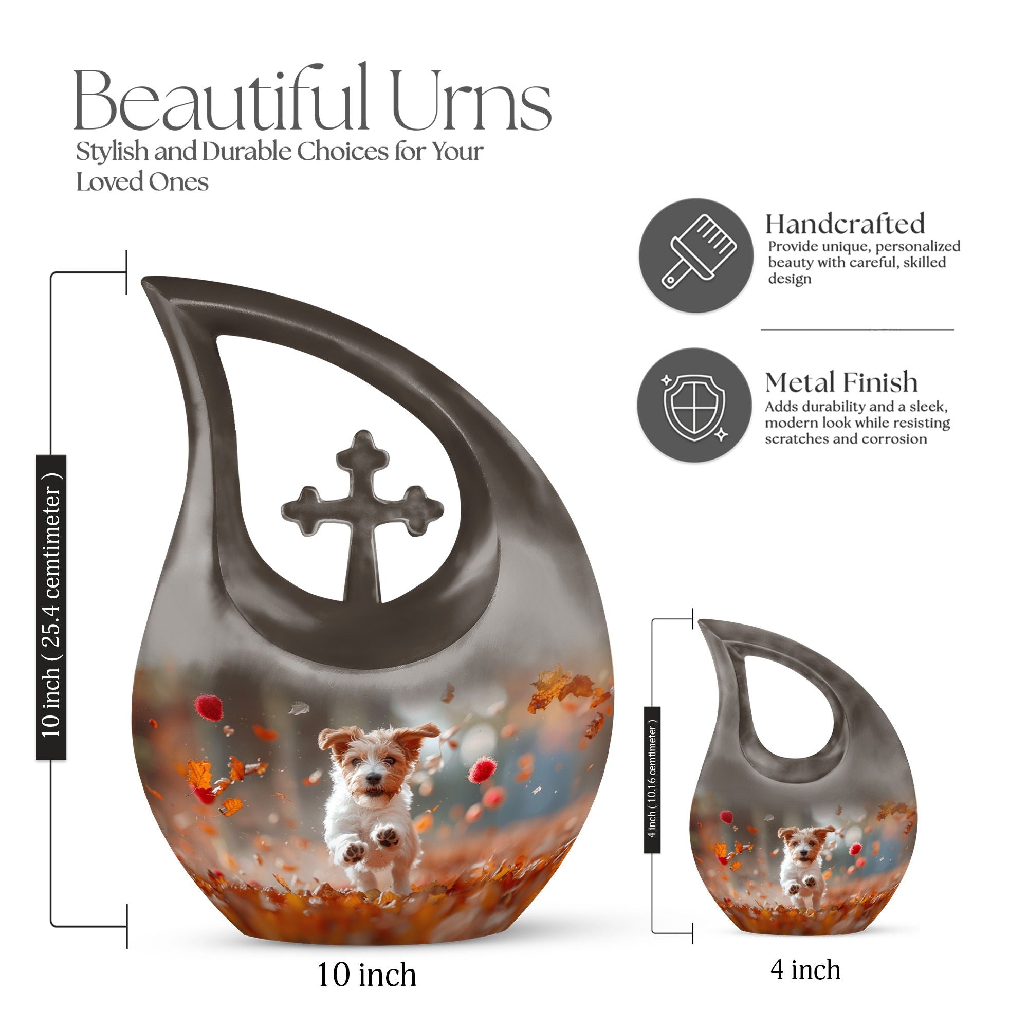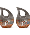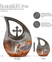 Solemn yet beautiful, the Harvest Pup Frolic Urn is an elegant solution for storing the ashes of your cherished ones. Crafted from durable aluminium, it has a weight of 3.3 pounds and stands 10 inches tall. Not just a mere repository, this urn invokes an essence of peace and remembrance with its Cross Drop design and Harvest Pup Frolic theme. Its size constitutes a generous capacity of 200 cubic inches, ample to accommodate the ashes of adults. The cremation urn comes with a plush velvet pouch for containment and thoughtful handling of the ashes. You can further personalize this urn by engraving names onto it, enhancing the intimacy of this precious keepsake. Ideal for those searching for 'Cremation Ash Vases', 'Personalized Urns', 'Decorative Urns For Ashes', or 'Containers For Ashes Of Loved Ones', the Harvest Pup Frolic Urn is a lasting tribute to your loved one's memory.