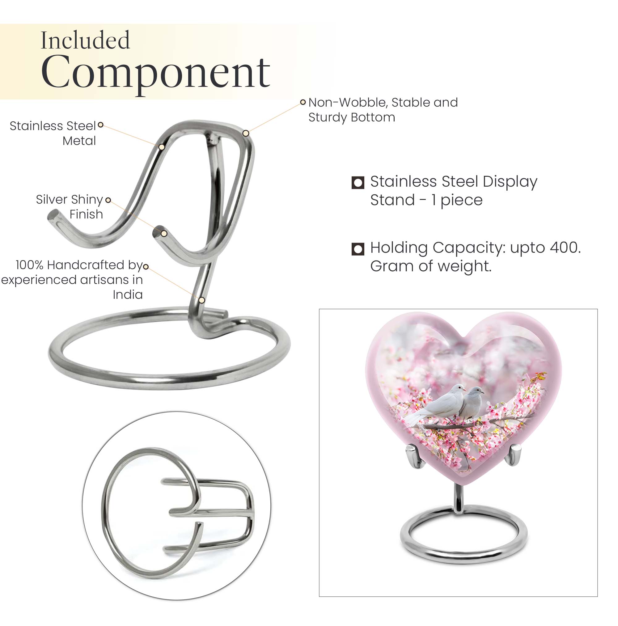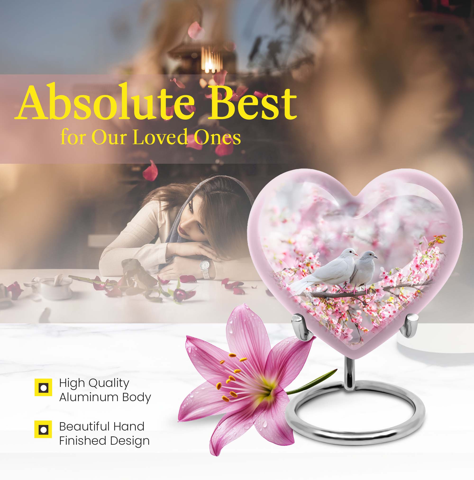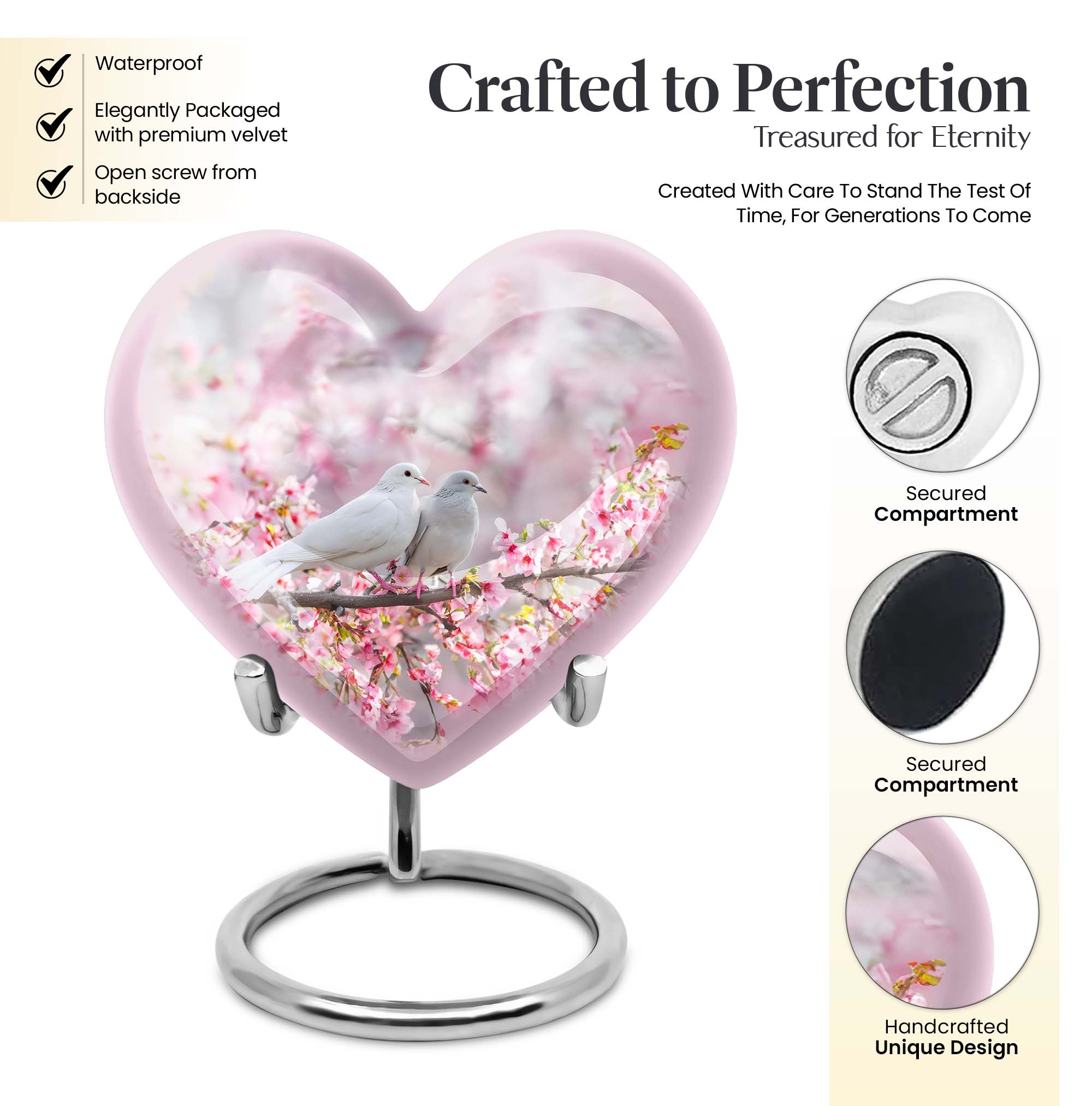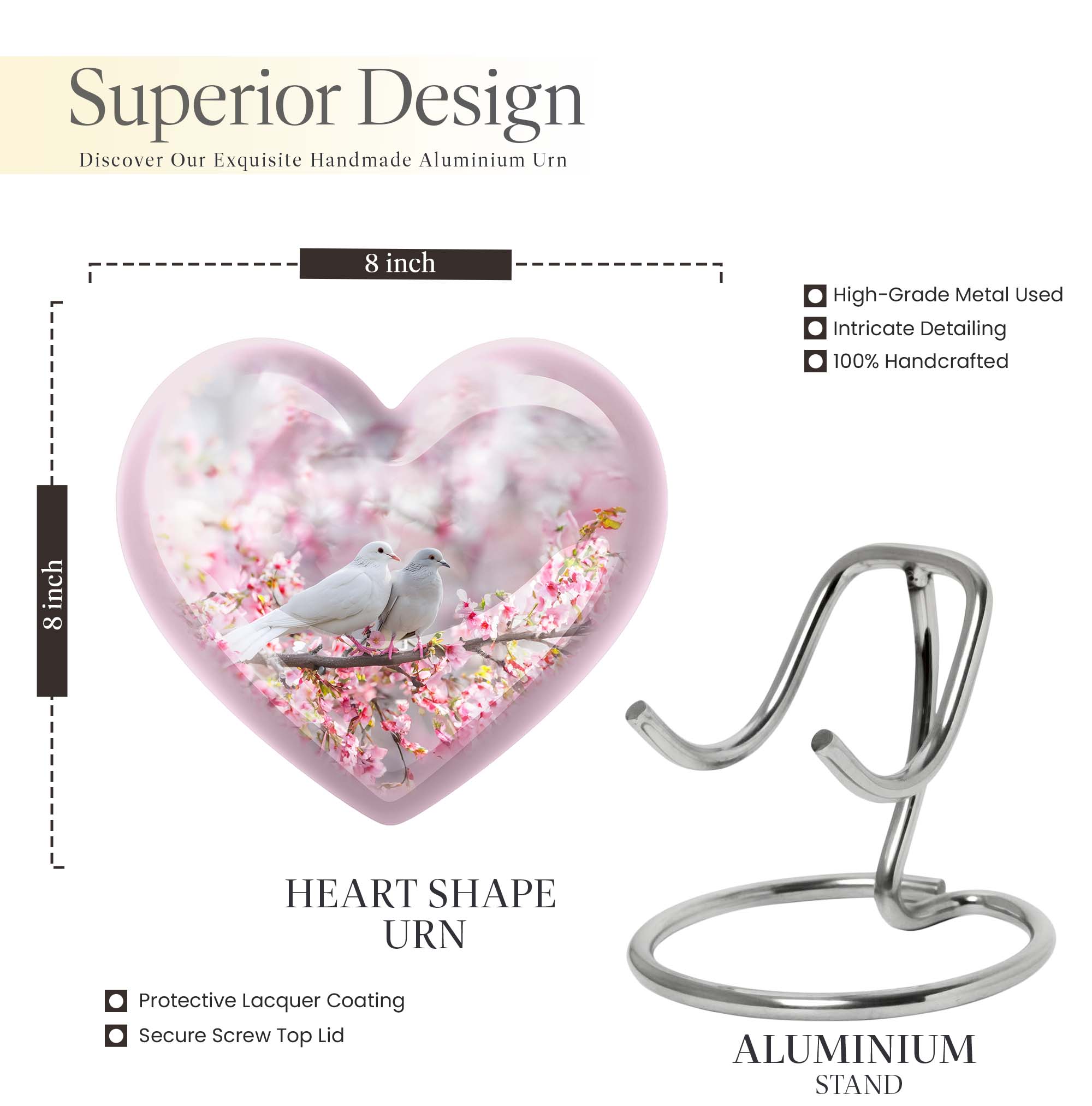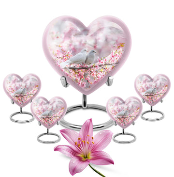Presenting our beautifully crafted dove urn, a thoughtful choice for memorial urns that exude tranquility and grace. An elegant 10 inch large urn, designed in a unique 'Heart Urn' theme, it seamlessly merges sentiment and aesthetics. The urn weighs 3.3 pounds with an accommodating capacity of 200 cubic inches, making it ideal for use as a dual urn for an adult male and female. Exhibiting remarkable craftsmanship, the urn showcases a captivating 'Purple Meadow' theme, exuding a sense of calm and peace. It is painstakingly fashioned from resilient aluminium and ideal for burial in the ground. A thoughtful addition is the velvet pouch included, ensuring safe containment of ashes. Adding a more personal touch, it can be customized with engraved names. Apart from being a tastefully fashioned dove urn and burial urn, this mesmerizing memorial urn can serve as a meaningful box for men. For those in search of unique and aesthetically appealing urns for female adults or large metal urns for burial, this large heart urn is a poignant choice.