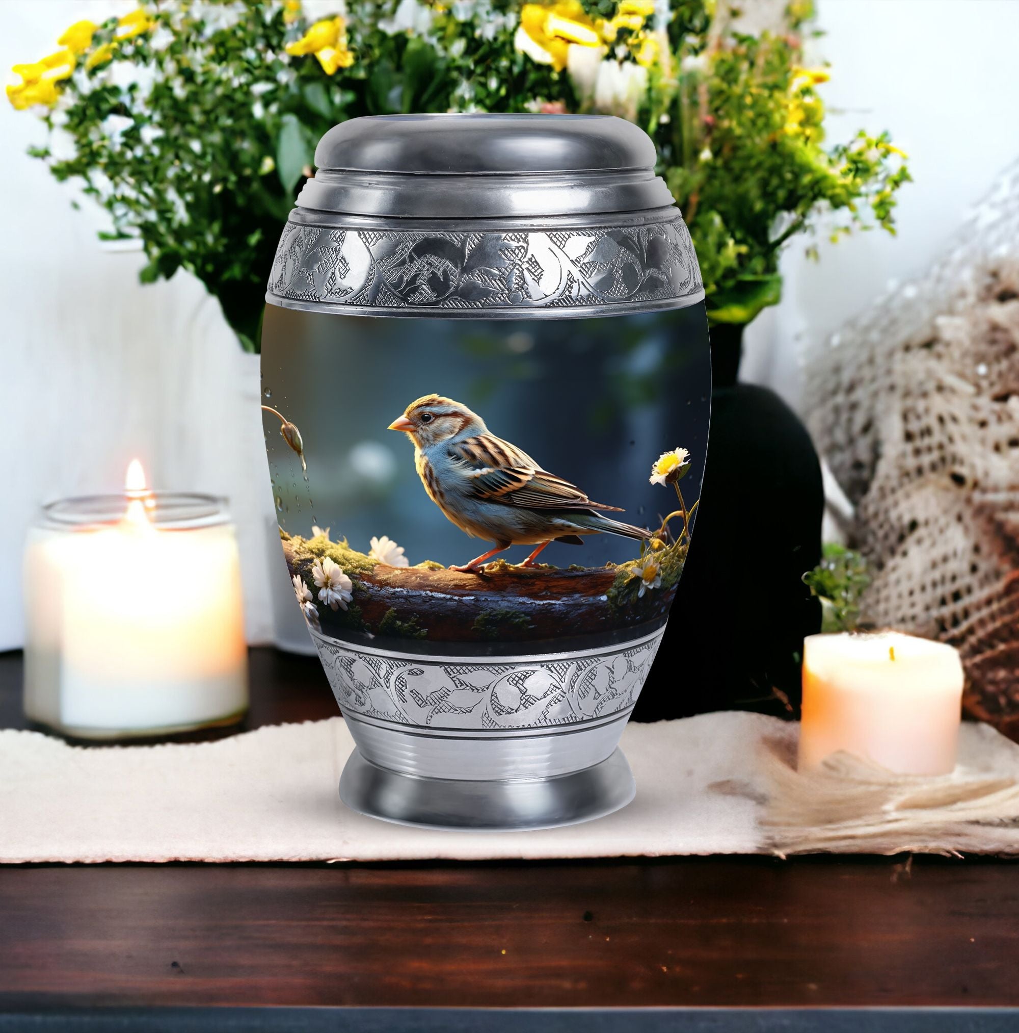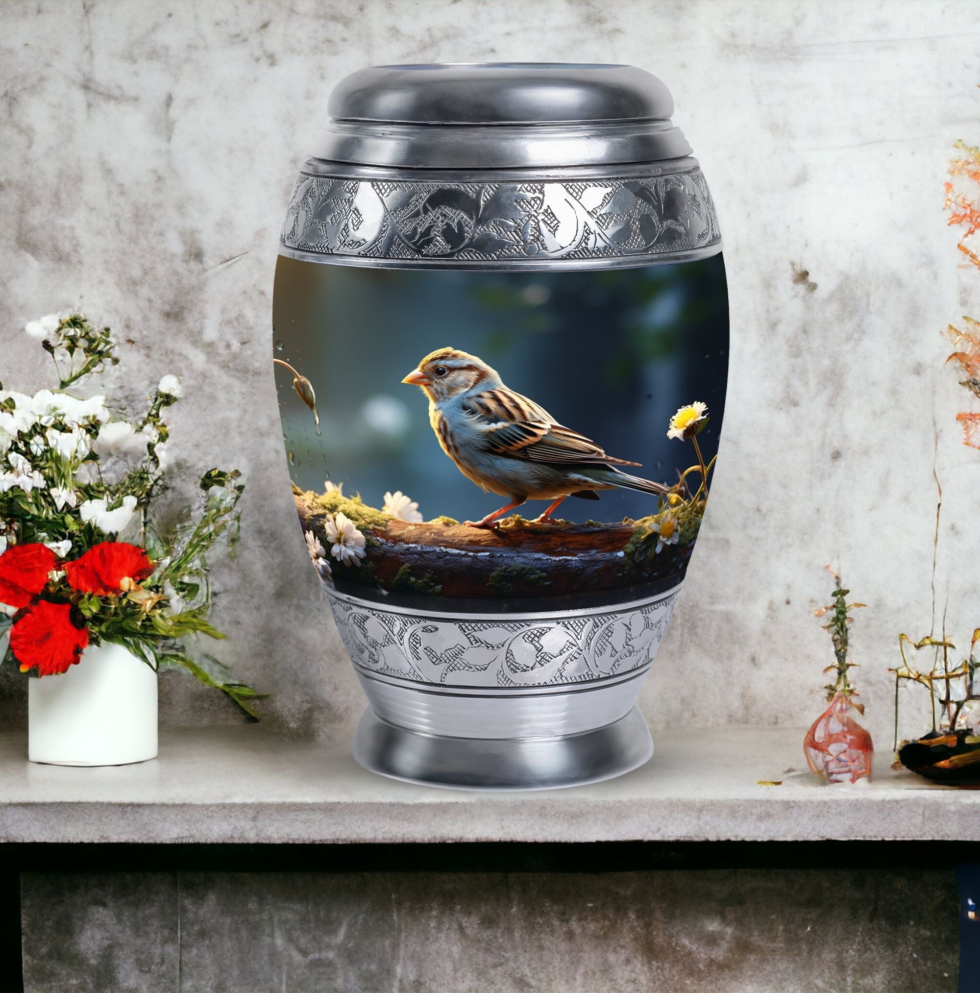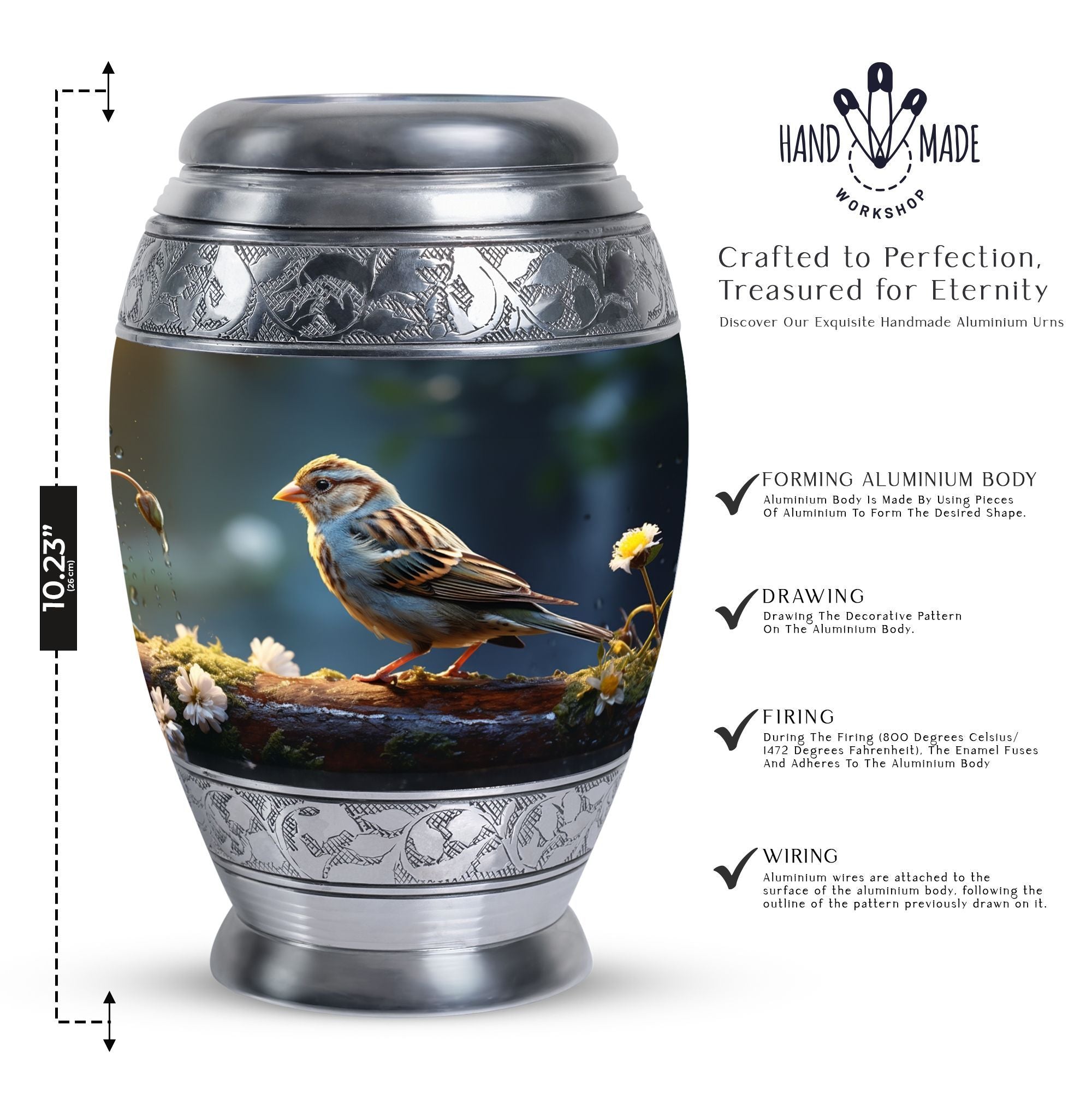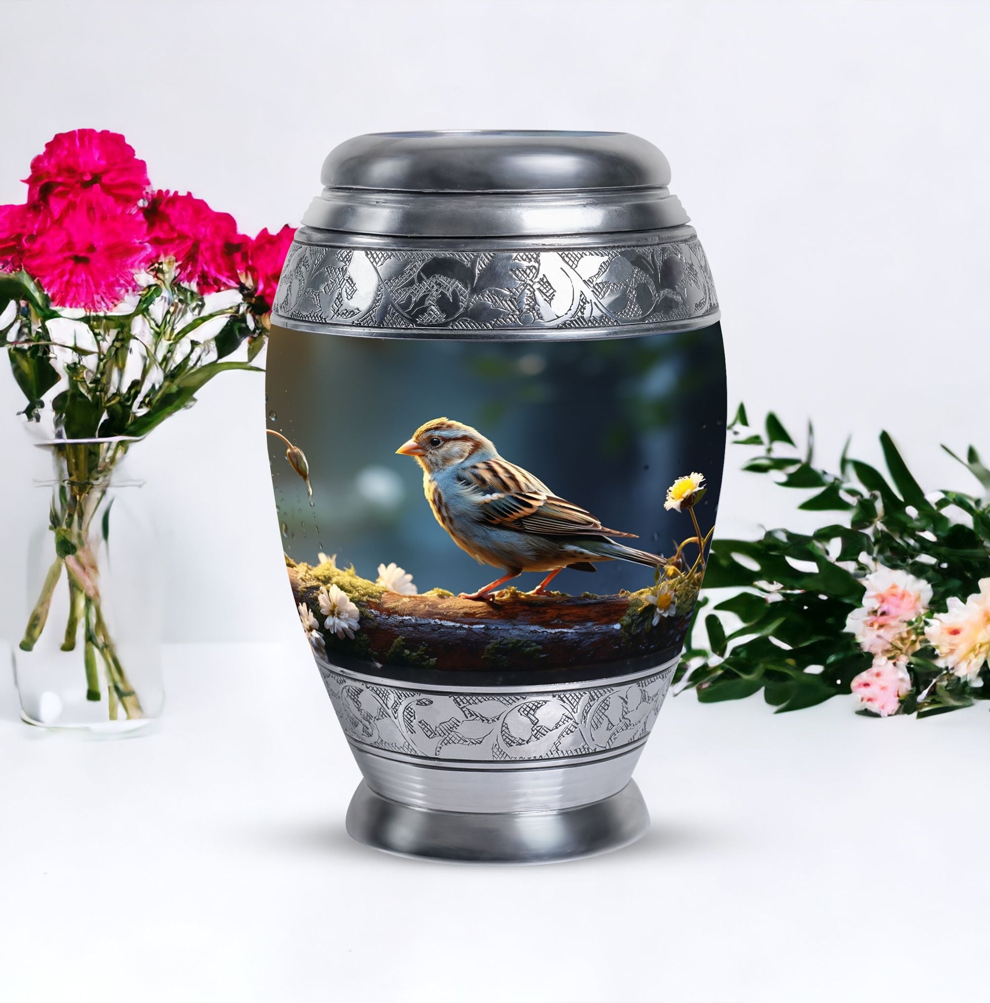 Encompass the spirit of your loved one within this one-of-a-kind Sparrow Urn for Ashes. Measuring at a harmonious 10 inches in height and with a generous capacity of 200 cubic inches, it offers a thoughtful resting place for those cherished ashes. Designed to be substantial yet captivating, it boasts a weight of 3.3 pounds, fitting perfectly within the palm of your hand. Constructed from high-grade aluminium, well-known for its strength and durability, you can find peace of mind in its enduring worth. This large urn transcends traditionalism, each one complete with a velvet pouch for hospitable containment of the ashes. As an intimate final touch, you're given the freedom to personalize the urn with engraved names of your liking. Elevate your memorial ceremony with metal cremation urns like this one that merges transcendent significance with lasting style.
