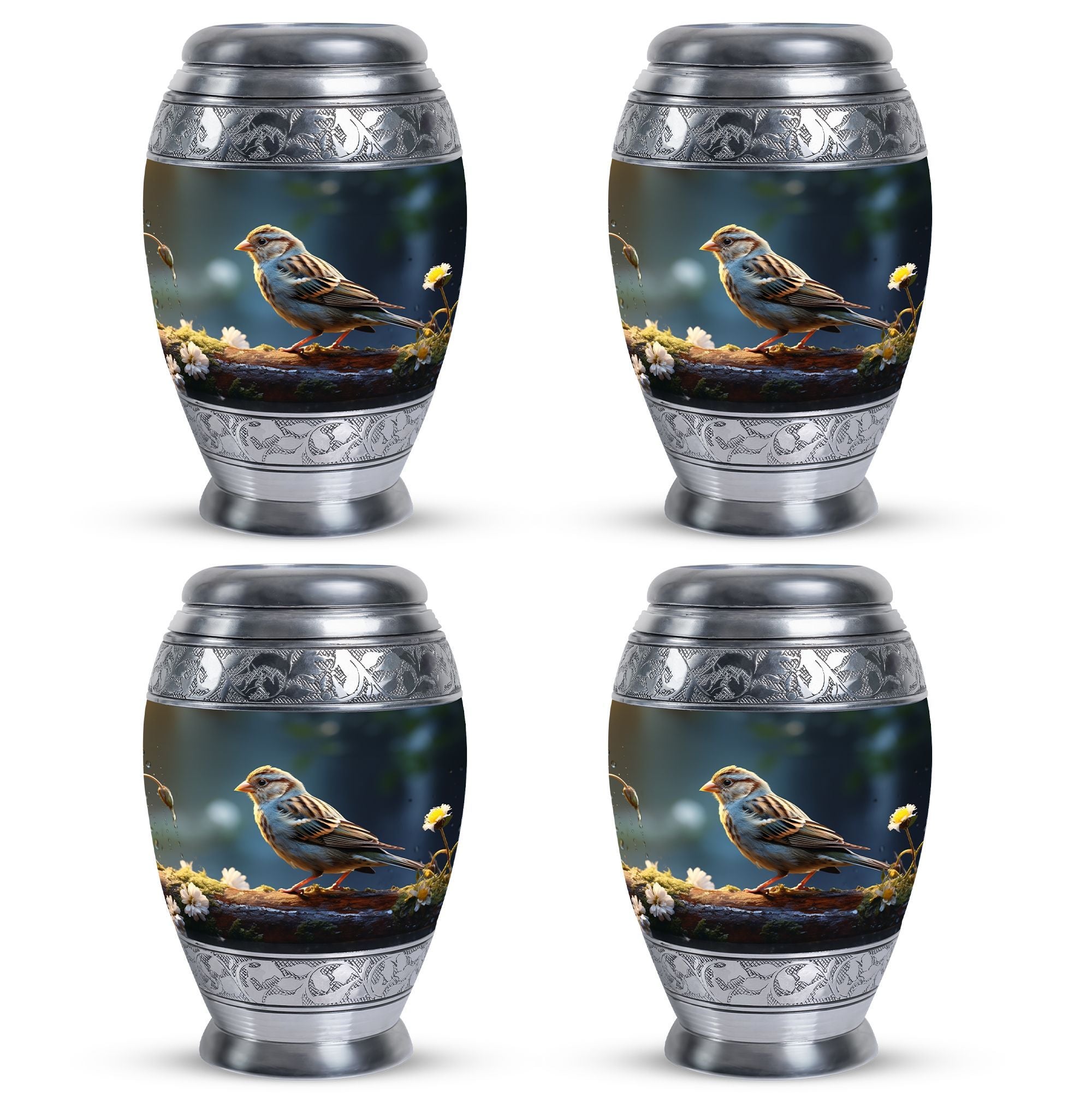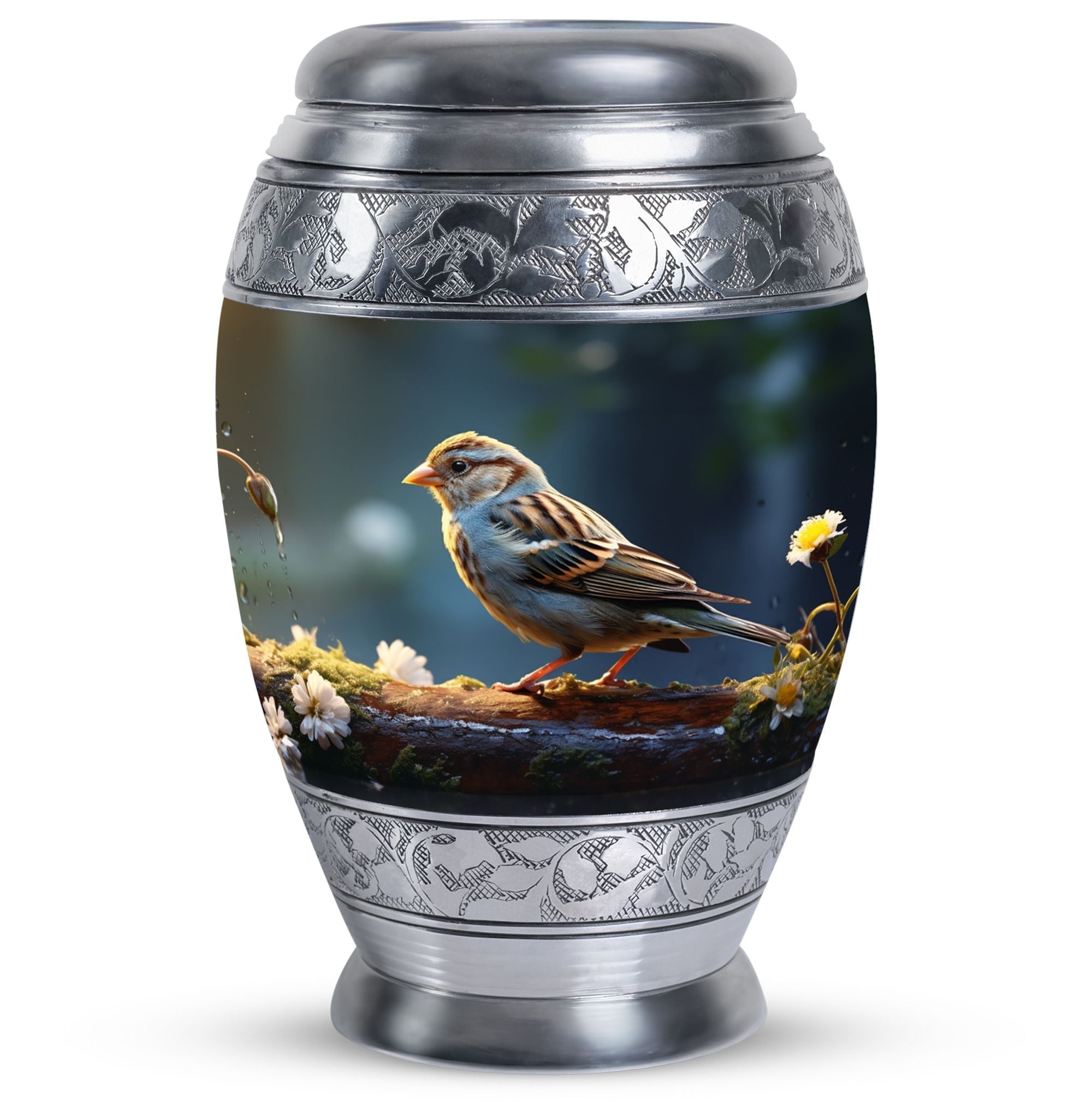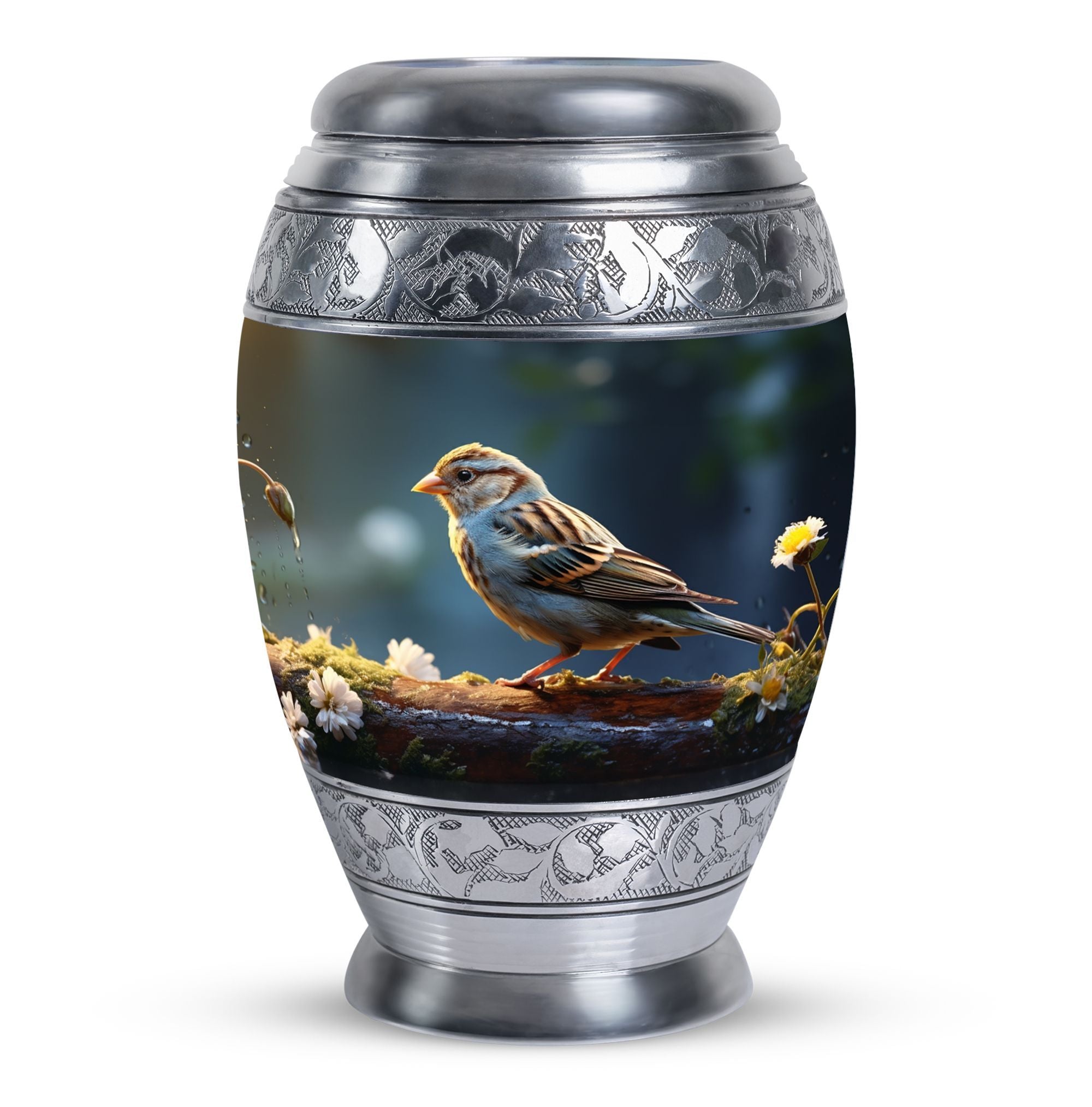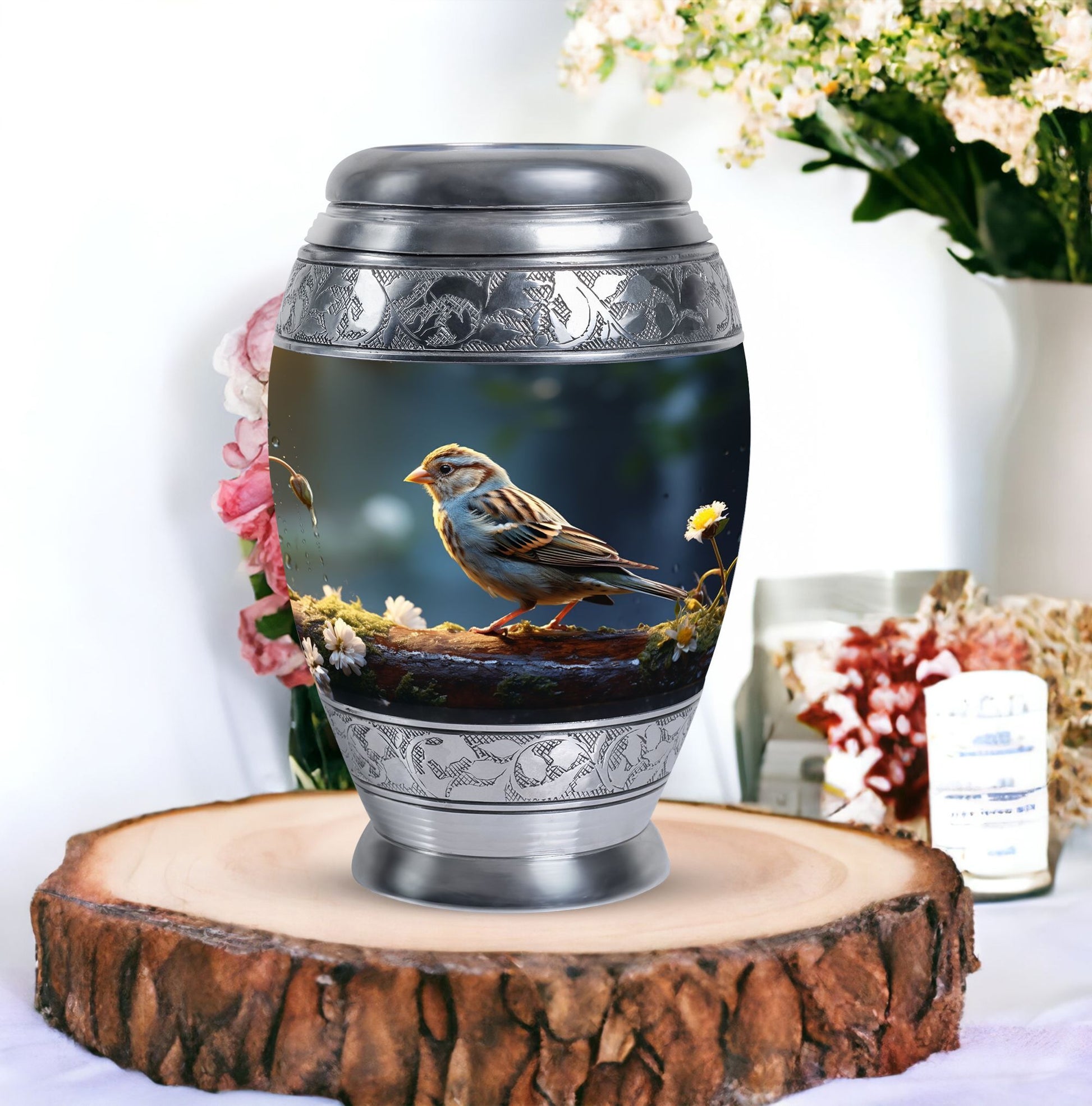 Encompass the spirit of your loved one within this one-of-a-kind Sparrow Urn for Ashes. Measuring at a harmonious 10 inches in height and with a generous capacity of 200 cubic inches, it offers a thoughtful resting place for those cherished ashes. Designed to be substantial yet captivating, it boasts a weight of 3.3 pounds, fitting perfectly within the palm of your hand. Constructed from high-grade aluminium, well-known for its strength and durability, you can find peace of mind in its enduring worth. This large urn transcends traditionalism, each one complete with a velvet pouch for hospitable containment of the ashes. As an intimate final touch, you're given the freedom to personalize the urn with engraved names of your liking. Elevate your memorial ceremony with metal cremation urns like this one that merges transcendent significance with lasting style.