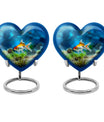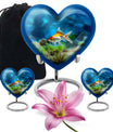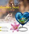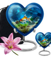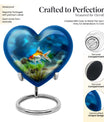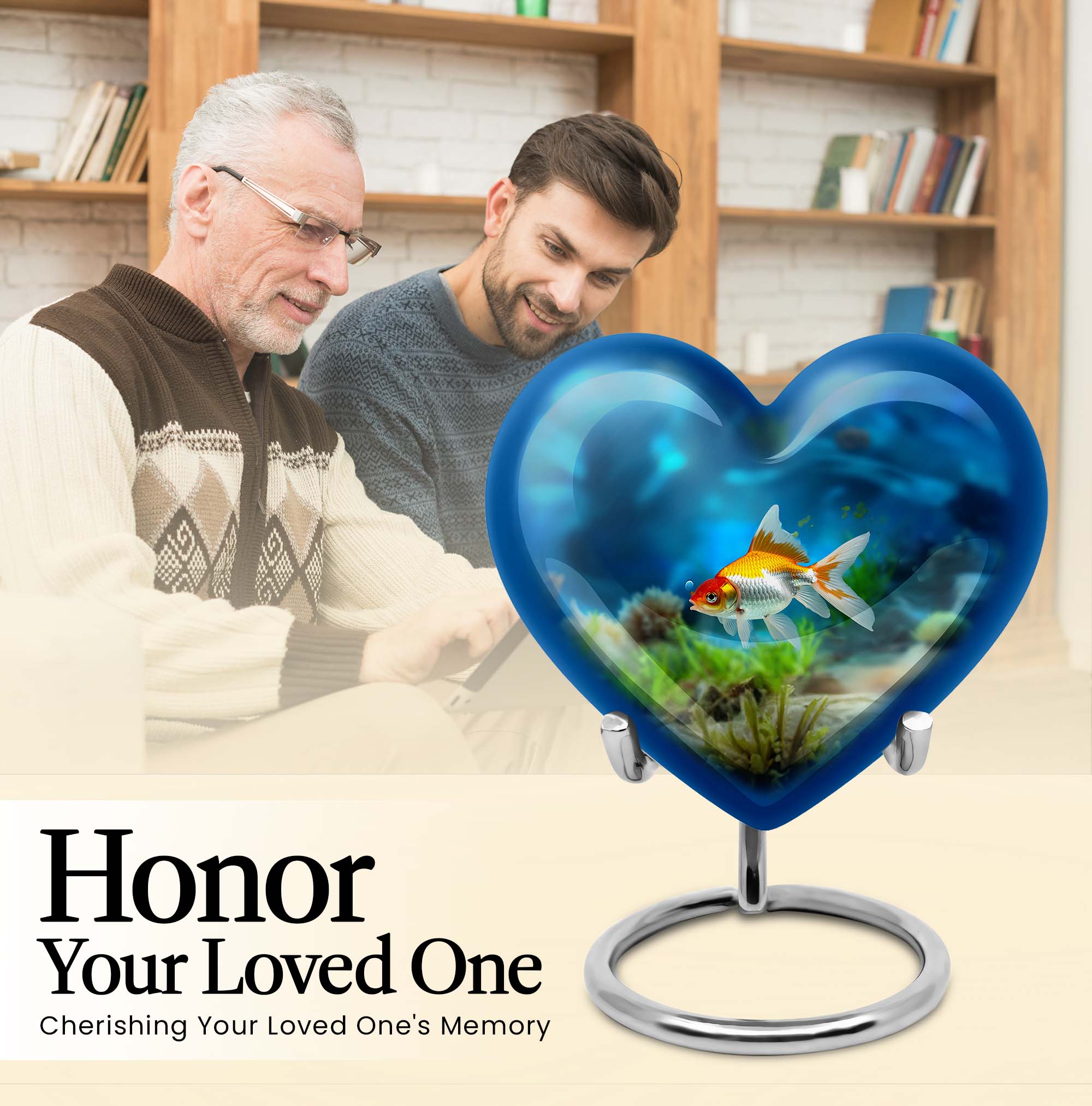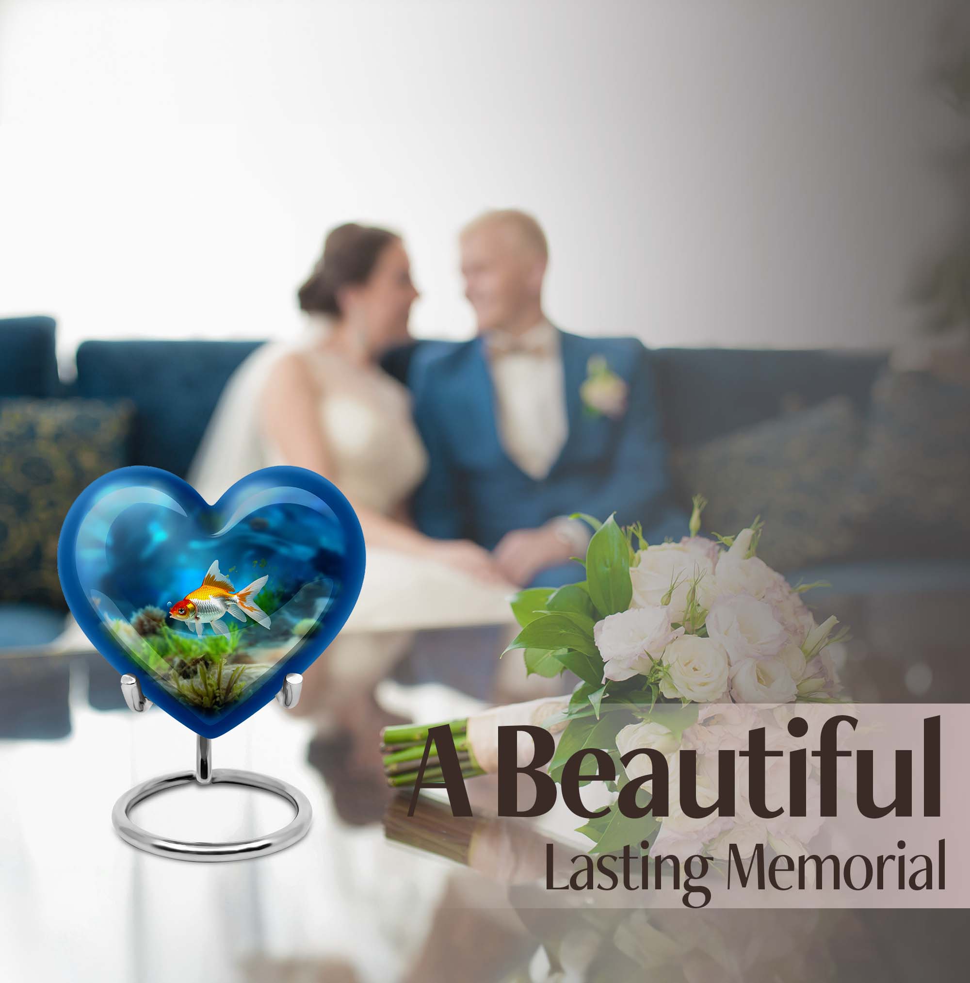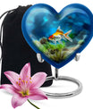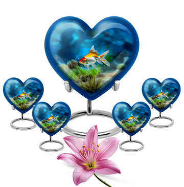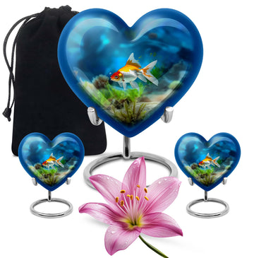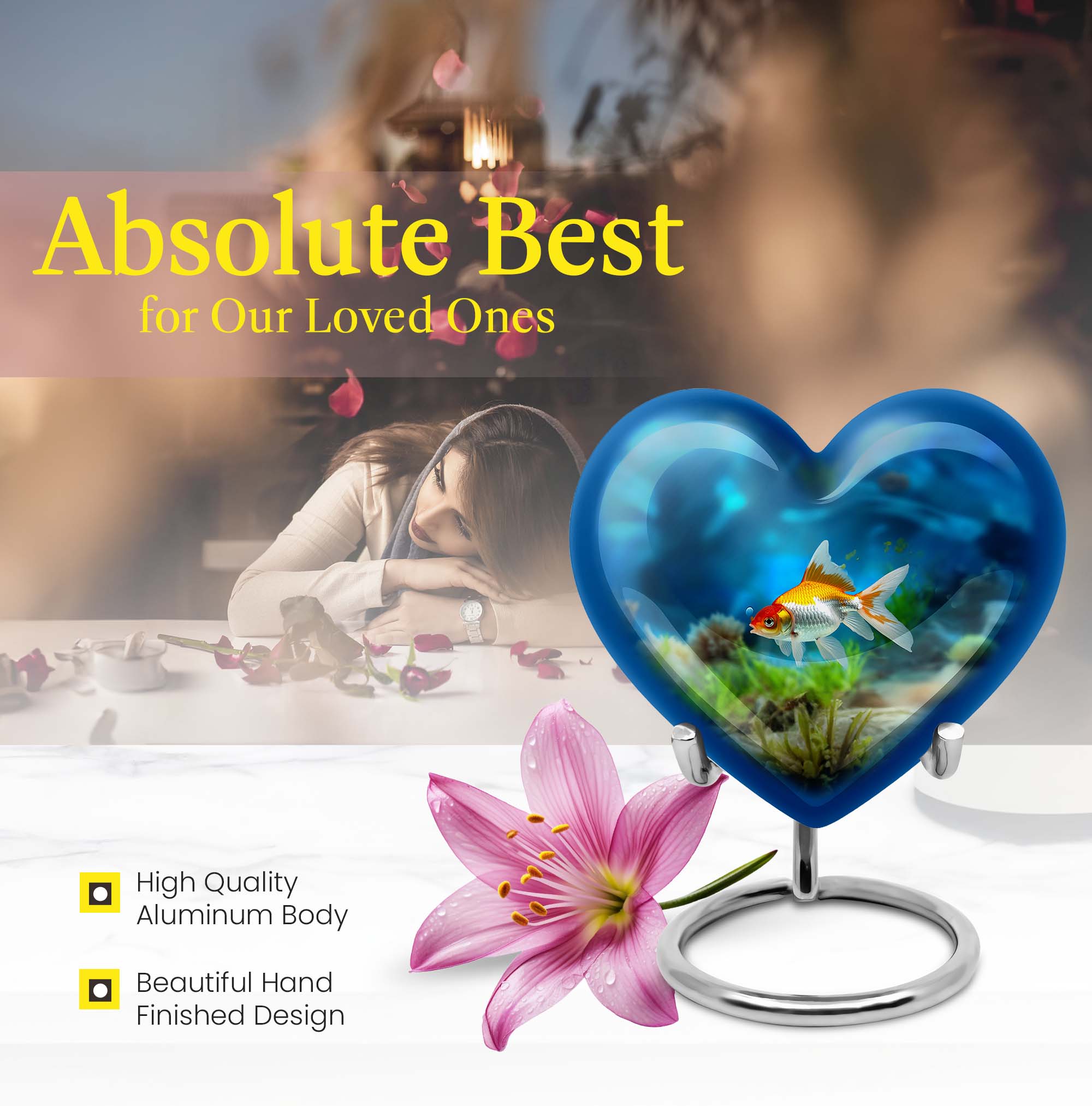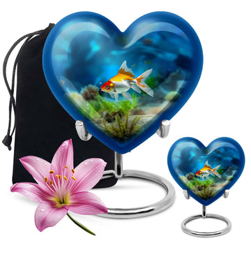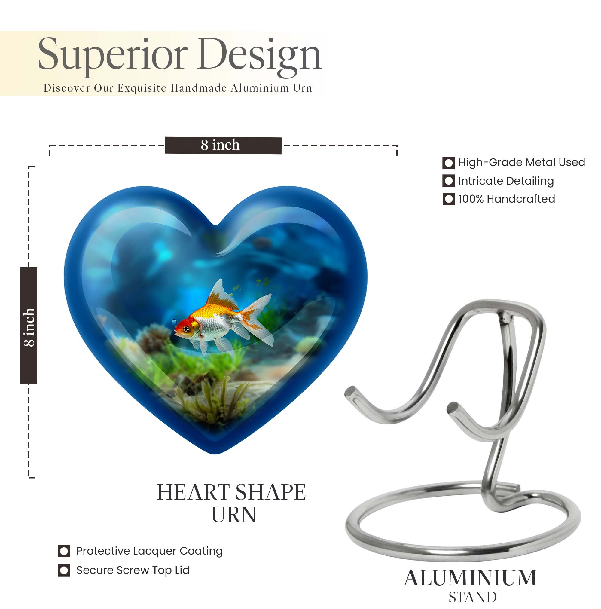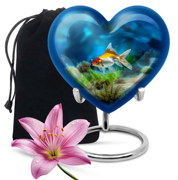 Elevate your remembrance ceremony with this exquisite Gold Fish Urn, a beacon of hope and love during a time of profound sadness. With a height of 10 inches and a weighing an easy 3.3 pounds, the urn is substantial yet manageable. The heart-shaped urn, skillfully crafted from robust aluminium, reflects the eternal love and connection shared. It even allows a touch of personalization by engraving names, creating a unique tribute. Offering a considerable capacity of 200 cubic inches, it's suitable for containing ashes of adult individuals of either gender impeccably. Each purchase includes a velvet pouch, enhancing the urn's portability while ensuring safety for the treasured contents it holds. The butterfly theme imparts a sense of serenity, in keeping with the solemnity of the occasion. People in search of 'funeral decorative urns' or 'memorial urns for human ashes adult female,' will find this heart urn meets their needs and beyond. Express your loving remembrance with this truly memorable 'cremation urn'