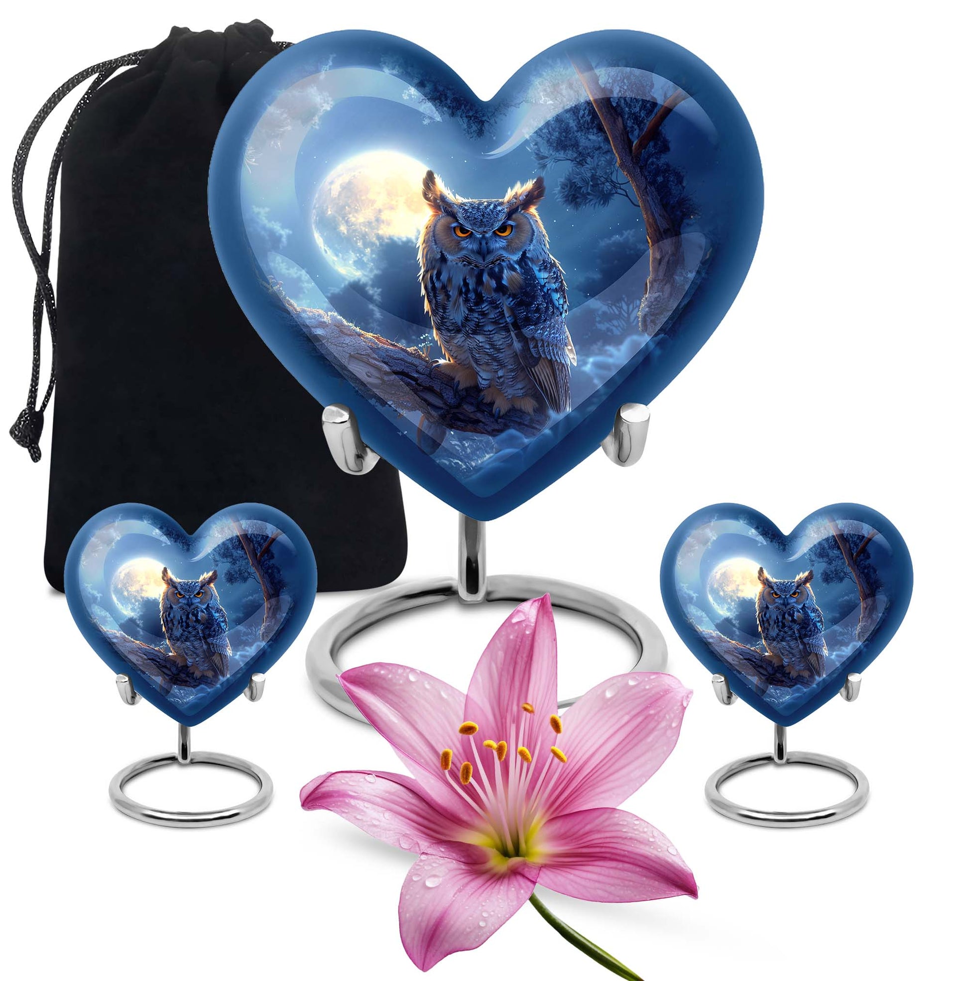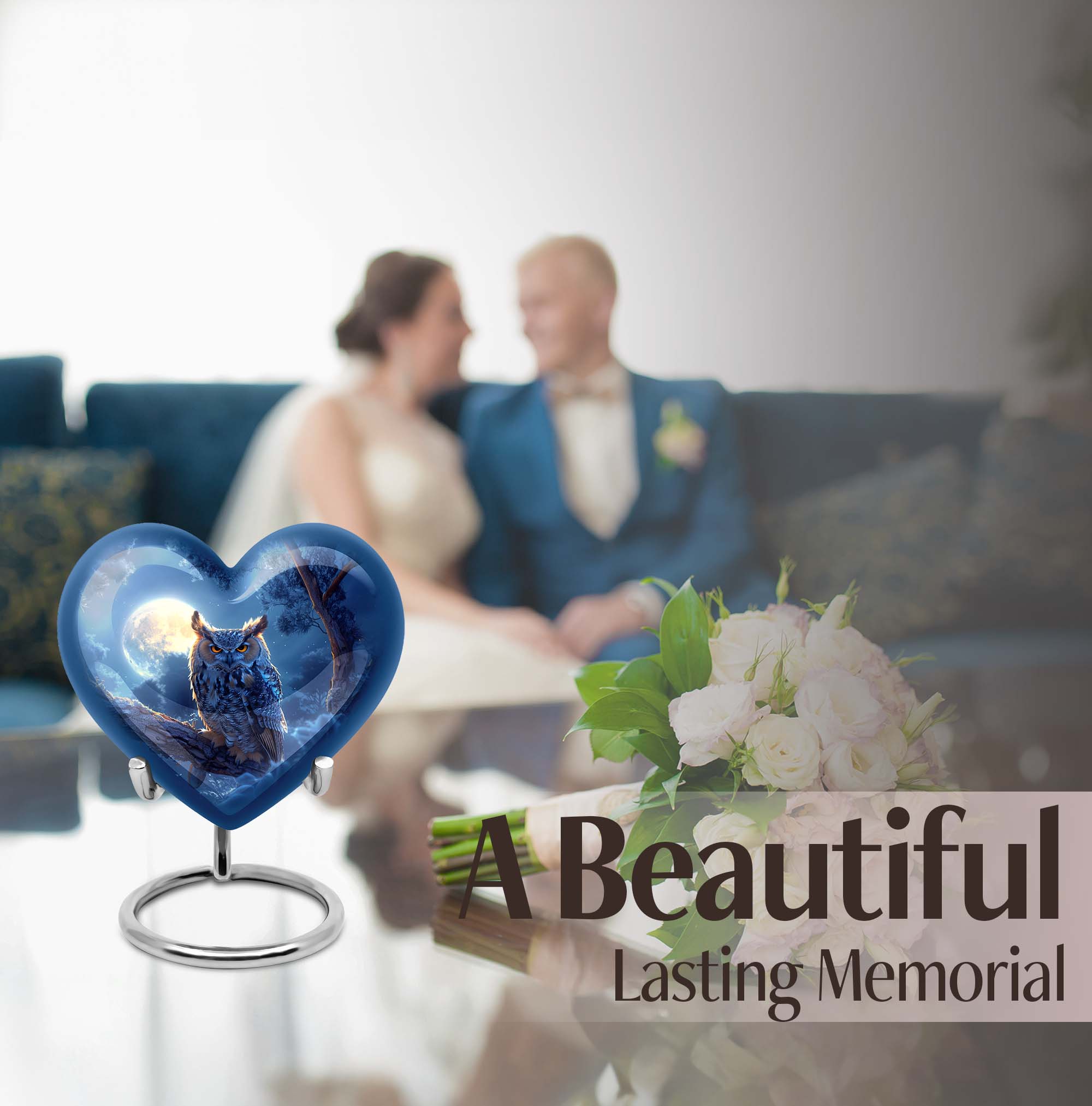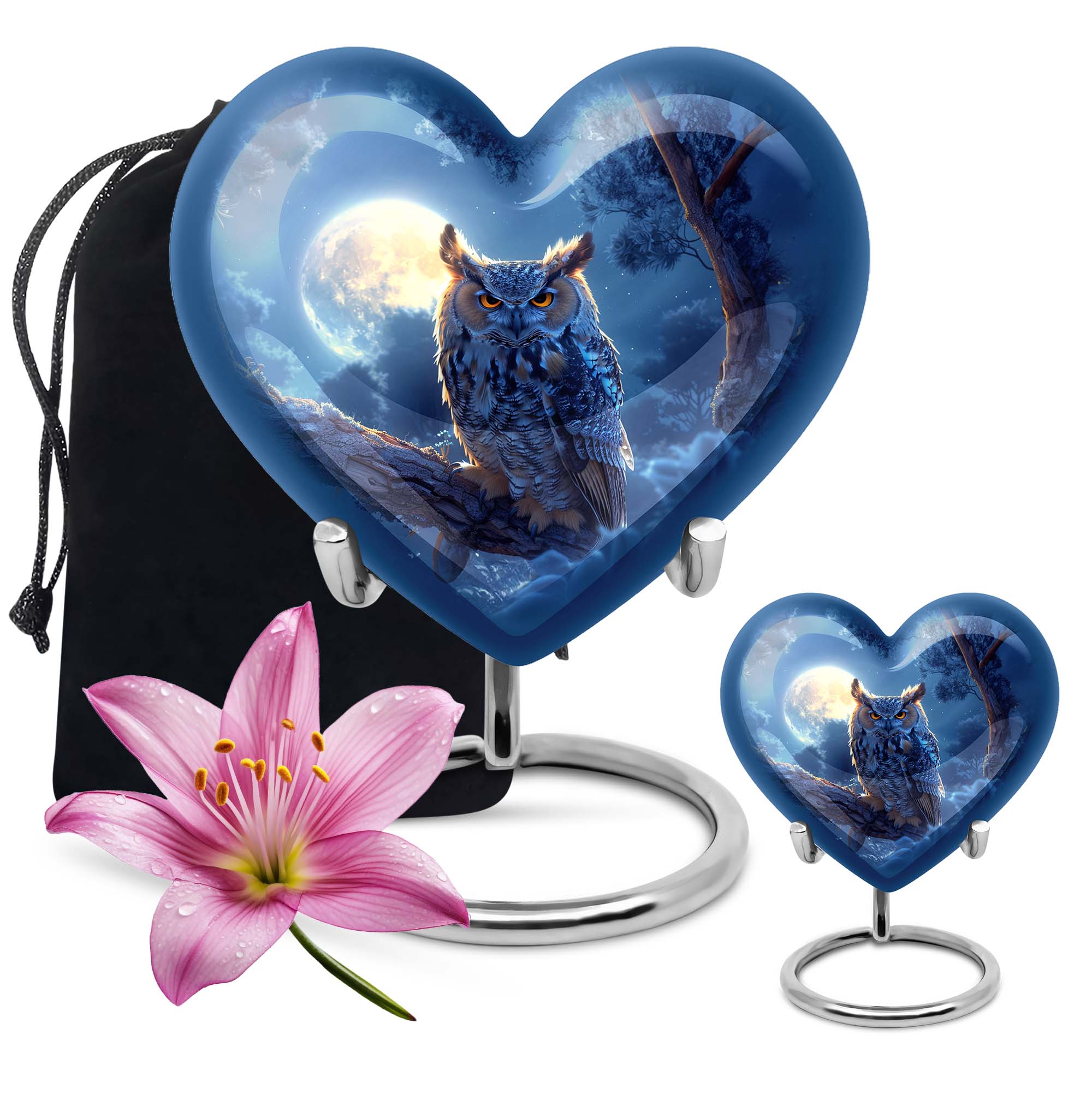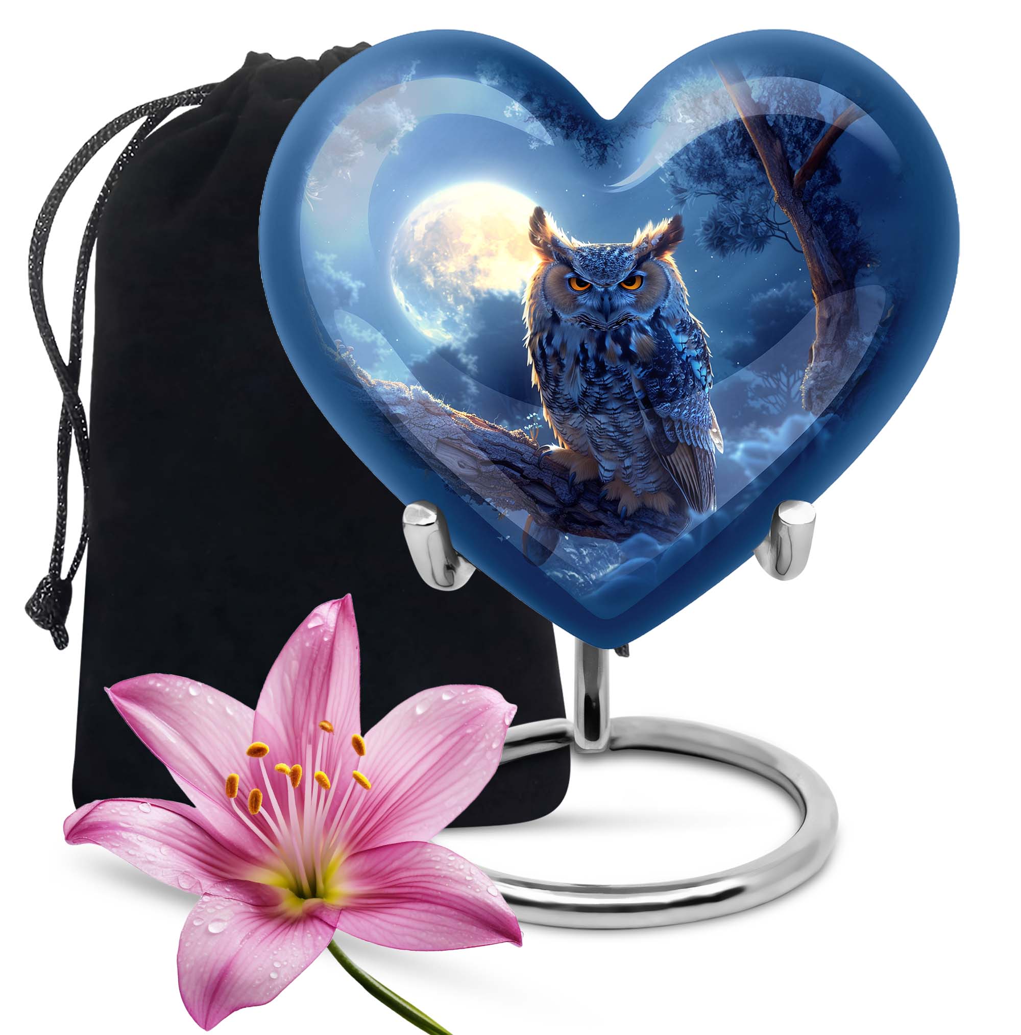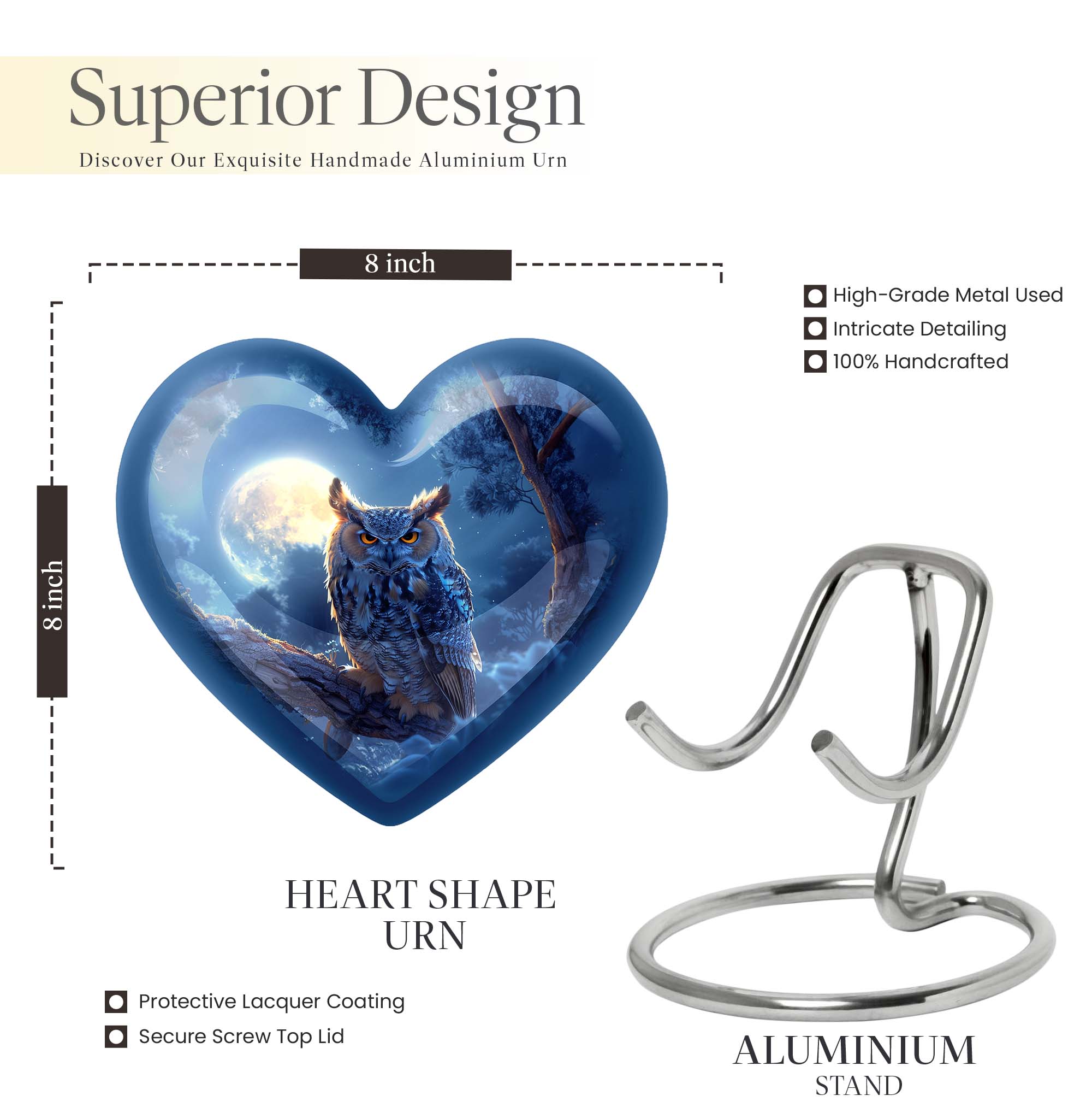 Commemorate your loved one with our dignified 10-inch heart urn. Fashioned from high-grade aluminum, this large urn offers the sturdiness and durability to withstand the test of time. Its abstract theme and heart design translate to a tasteful tribute to your dearly departed. With a holding capacity of 200 cubic inches, this cemetery urn is ideal for either an adult male or a woman. Personalizing the urn with engraved names imbues it with an intimate touch, individualizing the monument. The package comes complete with a velvet pouch for containing the precious ashes, ensuring respectful and secure preservation. Built with a weight of 3.3 pounds, the owl urn is solid and secure. The cremation urn is part of a larger collection of funeral urns for ashes for women, burial urns, and urns for mom. However, it is also suitable for the eternal rest of an adult male, demonstrating its versatility. Please note, personalization adds an extra layer of uniqueness, making it tailor-fit for the individual resting in peace.