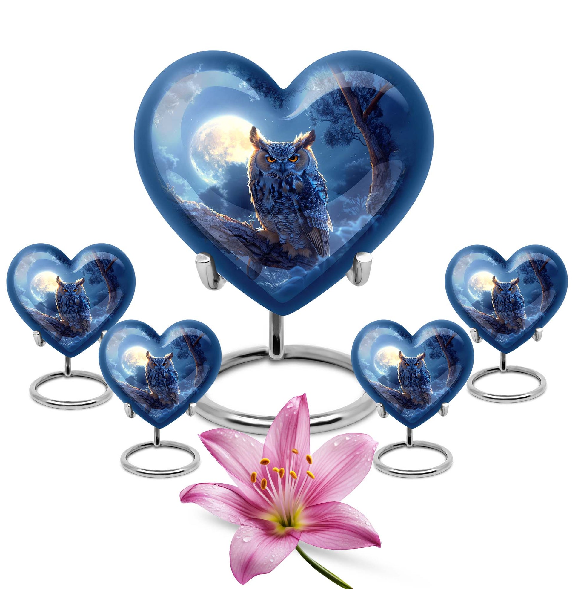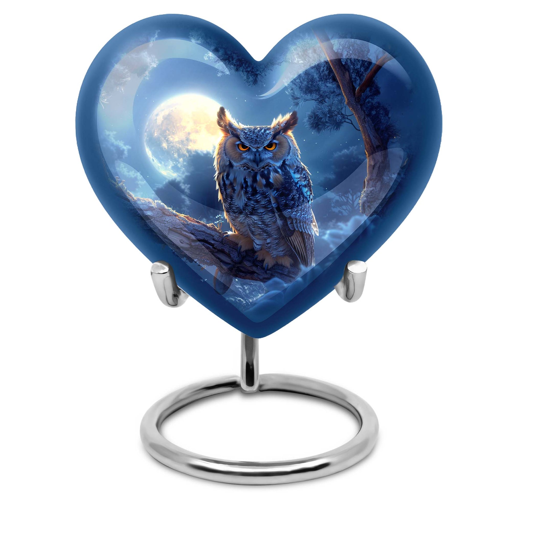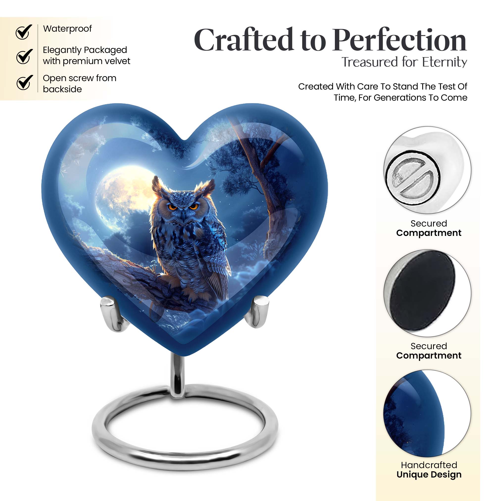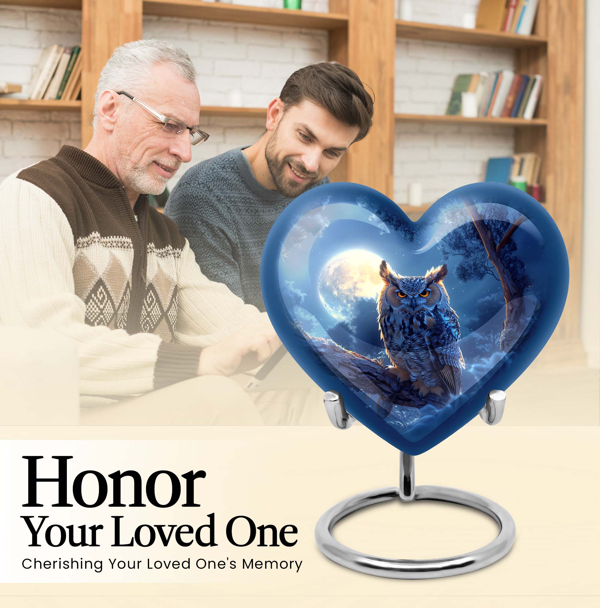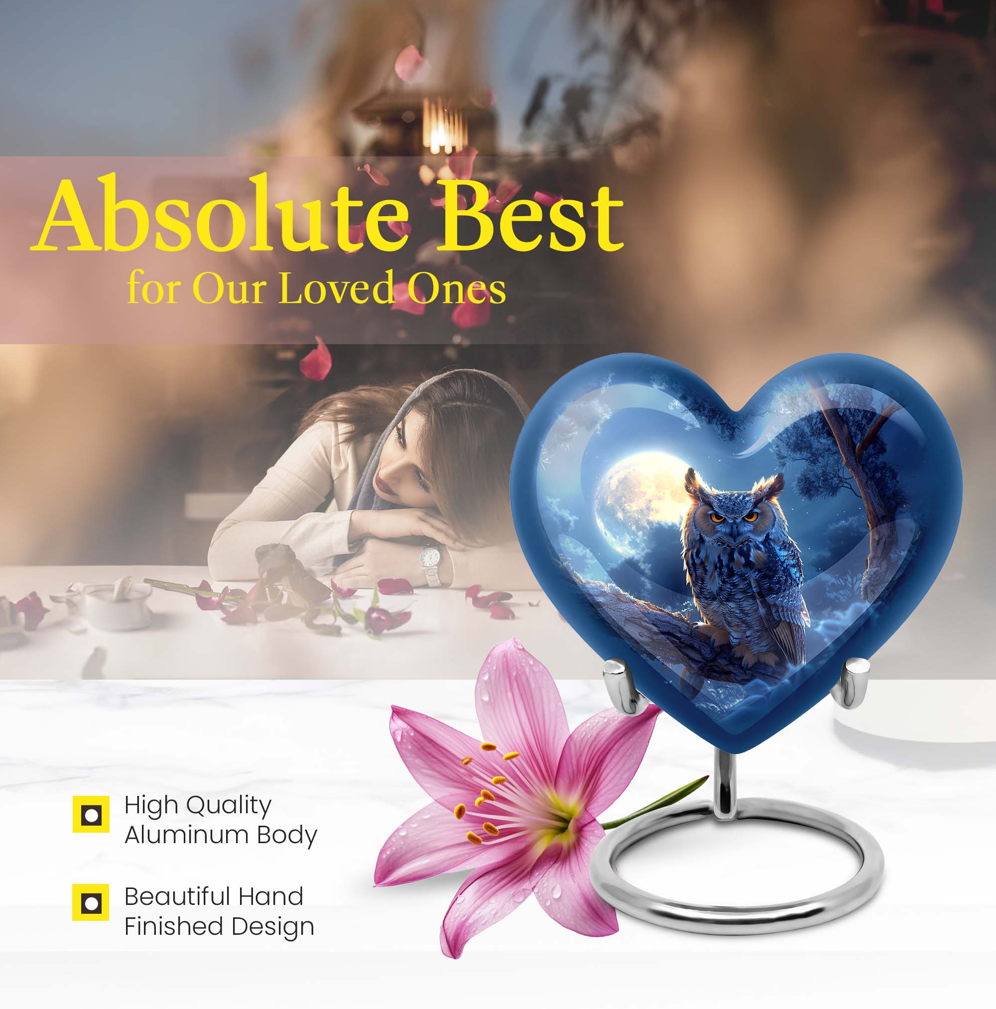 Commemorate your loved one with our dignified 10-inch heart urn. Fashioned from high-grade aluminum, this large urn offers the sturdiness and durability to withstand the test of time. Its abstract theme and heart design translate to a tasteful tribute to your dearly departed. With a holding capacity of 200 cubic inches, this cemetery urn is ideal for either an adult male or a woman. Personalizing the urn with engraved names imbues it with an intimate touch, individualizing the monument. The package comes complete with a velvet pouch for containing the precious ashes, ensuring respectful and secure preservation. Built with a weight of 3.3 pounds, the owl urn is solid and secure. The cremation urn is part of a larger collection of funeral urns for ashes for women, burial urns, and urns for mom. However, it is also suitable for the eternal rest of an adult male, demonstrating its versatility. Please note, personalization adds an extra layer of uniqueness, making it tailor-fit for the individual resting in peace.