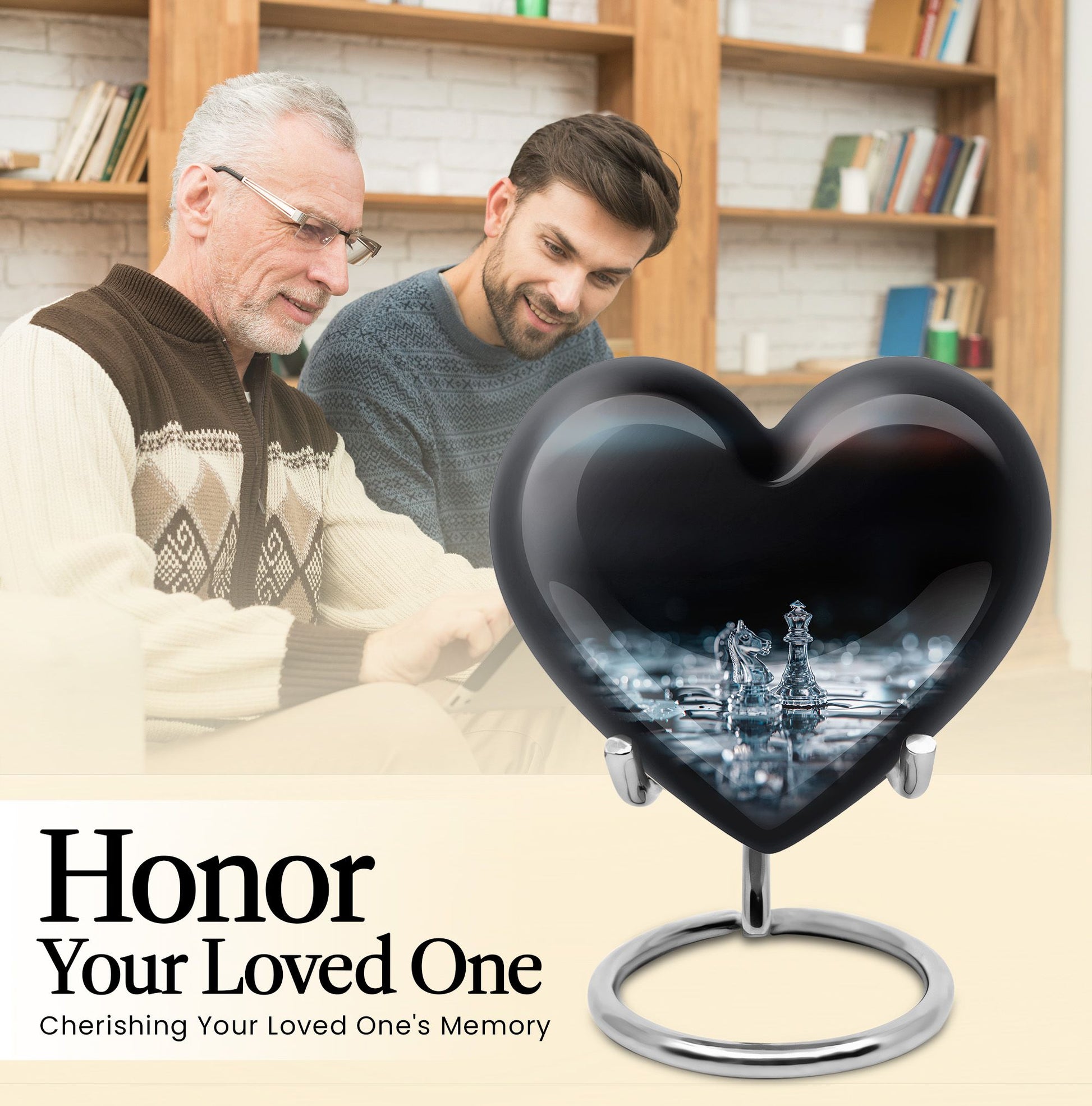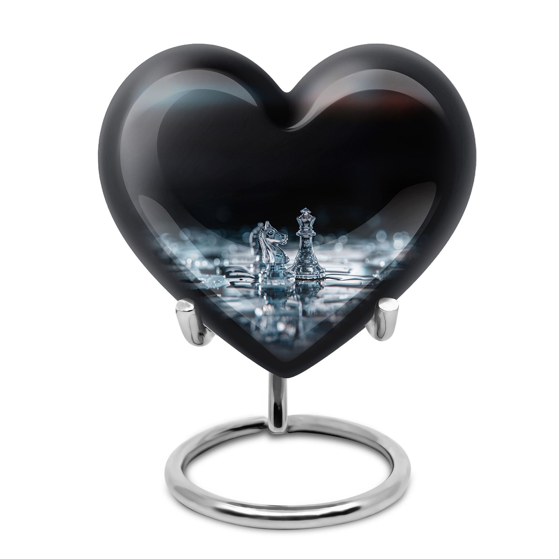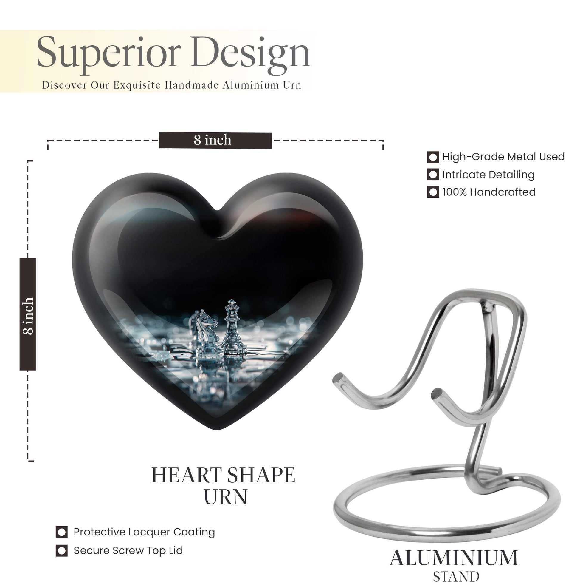 Introducing our distinctly crafted Chess Urn, a touching tribute to commemorate your loved one's memory. This large, 10-inch memorial urn for women's ashes blends functionality and sentimentality in a unique design - the Heart Urn. Its substantial size, weighing 3.3 pounds and measuring 10 inches in height, affords a generous capacity of 200 cubic inches. Crafted from high-quality aluminum, this cremation urn ensures longevity while delivering an aesthetically pleasing display. The package includes a velvet pouch, providing a dignified containment for the ashes. Adding a more personal touch, this urn can be customized with engraved names, manifesting a bespoke memorial. Catering to a woman's spirit, our Chess Urn signifies a tasteful and heartfelt way to remember and honor a departed loved one. Its simple yet elegant design fits perfectly for ground burial or as a keepsake. With uncommon terms like 'metal urns for human ashes adult female' or 'Urn for Ground Burial', your search could yield similar urns, but none as unique and personal as our Chess Urn.
