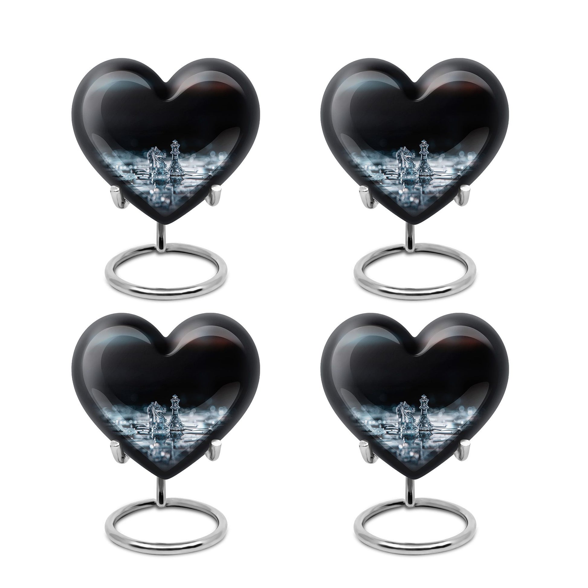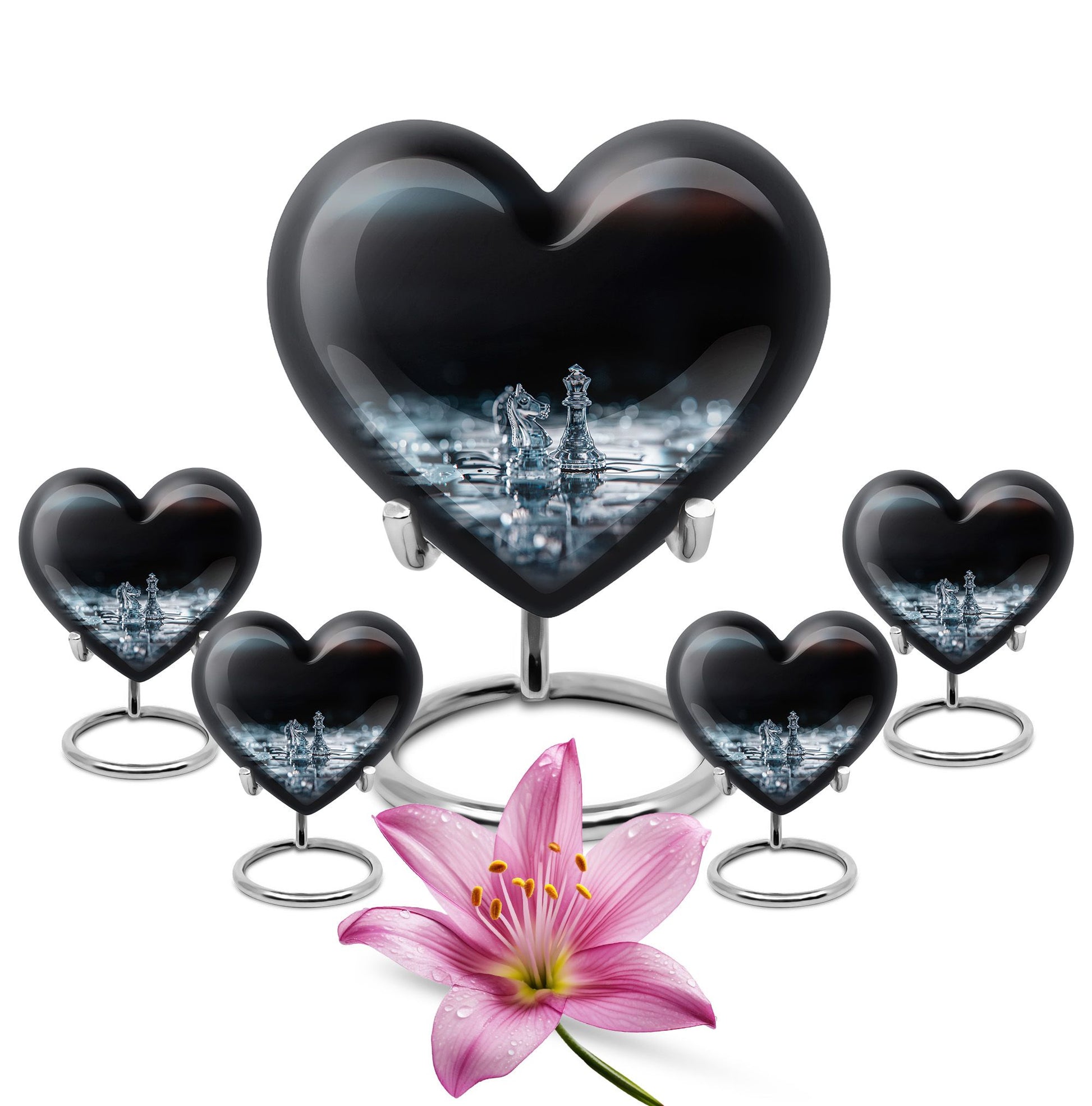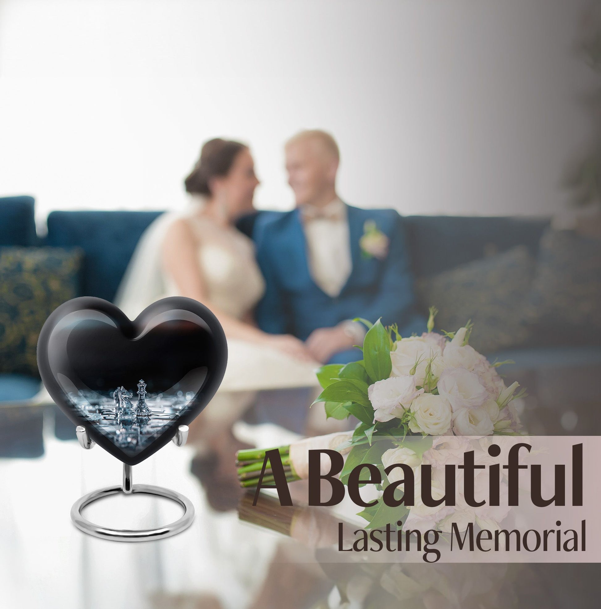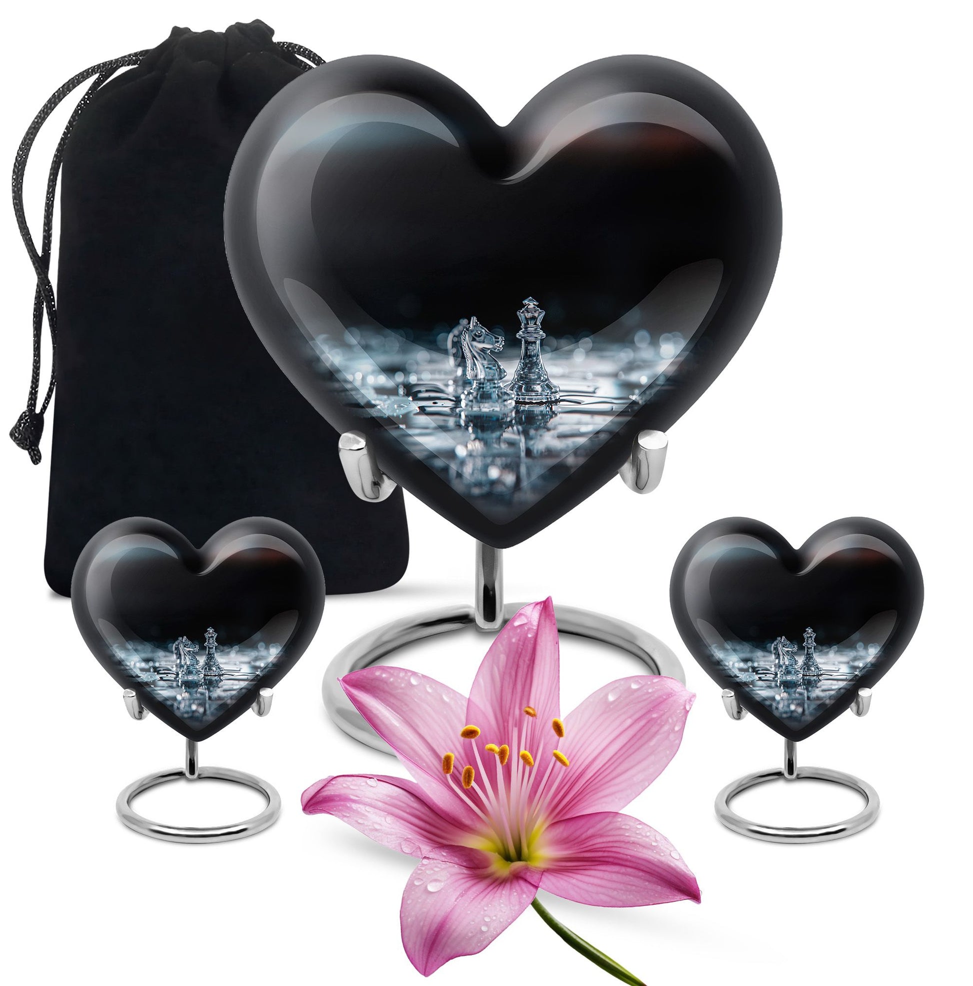 Introducing our distinctly crafted Chess Urn, a touching tribute to commemorate your loved one's memory. This large, 10-inch memorial urn for women's ashes blends functionality and sentimentality in a unique design - the Heart Urn. Its substantial size, weighing 3.3 pounds and measuring 10 inches in height, affords a generous capacity of 200 cubic inches. Crafted from high-quality aluminum, this cremation urn ensures longevity while delivering an aesthetically pleasing display. The package includes a velvet pouch, providing a dignified containment for the ashes. Adding a more personal touch, this urn can be customized with engraved names, manifesting a bespoke memorial. Catering to a woman's spirit, our Chess Urn signifies a tasteful and heartfelt way to remember and honor a departed loved one. Its simple yet elegant design fits perfectly for ground burial or as a keepsake. With uncommon terms like 'metal urns for human ashes adult female' or 'Urn for Ground Burial', your search could yield similar urns, but none as unique and personal as our Chess Urn.