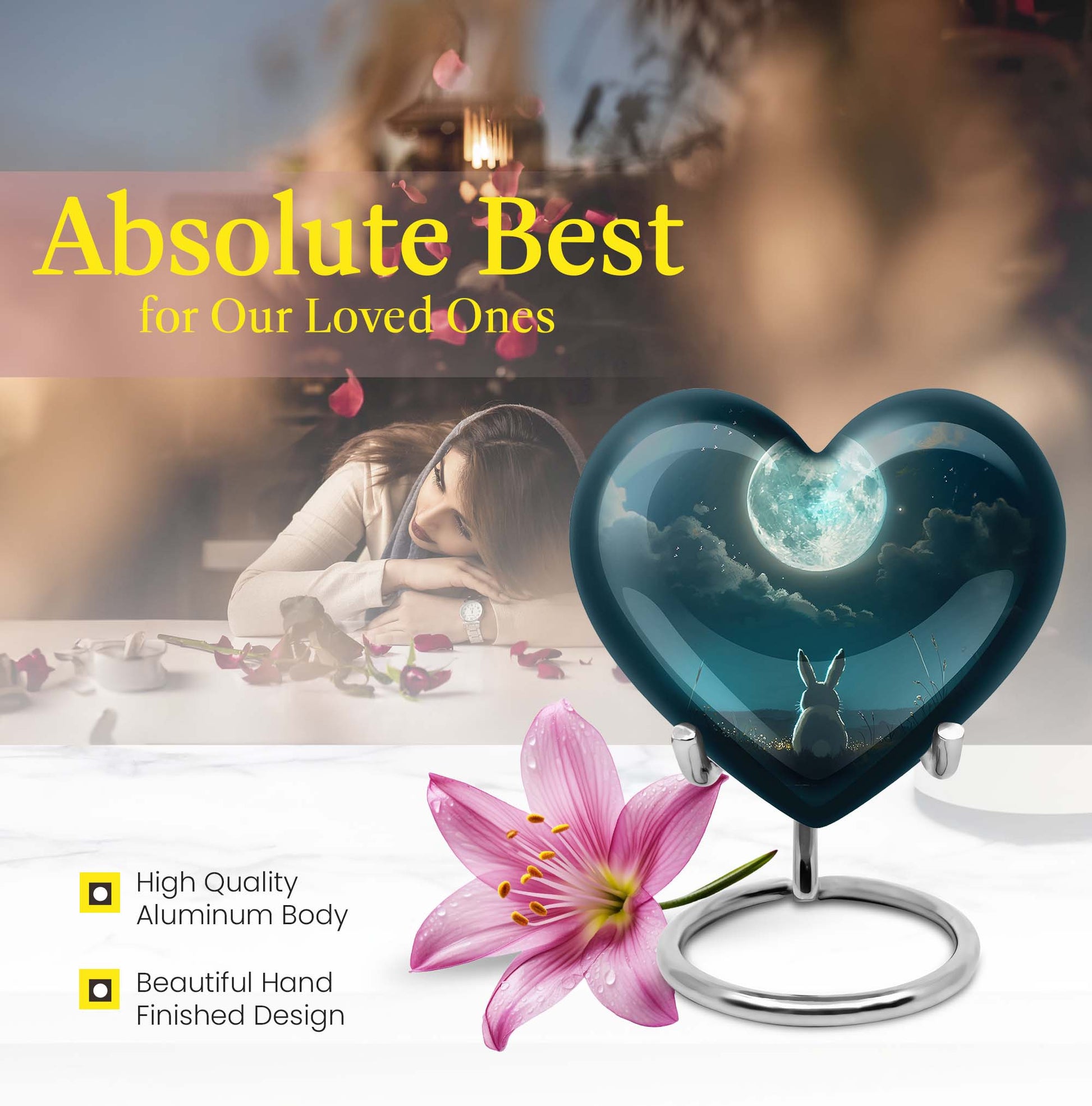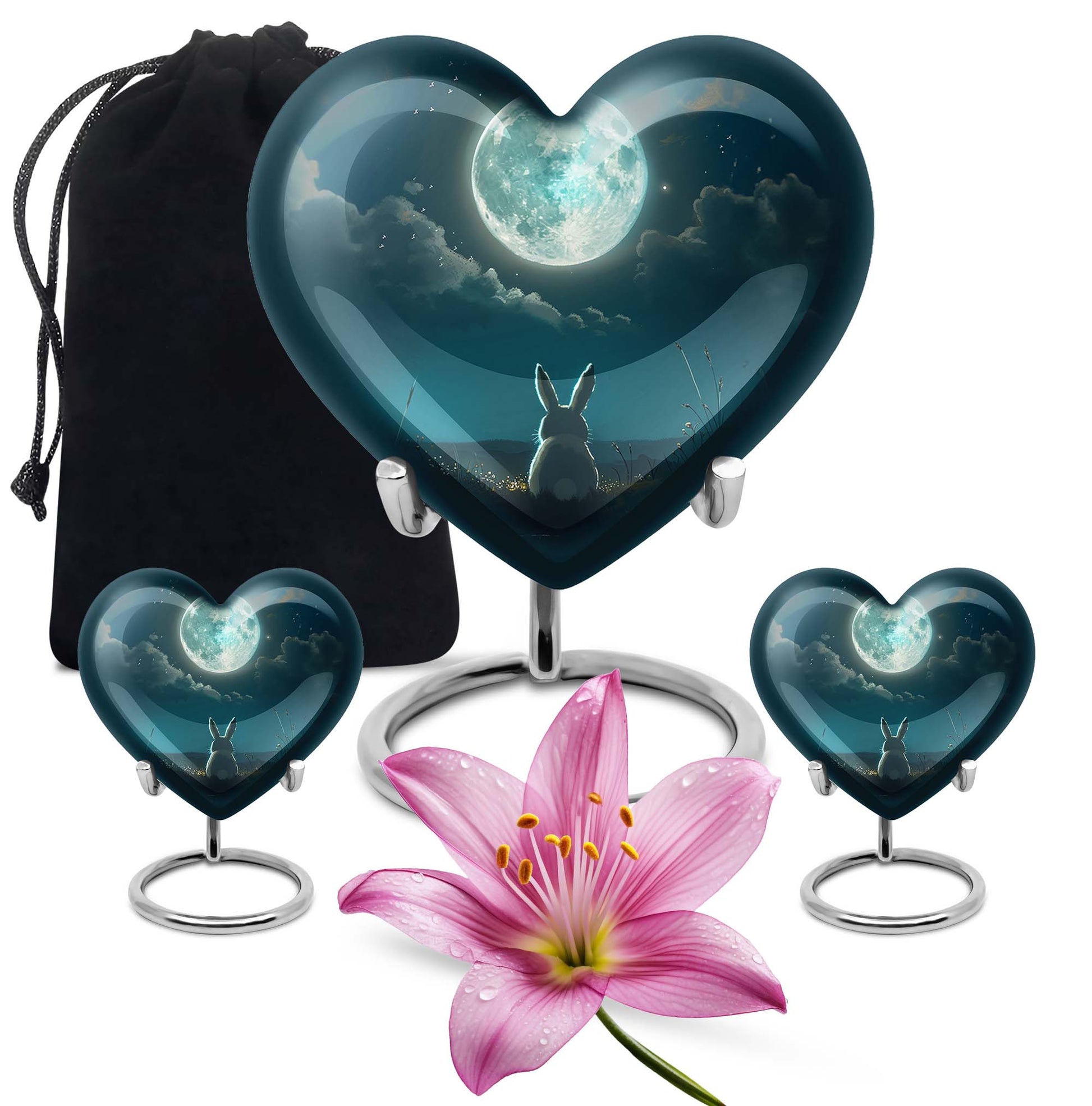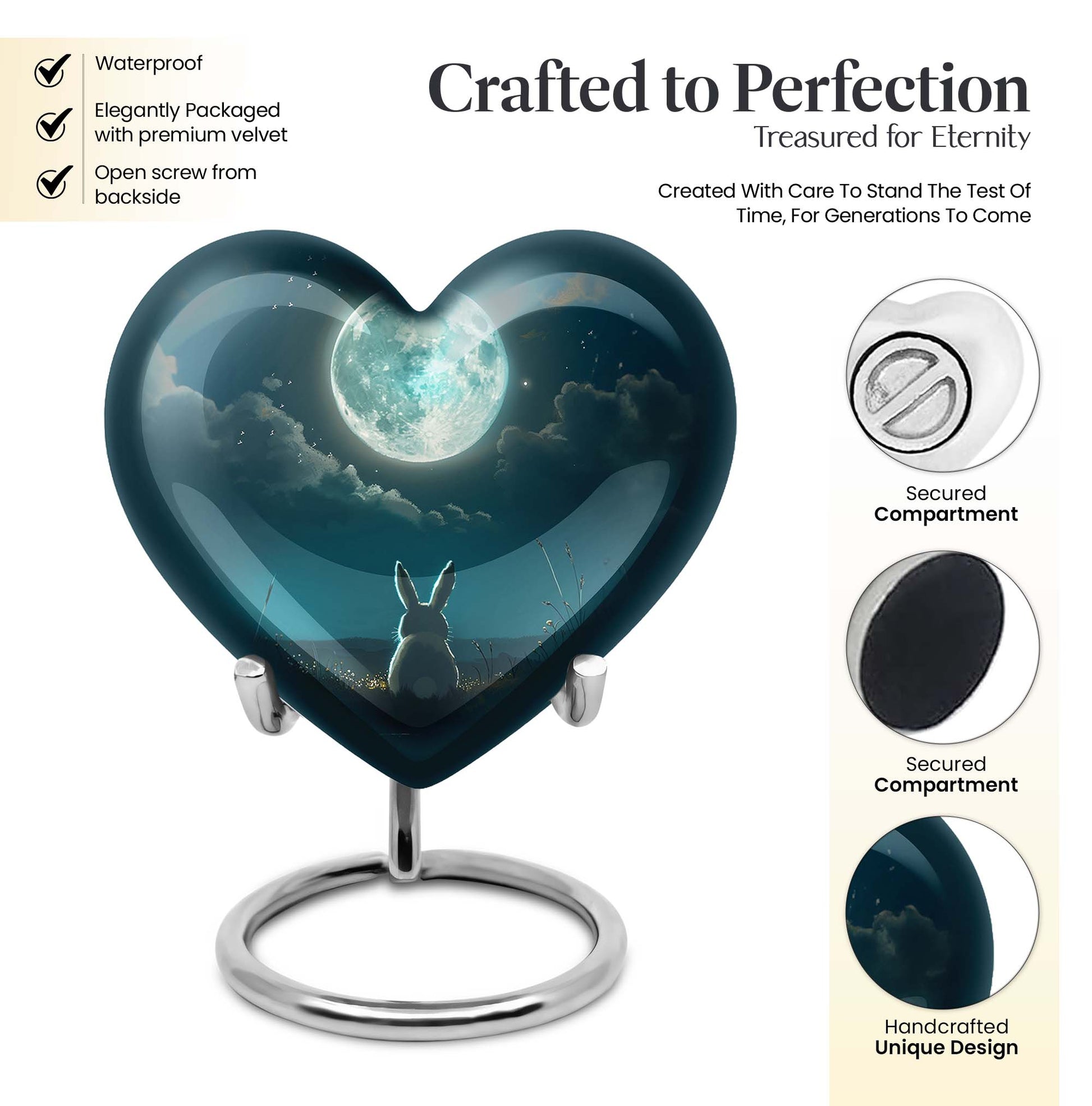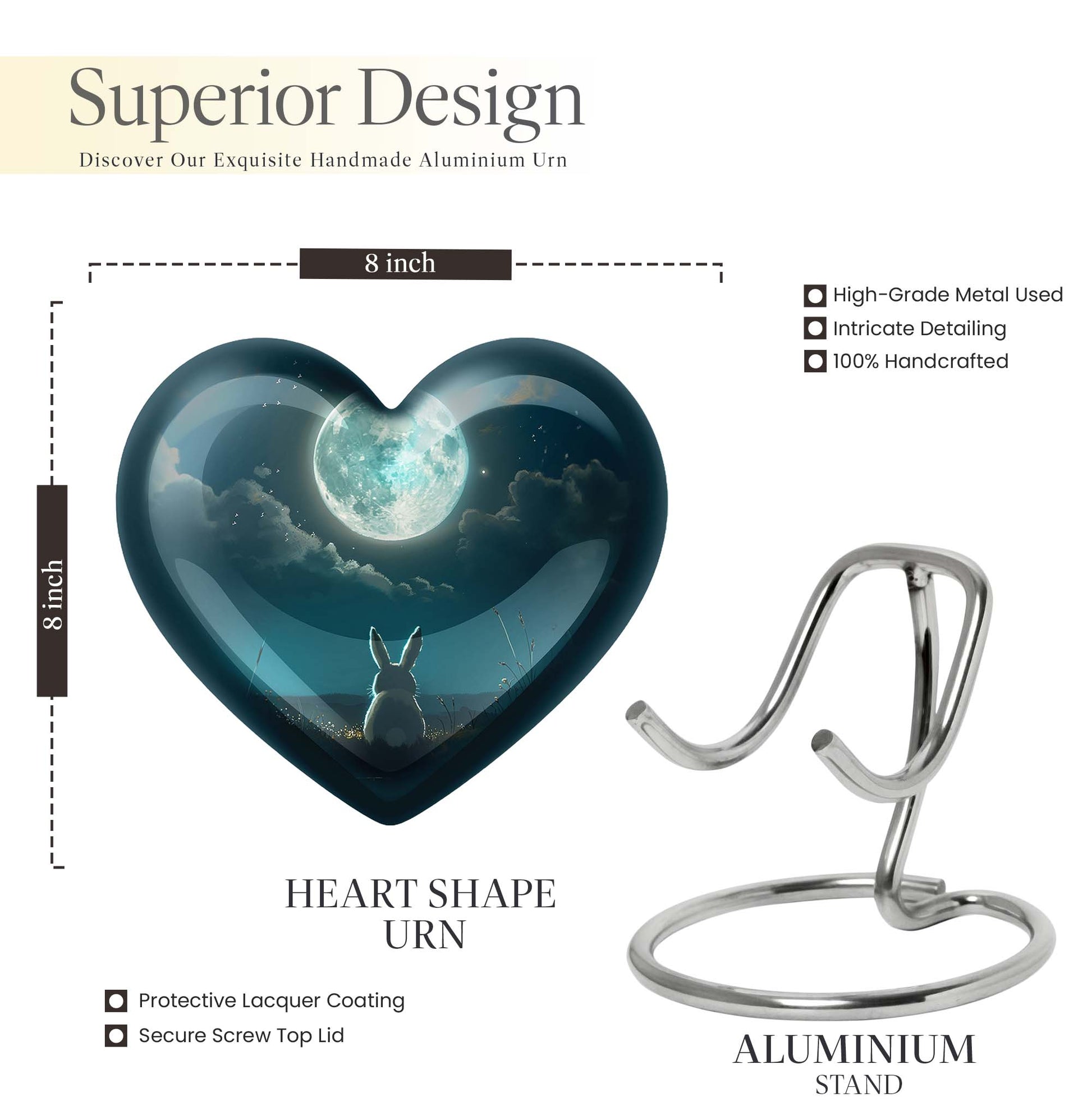 Capture the essence of undying affection with our 10-inch White Bunny Moon Urn, a tender relic for preserving the memory of your loved ones. Crafted with thorough diligence from superior aluminium, this large-sized cremation urn showcases an abstract theme that transcends conventional presentations. The heart urn design intricately weaves sentiment and aesthetic appeal into an artefact of symbolic remembrance. The urn's substantial 200 cubic inches capacity ensures comprehensive containment, while its 3.3-pound weight underscores its robust and sturdy build. Each purchase comes with a soft velvet pouch specifically designed for housing the ashes securely. And to make every urn distinctively personal, we offer customization options that let you engrave names. Ideal for both women and men, this burial large urn honors the cycle of life and death, making it a thoughtful, unisex gift for adults. Noted for its unmatched quality, the White Bunny Moon Urn signifies an enduring tribute to the remarkable journey of life.