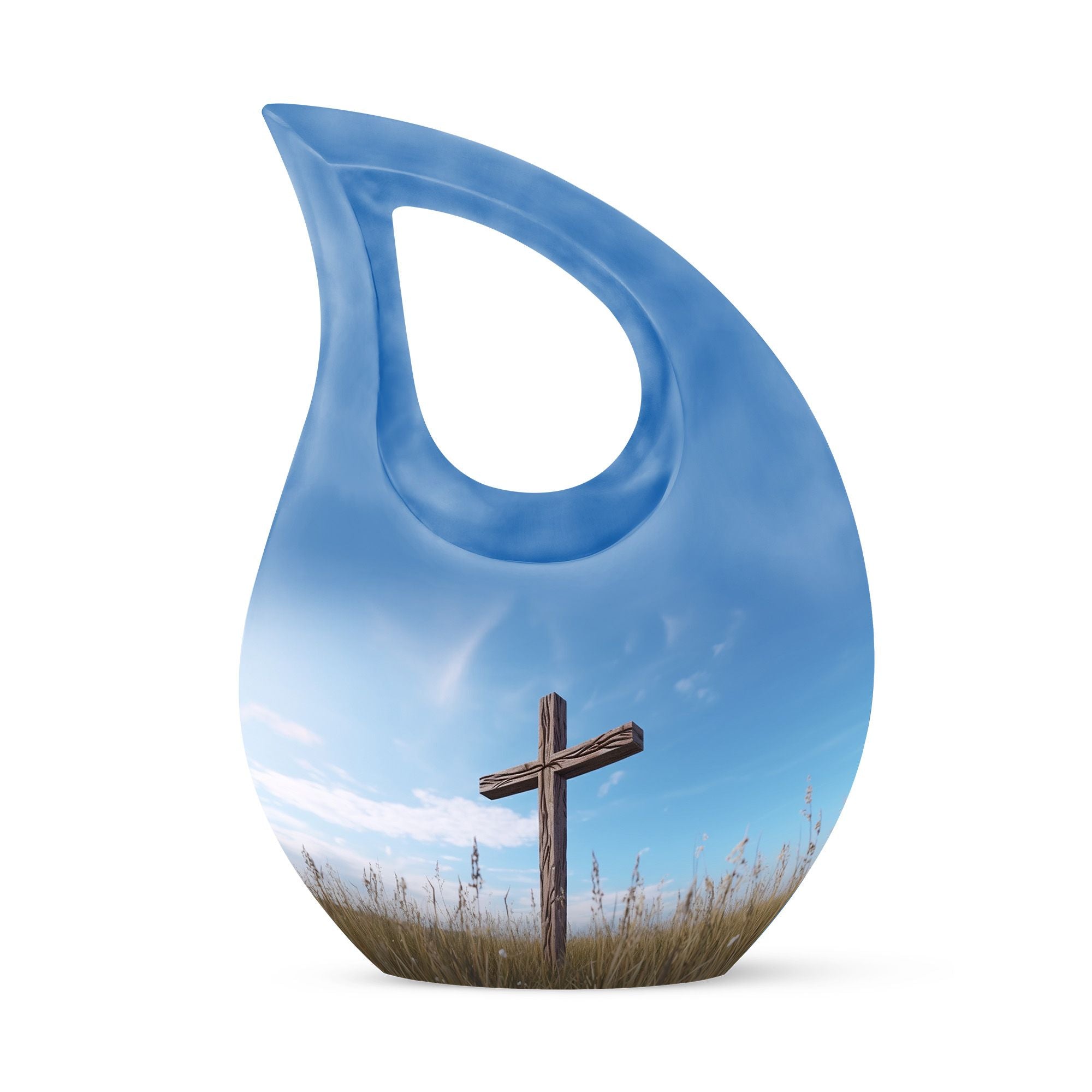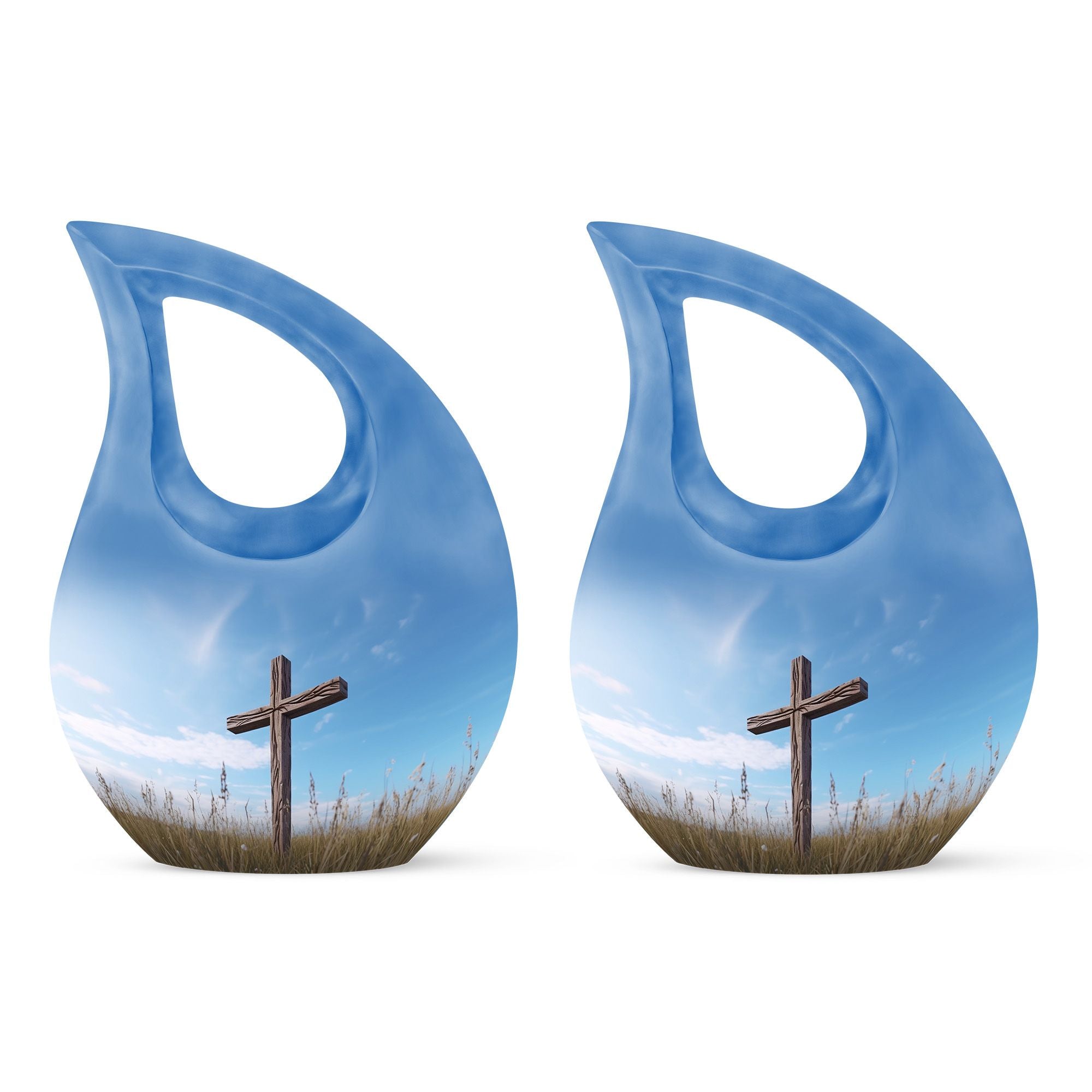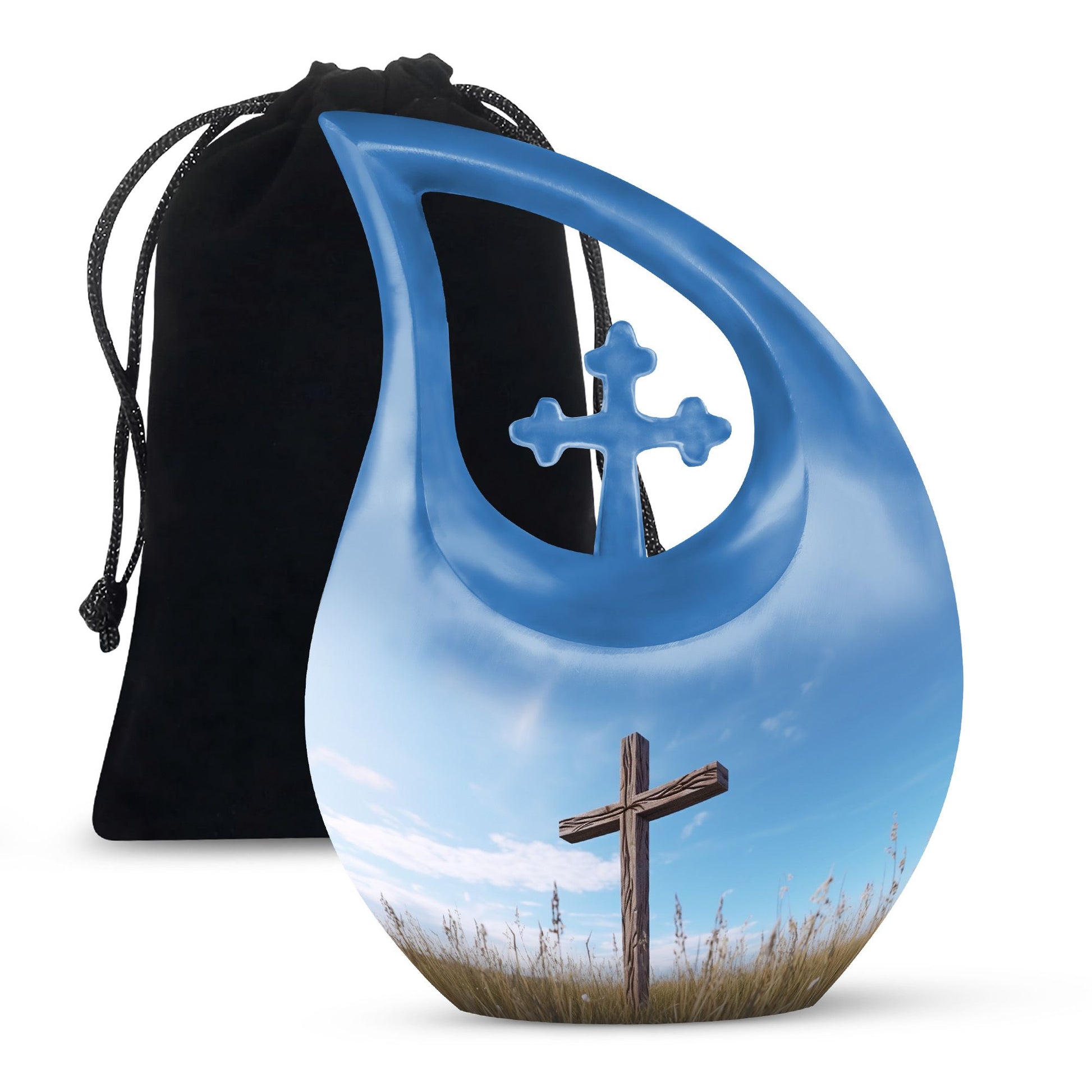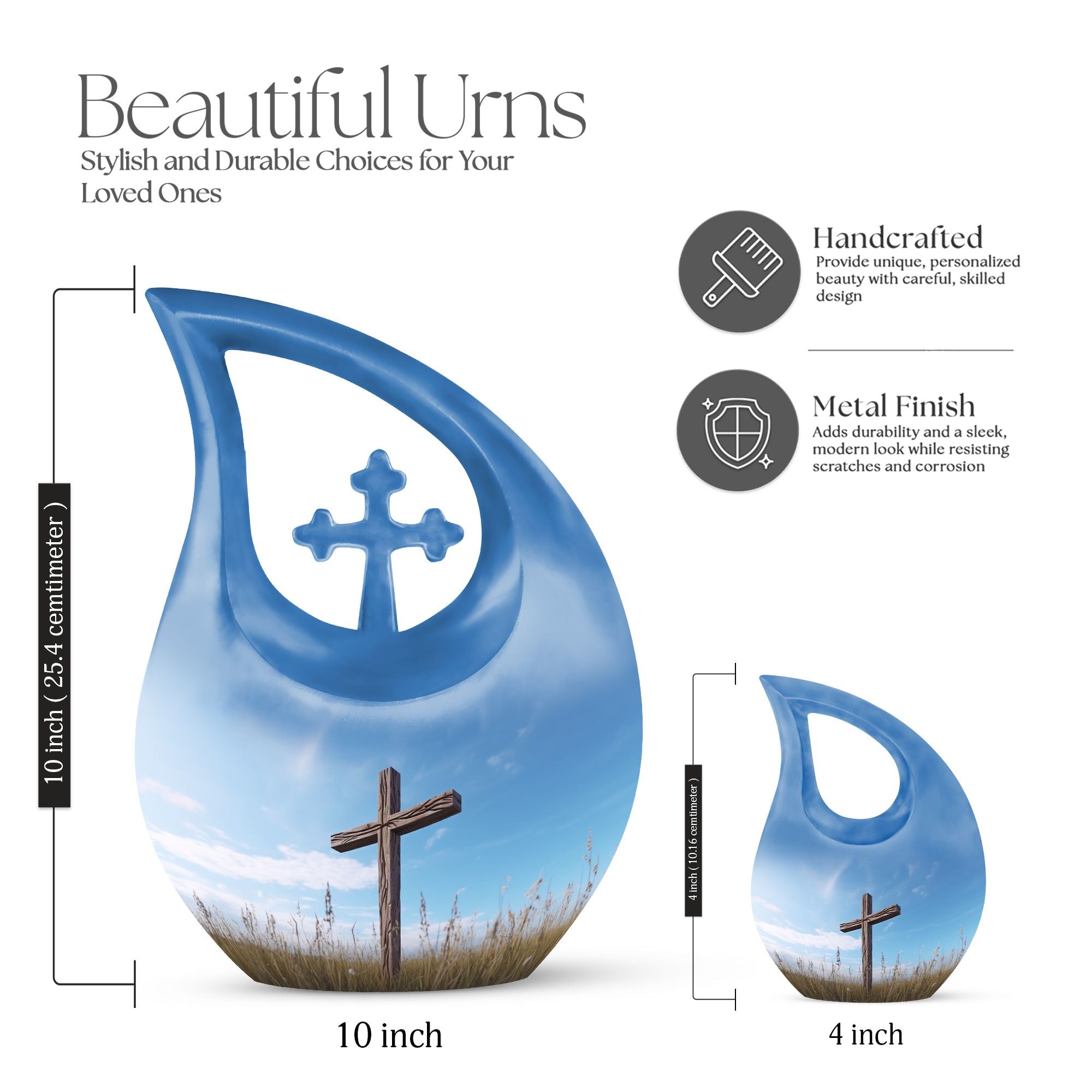 Welcome the tranquility and sacredness of our Jesus Christ Urn, a highly treasured addition to our select collection of large urns online. Bestowing honor to a loved one's memory, this cross drop urn measures a formidable 10 inches, providing a Capacity of 200 cubic inches to treasure the ashes of your departed love. Skillfully crafted from durable aluminium, our urn is both aesthetically pleasing and exudes immense stability with a weight of 3.3 pounds. To further elevate your memorial tribute, each purchase offers an option for customization by means of engraved names, ensuring an everlasting bond. The urn arrives cradled in a plush velvet pouch, bespeaking of our commitment to respecting and preserving your treasured keepsakes. Our memorials urns transcend commonality, offering an intimate keepsake memory box for moments of quiet reflection. Refresh your search from conventional cremation boxes for adults, and embrace the serenity of our metal urns for ashes, a true embodiment of solace and honor.
