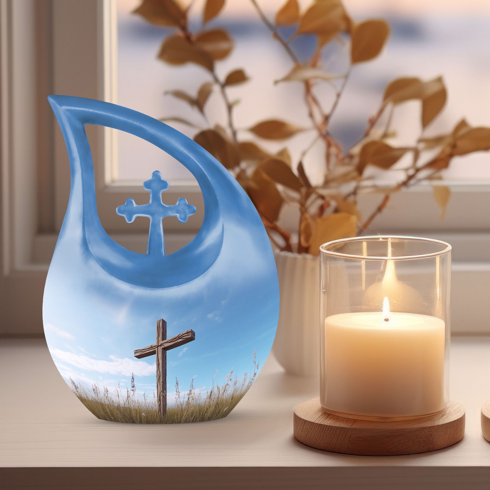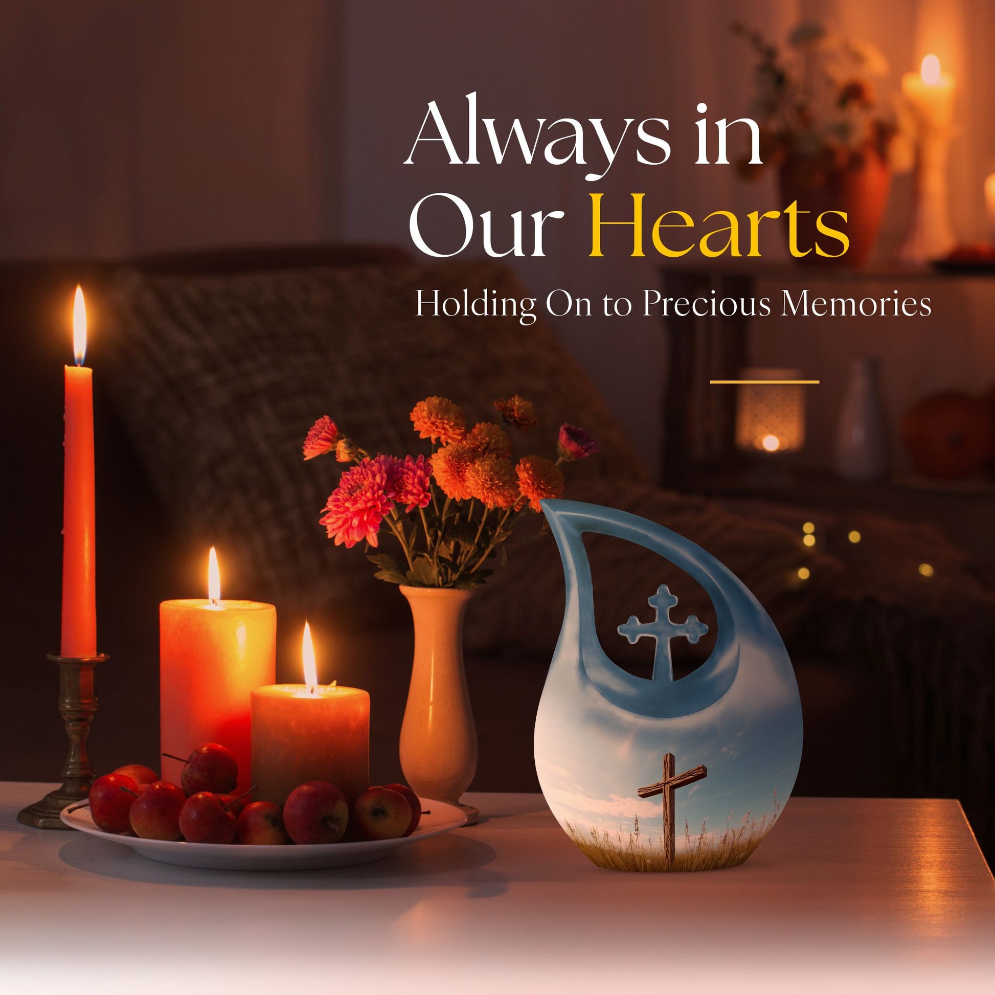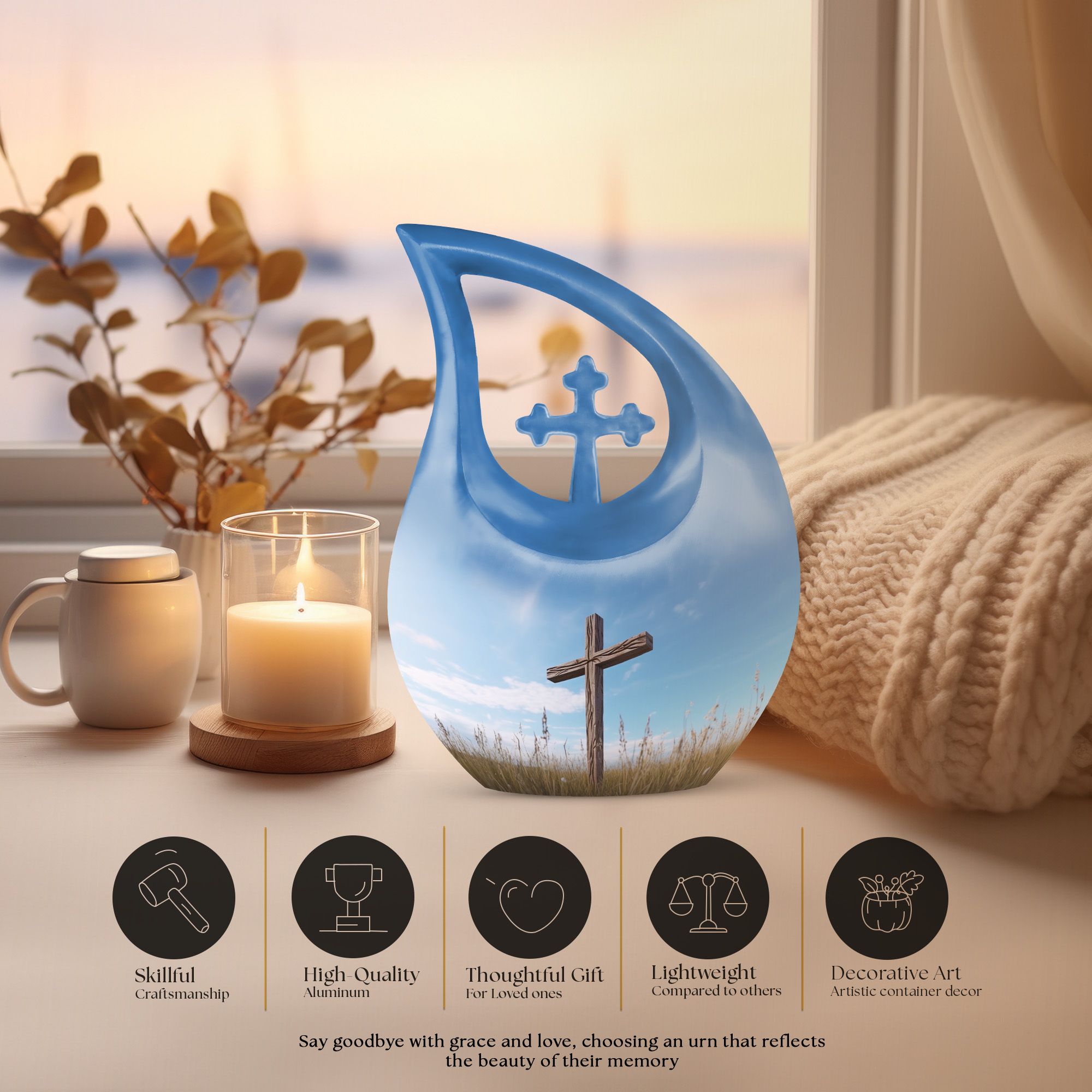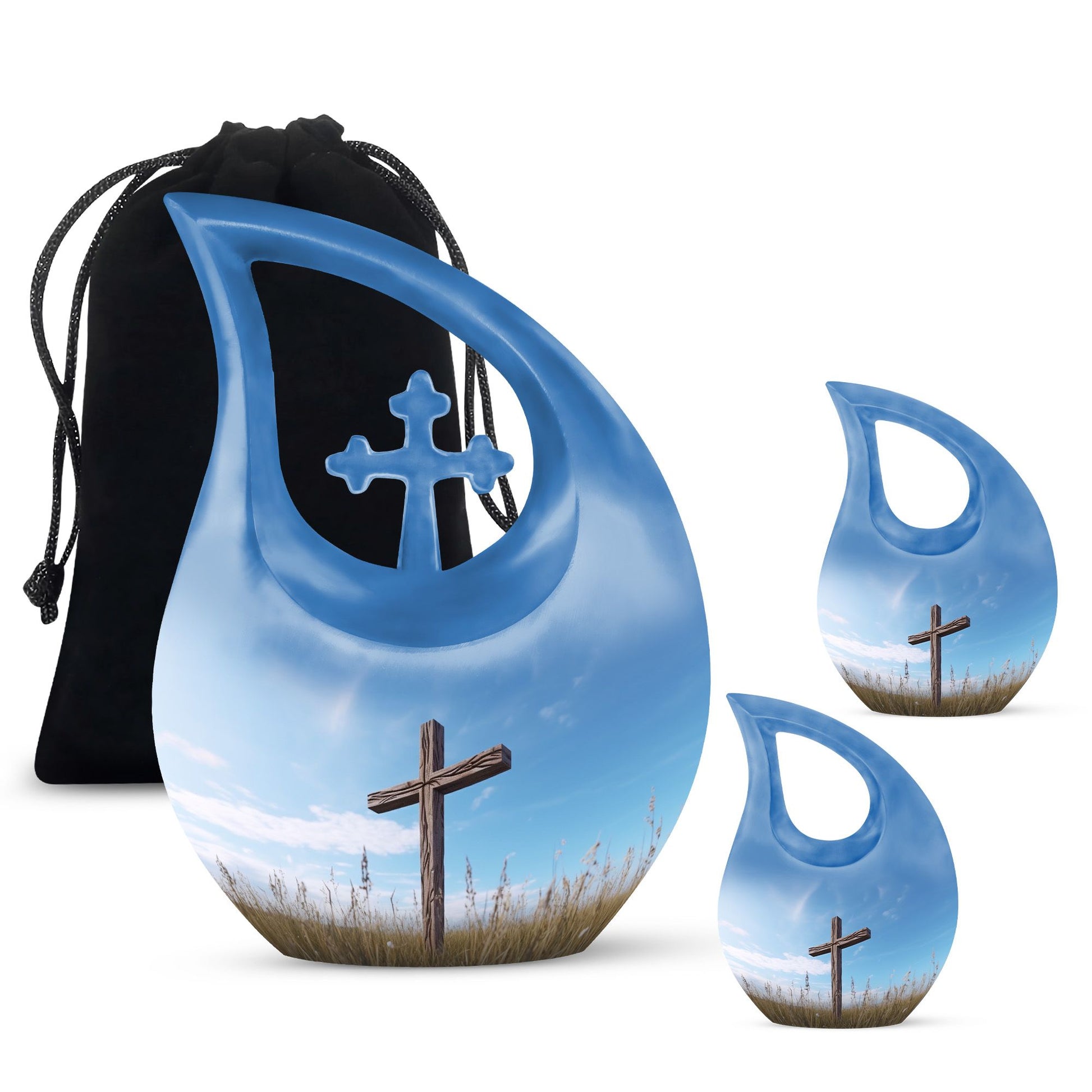 Welcome the tranquility and sacredness of our Jesus Christ Urn, a highly treasured addition to our select collection of large urns online. Bestowing honor to a loved one's memory, this cross drop urn measures a formidable 10 inches, providing a Capacity of 200 cubic inches to treasure the ashes of your departed love. Skillfully crafted from durable aluminium, our urn is both aesthetically pleasing and exudes immense stability with a weight of 3.3 pounds. To further elevate your memorial tribute, each purchase offers an option for customization by means of engraved names, ensuring an everlasting bond. The urn arrives cradled in a plush velvet pouch, bespeaking of our commitment to respecting and preserving your treasured keepsakes. Our memorials urns transcend commonality, offering an intimate keepsake memory box for moments of quiet reflection. Refresh your search from conventional cremation boxes for adults, and embrace the serenity of our metal urns for ashes, a true embodiment of solace and honor.