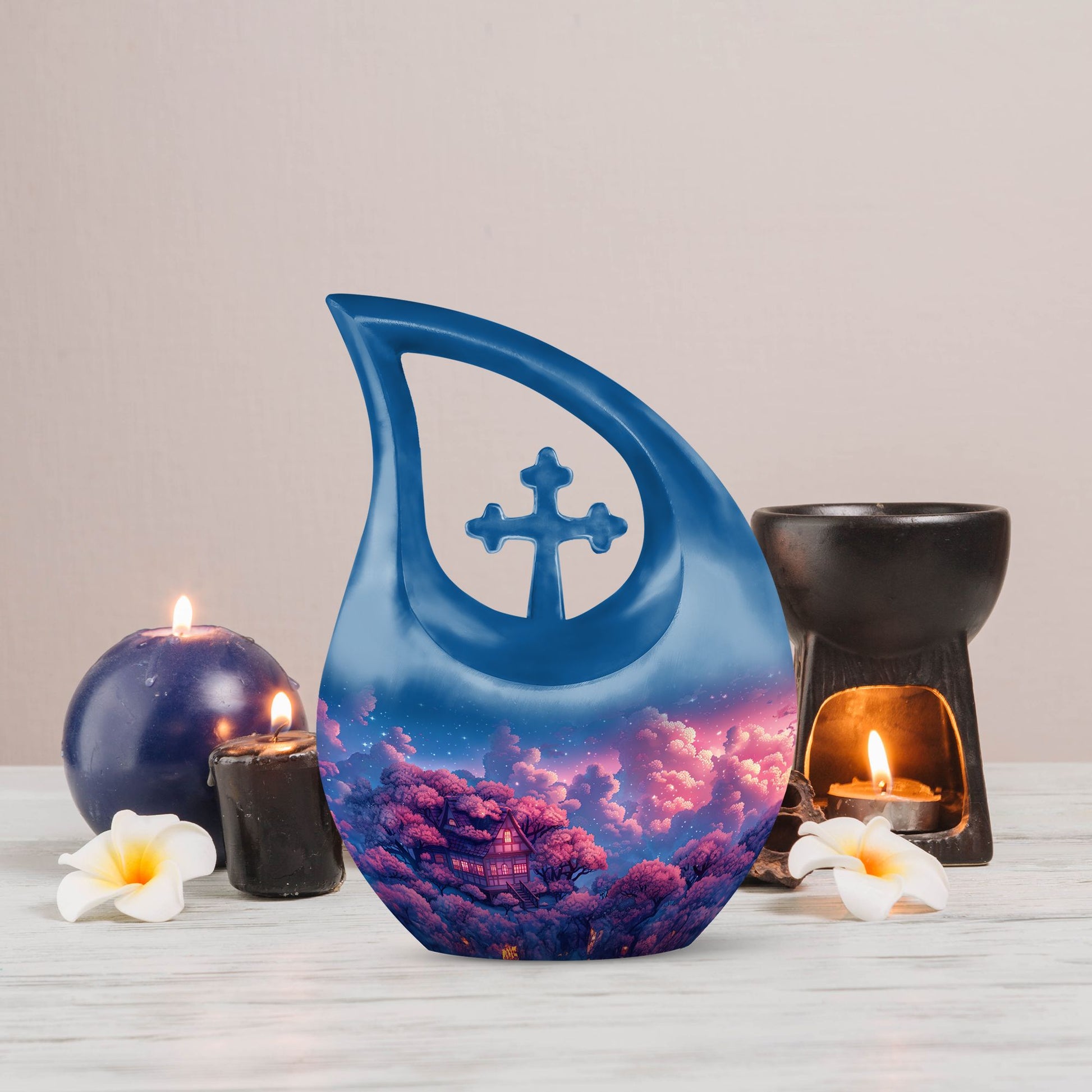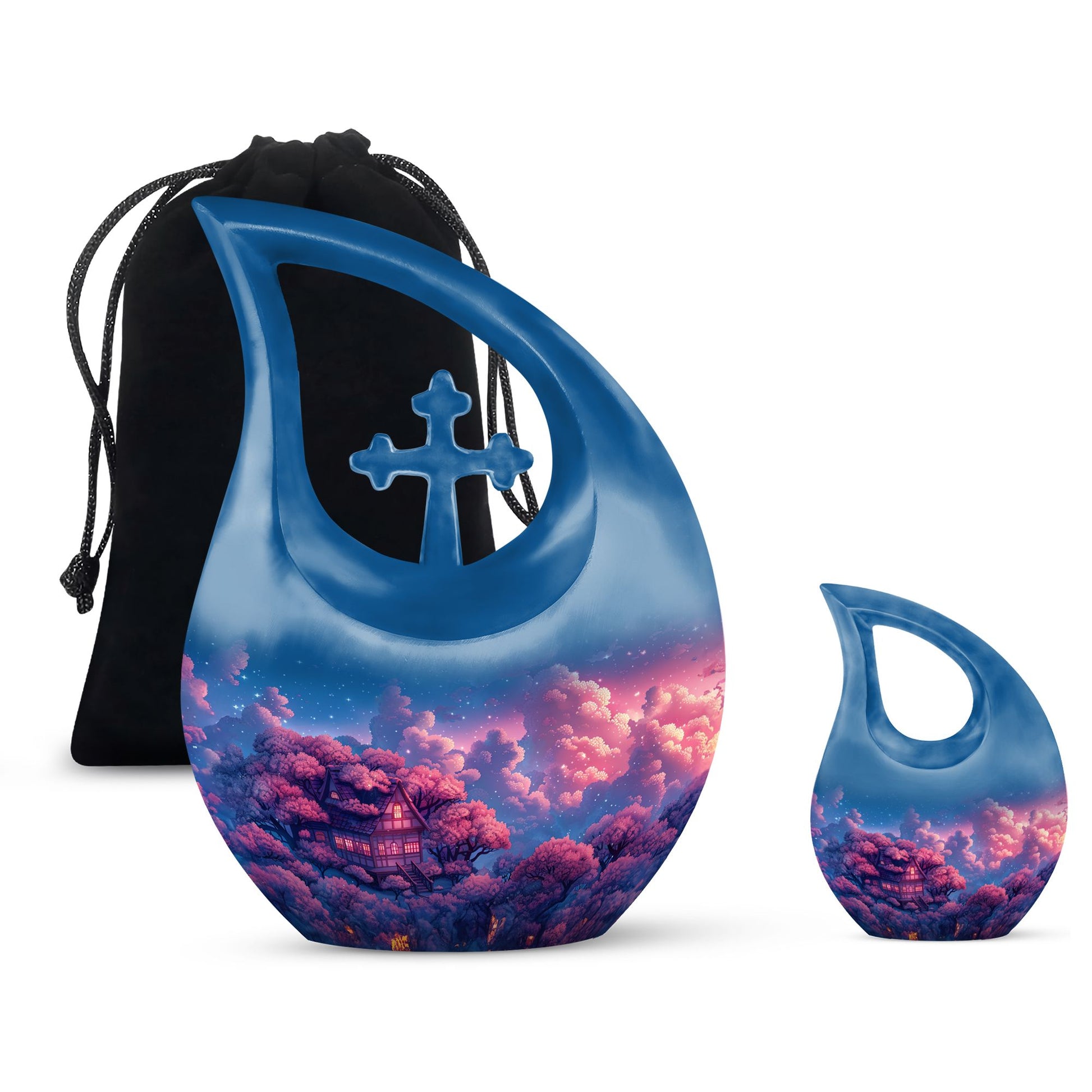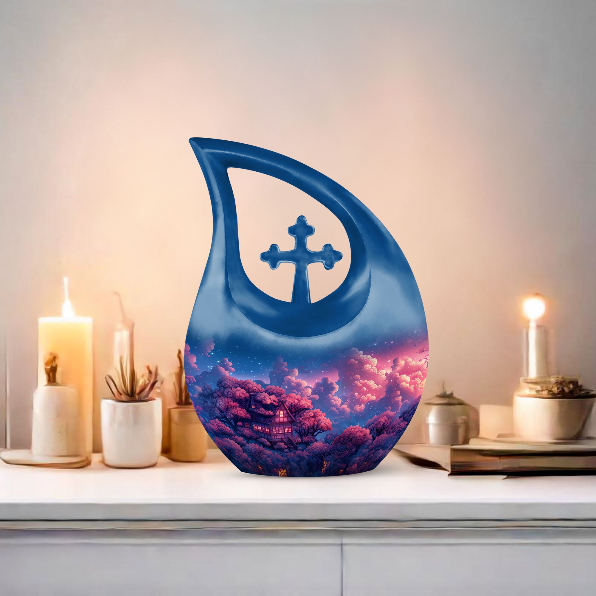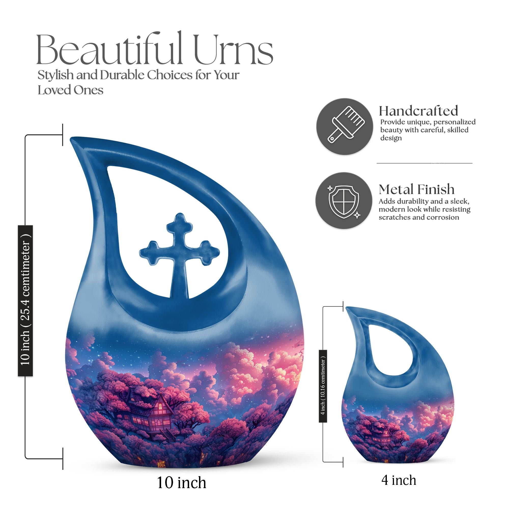 Stylishly commemorate your beloved with our finely crafted Cloud Urns. Built for lastings, the aluminium large urn is designed with a 10-inch height and a capacity of 200 cubic inches. This beautifully tailored urn offers an exquisite balance between elegance and durability. Weighing a slight 3.3 pounds, carrying it won't be burdensome. Its unique theme of clouds offers an ethereal touch to an already sensitive memento. The urn is accompanied by a velvet pouch that elegantly conceals the ashes of your loved one preserving their dignity. As a tribute to the departed soul, this urn features a 'Cross Drop' embellishment, representing a peaceful transition to the afterlife. Personalization is offered, allowing you the chance to engrave the names of your loved one on it. The primary characteristic of our urns is not only their high-quality material but also their availability at affordable rates. These can also be utilized as companion urns while being compact enough to fit into small niches, making them a versatile necessity at memorial ceremonies.