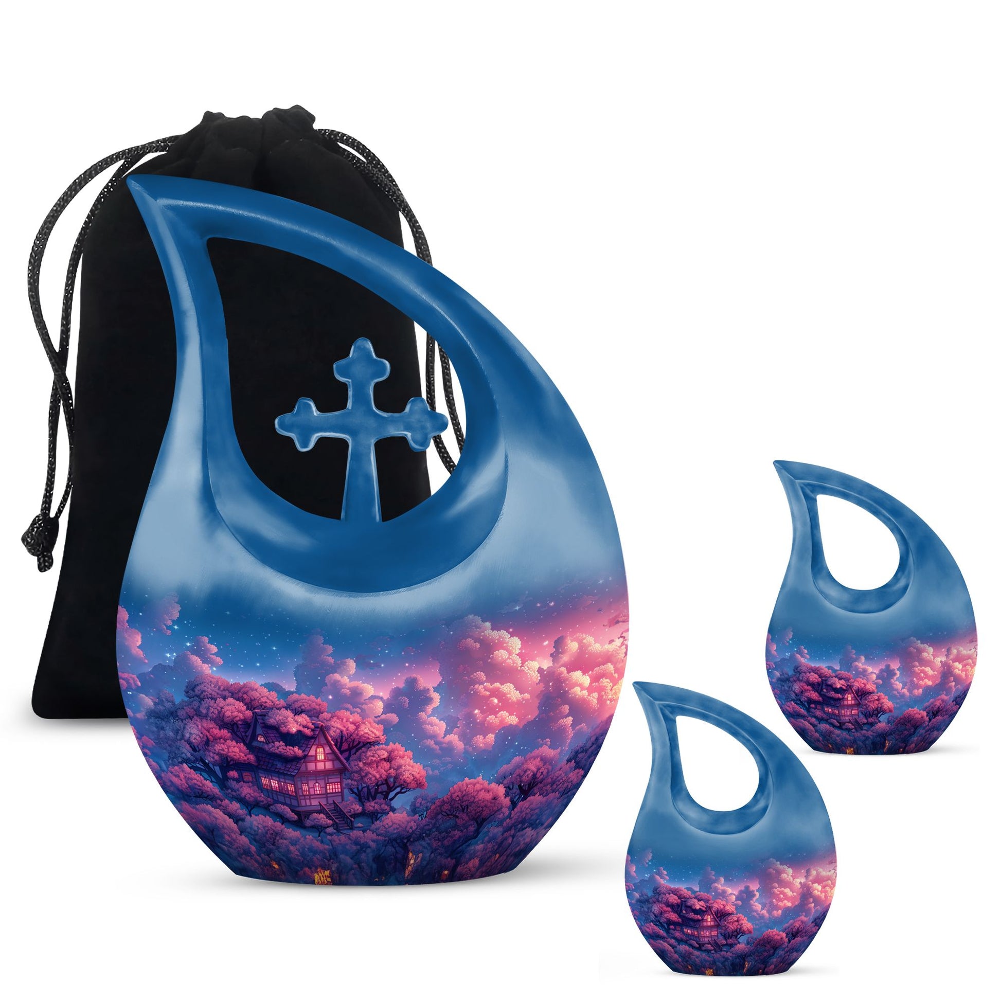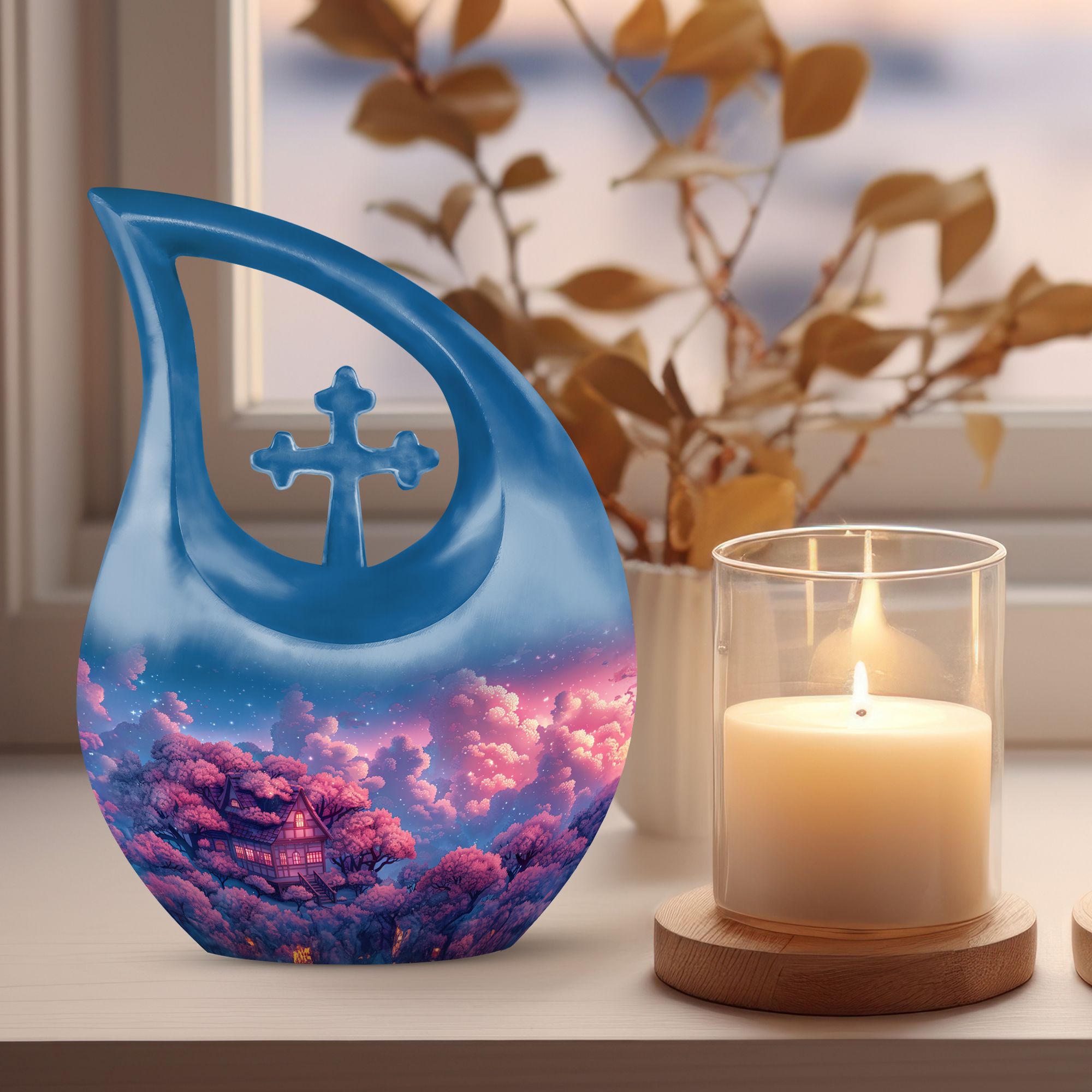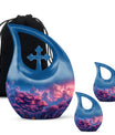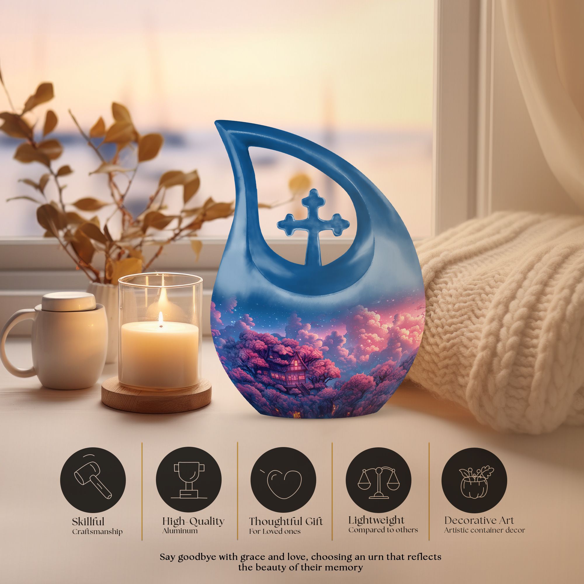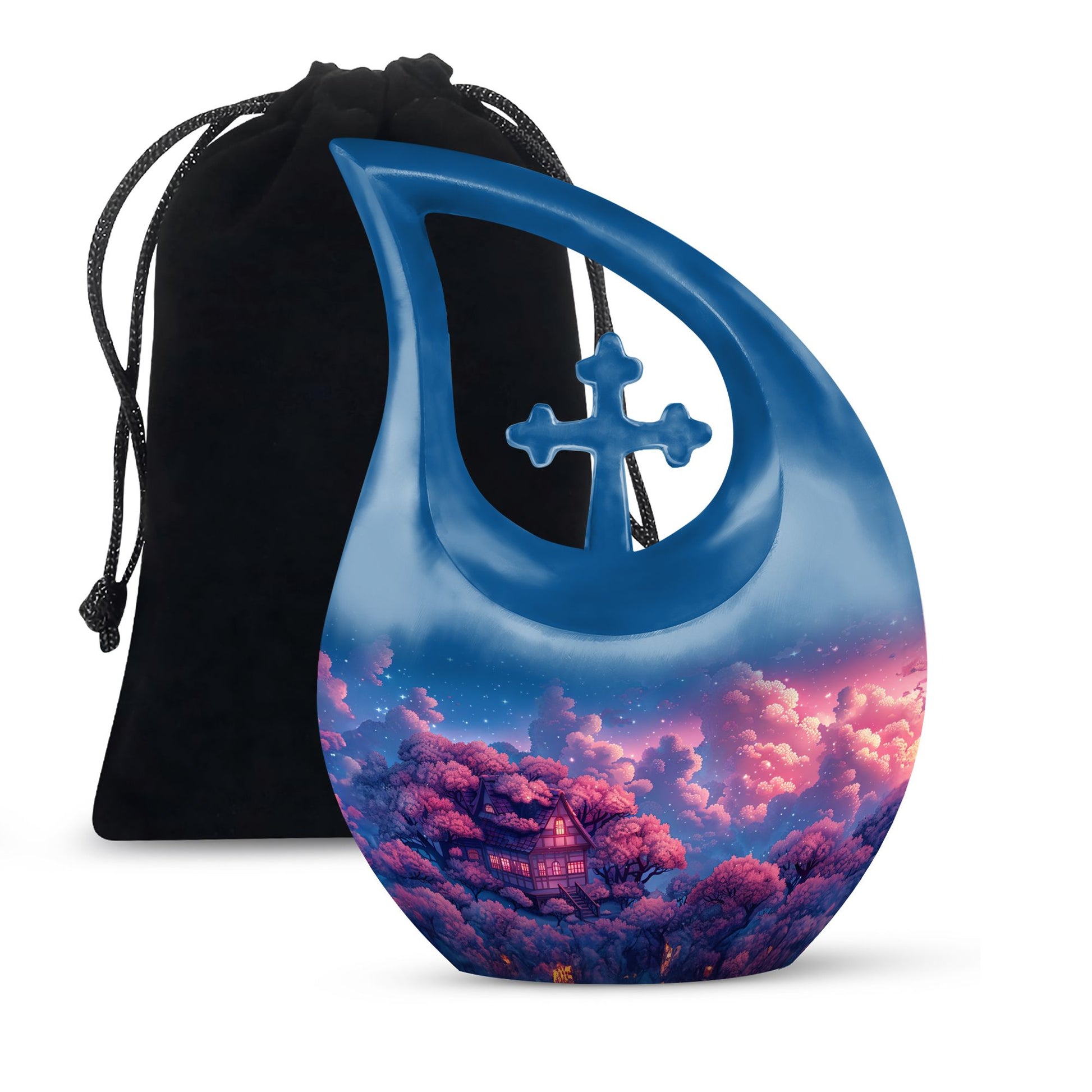 Stylishly commemorate your beloved with our finely crafted Cloud Urns. Built for lastings, the aluminium large urn is designed with a 10-inch height and a capacity of 200 cubic inches. This beautifully tailored urn offers an exquisite balance between elegance and durability. Weighing a slight 3.3 pounds, carrying it won't be burdensome. Its unique theme of clouds offers an ethereal touch to an already sensitive memento. The urn is accompanied by a velvet pouch that elegantly conceals the ashes of your loved one preserving their dignity. As a tribute to the departed soul, this urn features a 'Cross Drop' embellishment, representing a peaceful transition to the afterlife. Personalization is offered, allowing you the chance to engrave the names of your loved one on it. The primary characteristic of our urns is not only their high-quality material but also their availability at affordable rates. These can also be utilized as companion urns while being compact enough to fit into small niches, making them a versatile necessity at memorial ceremonies.