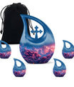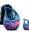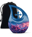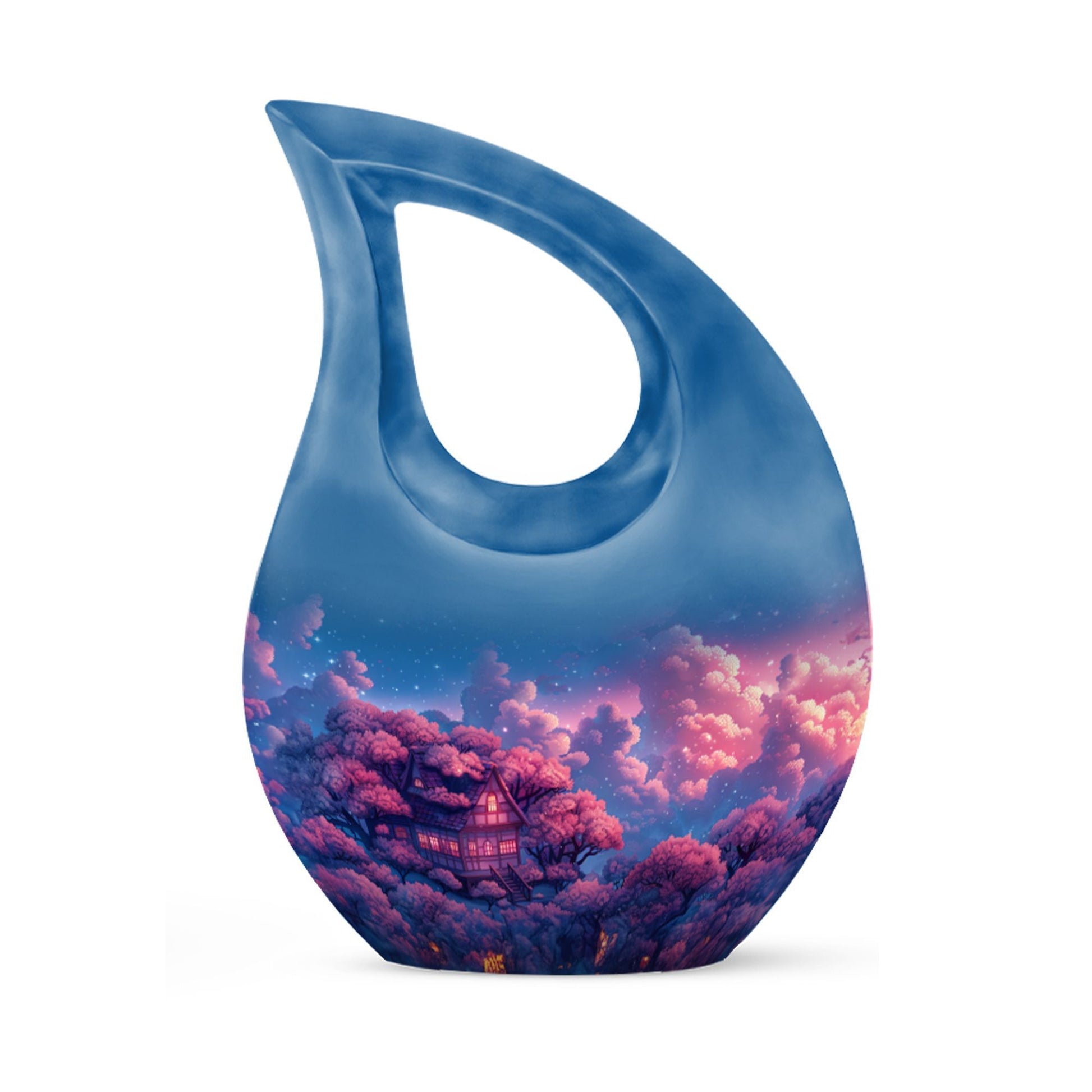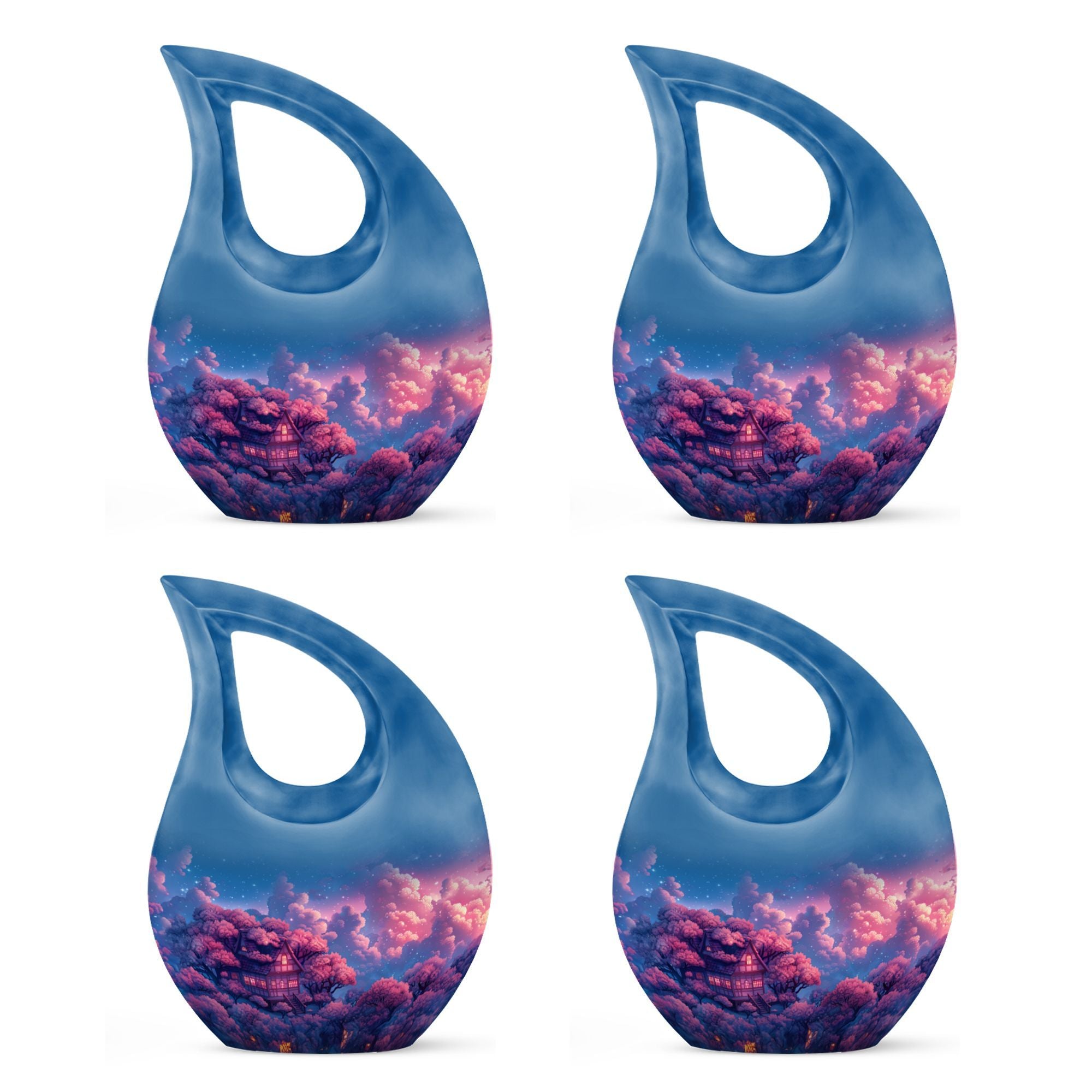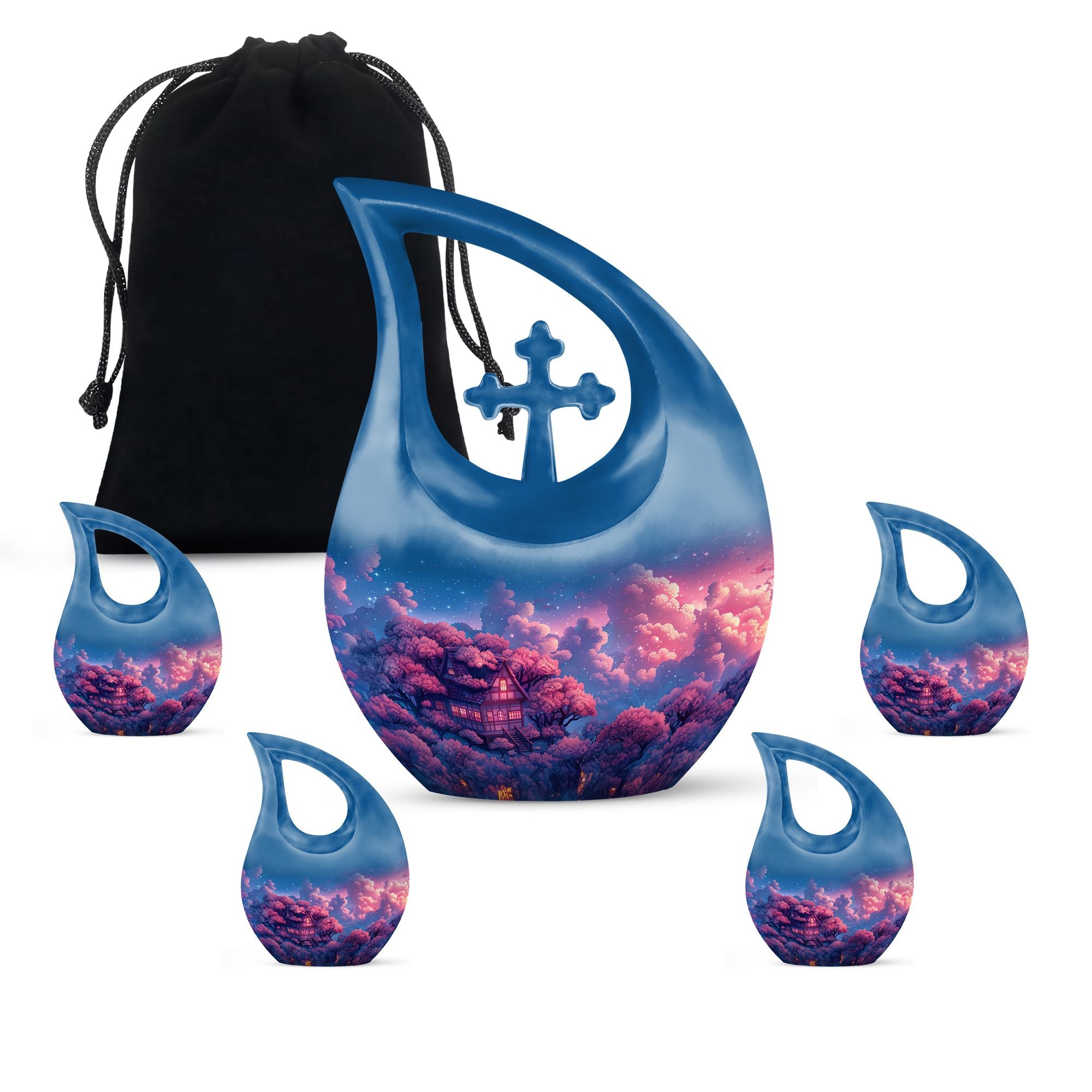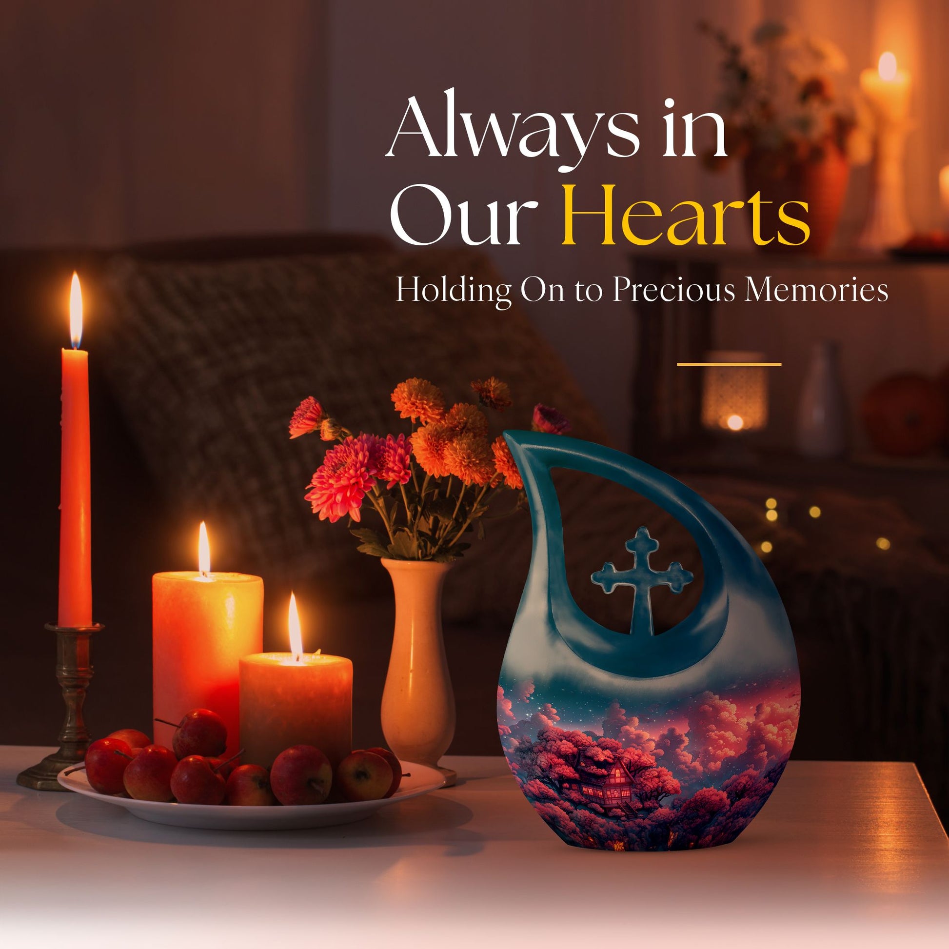 Stylishly commemorate your beloved with our finely crafted Cloud Urns. Built for lastings, the aluminium large urn is designed with a 10-inch height and a capacity of 200 cubic inches. This beautifully tailored urn offers an exquisite balance between elegance and durability. Weighing a slight 3.3 pounds, carrying it won't be burdensome. Its unique theme of clouds offers an ethereal touch to an already sensitive memento. The urn is accompanied by a velvet pouch that elegantly conceals the ashes of your loved one preserving their dignity. As a tribute to the departed soul, this urn features a 'Cross Drop' embellishment, representing a peaceful transition to the afterlife. Personalization is offered, allowing you the chance to engrave the names of your loved one on it. The primary characteristic of our urns is not only their high-quality material but also their availability at affordable rates. These can also be utilized as companion urns while being compact enough to fit into small niches, making them a versatile necessity at memorial ceremonies.