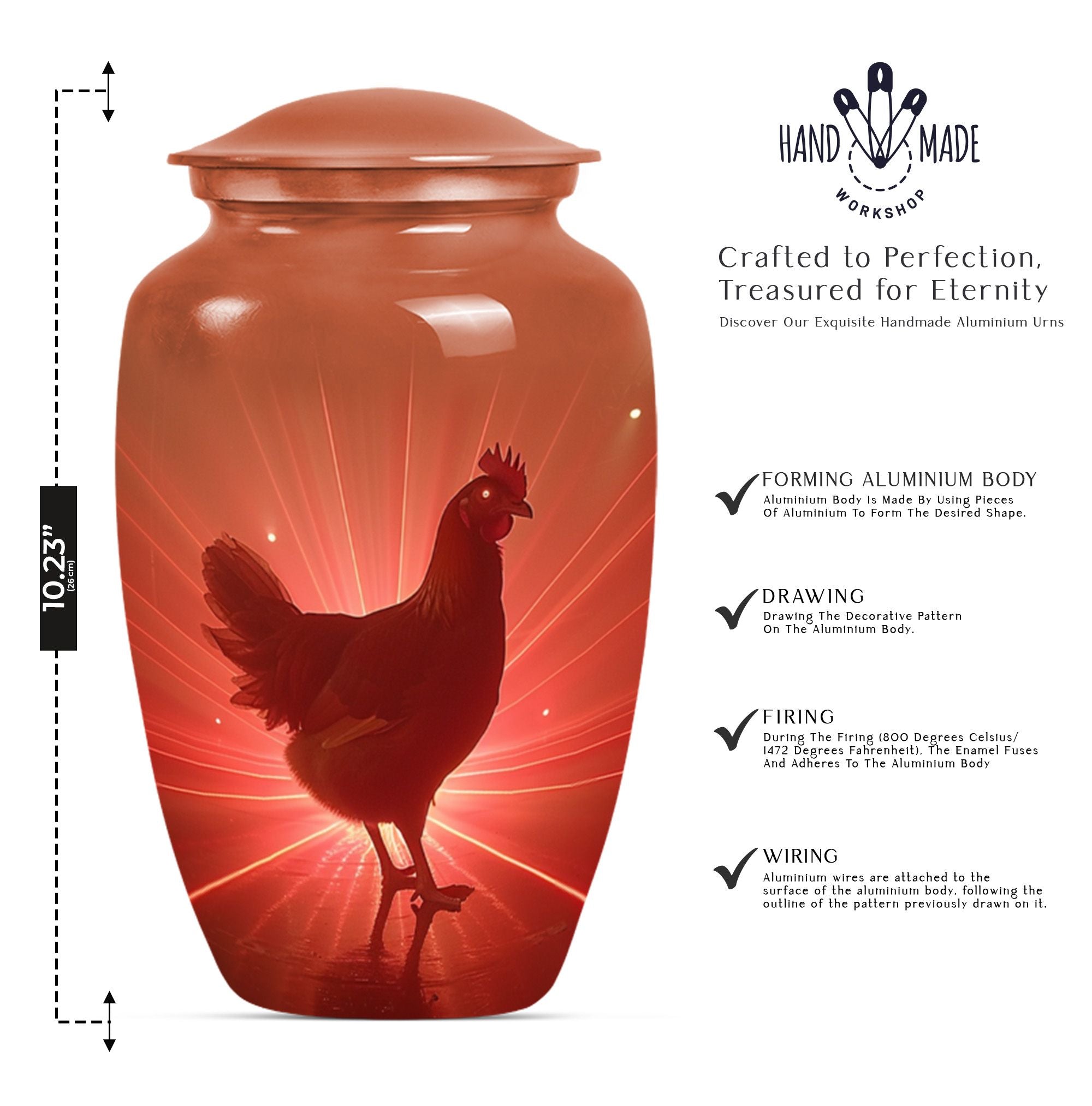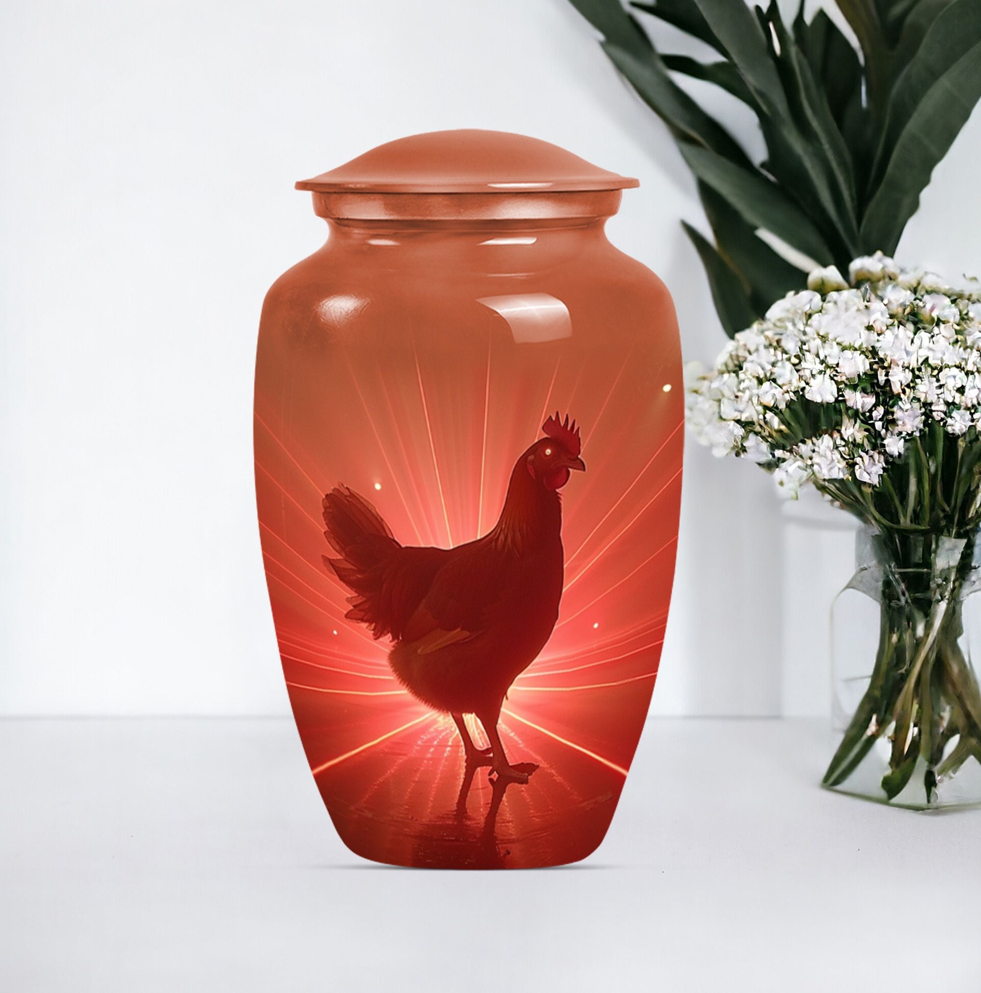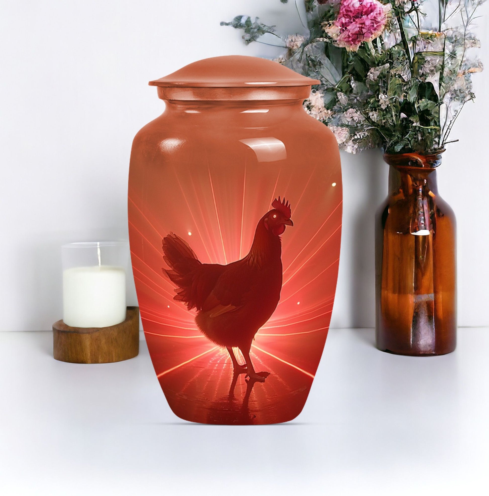 Honor the memories of your departed loved ones with our meticulously crafted 'Chicken Urn'. This large size, 10-inch urn fits adeptly within the 'Burial Urns for Cremation Ashes' category, elevating the standards of 'Memorial Urns'. Crafted from superior quality aluminium, it reflects a sublime floral theme, presenting an ethereal hommage to your loved one. With dimensions of 10 inches in height and a weight of 3.3 pounds, its capacity to hold 200 cubic inches stands unrivalled in its construct. More than mere cremation urns for human ashes, it personifies a timeless keepsake. The unique personalization feature allows you to engrave names, immortalizing the connections that transcend mortality itself. The package also includes a highly refined velvet pouch for containment of ashes. Embrace the sanctity of remembrance with our urns. Let your tribute resonate with pure love and profound reverence.