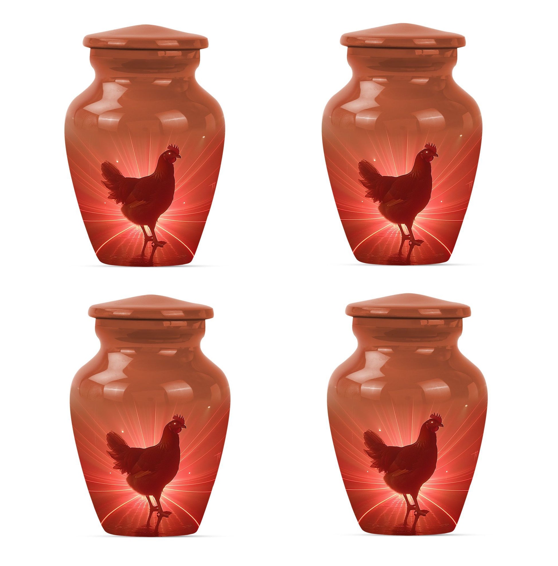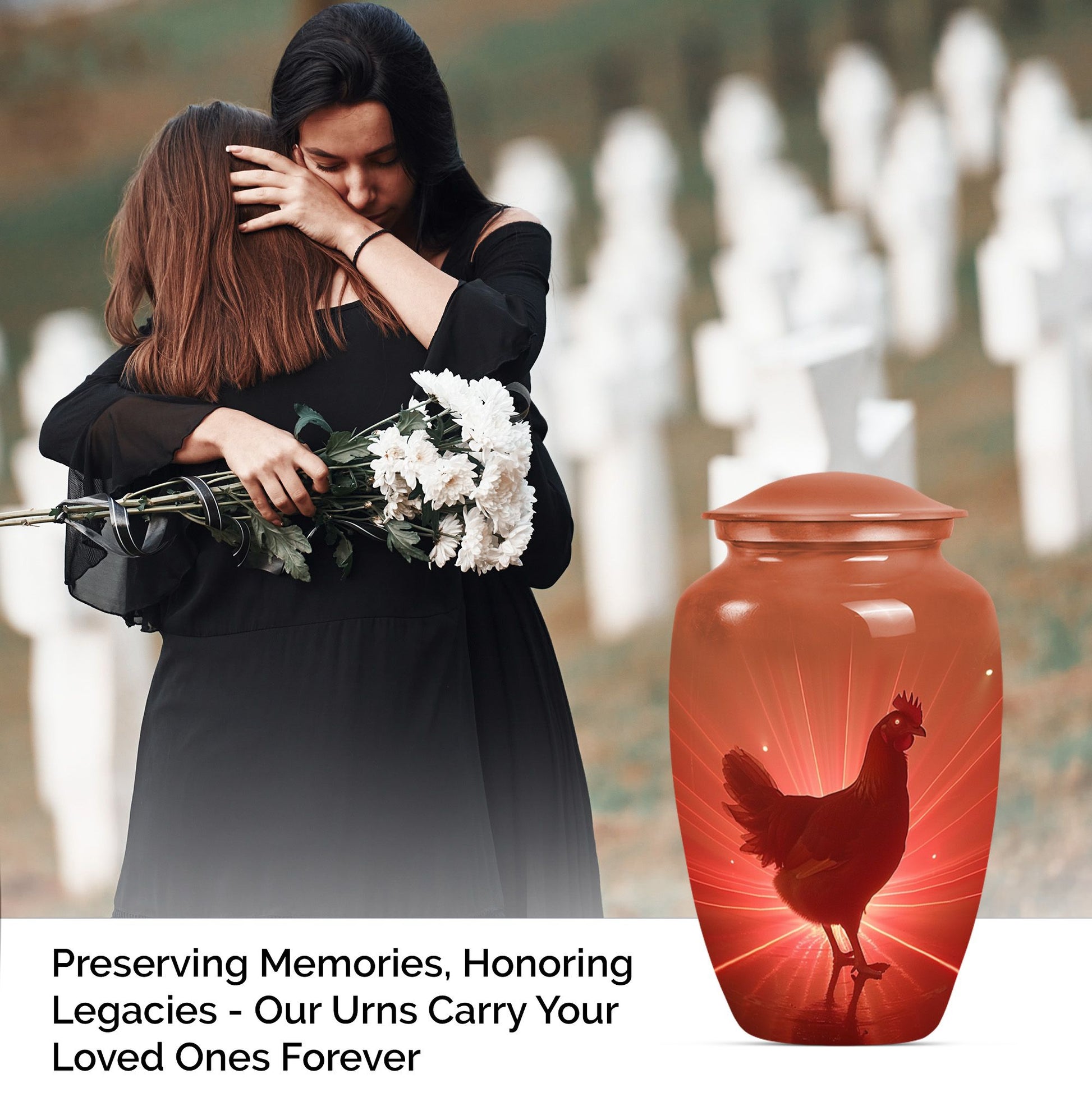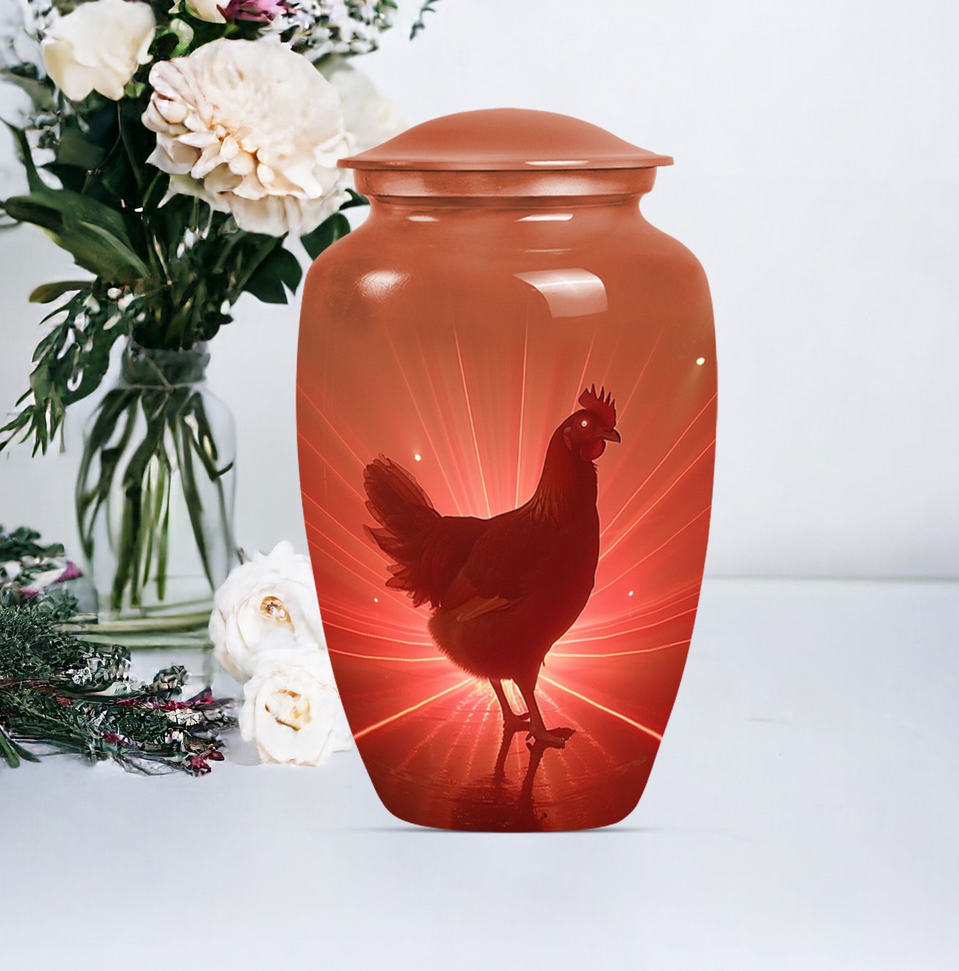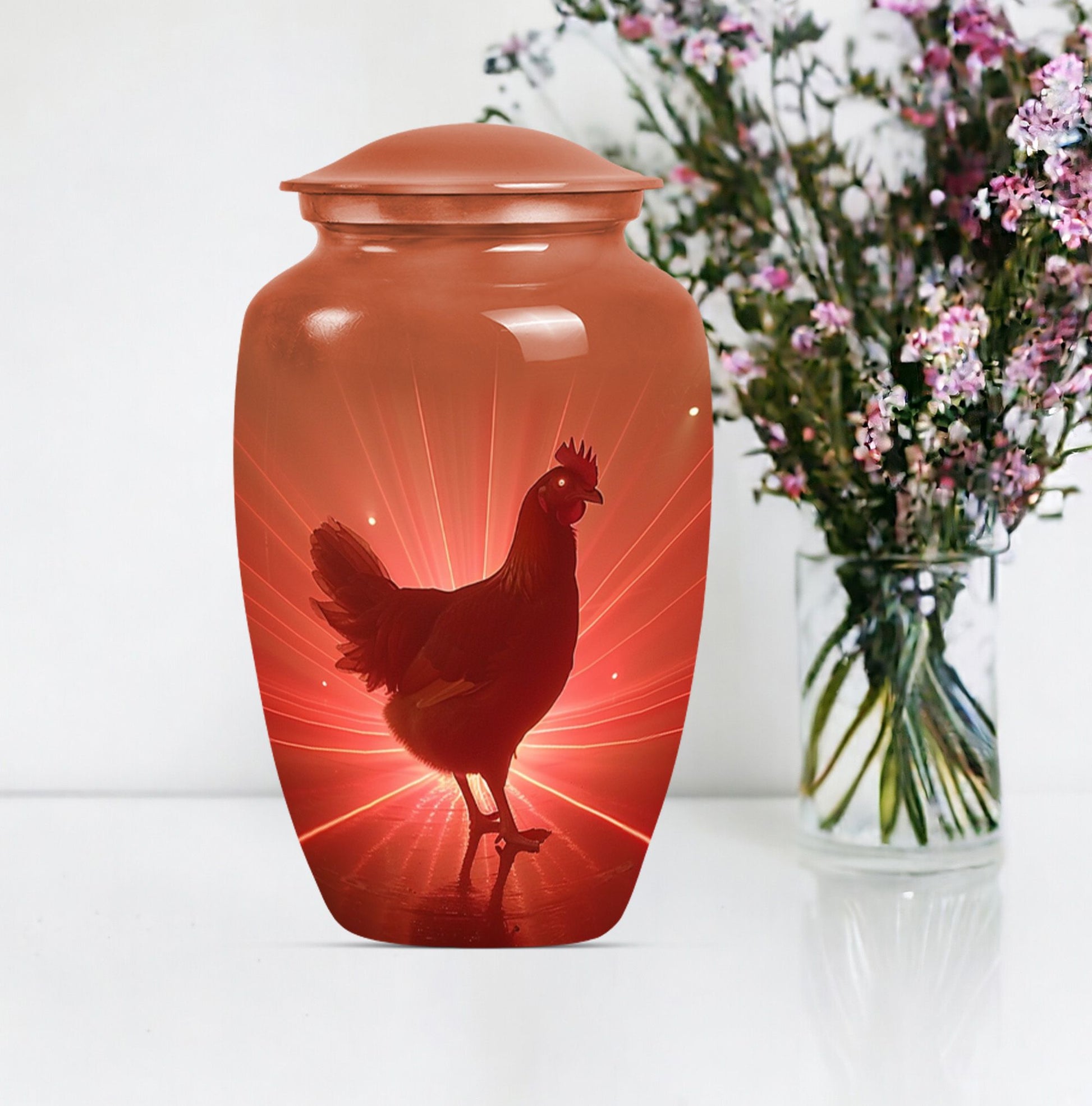 Honor the memories of your departed loved ones with our meticulously crafted 'Chicken Urn'. This large size, 10-inch urn fits adeptly within the 'Burial Urns for Cremation Ashes' category, elevating the standards of 'Memorial Urns'. Crafted from superior quality aluminium, it reflects a sublime floral theme, presenting an ethereal hommage to your loved one. With dimensions of 10 inches in height and a weight of 3.3 pounds, its capacity to hold 200 cubic inches stands unrivalled in its construct. More than mere cremation urns for human ashes, it personifies a timeless keepsake. The unique personalization feature allows you to engrave names, immortalizing the connections that transcend mortality itself. The package also includes a highly refined velvet pouch for containment of ashes. Embrace the sanctity of remembrance with our urns. Let your tribute resonate with pure love and profound reverence.