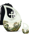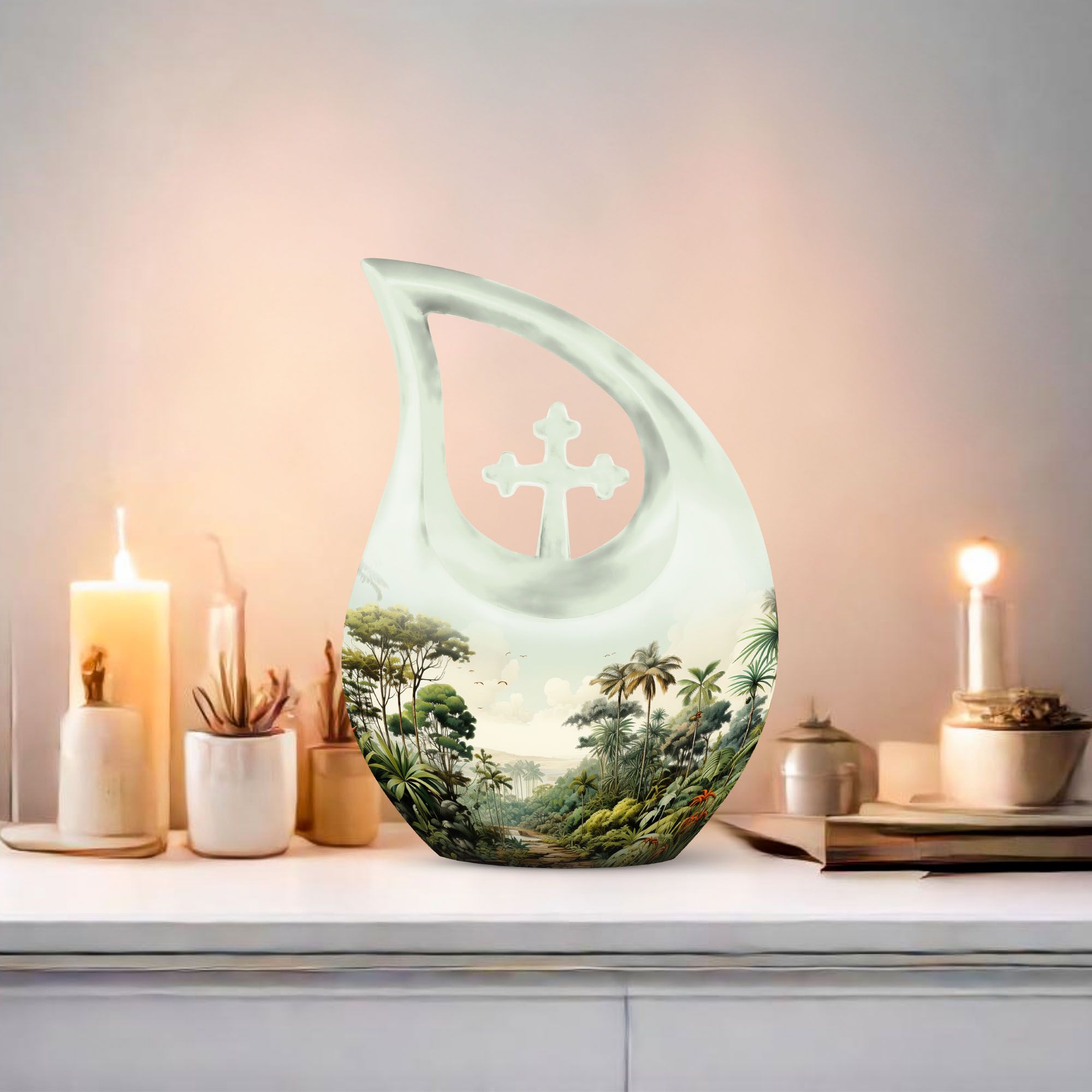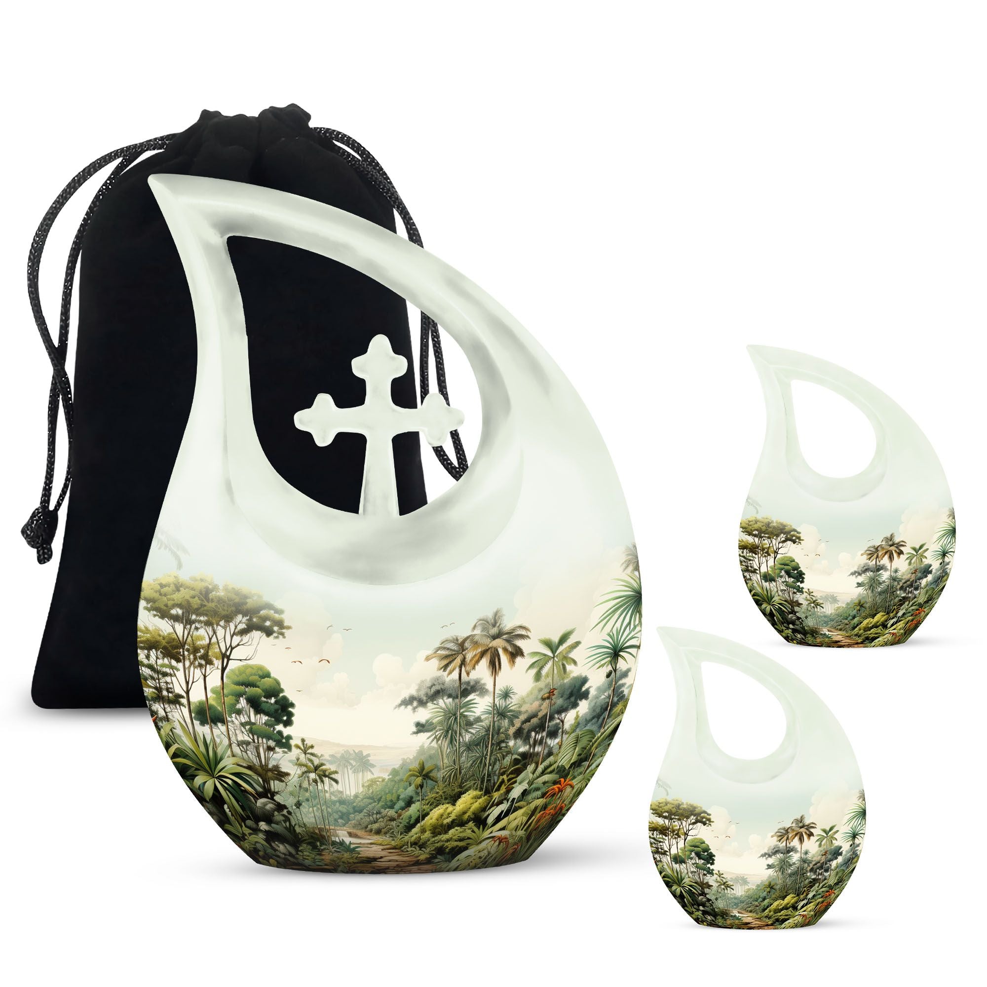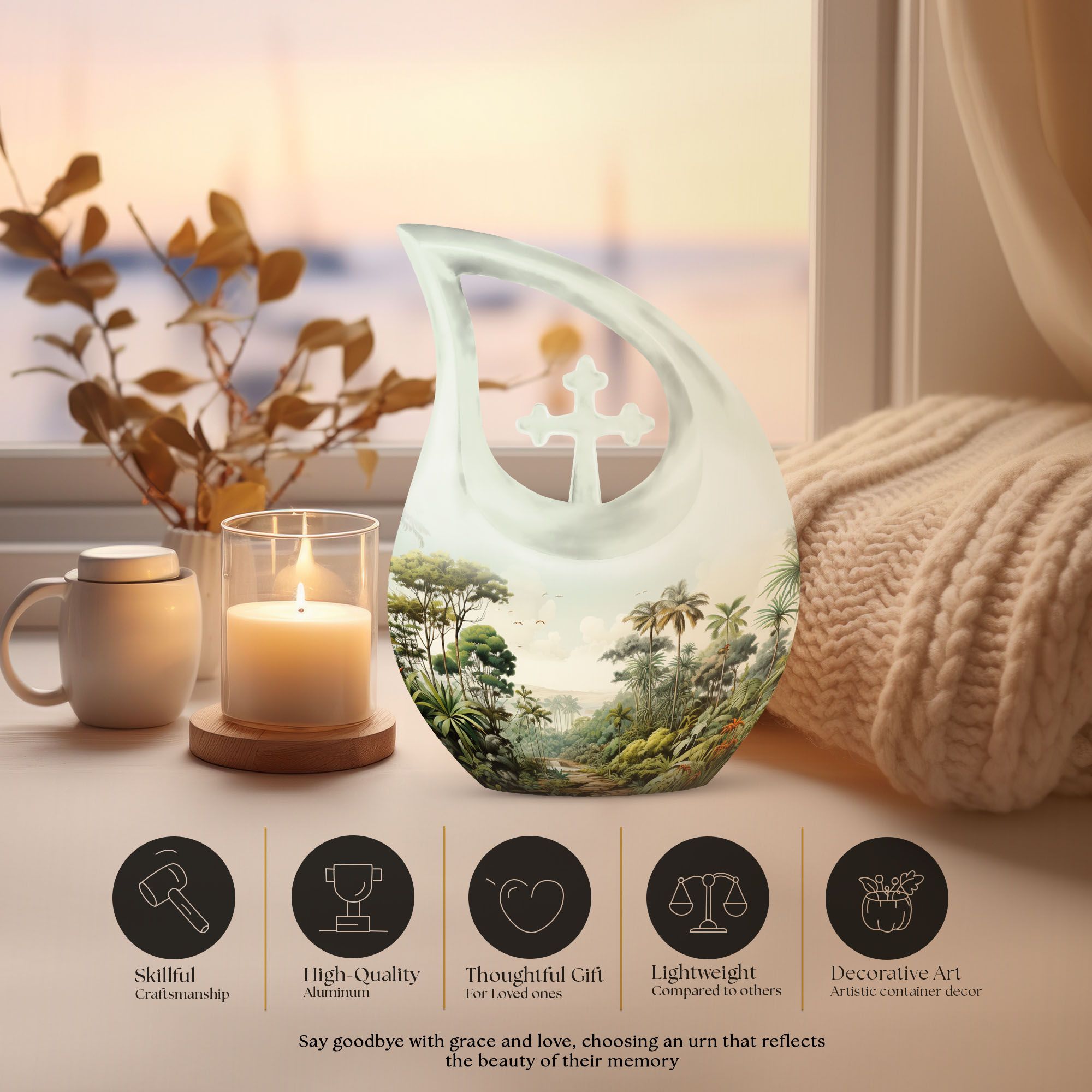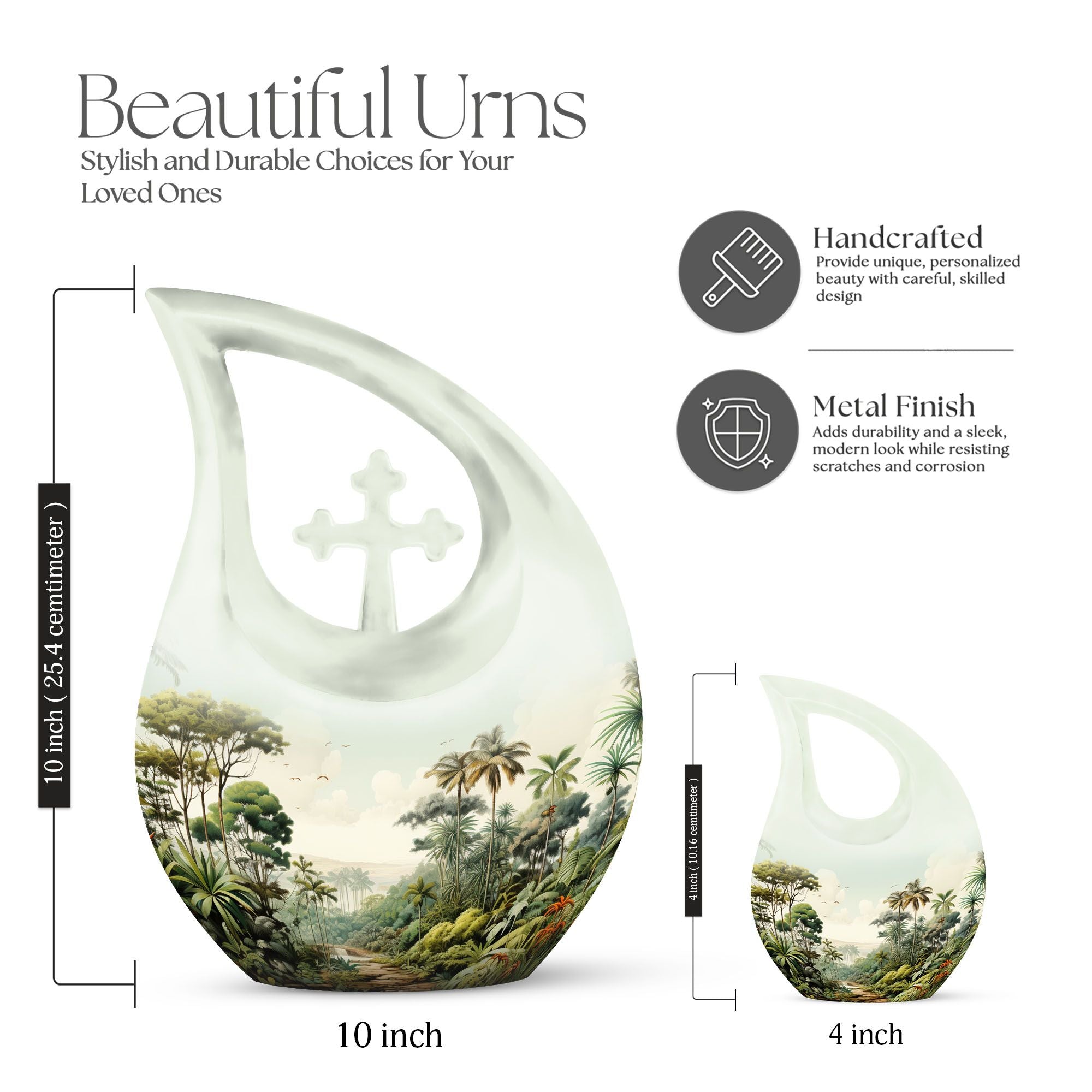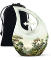 Elevate memorial traditions with our Wilderness Urn - a large cremation container for humans ensuring a dignified and respectful remembrance. Crafted from superior aluminium, this 10-inch large urn emanates strength and durability, weighing in at 3.3 pounds. Echoing the tranquillity of the wilderness and the profound symbolism of the Cross Drop, the design carries poignant significance for your loved ones. Alongside the urn, our package includes an elegant velvet pouch, intended for the safe containment of ashes. The Wilderness Urn graciously holds up to 200 cubic inches of contents, assuring ample space. For a more personal touch, avail our customization service to engrave names onto the urn. Whether you're searching for memorial urns, funeral urns, or cremation ashes keepsakes – our Wilderness Urn offers a respectful and tasteful tribute option for seniors, adults, and families alike.