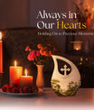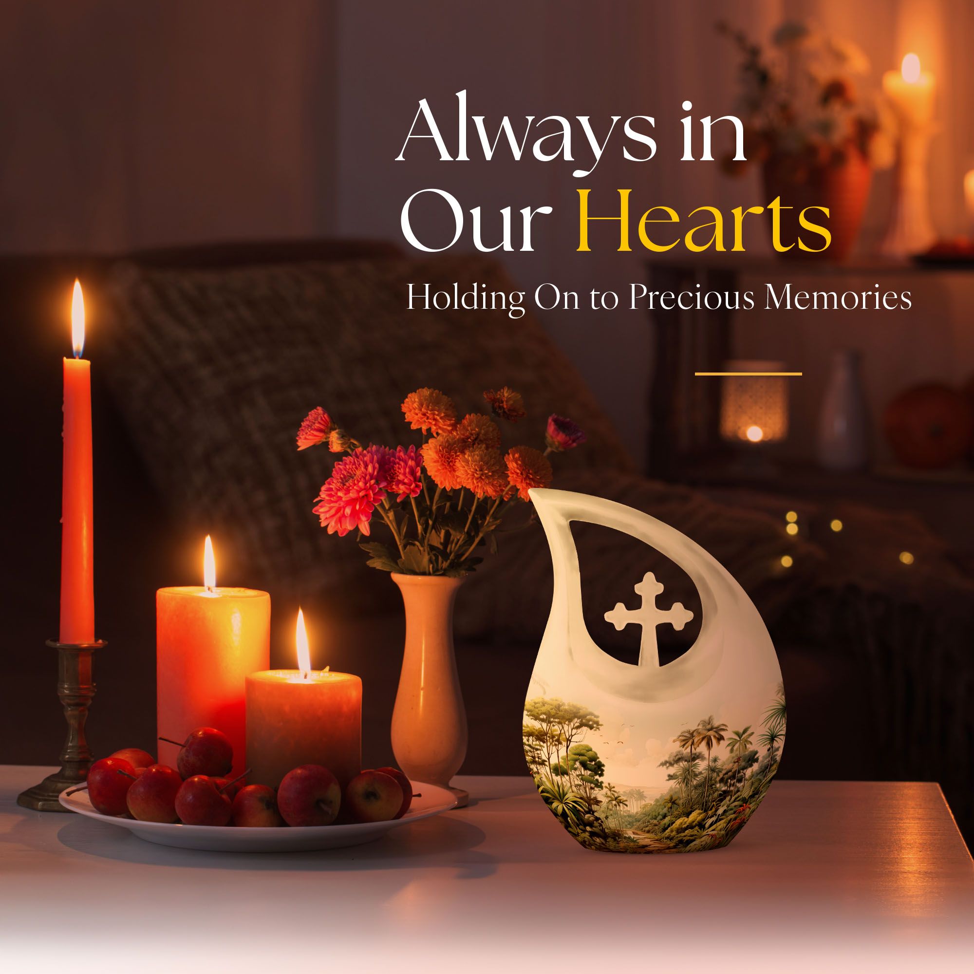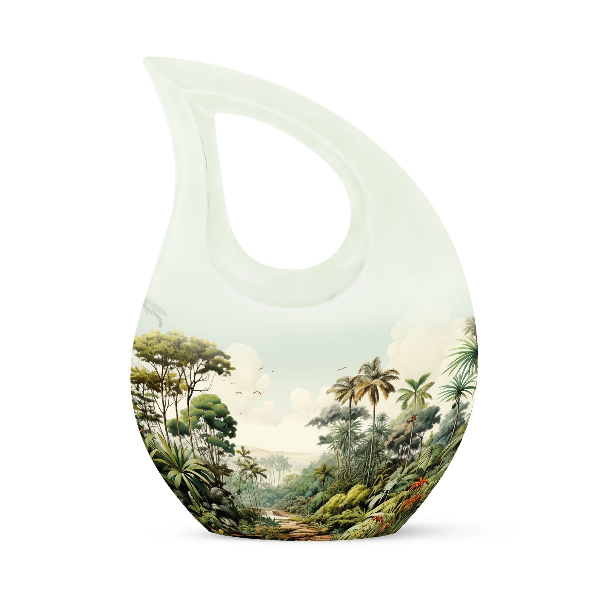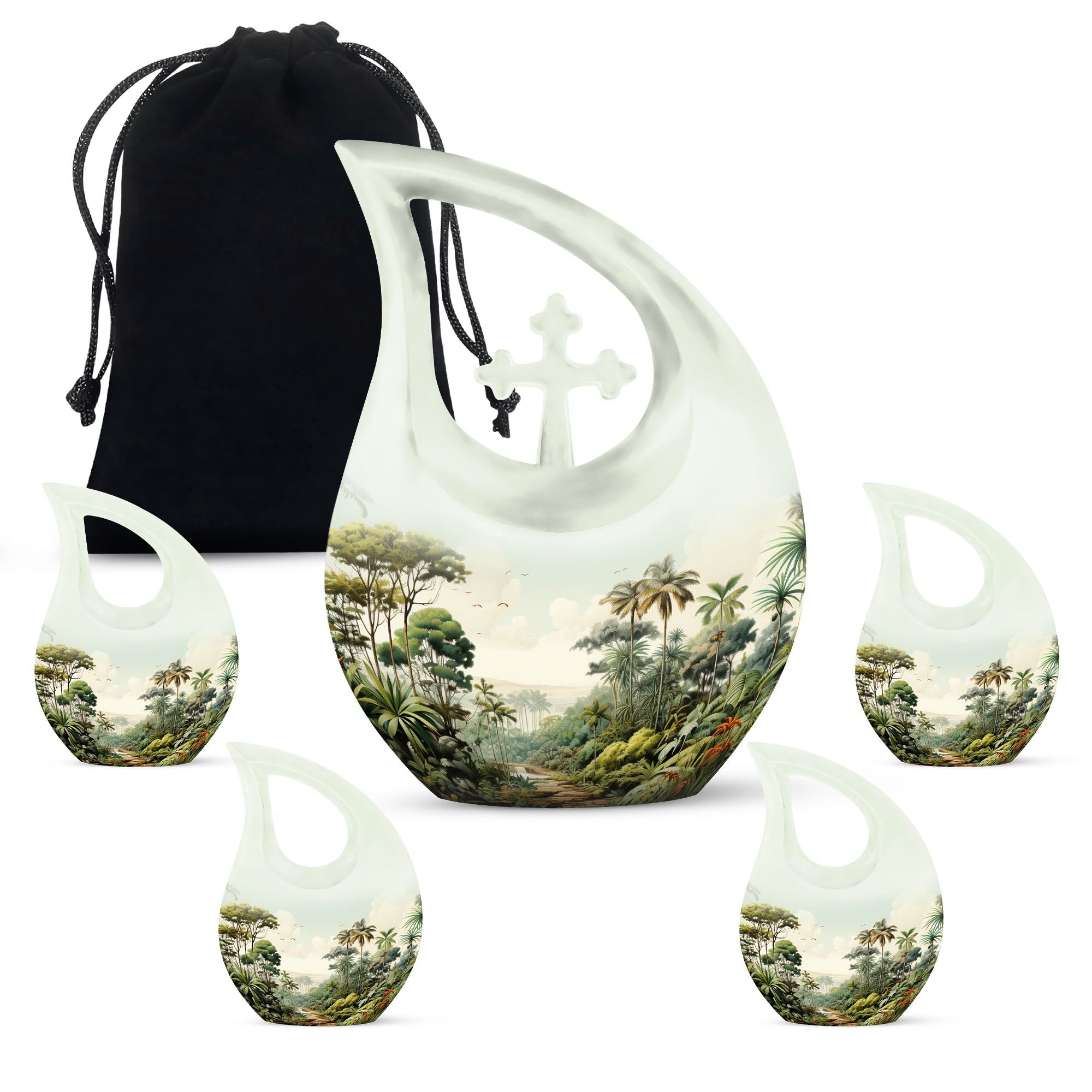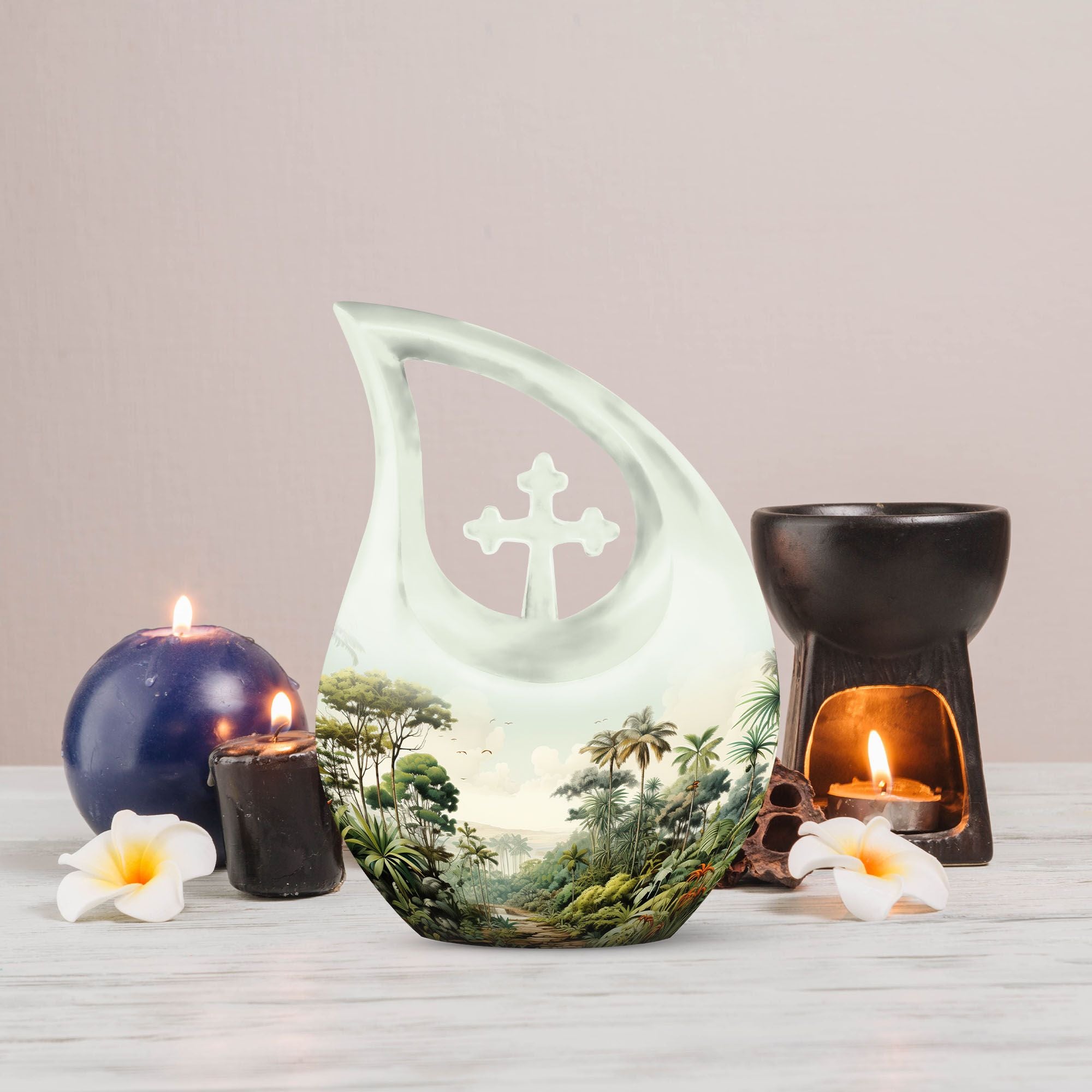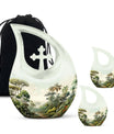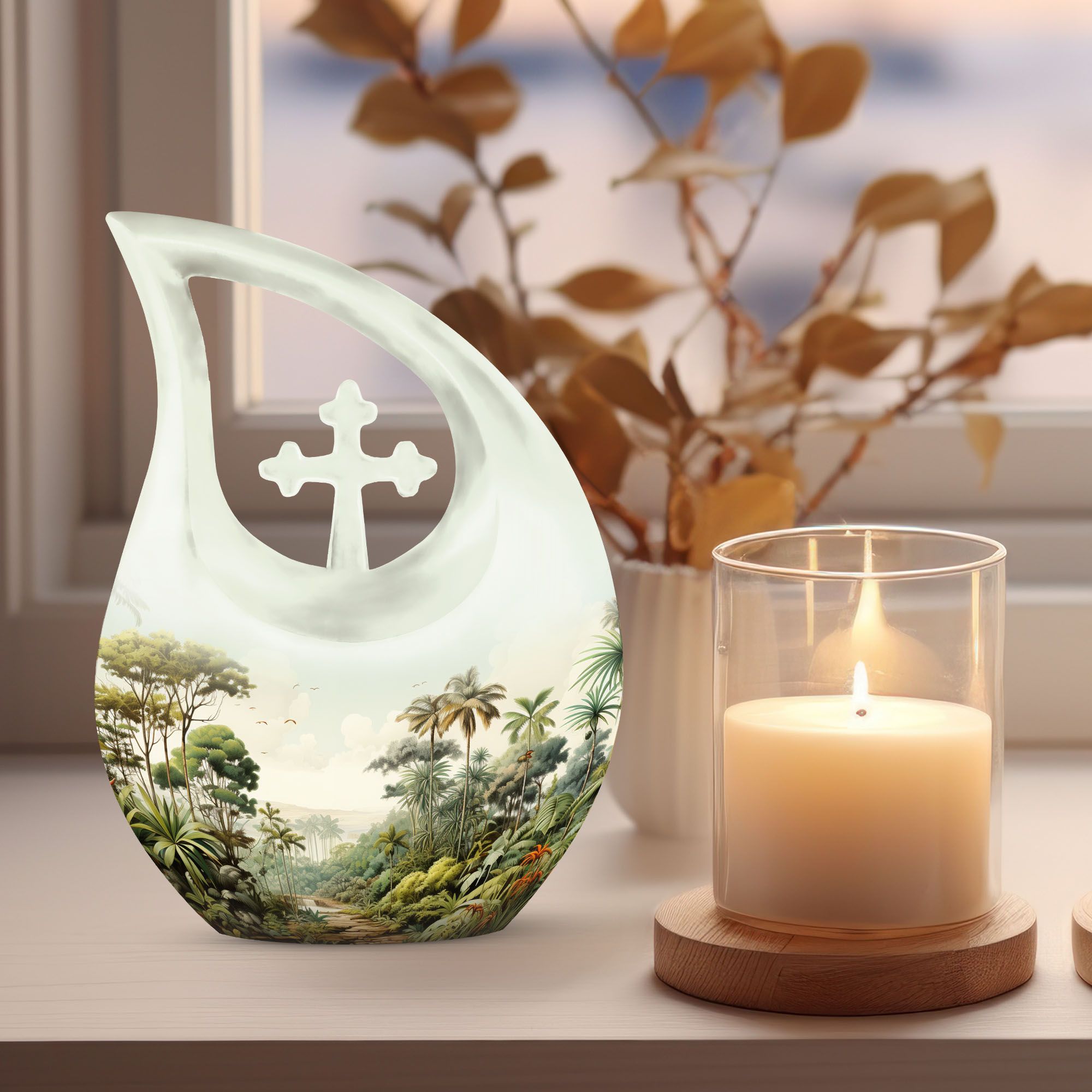 Elevate memorial traditions with our Wilderness Urn - a large cremation container for humans ensuring a dignified and respectful remembrance. Crafted from superior aluminium, this 10-inch large urn emanates strength and durability, weighing in at 3.3 pounds. Echoing the tranquillity of the wilderness and the profound symbolism of the Cross Drop, the design carries poignant significance for your loved ones. Alongside the urn, our package includes an elegant velvet pouch, intended for the safe containment of ashes. The Wilderness Urn graciously holds up to 200 cubic inches of contents, assuring ample space. For a more personal touch, avail our customization service to engrave names onto the urn. Whether you're searching for memorial urns, funeral urns, or cremation ashes keepsakes – our Wilderness Urn offers a respectful and tasteful tribute option for seniors, adults, and families alike.