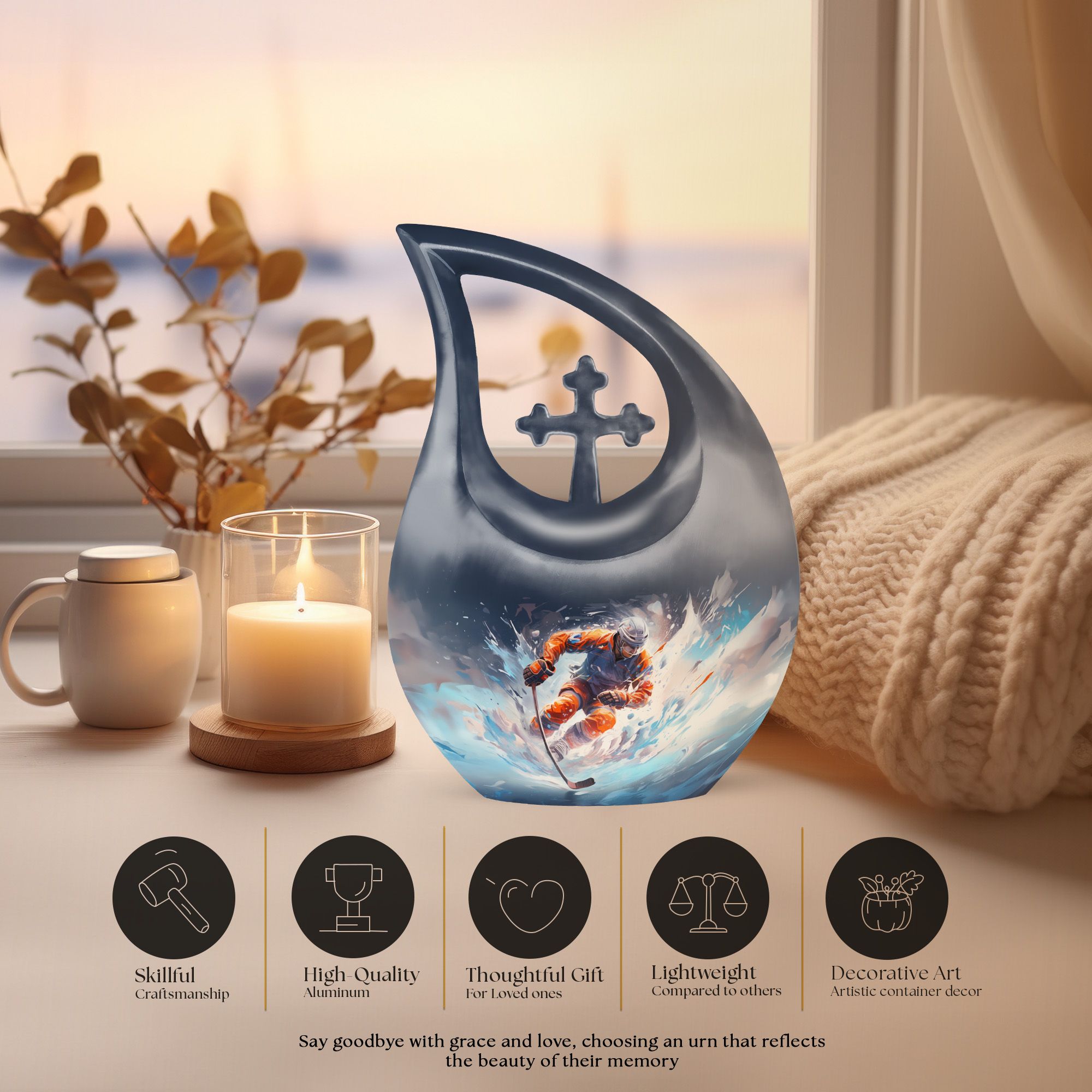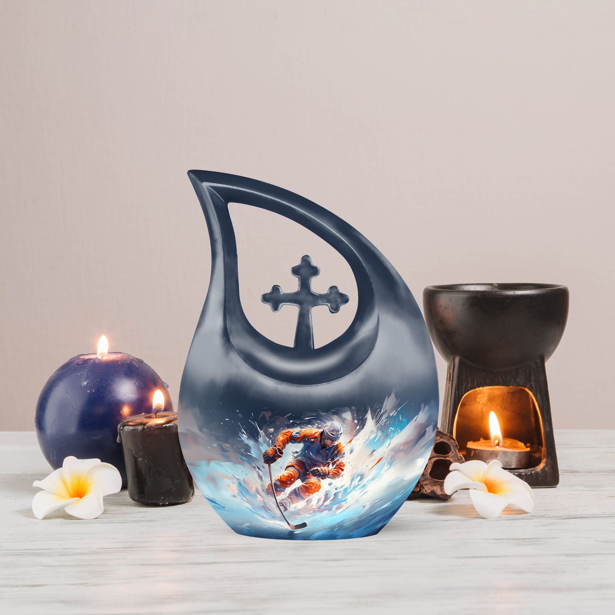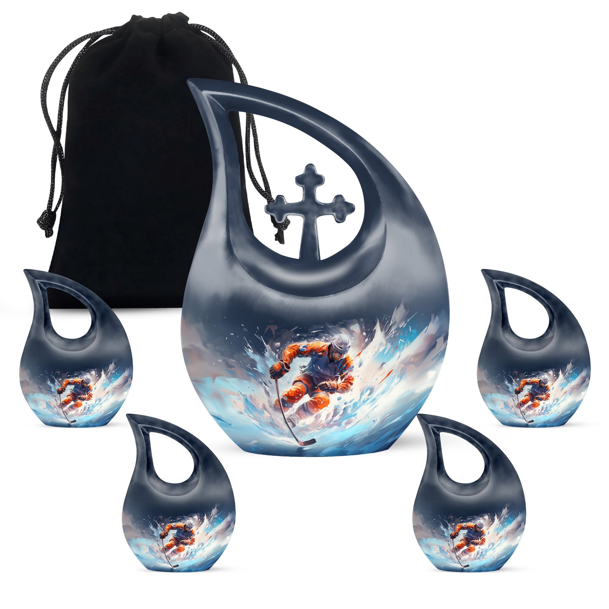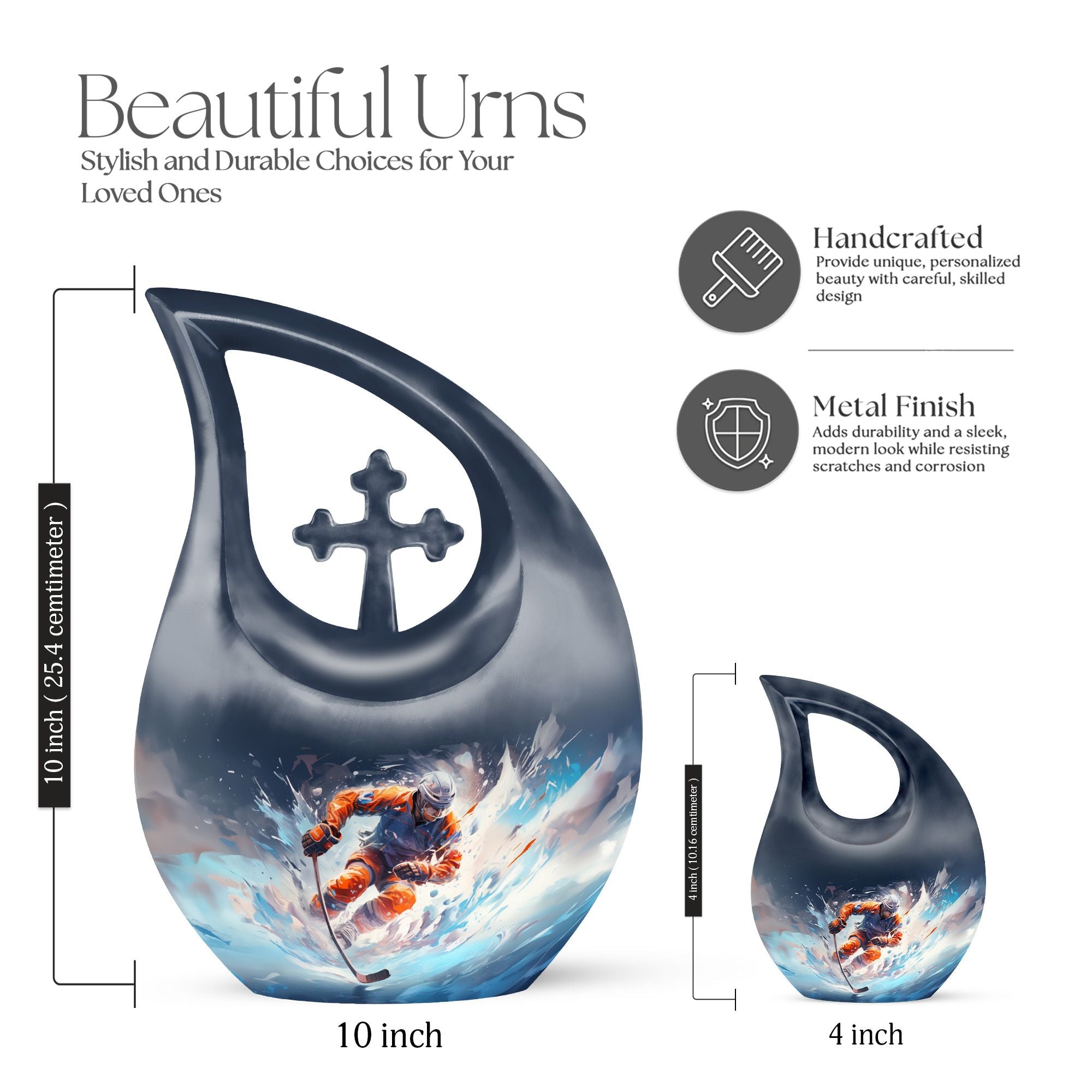 A powerful and meaningful tribute, this Ice Hockey Urn for Cremation Remains honors the passion, courage, and spirit of a loved one who cherished the game. Designed as a large and keepsake urn combo set, it allows families to keep a unified memorial while also sharing cherished memories through matching keepsake pieces. Perfect for those seeking a symbolic human ashes keepsake with a bold sports theme.