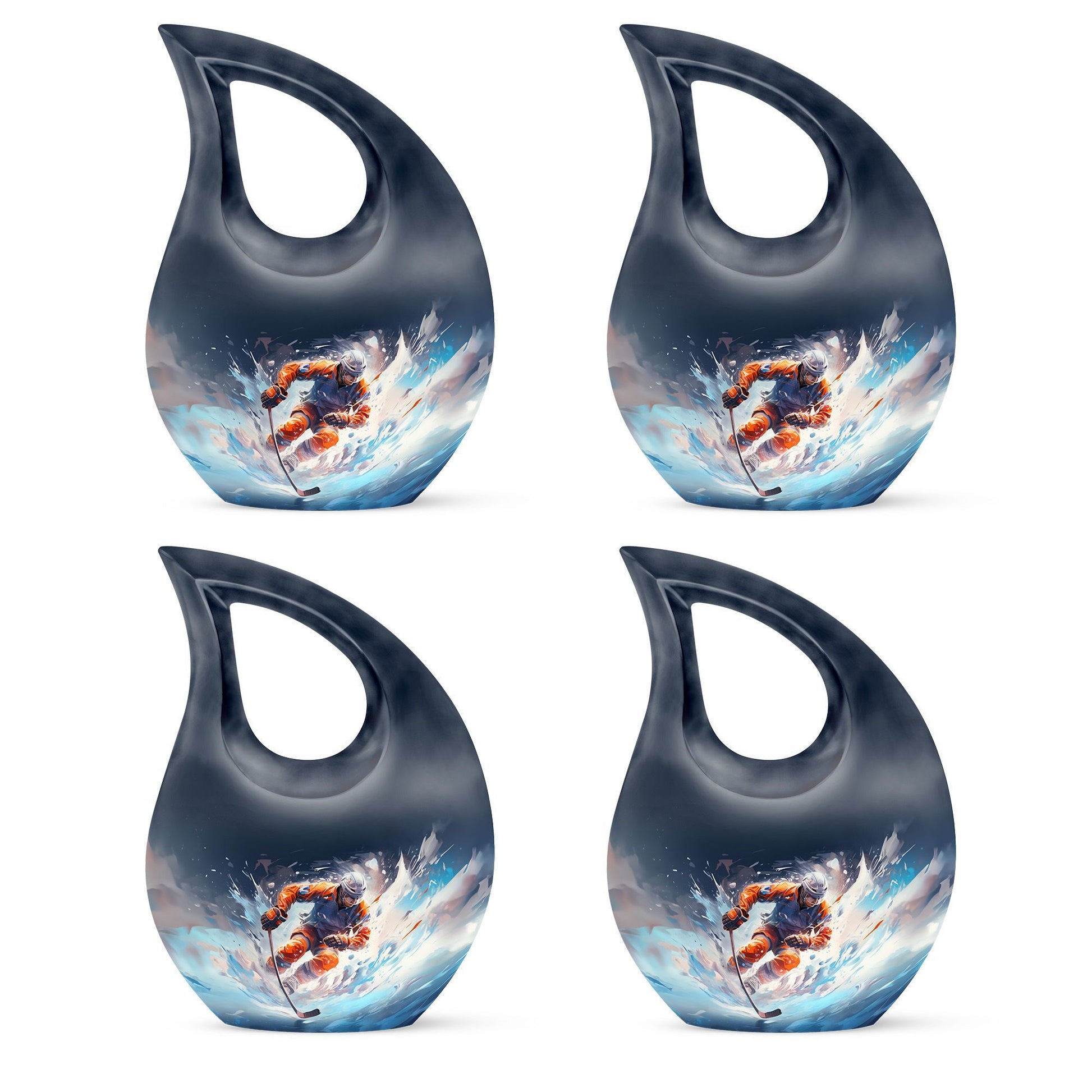 Crafted from durable aluminum, the full-size urn features dynamic ice hockey artwork and a secure screw-top lid for lasting protection. The matching keepsake urns provide a beautiful way to share ashes among family members, ideal for those needing a mini urn for human ashes, mini urn for mom ashes, or a heartfelt memorial ashes keepsake. Each piece in the set complements the others, making it a perfect choice for families wanting cohesive urn keepsakes for ashes, ashes keepsake urn, or decorative keepsakes for ashes.