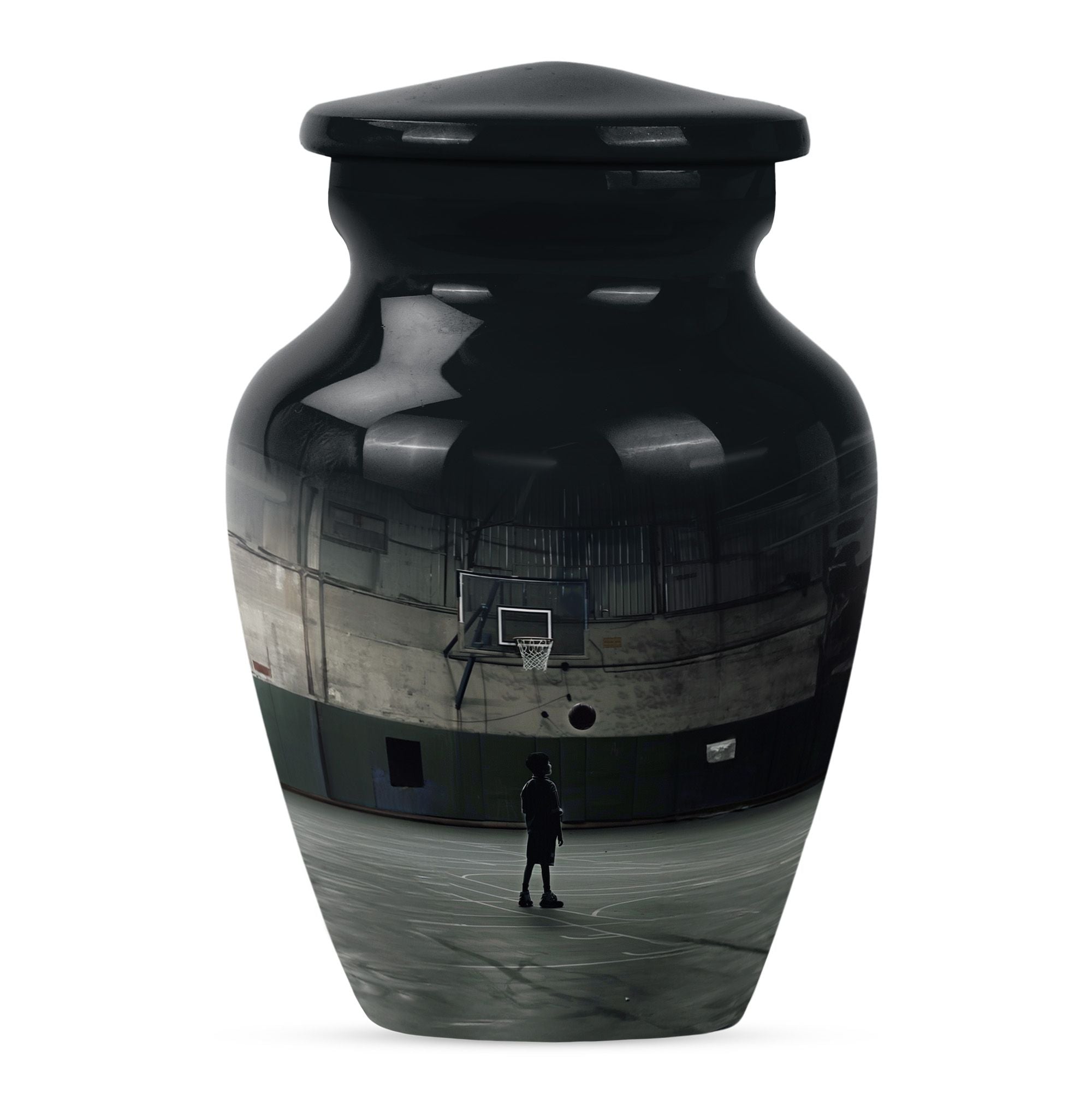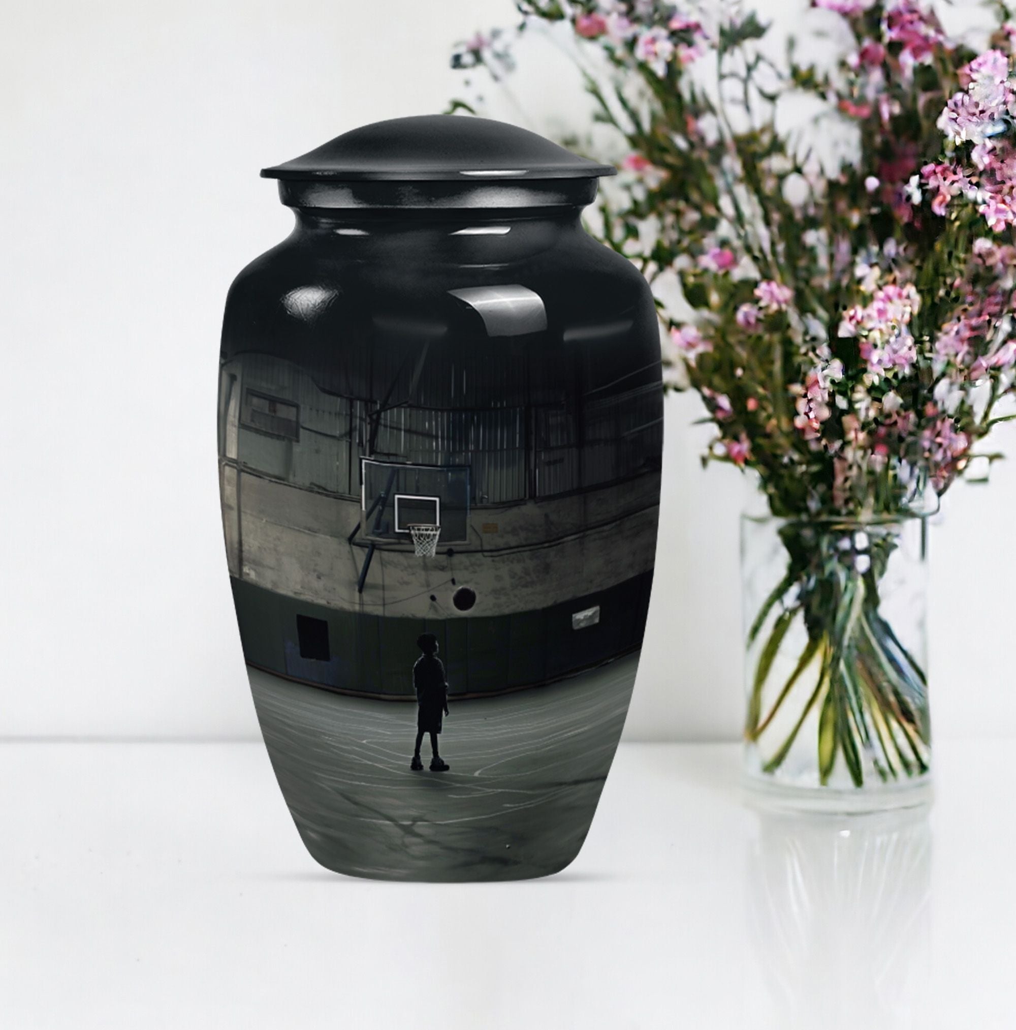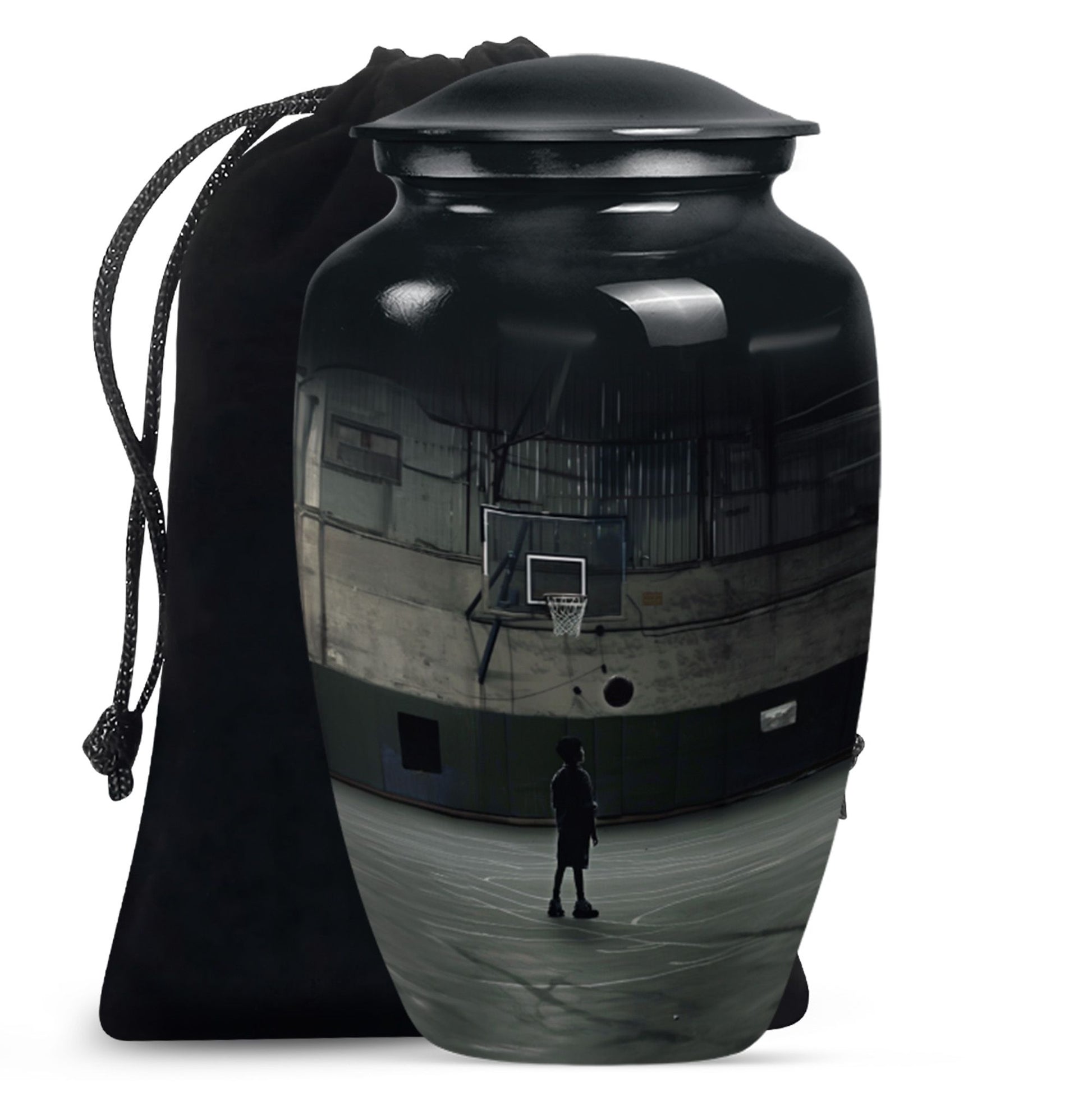 Carry the cherished memory of a man who lived for the court with this abstract-themed, aluminum made, Basketball Cremation Urn. Tailored to fit the 'memorial urns' keyword phrase, this large-sized urn can carry up to 200 cubic inches of cremains securely. Towering at a sturdy 10 inches in height, it has a substantial weight of 3.3 pounds and brings an imposing presence in the room, very much like your loving one did on the basketball playground. You'll receive a velvet pouch that ensures the honorable containment of the cremains with every purchase. Add a personal touch by customizing it with engraved names, making it a monumental tribute to a life well-lived. Remember, it’s not just an urn; it’s a cornerstone linking the love and memories between you and the departed. Among the widely searched 'funeral ashes urns', this one stands out with its unique fusion of the sporty theme with a classic urn shape, distinctly designed for adults and seniors looking for 'cremation urns for men'.