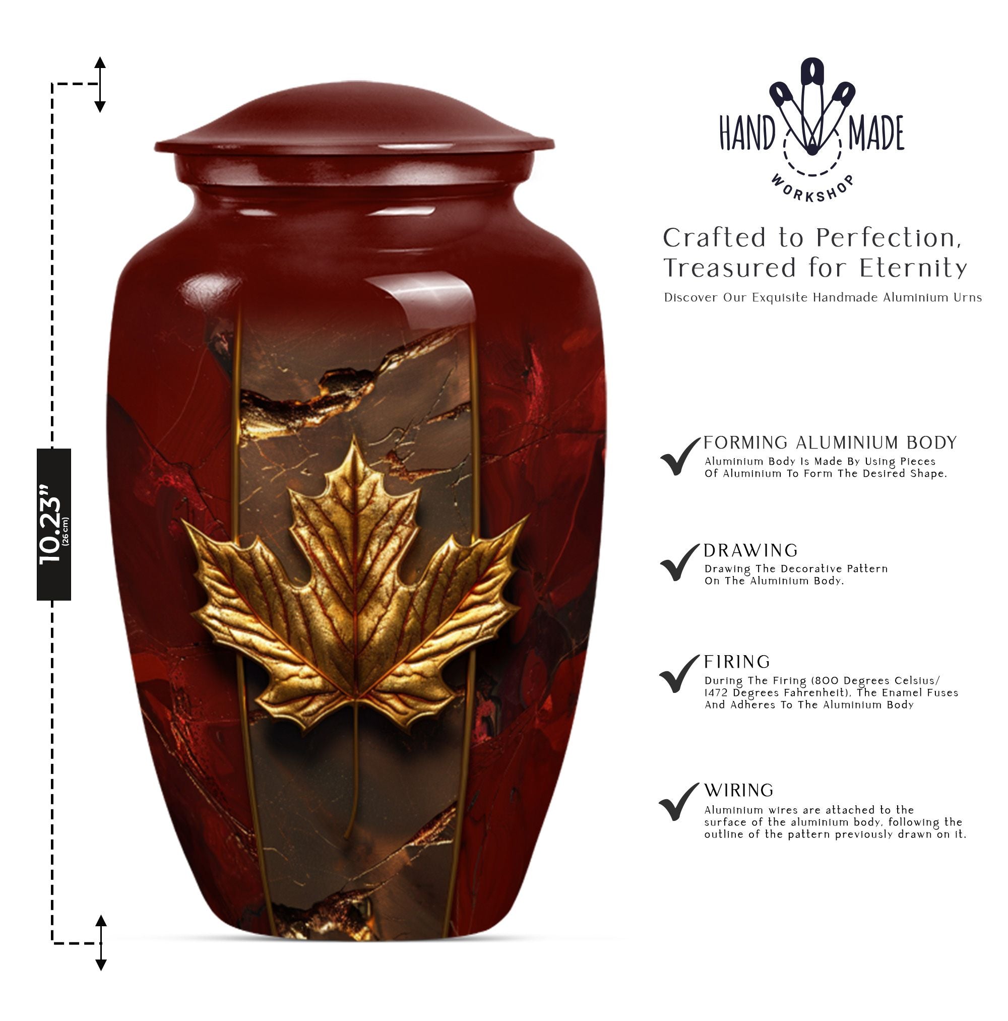 Commemorate the memory of your departed loved ones with our magnificent Mapple Leaf Memorial Urn. A tangible symbol of remembrance, this large urn, sized at 10 inches, has been specifically catered towards male adults but can truly be appropriate for any gender. Made of sturdy aluminium, the urn is designed to maintain its durability, weighing in at 3.3 pounds. It features an intricate flower theme on the exterior, evoking some of nature’s purest and most beautiful elements. The urn has a considerable capacity of 200 cubic inches, ensuring every memory will have its place. Your package will also include a velvet pouch. Intended for containment of ashes, it manifests respect and sensitivity towards your precious keepsake. Personalize this classic urn with the engraved names of your choice as a special touch. Also, a wonderful addition for those searching for female urns, companion urns for two adults, or even large metal urns for ashes. Our product is a heartfelt way to honor and cherish your beloved.