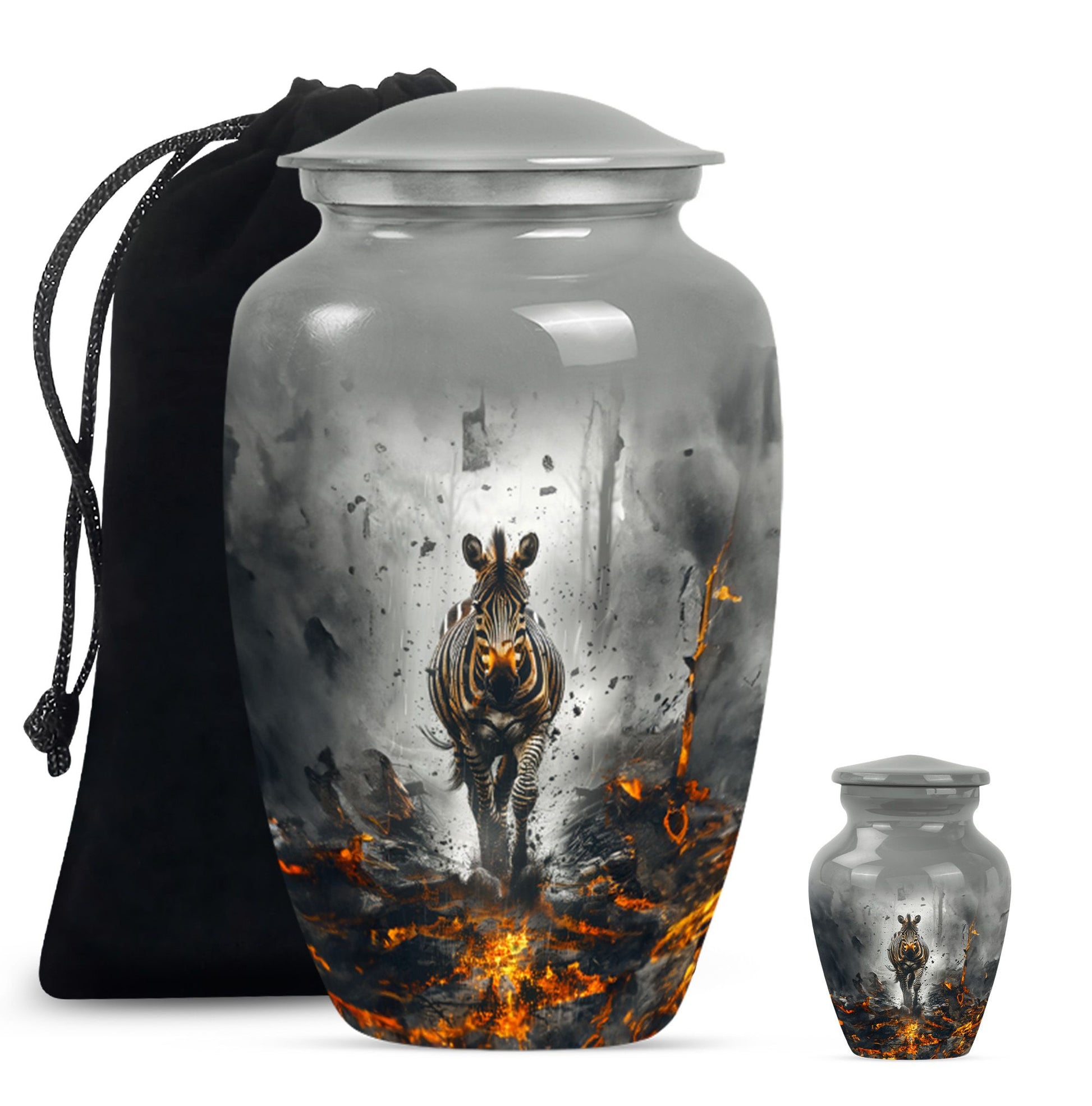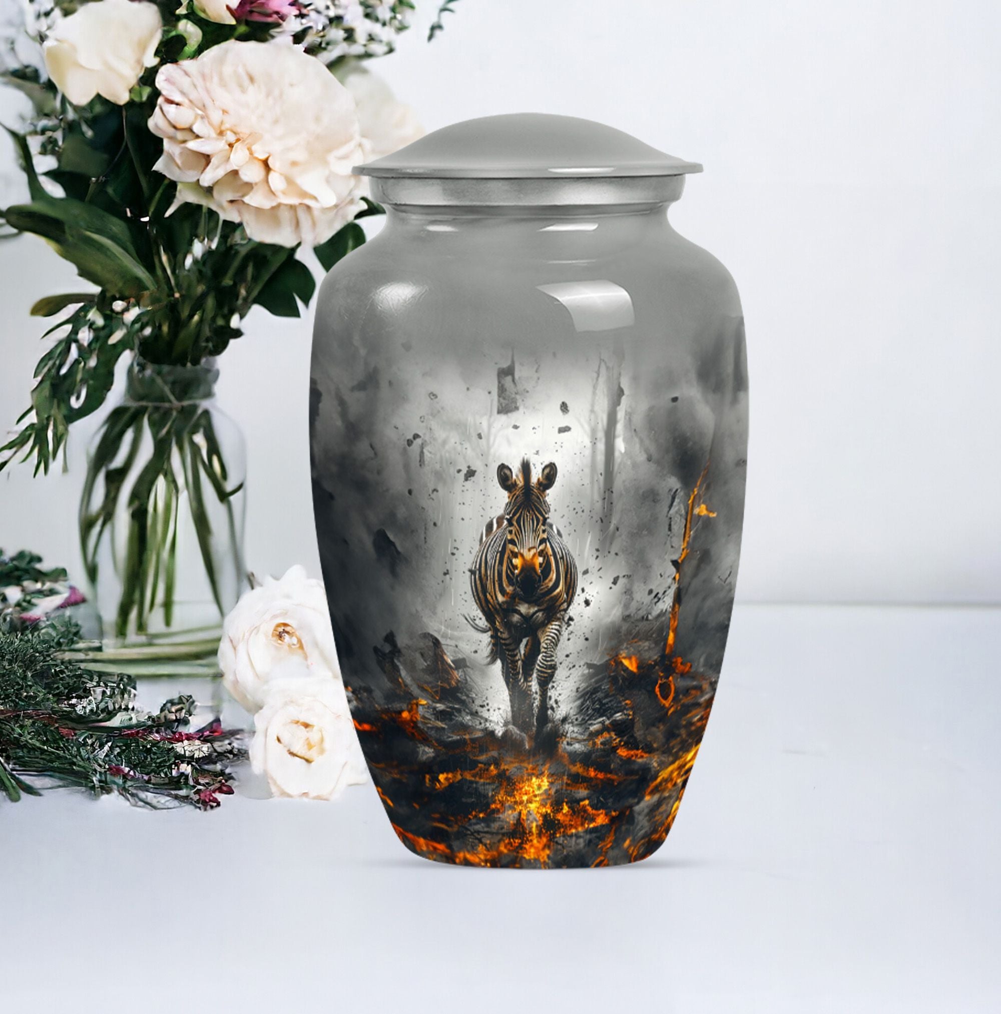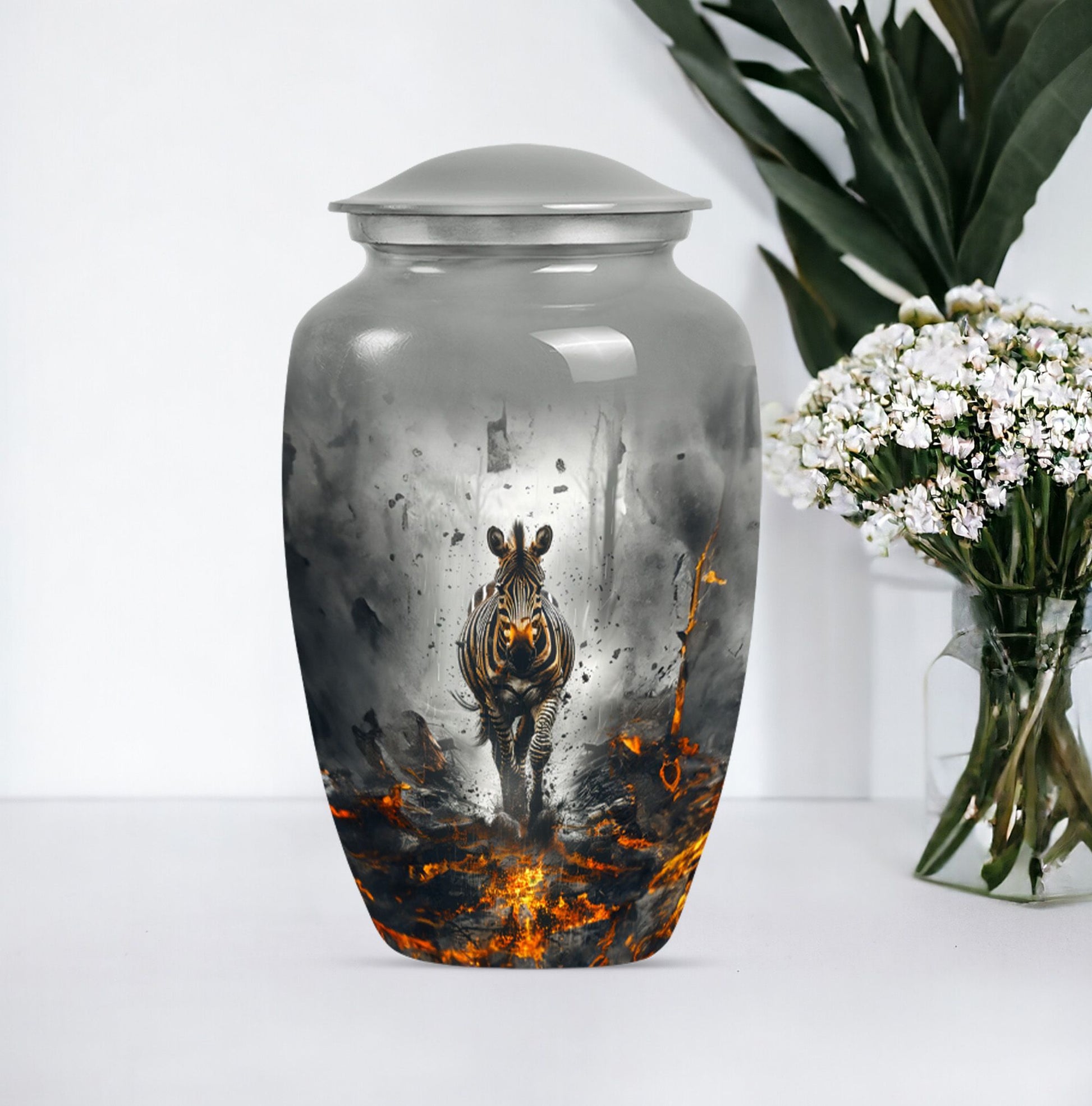 Highlight your love for your departed loved ones with our large abstract Zebra Memorial Urn. Beautifully crafted from top-of-the-line aluminium, this abstract-themed urn provides a dignified tribute to the adult female and offers a thoughtful way to remember the memories shared. With a standing height of 10 inches and capacity of 200 cubic inches, this urn comfortably contains the ashes. The urn weighs a sturdy 3.3 pounds and ensures long-term preservation. Personalize this classic urn with engraved names to give a unique touch to your memento. The package comes with a velvet pouch for secure containment of ashes. Besides memorial urns for human ashes adult female, this product also suits needs for funeral urns for human ashes adult man, providing a sacred option among cremation urns for funerals. Embrace your affection for your loved one with this valuable keepsake. Remember, caring is the greatest act of love.