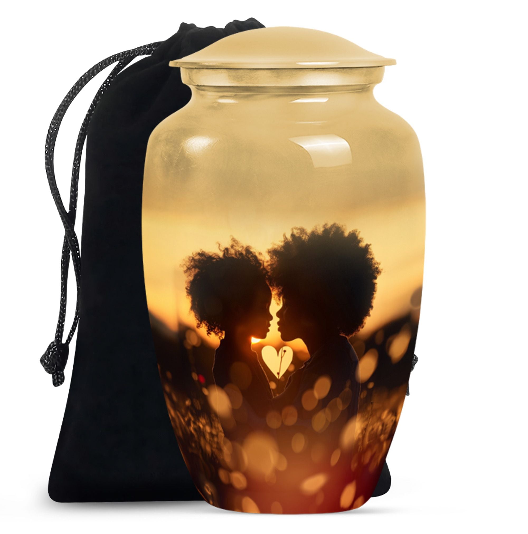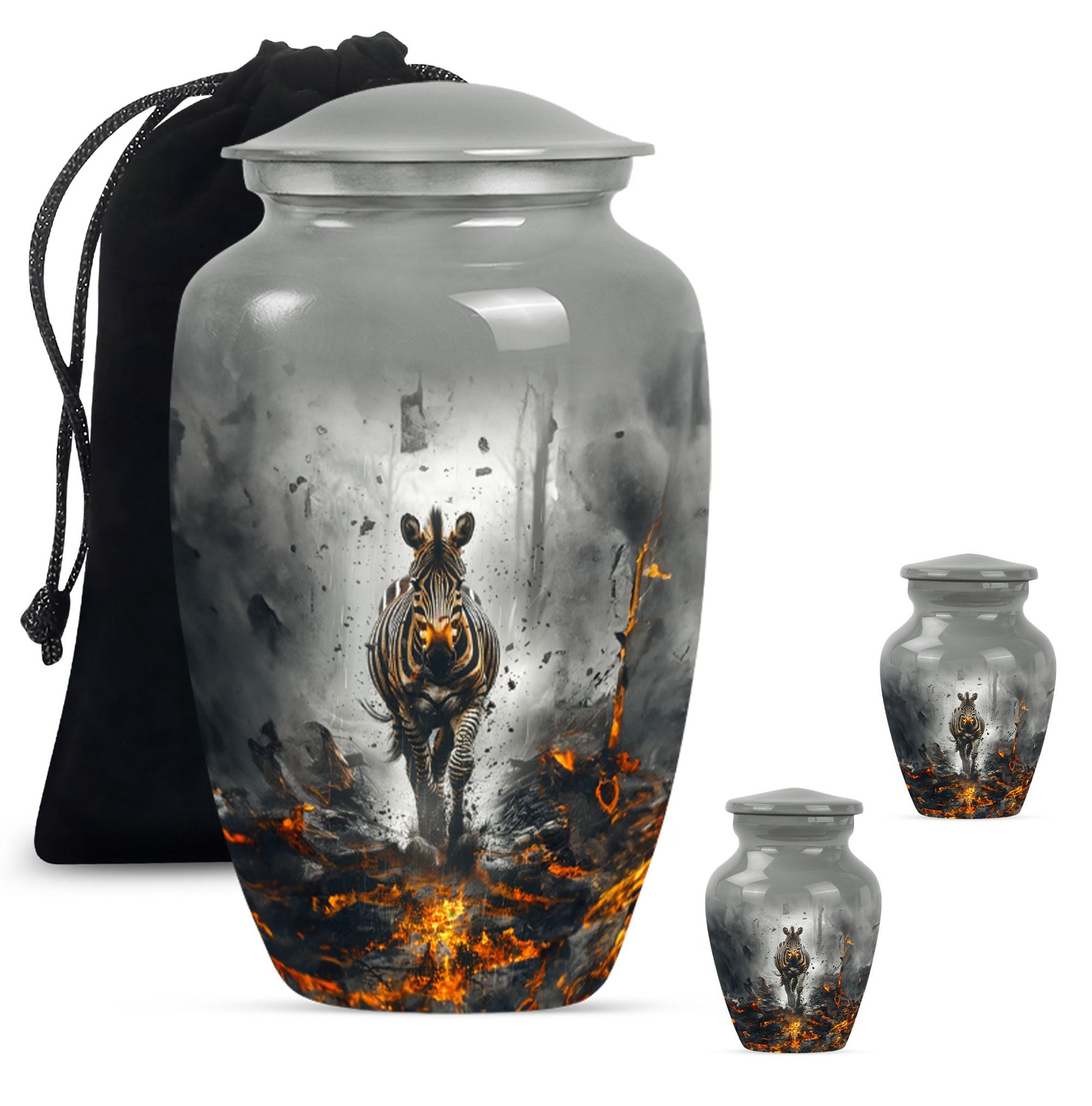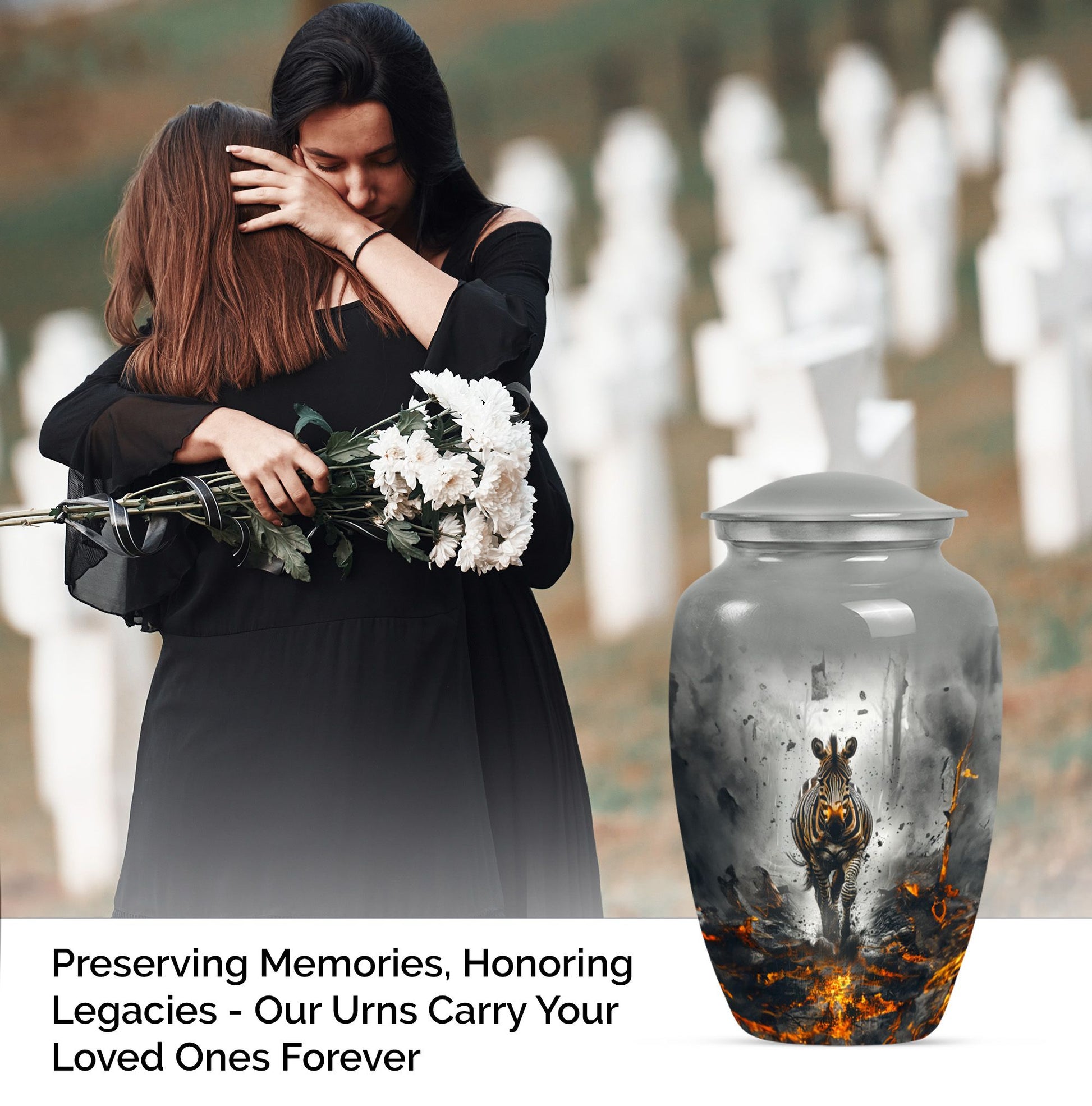 Highlight your love for your departed loved ones with our large abstract Zebra Memorial Urn. Beautifully crafted from top-of-the-line aluminium, this abstract-themed urn provides a dignified tribute to the adult female and offers a thoughtful way to remember the memories shared. With a standing height of 10 inches and capacity of 200 cubic inches, this urn comfortably contains the ashes. The urn weighs a sturdy 3.3 pounds and ensures long-term preservation. Personalize this classic urn with engraved names to give a unique touch to your memento. The package comes with a velvet pouch for secure containment of ashes. Besides memorial urns for human ashes adult female, this product also suits needs for funeral urns for human ashes adult man, providing a sacred option among cremation urns for funerals. Embrace your affection for your loved one with this valuable keepsake. Remember, caring is the greatest act of love.