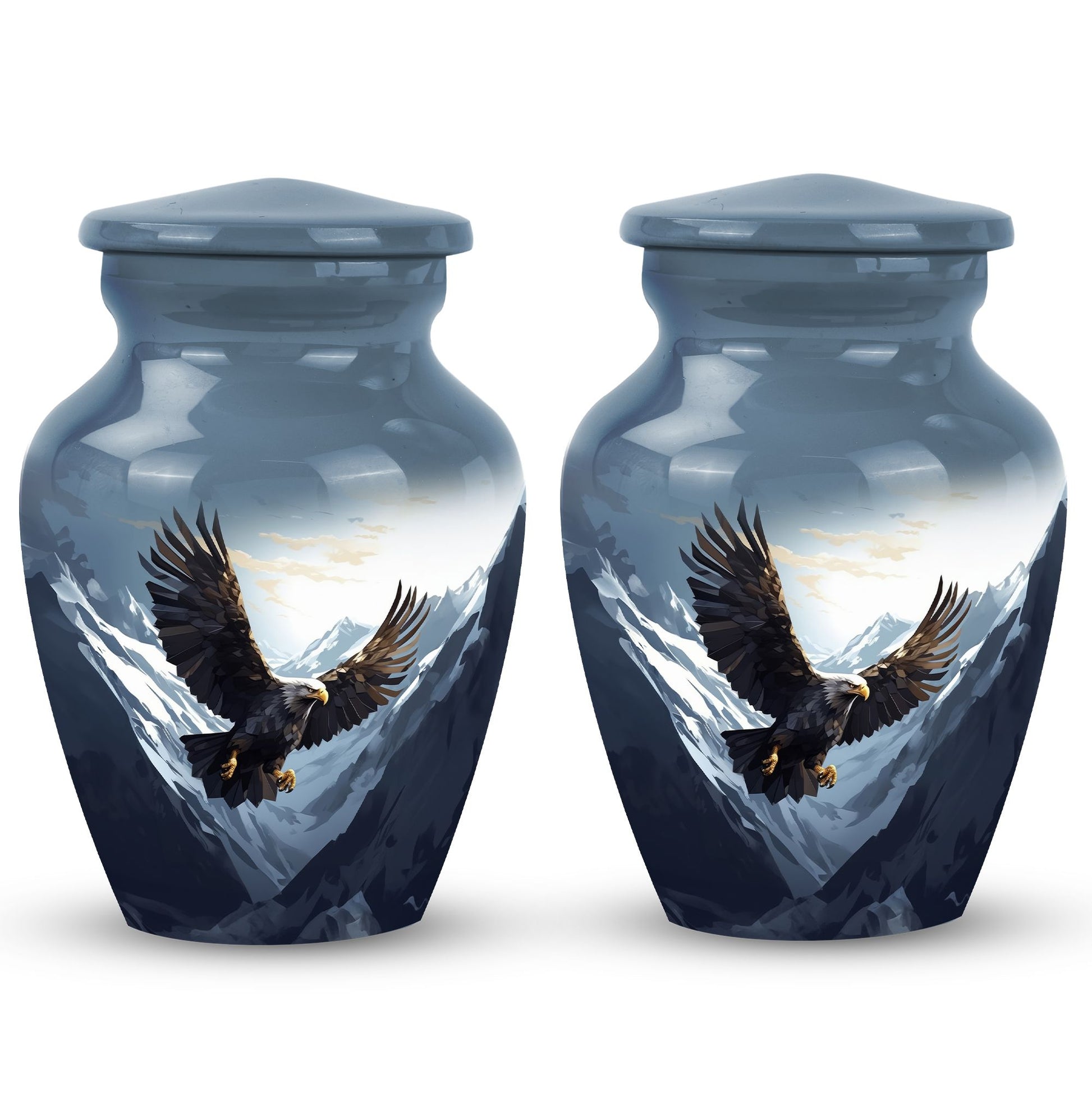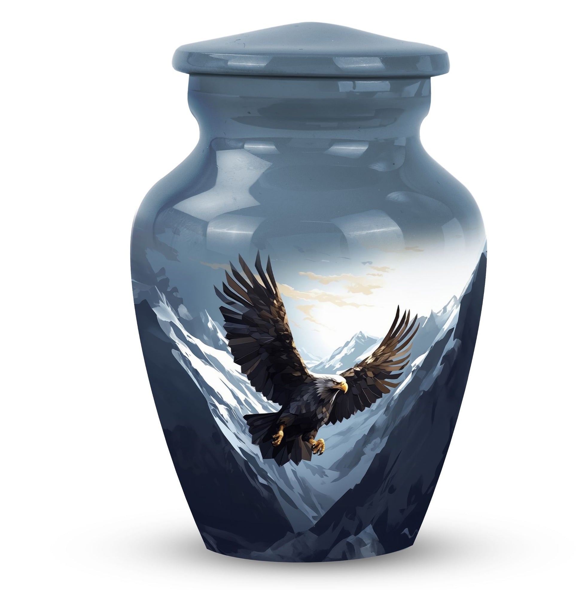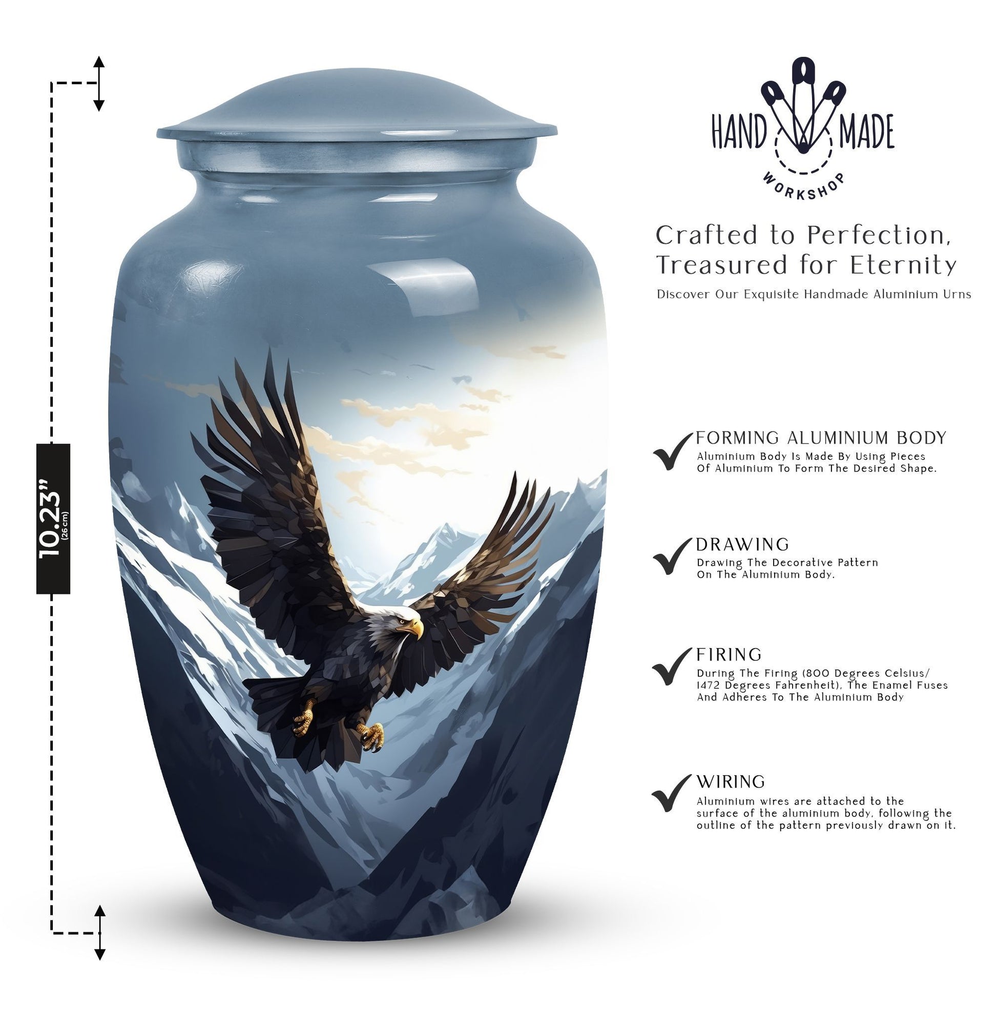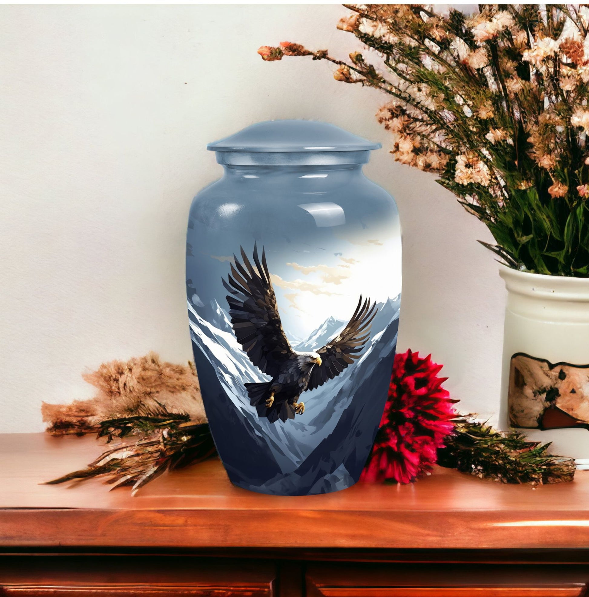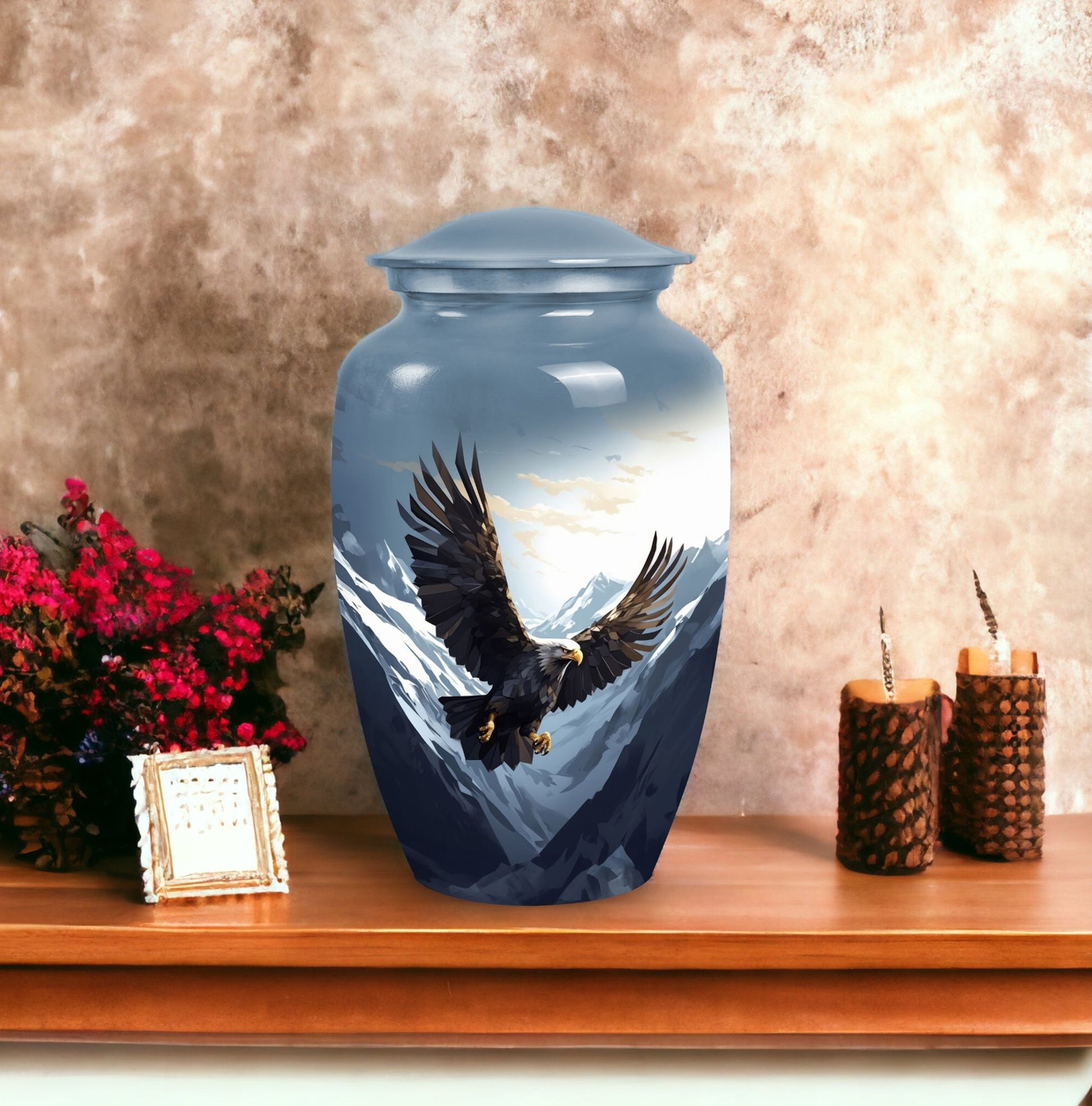 Cherish your loved ones forever with our Flying Eagle Urns for Human Ashes. Expertly crafted in the large urn type, this 3 Inch urn is perfect for preserving memories. Its classic urn design, handcrafted in high-quality aluminum, ensures a timeless touch to your memorial. Weighing in at 3.3 pounds and standing 10 inches tall, it has ample capacity to securely hold up to 200 cubic inches of ashes. Each purchase of our urn comes with a luxurious velvet pouch that carefully encapsulates and respects the importance of its contents. Add a personal touch of love through our customization offer - you can engrave names on it to pay a fitting tribute to the decedent. Our urns are not just a storage solution, but a cherished token of remembrance. This product finds its match in those searching for urns for ashes for adults or specifically urns for Men’s ashes. Embrace a lasting means of remembering your loved ones with our distinct, unparalleled cremation urn.