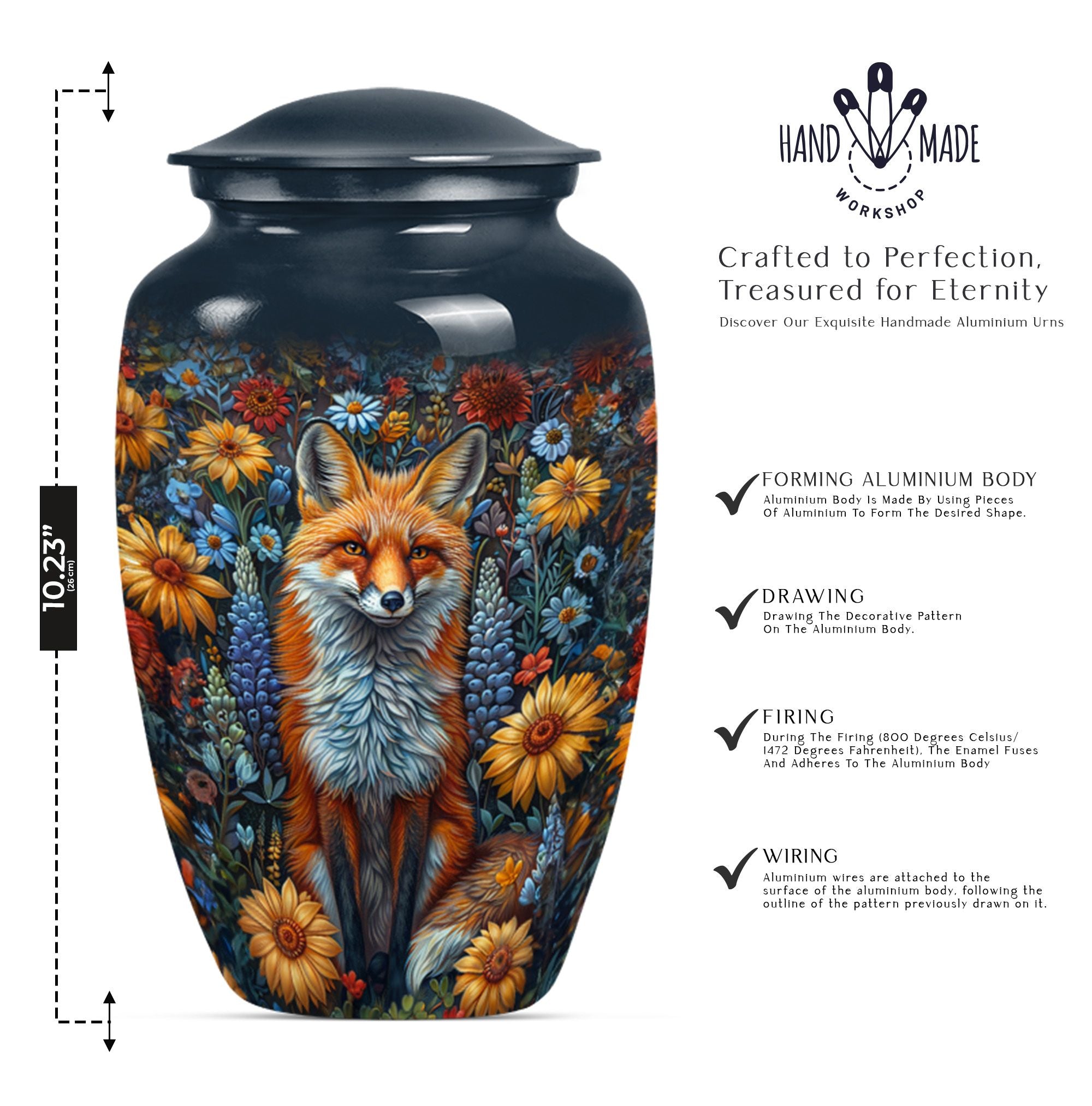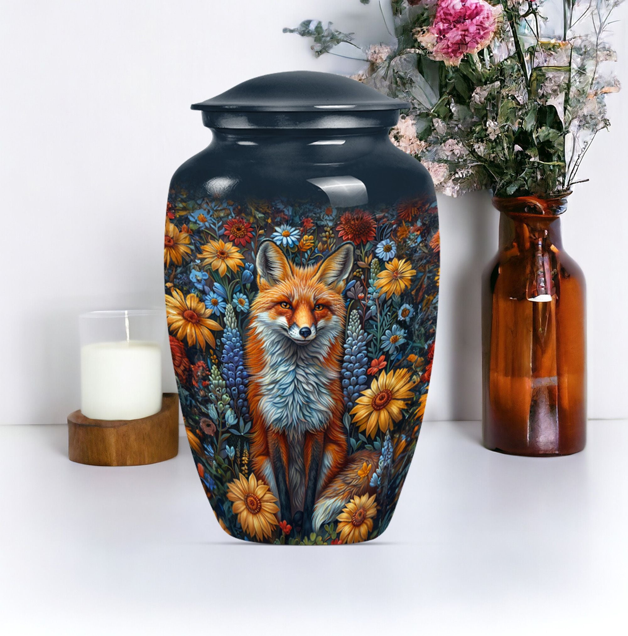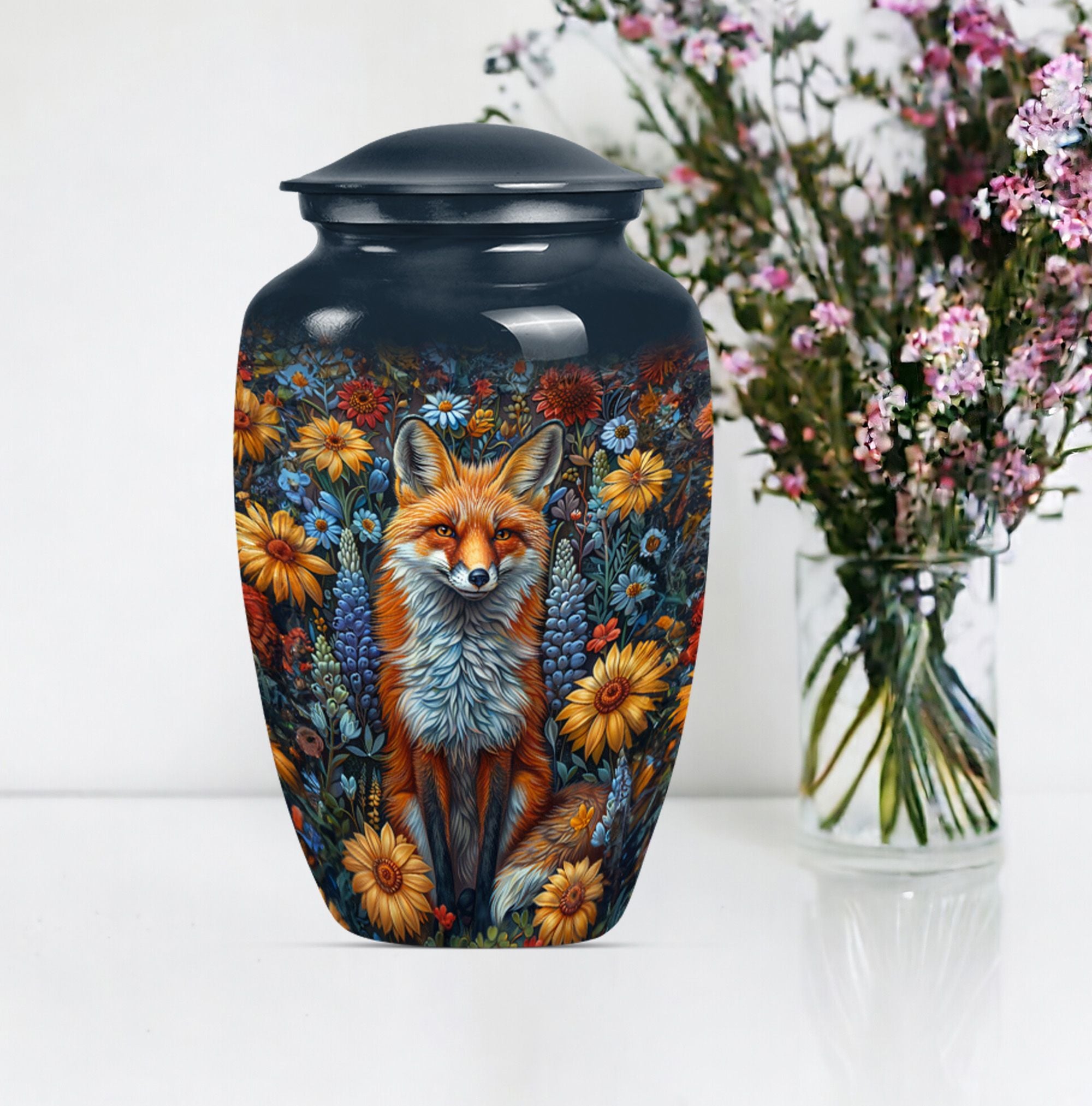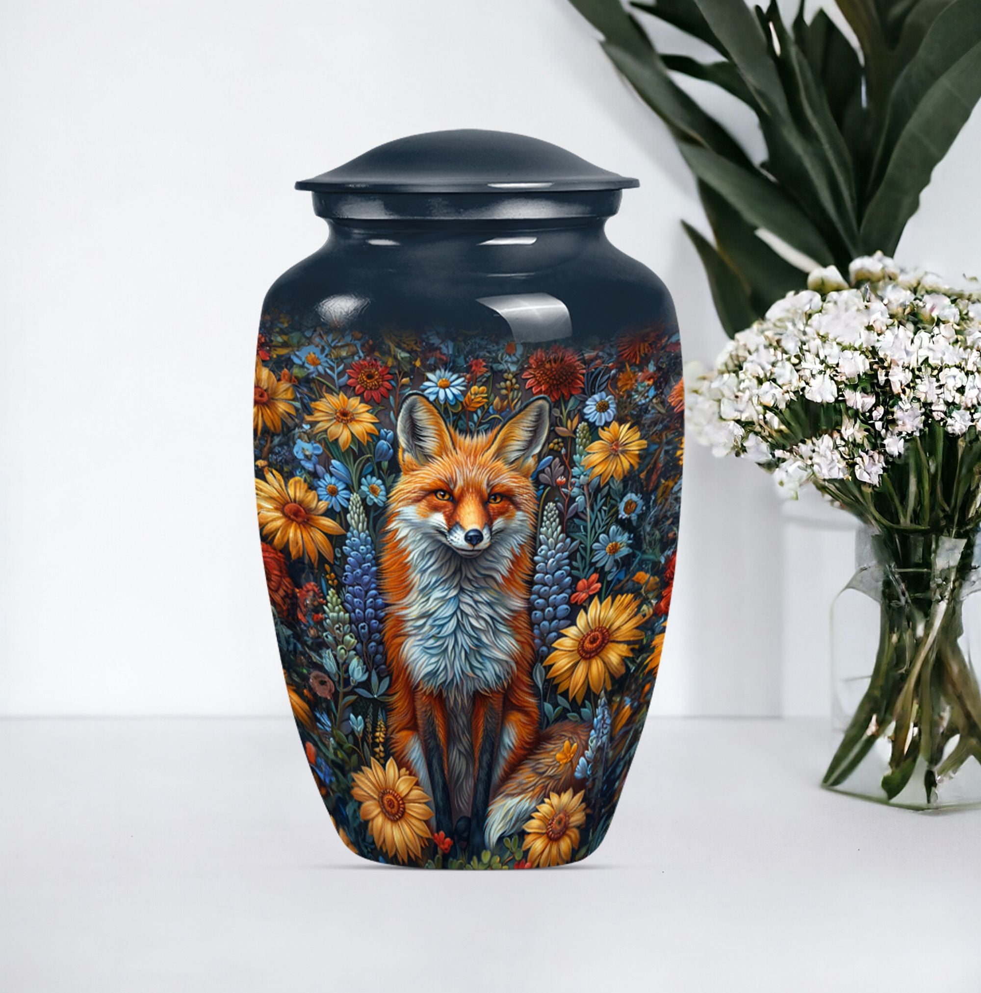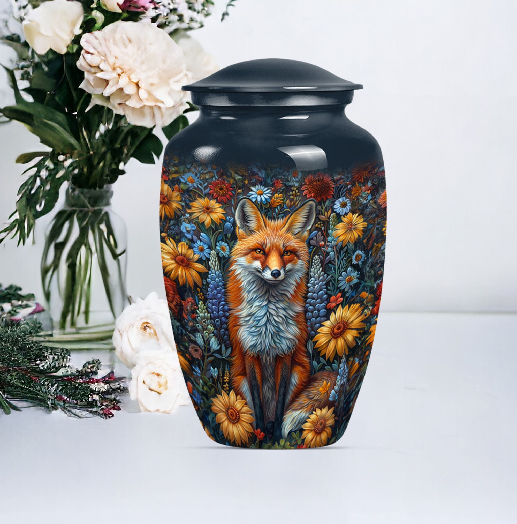 This masterfully designed fox urn, designed specifically for treasured loved ones and sized at a generous 10 inches, is an ideal selection for those seeking memorial urns for adult female ashes. This urn flaunts a timeless, classic design themed with delicate butterflies - a symbol of rebirth and transformation, taking it beyond a simple cremation urn. Crafted from durable aluminium, it carries a comforting weight of 3.3 pounds, and the interior is spacious enough to hold 200 cubic inches of ashes securely. Customize it further by personalizing it with engraved names of your beloved ones, invoking cherished memories with every glance. The urn also includes a velvet pouch for secure containment and respectful carrying of the ashes. Ideal for those in search of funeral urns for adult ashes men and as a tastefully shaped jar for keepsakes. This large urn melds both aesthetic beauty and meaningful purpose, creating a lasting homage to departed loved ones.