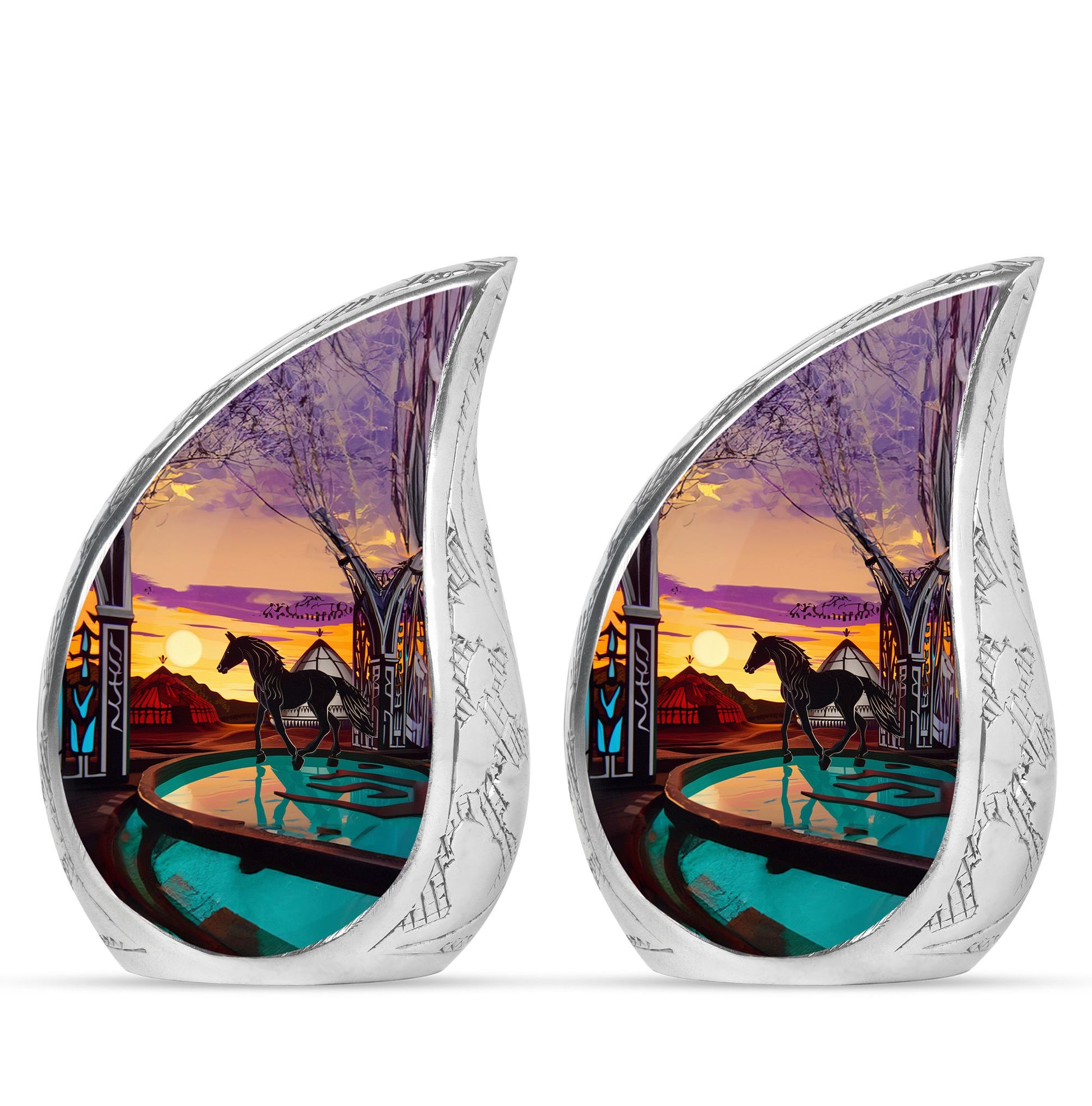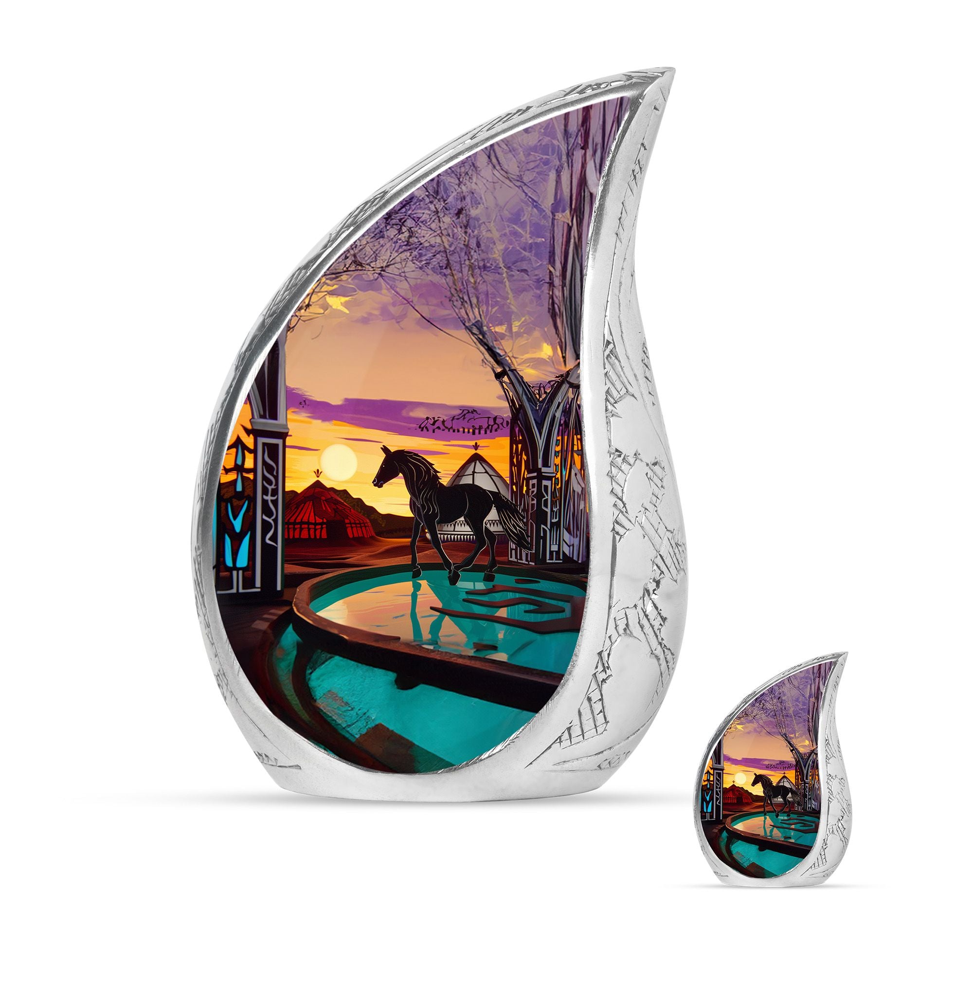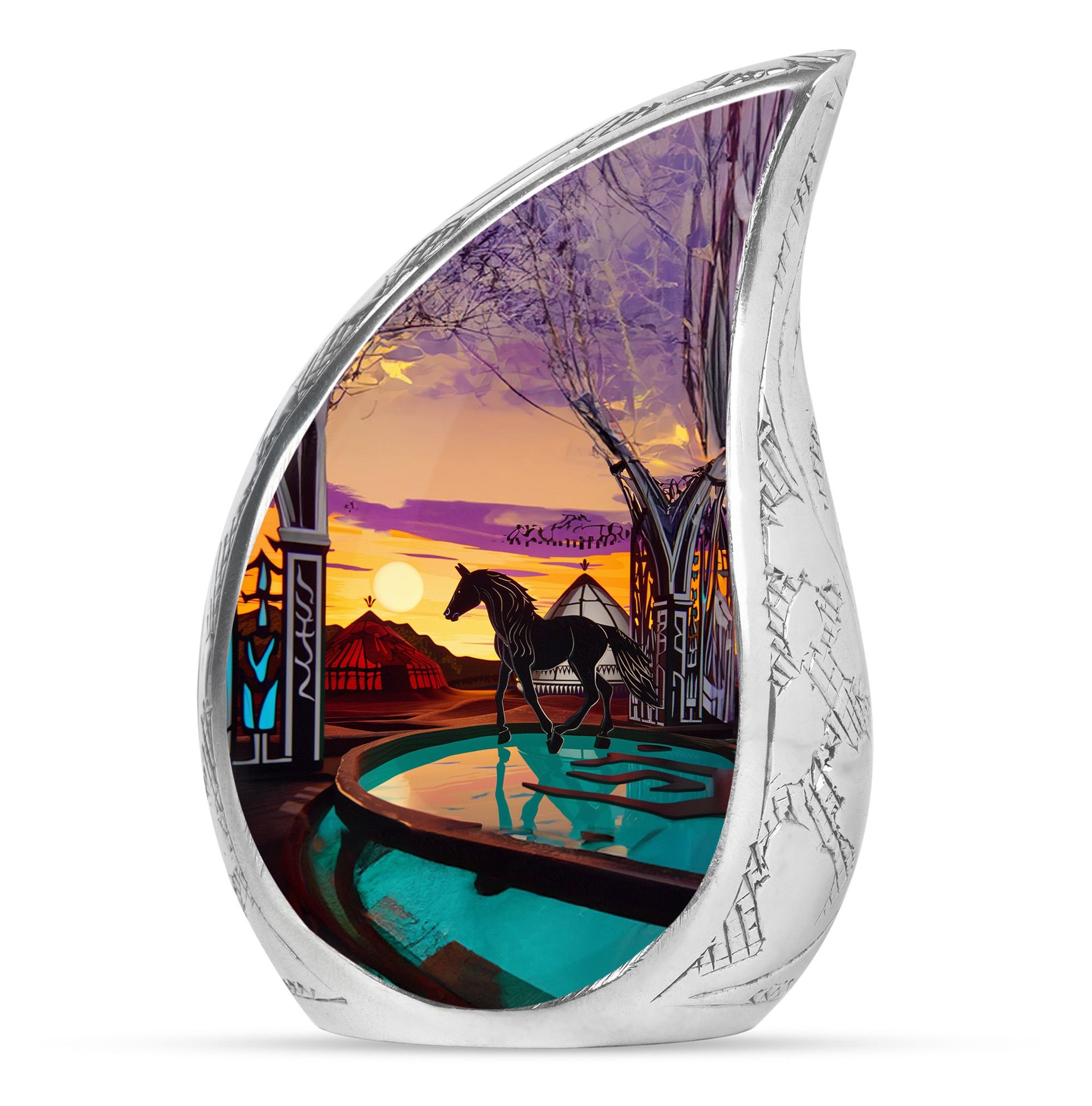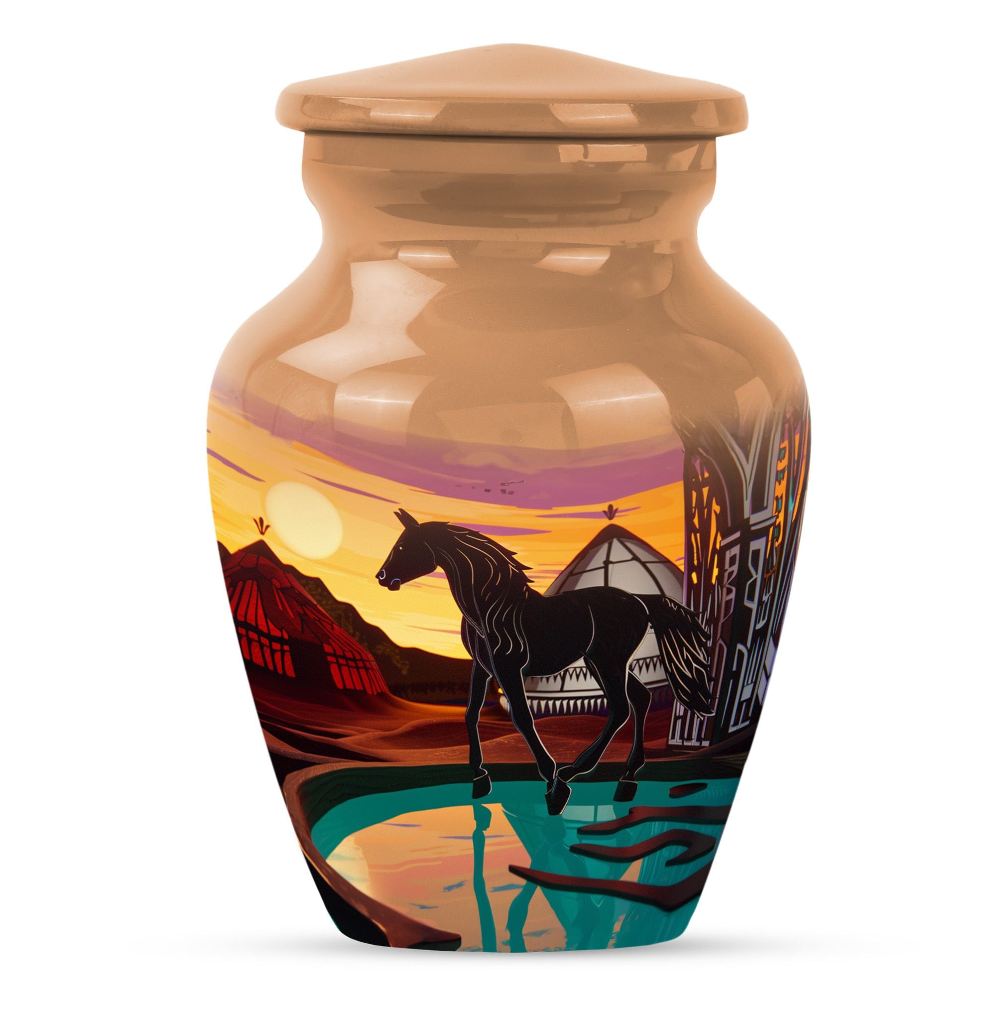 Expertly crafted from durable aluminium, this urn features a striking black horse motif with elegant detailing. Its secure screw-top lid ensures safe storage, making it ideal as a decorative miniature urn, a memorial keepsake, or a keepsake urn for human ashes. Practical yet refined, it also functions as an urn keepsake combo set or urn with keepsake combo.