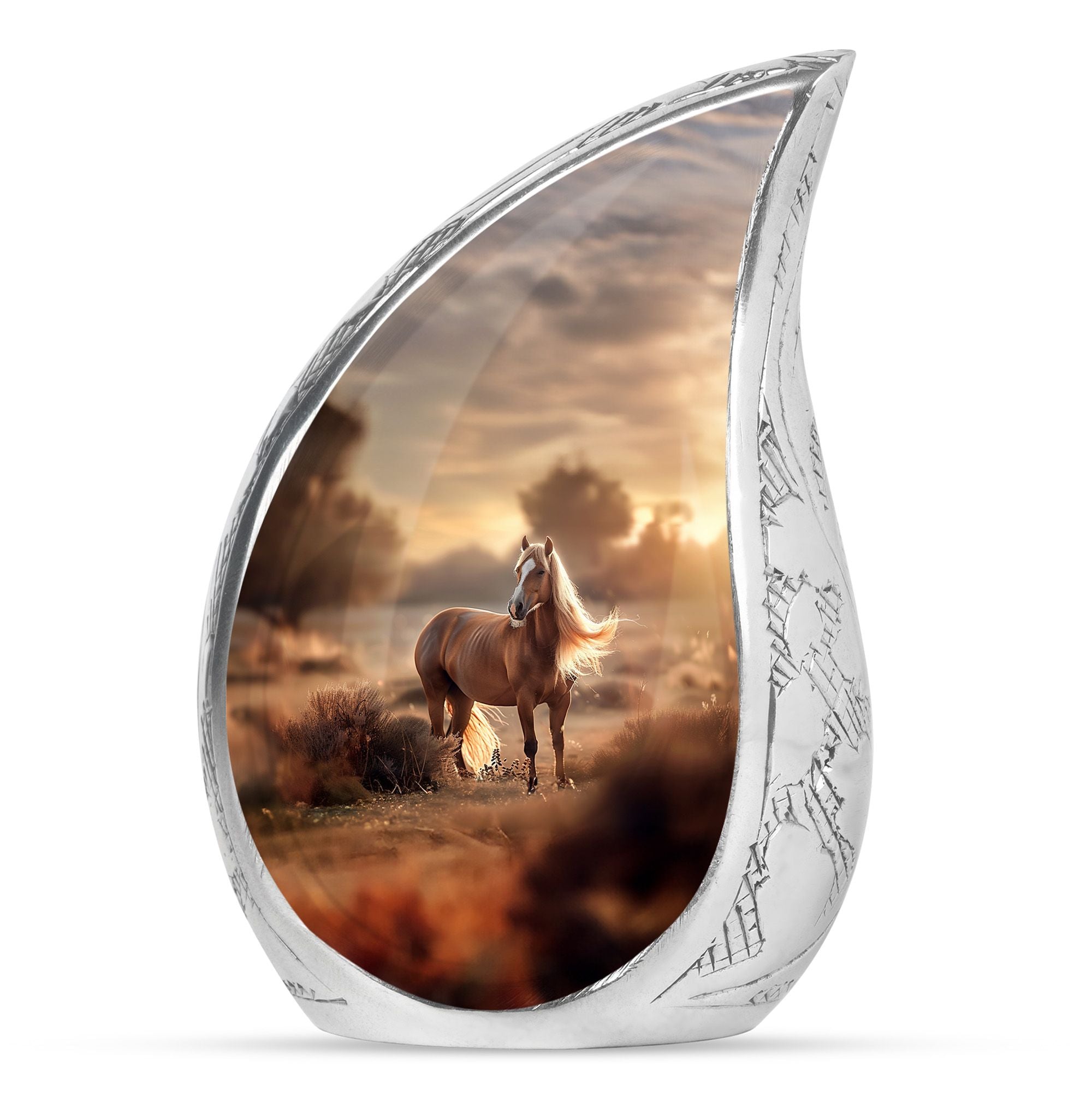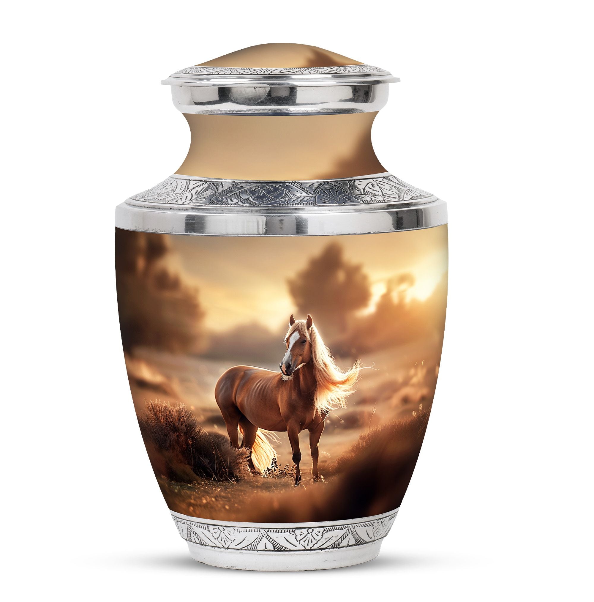 Expertly crafted from high-quality aluminium, this urn features a warm brown horse design with polished detailing, combining elegance and durability. Suitable as cremation urn for human ashes adult, cremation urn adult human, or cremation urn for humans, it offers secure storage with a screw-top lid. Its design also makes it ideal for cremation urns for adult ashes small, cremation ashes urn, or urn adult cremation, serving both keepsake and memorial purposes.