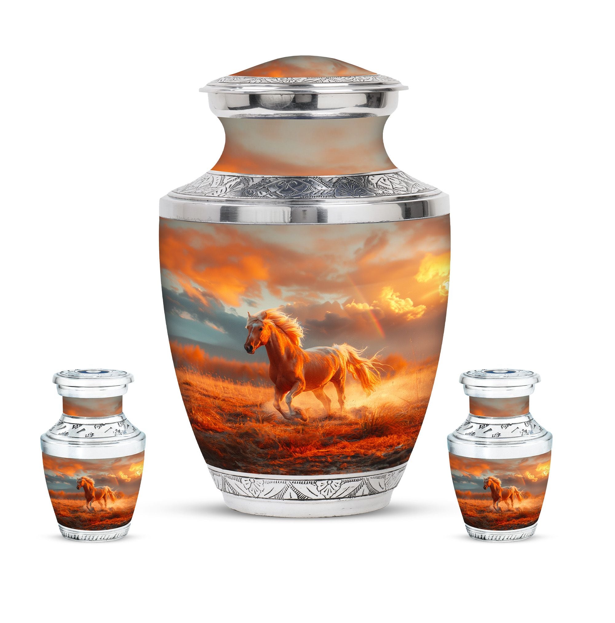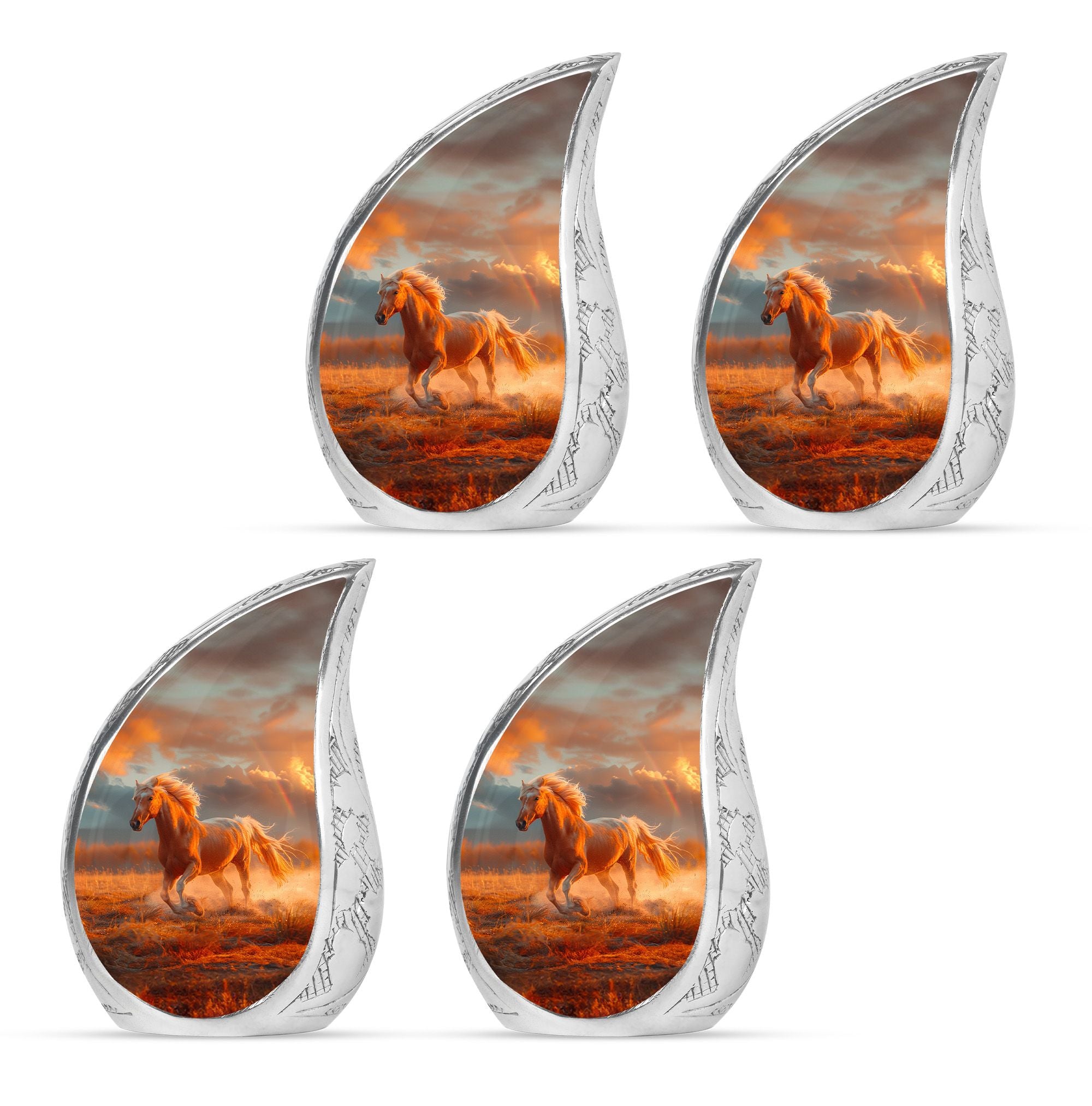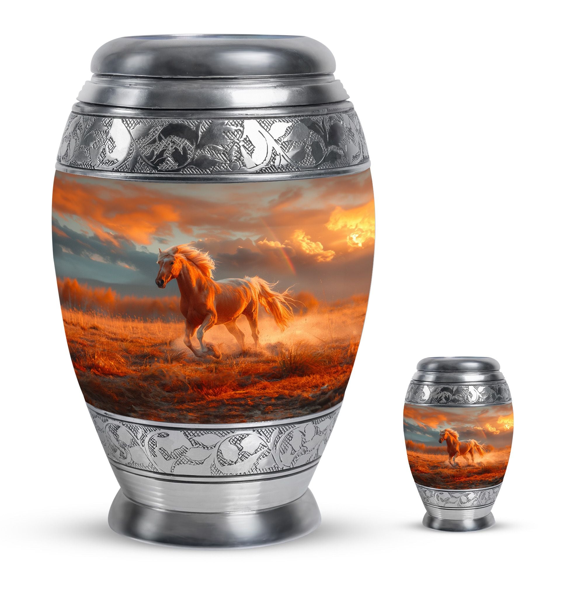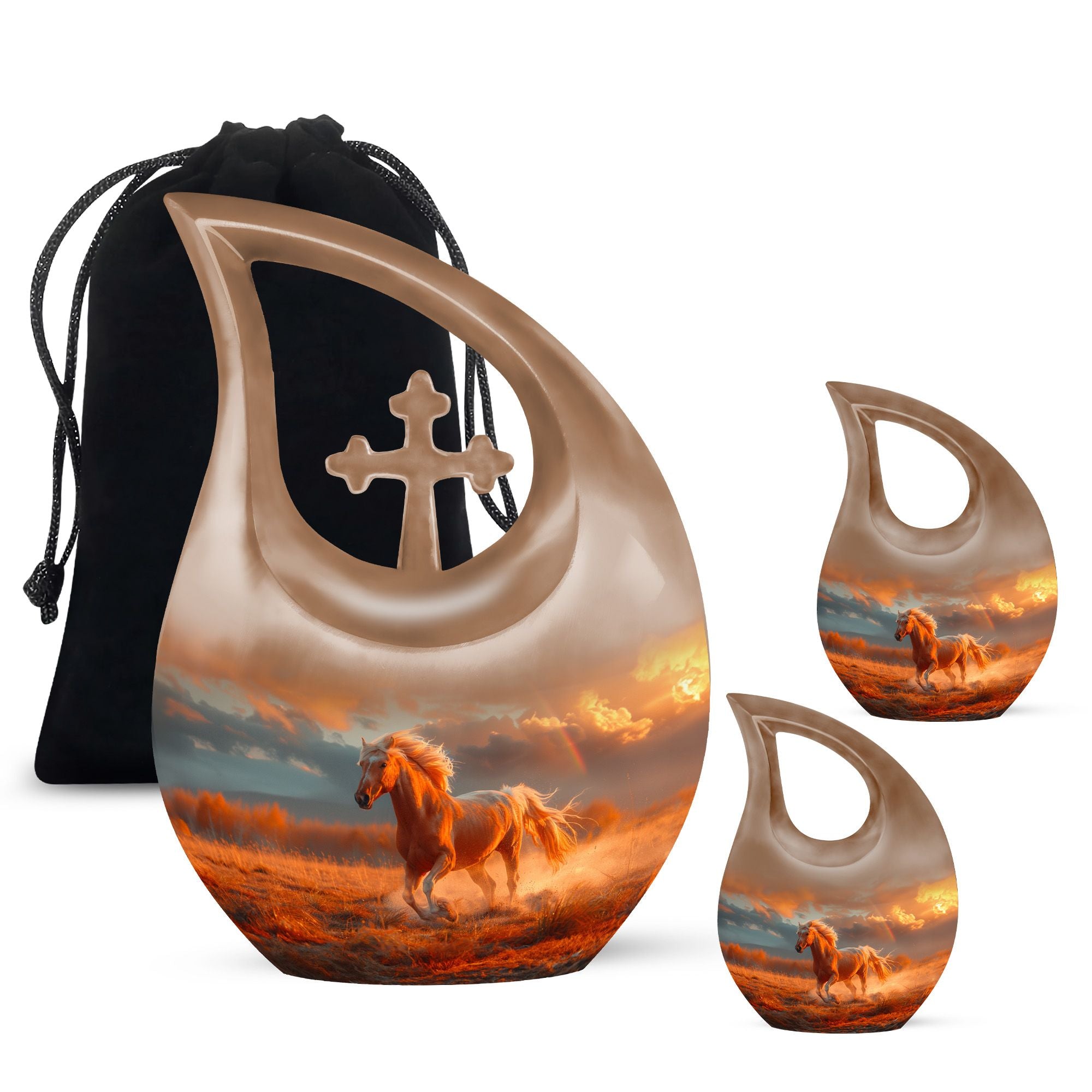 The Running Horse Cremation Urns for Human Ashes capture the strength, freedom, and grace of the horse, symbolizing a life lived with courage and determination. Paired with a sunset adult cremation urns design, these pieces reflect the beauty of life’s journey and provide a dignified resting place for your loved one.