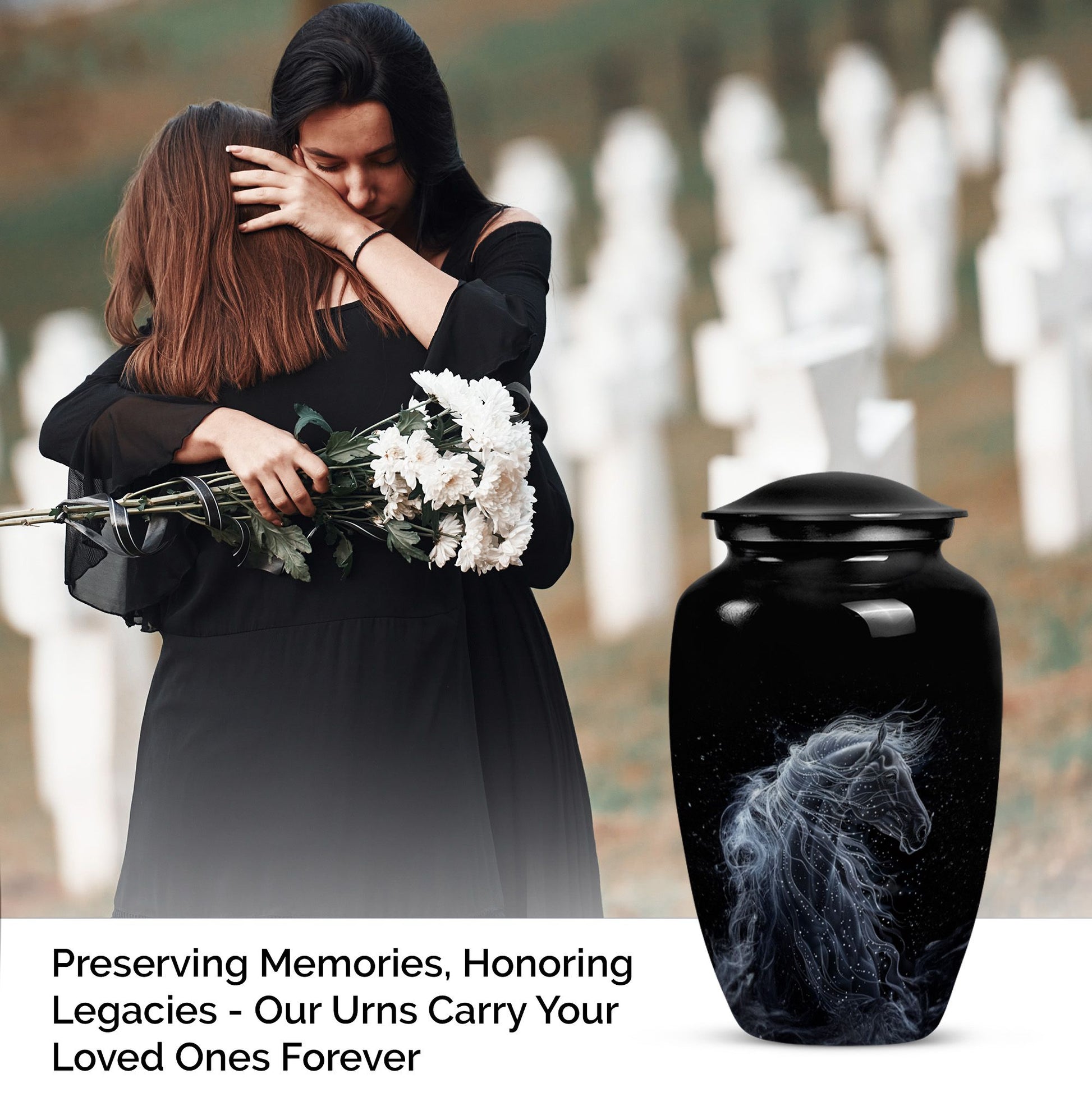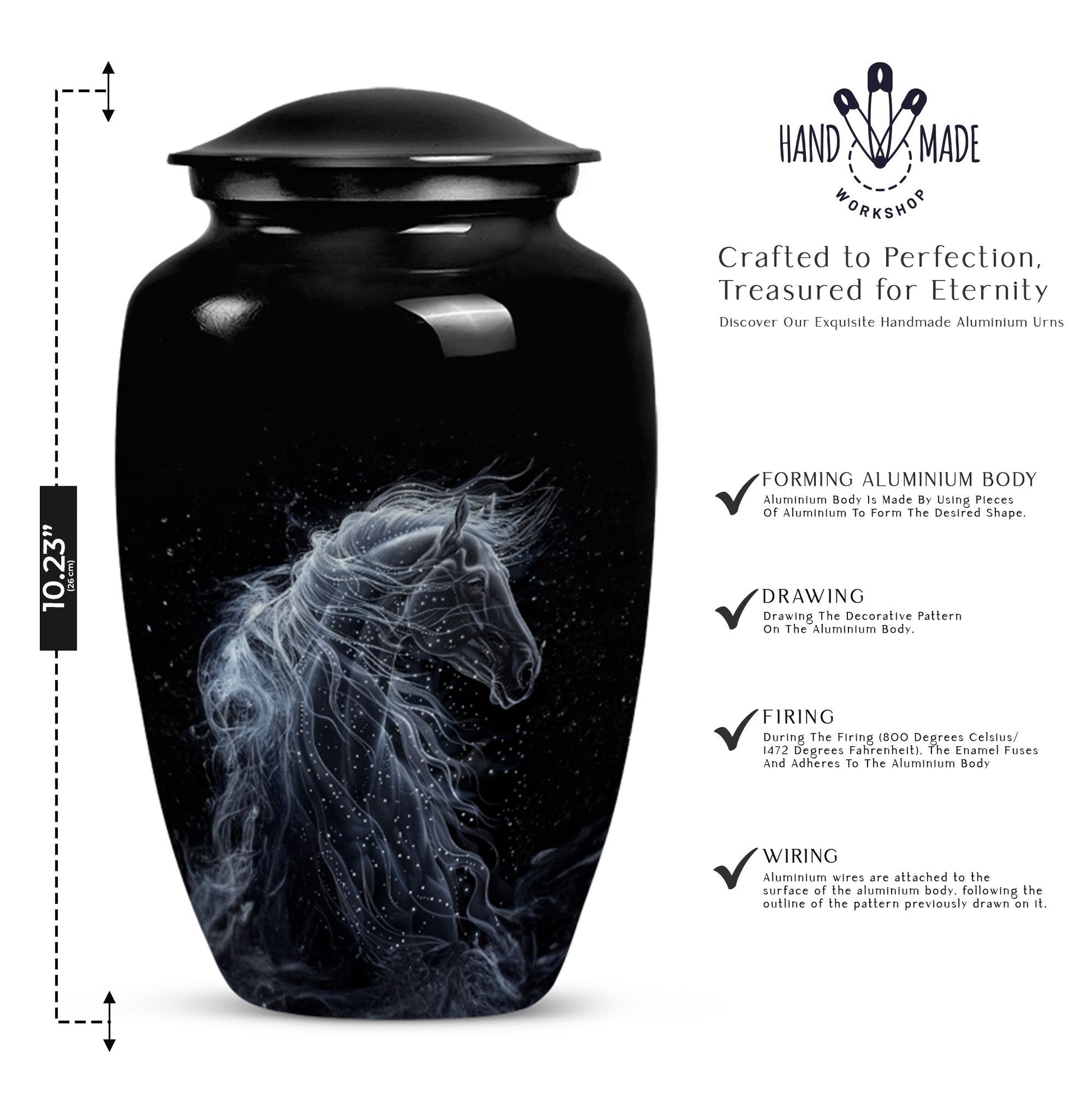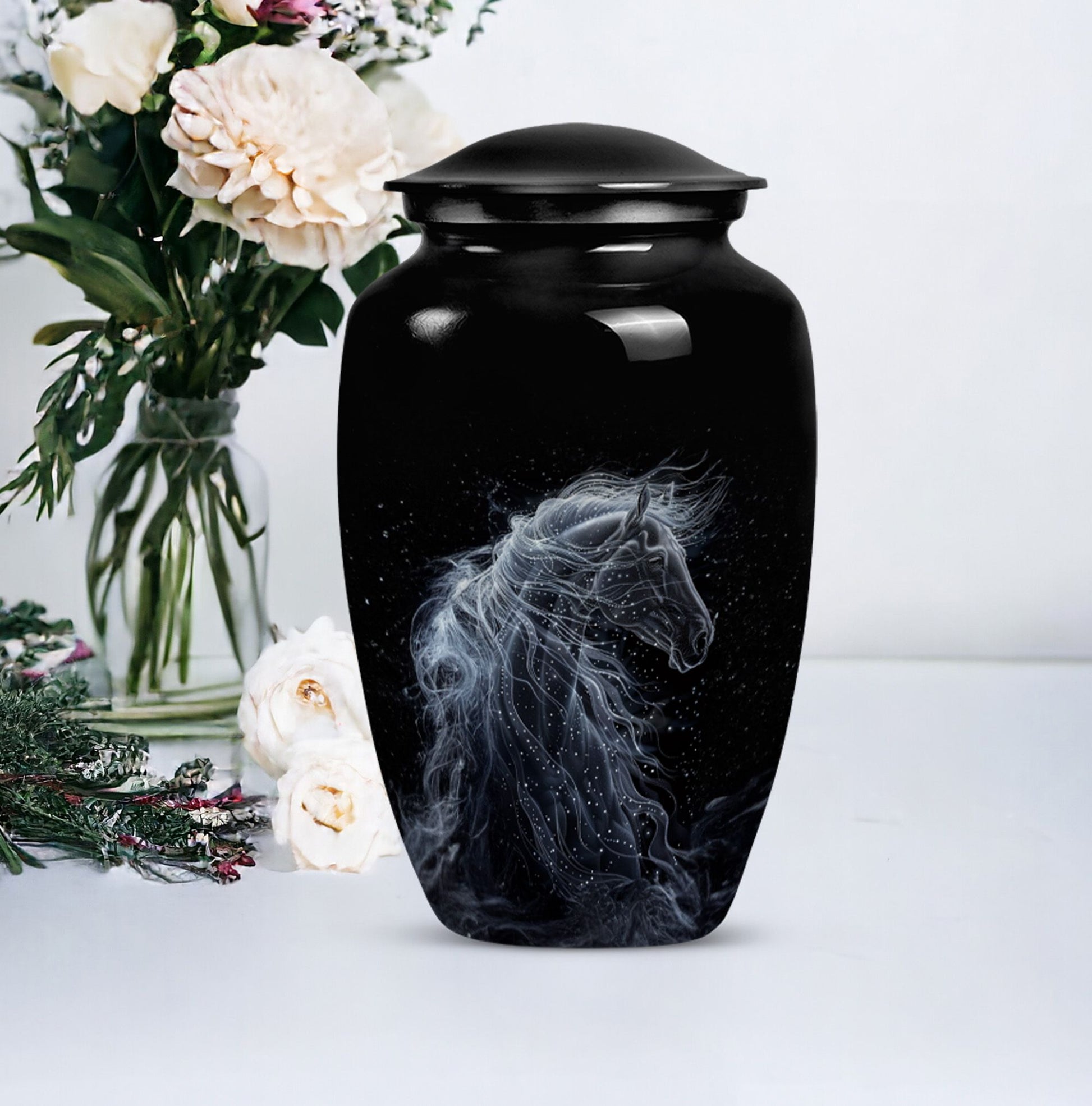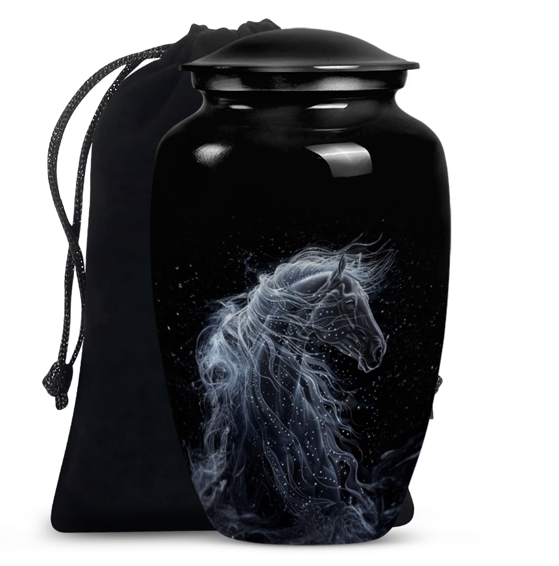 Discover a unique way to honor the memory of a loved one with our Horse Urn. Standing 10 inches tall and able to contain 200 cubic inches, this funeral urn for ashes is created for both women and men yearning for a distinctive method to safeguard the ashes of their beloved. Meticulously crafted from top-quality aluminium, this urn boasts an abstract theme, adding a layer of elegance and sophistication. With the ability to personalize with engraved names, it truly adds a personal touch to your memorial ceremony supplies. The urn comes complete with a velvet pouch, providing a dignified containment solution for the ashes. Weighing in at a manageable 3.3 pounds, this large urn is perfect for both burial urn needs or to serve as a poignant, respectful centerpiece in your home. A memorably lustrous, stylish, yet understated tribute to your cherished one. Search no further for 'urn for a mom' or 'urns for the adult male,' our classically designed Horse Urn is both a loving repository and a testament of a life well-lived.